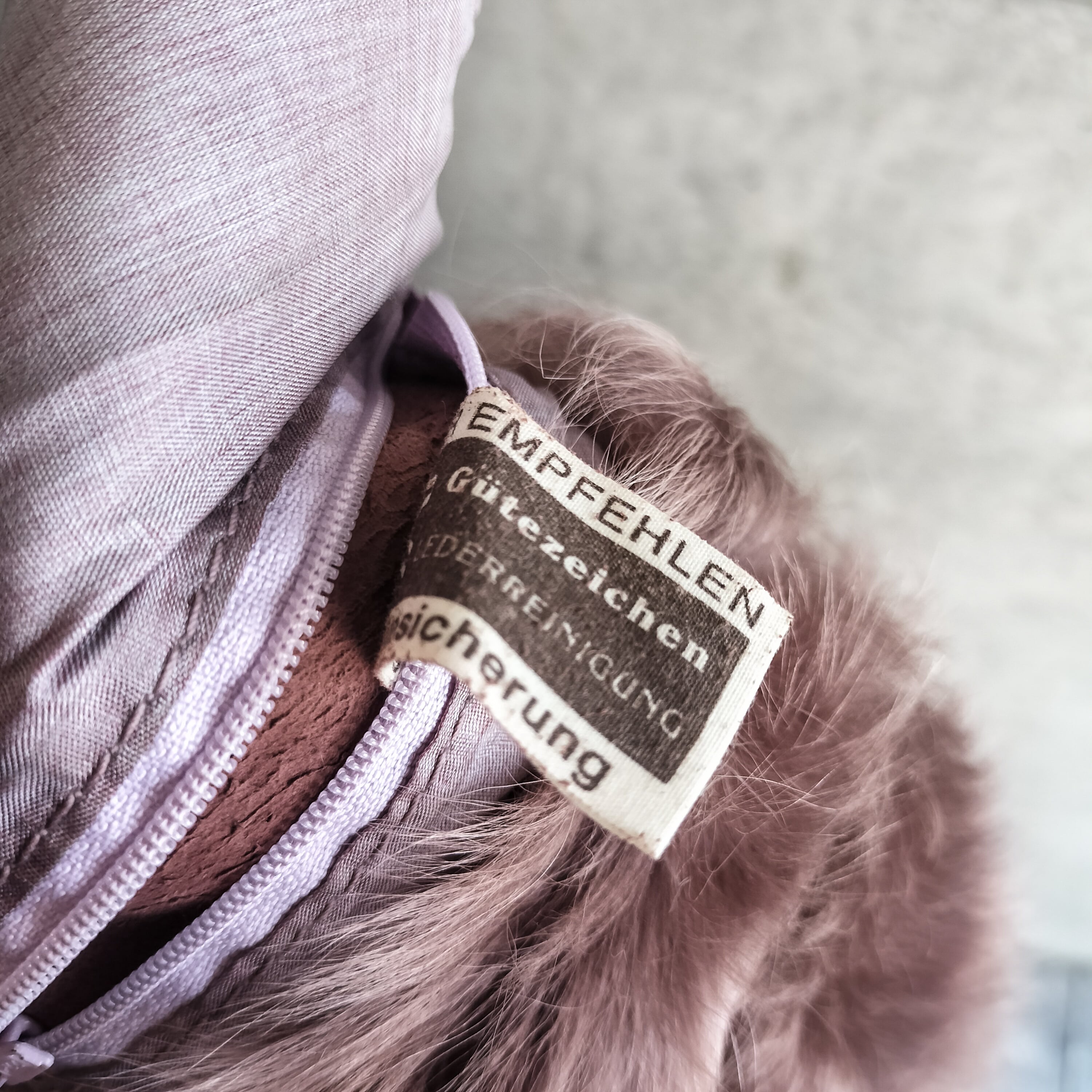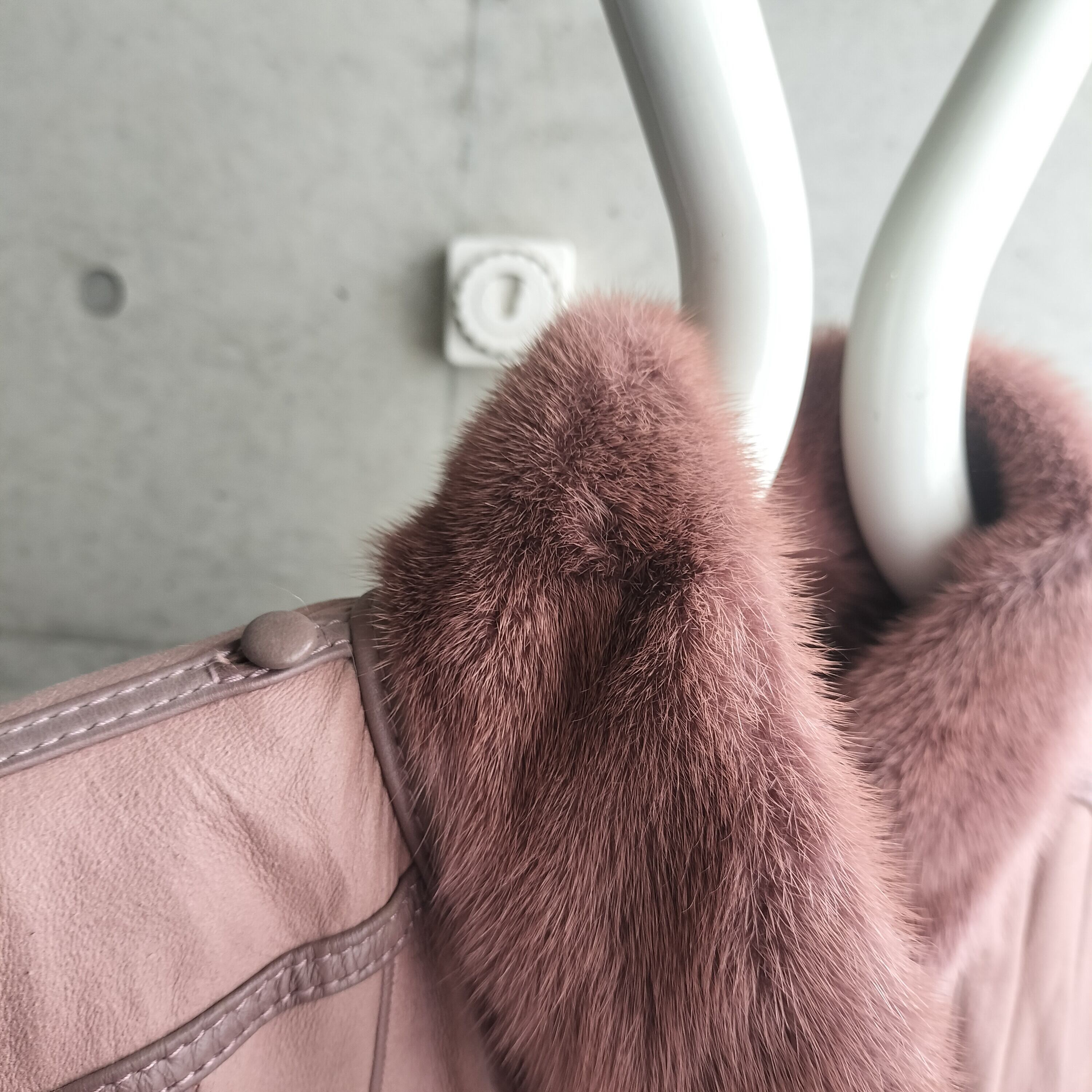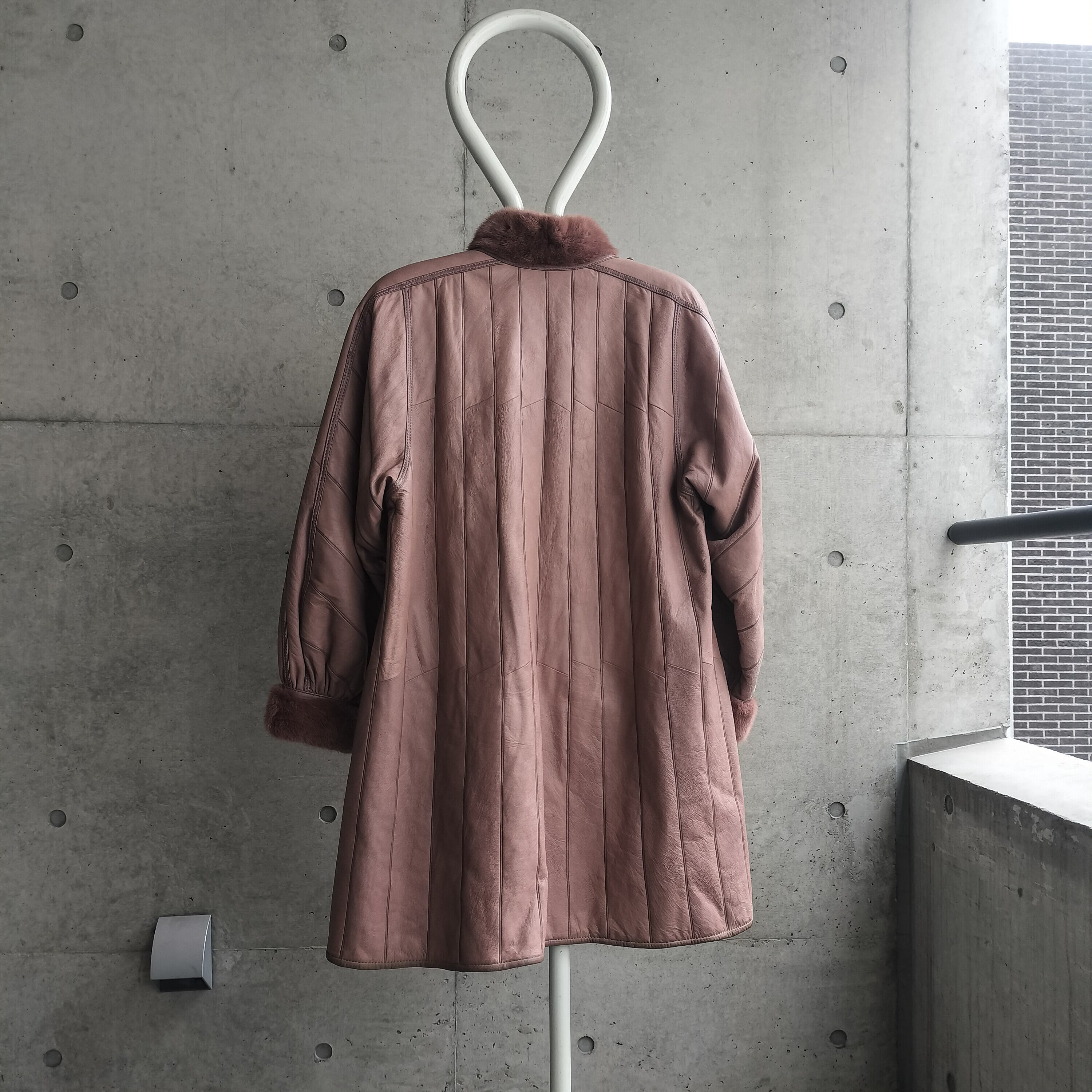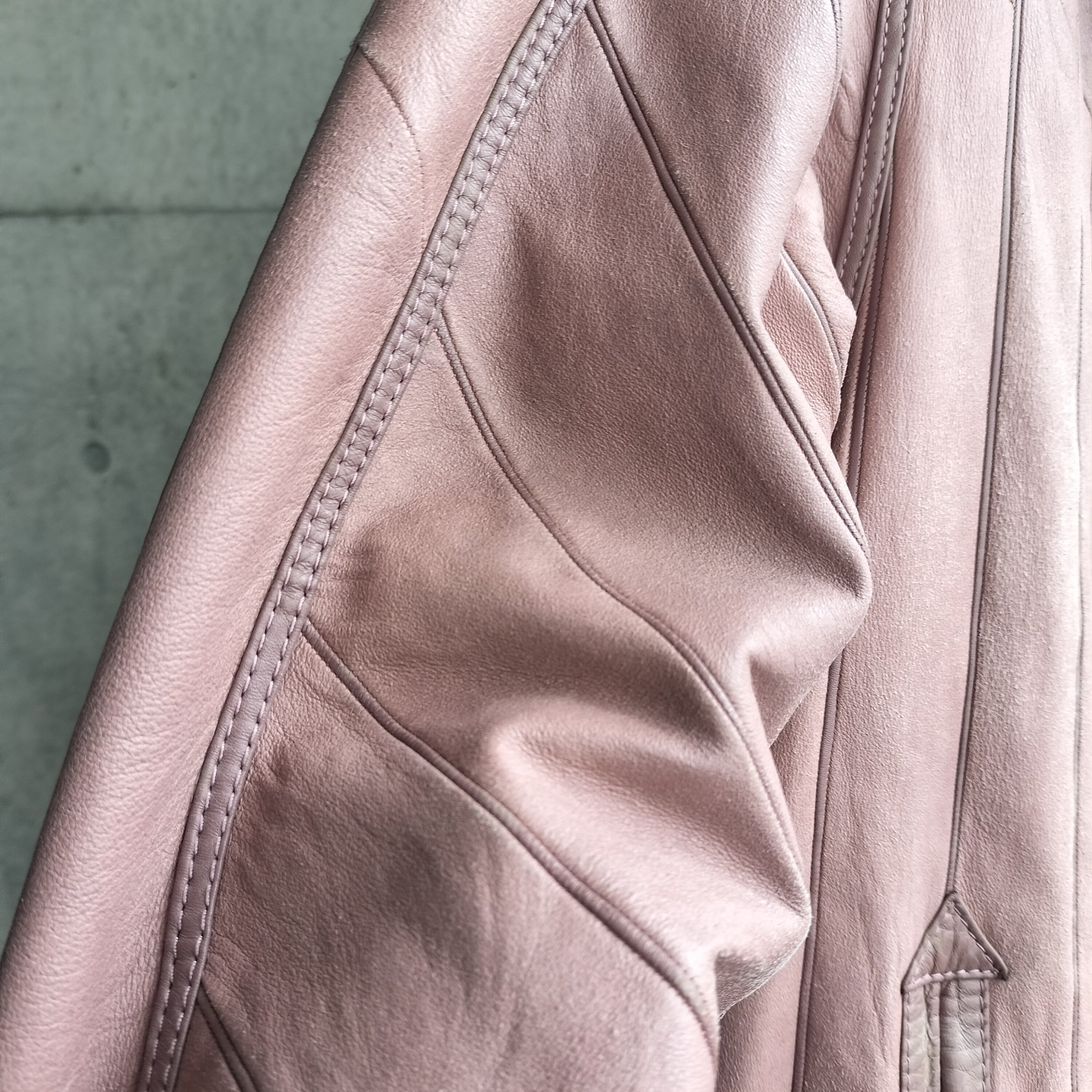 リバーシブルのレザーコート。めちゃくちゃ発色が綺麗なピンクのレザー。薄いトーンで上品です。襟はフワフワでチクチクゼロなファー襟。アームもバイアスパターンに生地が切替になっていて立体的なシルエット。小柄なメンズ、レディース向けサイズです。