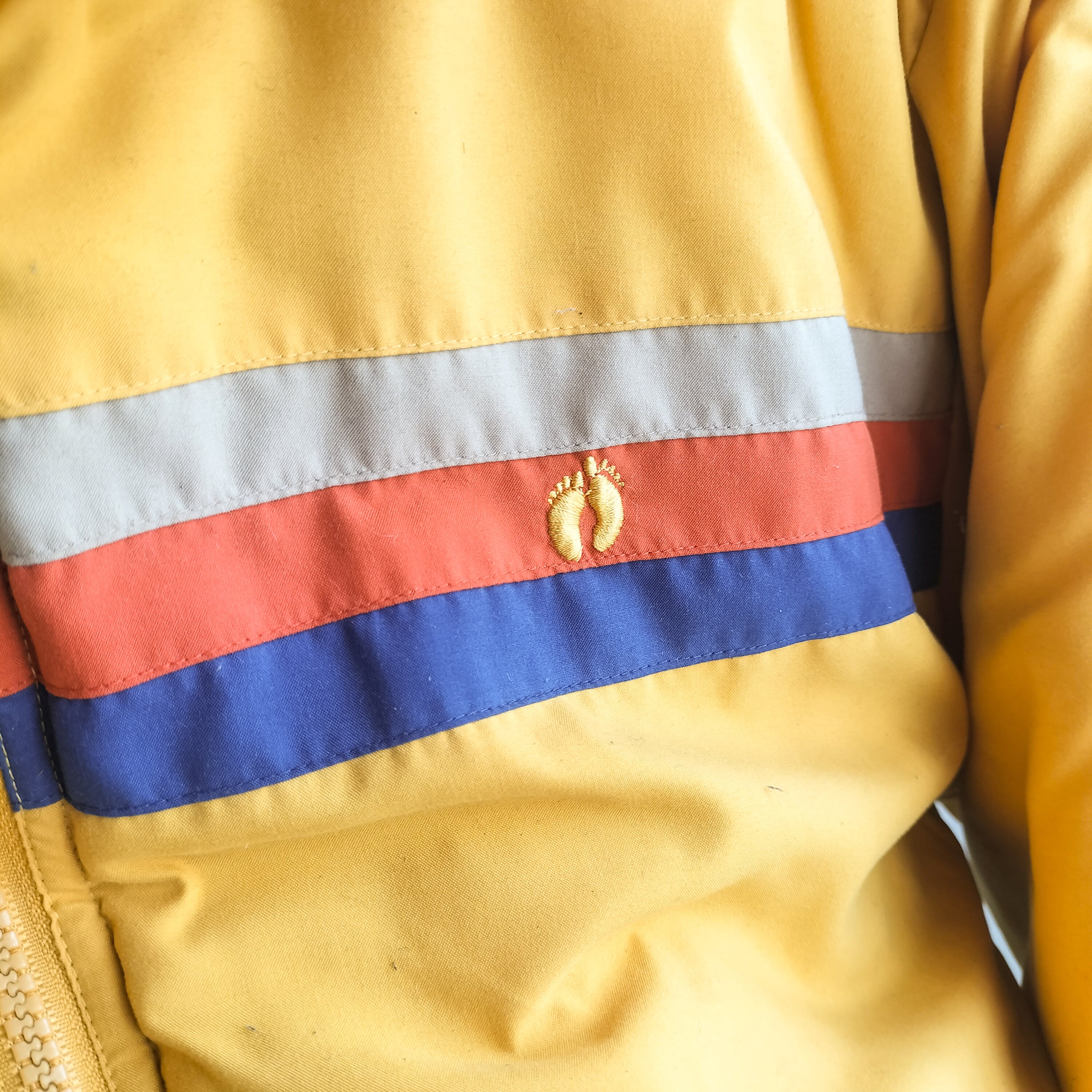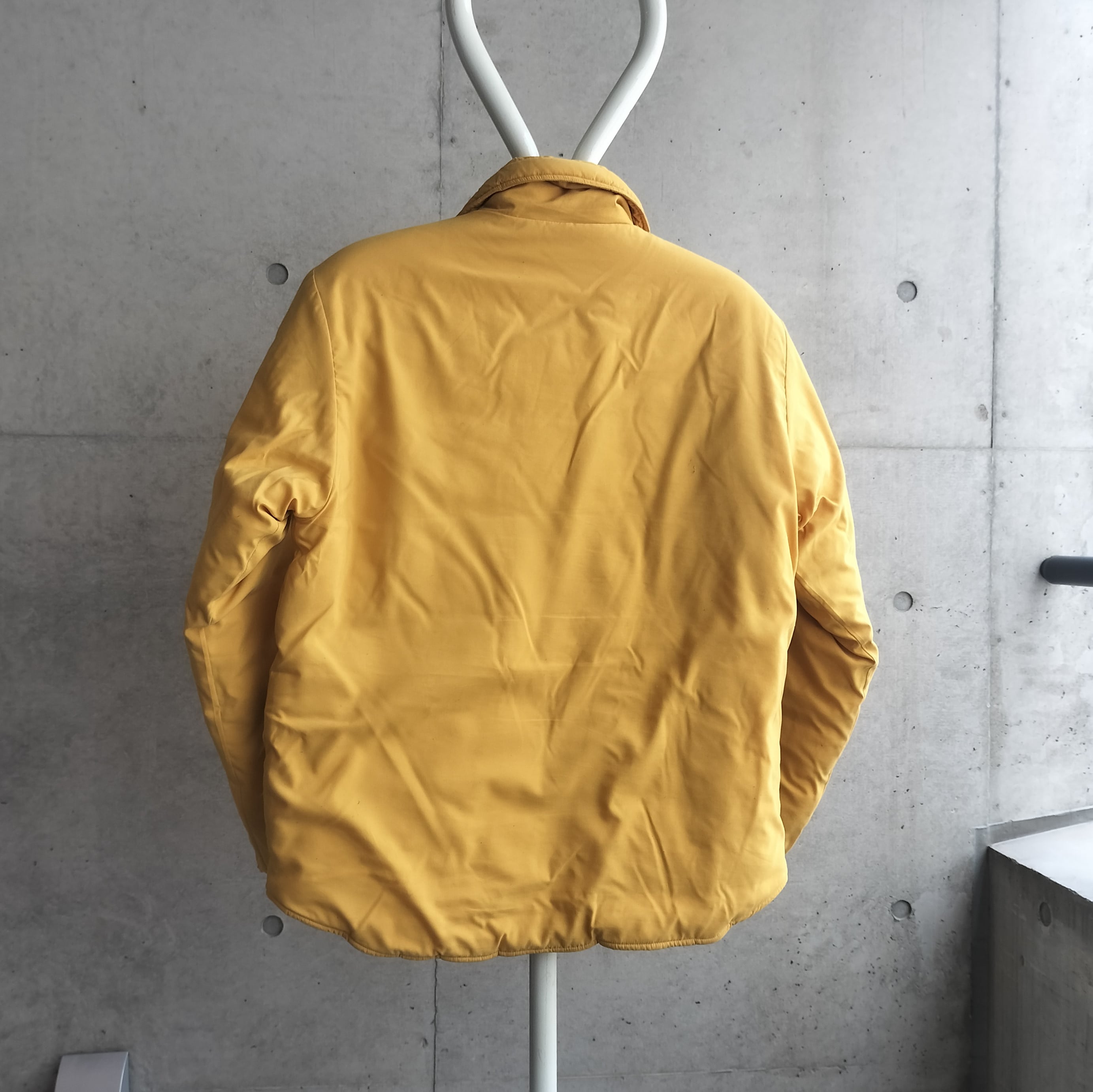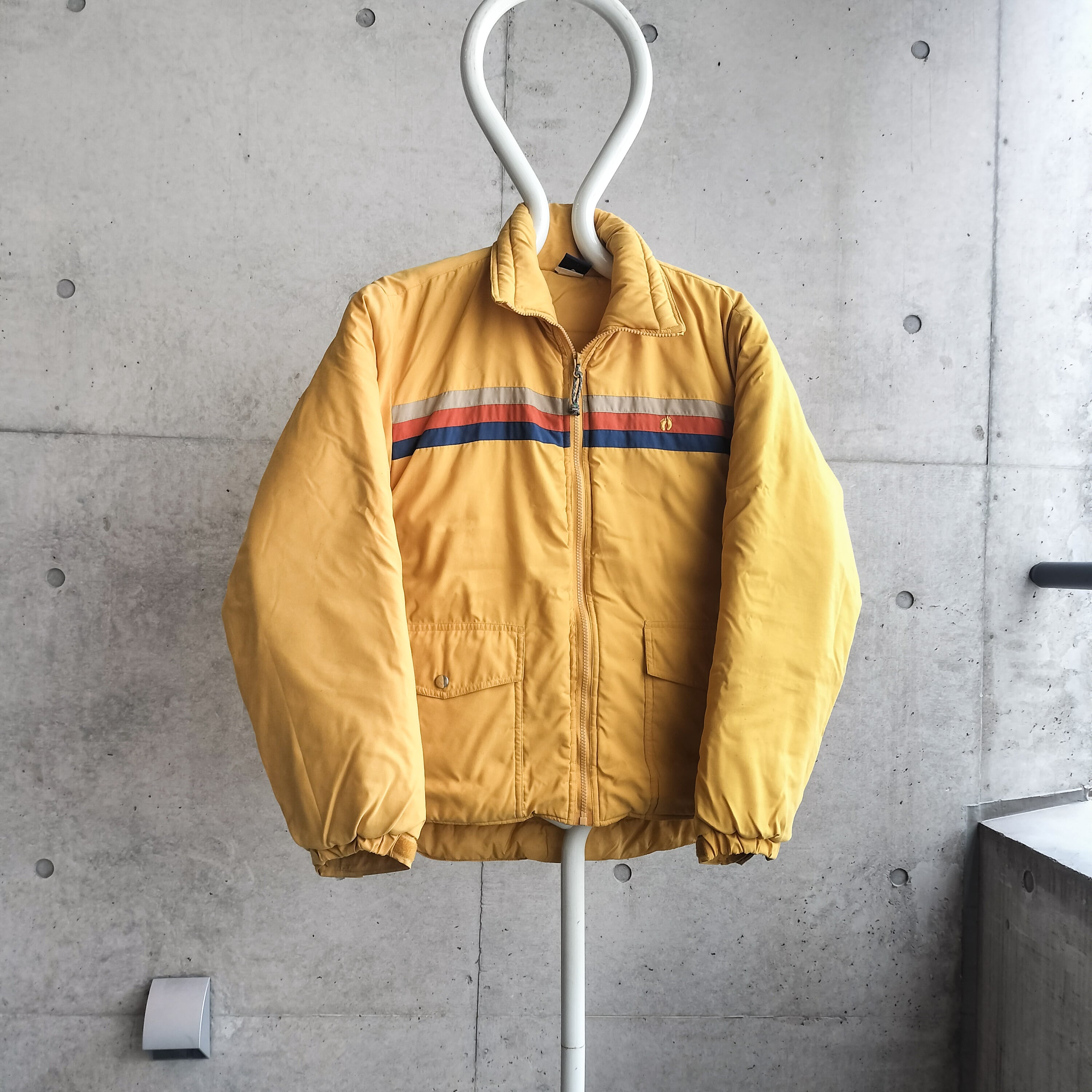 HANG TENのダウンブルゾン。発色の綺麗なイエローカラーにライン入り。嬉しいポケット付きダウン。襟も開けても、ハイネックでも着用可能です。