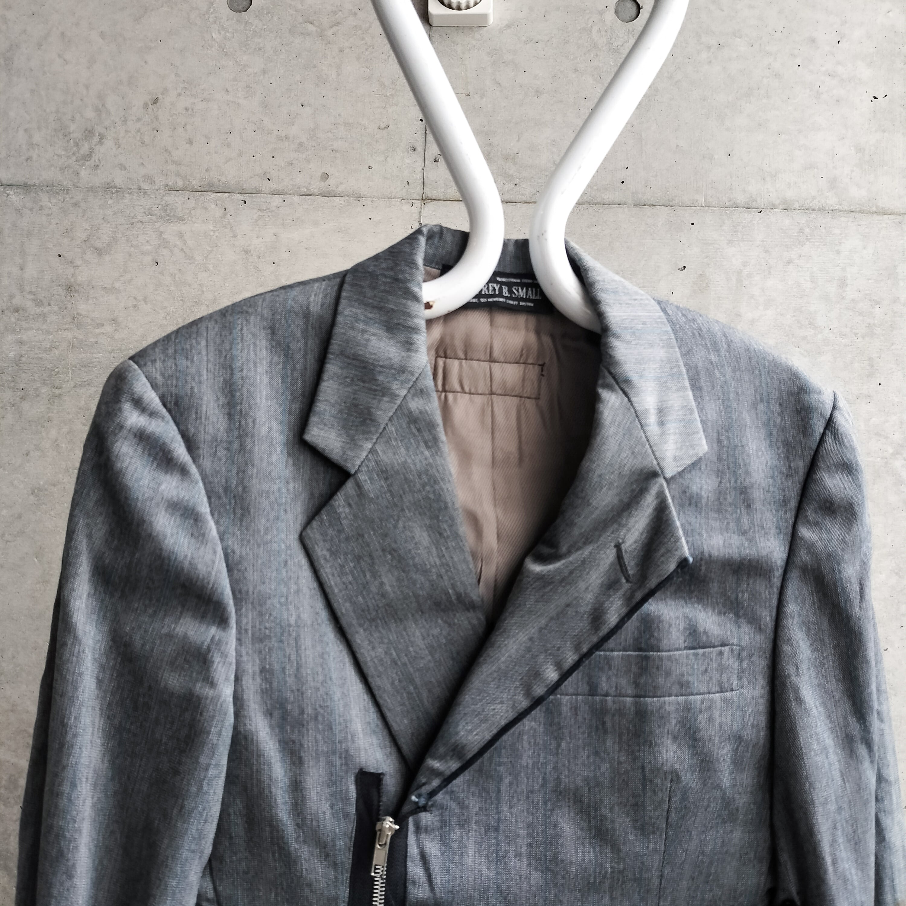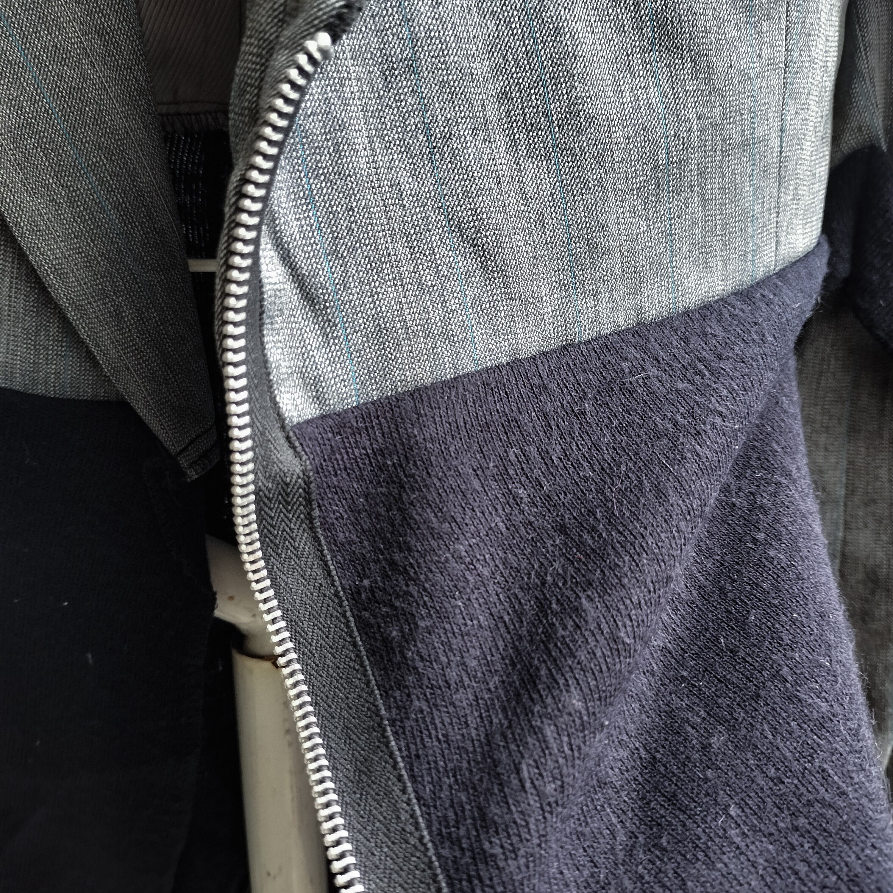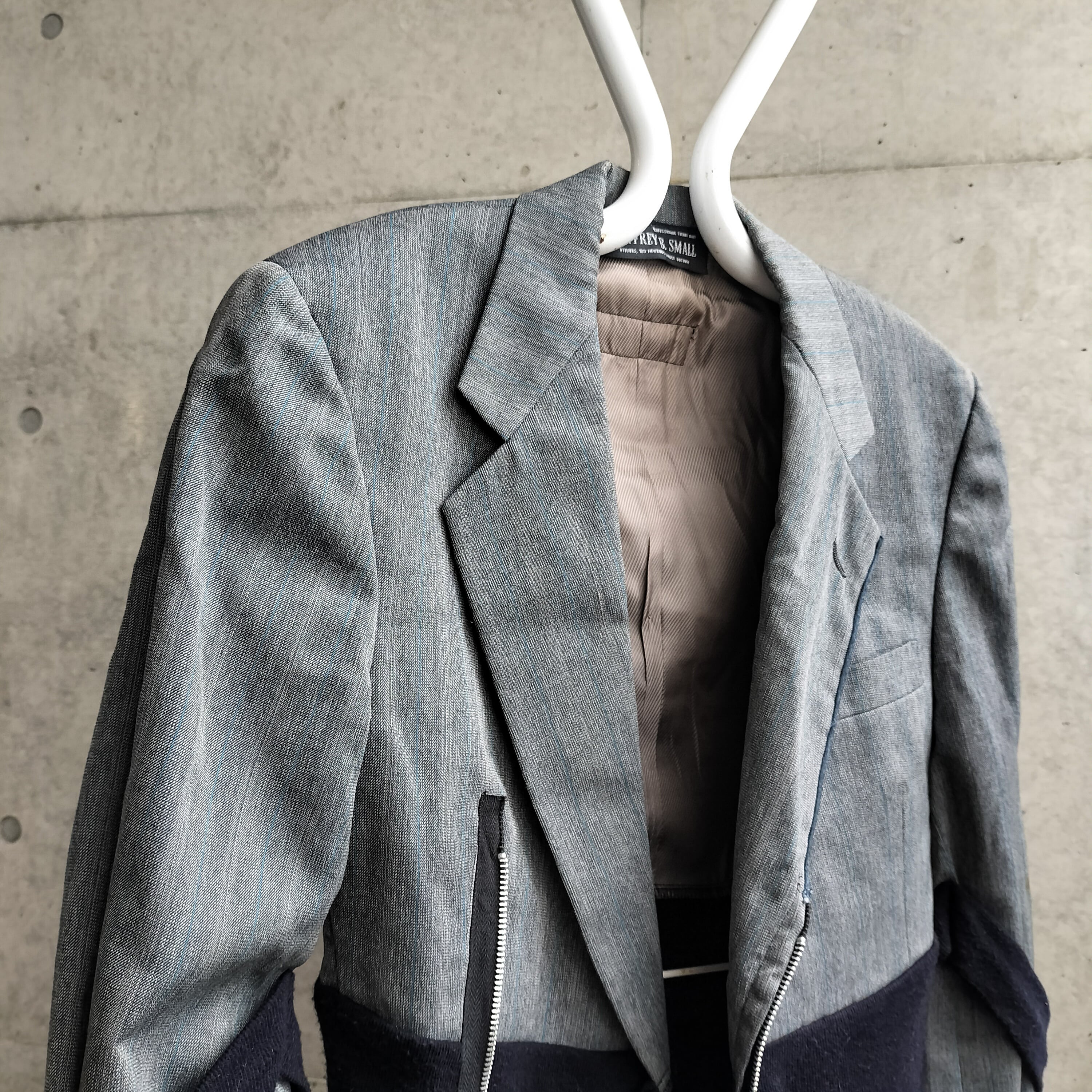 チャコールカラーのドッキングジャケット。ヴィンテージジャケットにニットがドッキングされたデザイン。袖も同生地でボンテージ仕様。タックインするのもオススメです。小柄なメンズ、レディース向けサイズ。