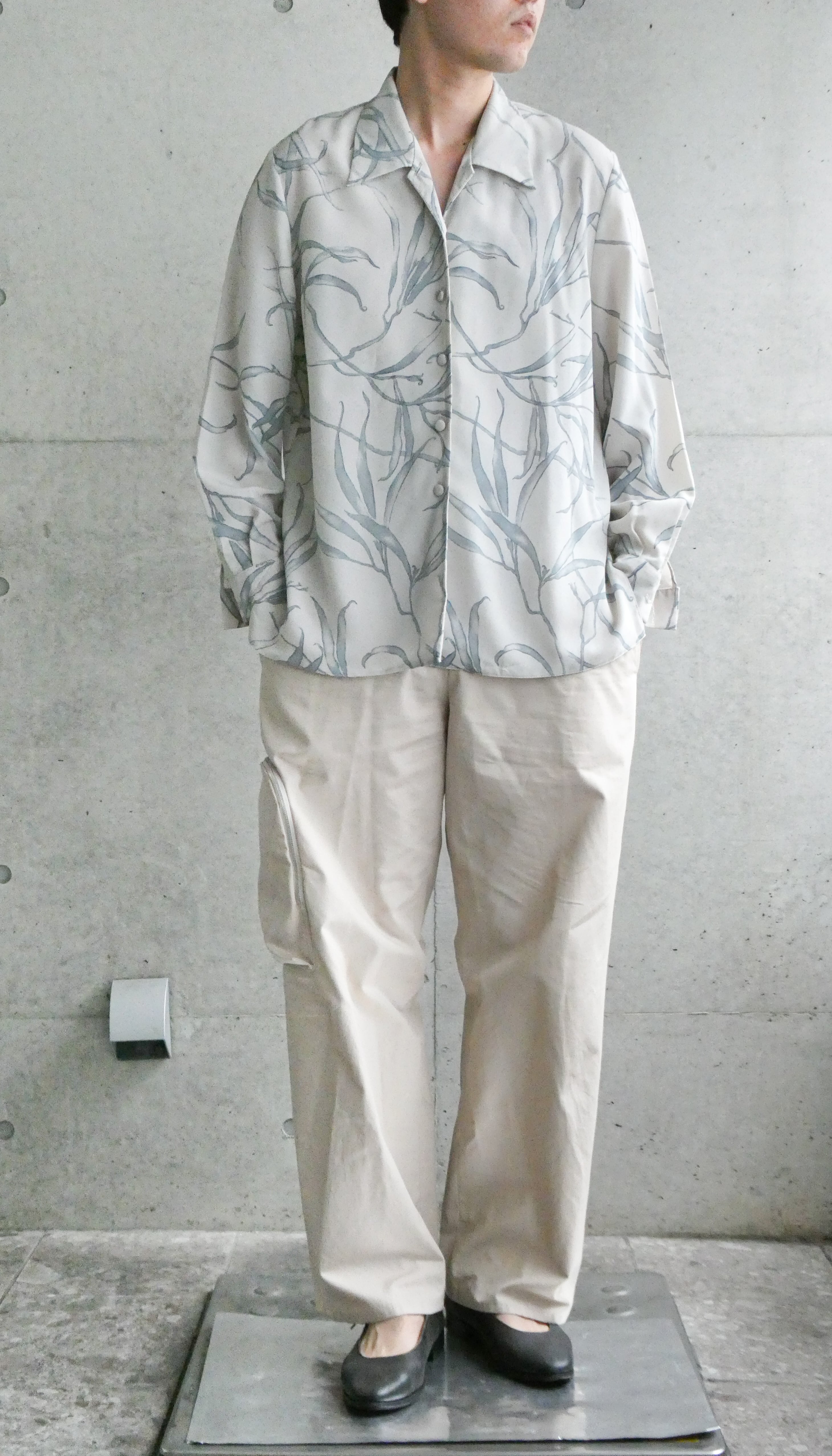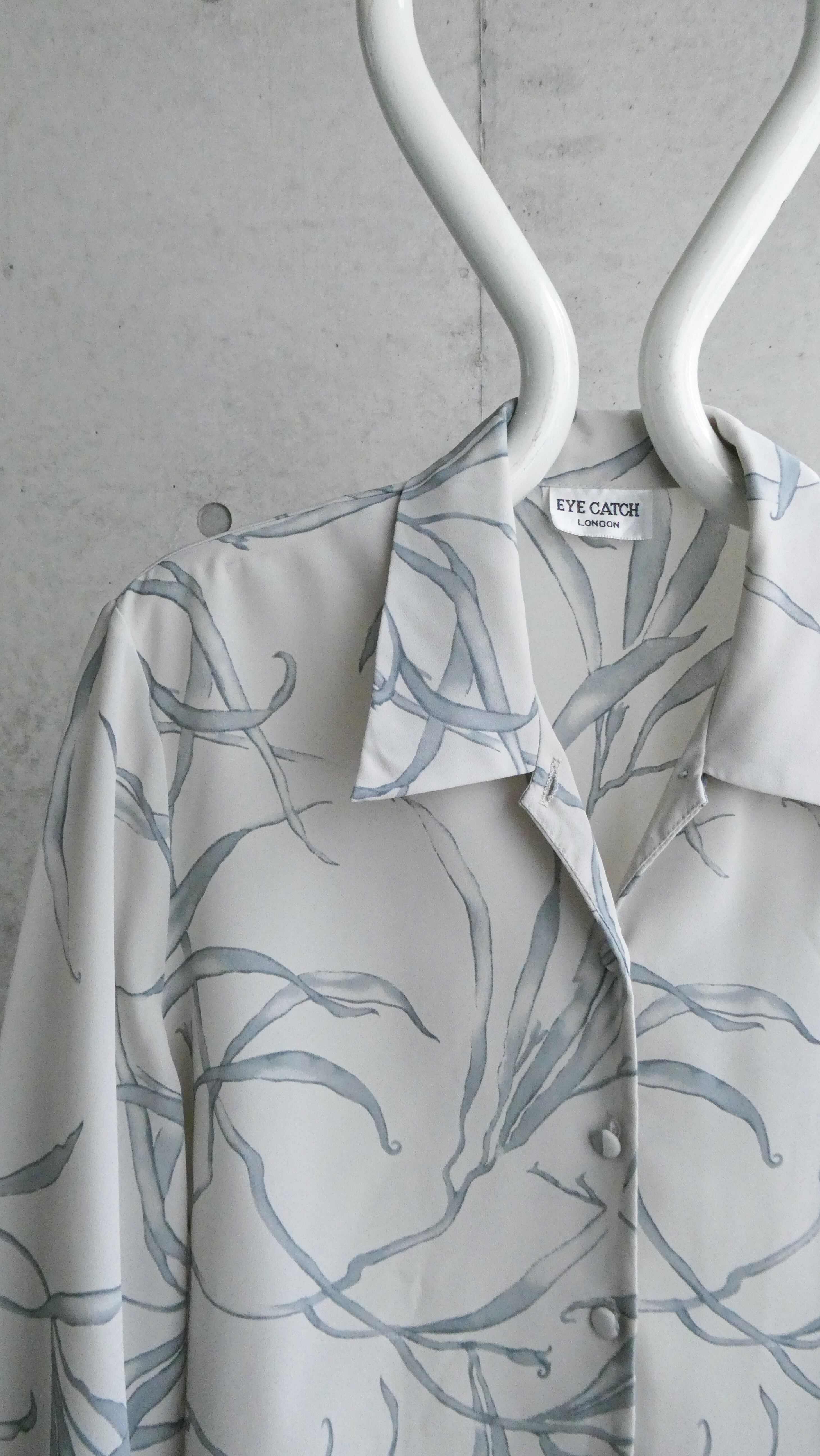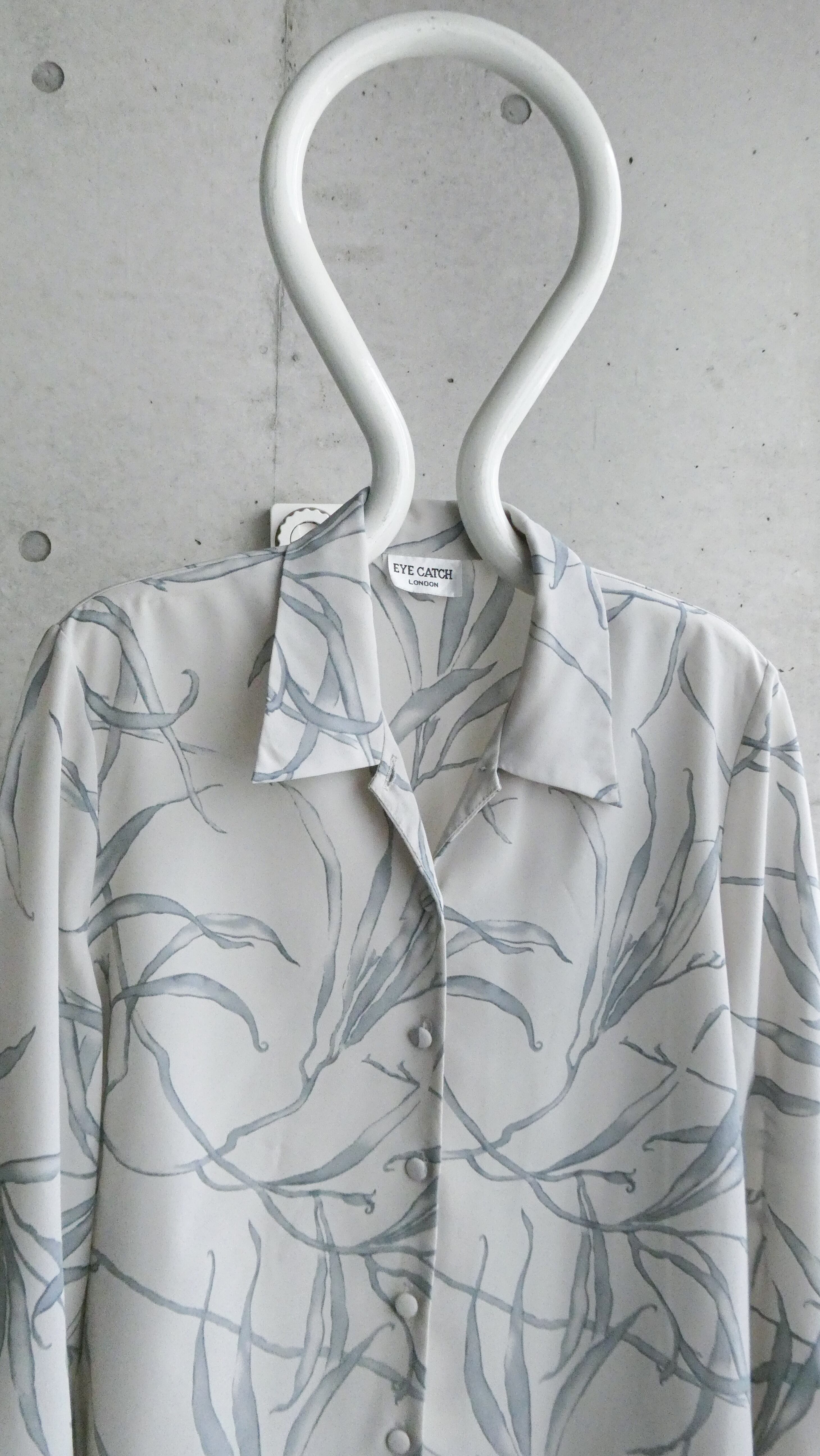 イギリス製のシャツ。白に薄水色のドレープシャツ。草木のデザイン柄。袖にもタック入りで落ち感あるシルエット。洗練されたイギリスらしい柄シャツです。