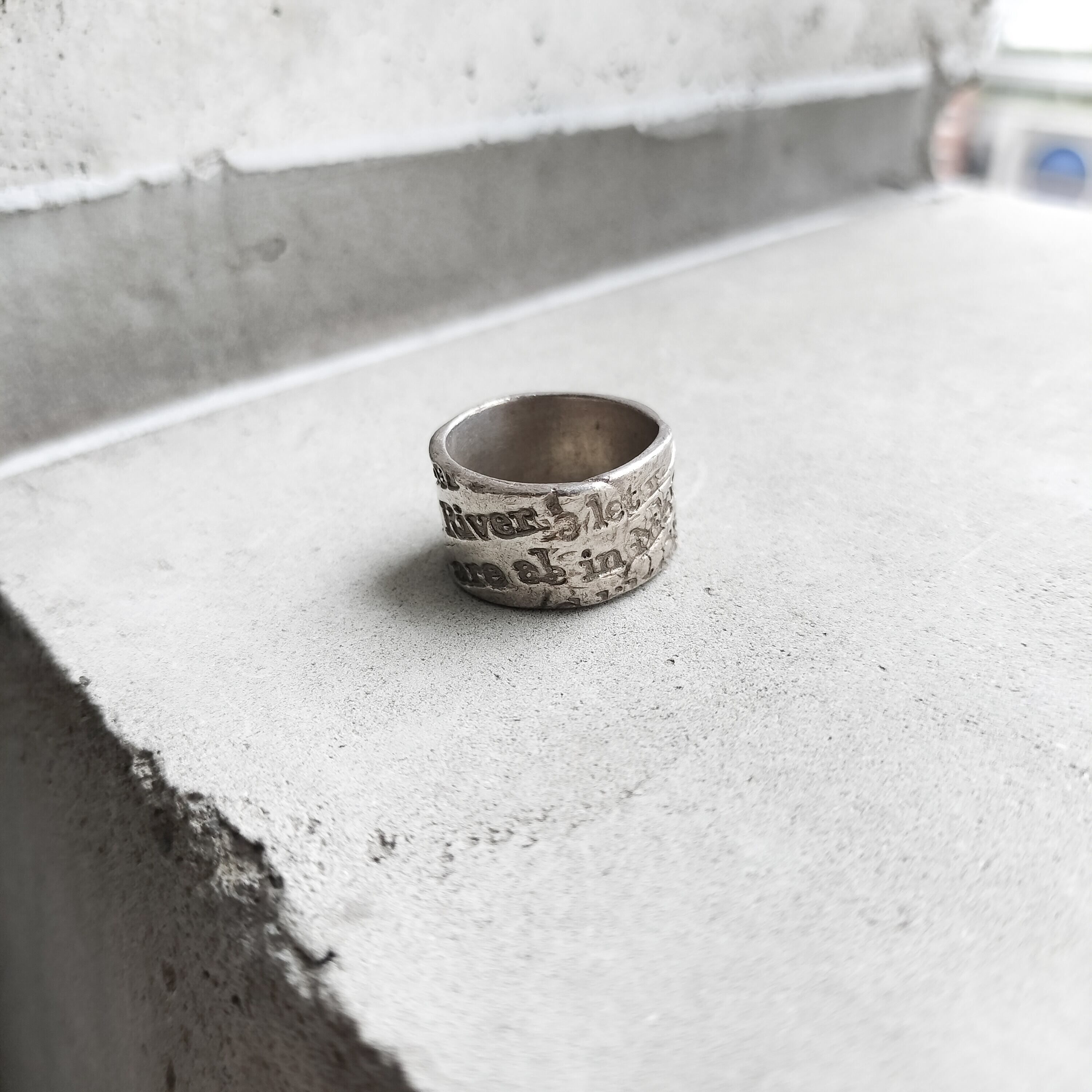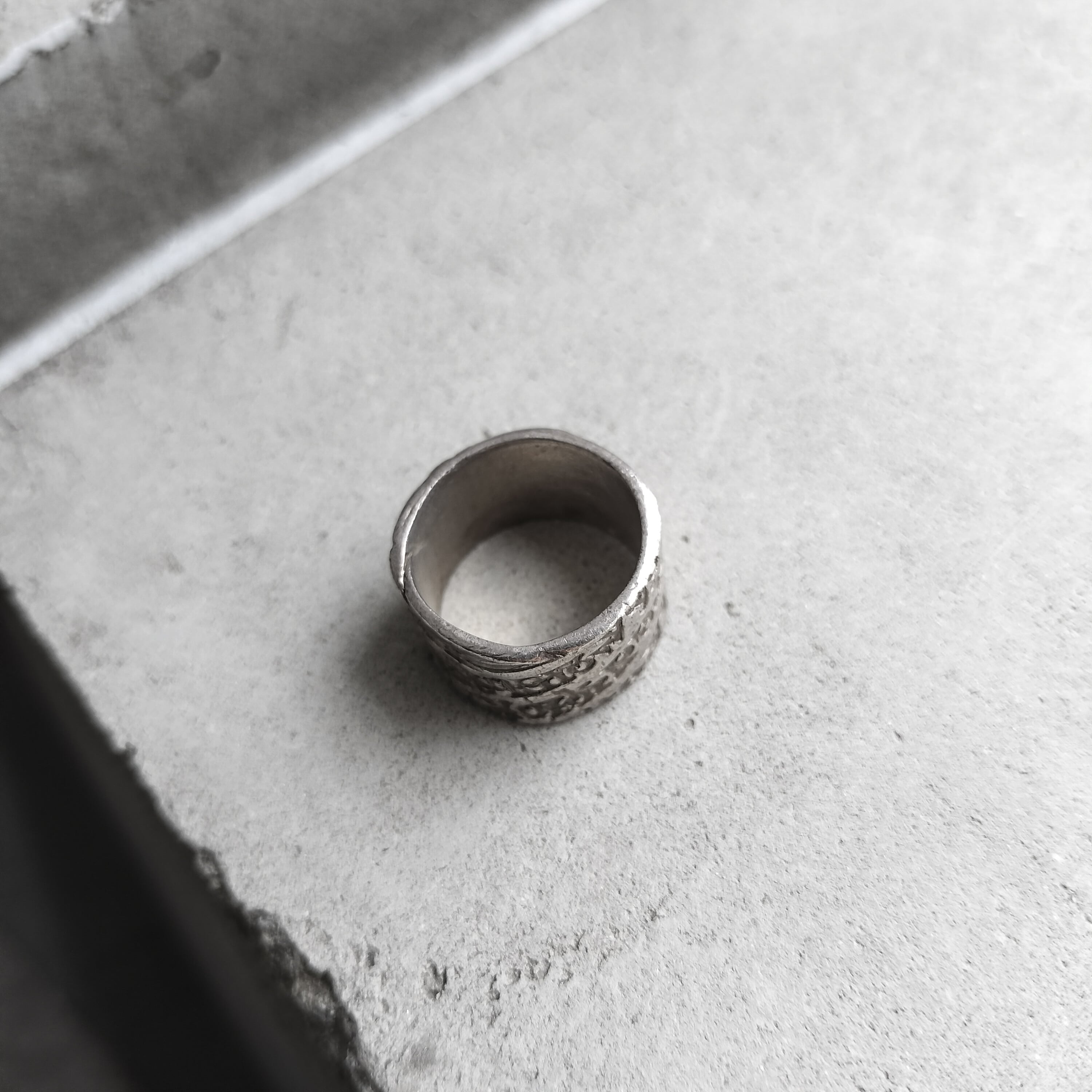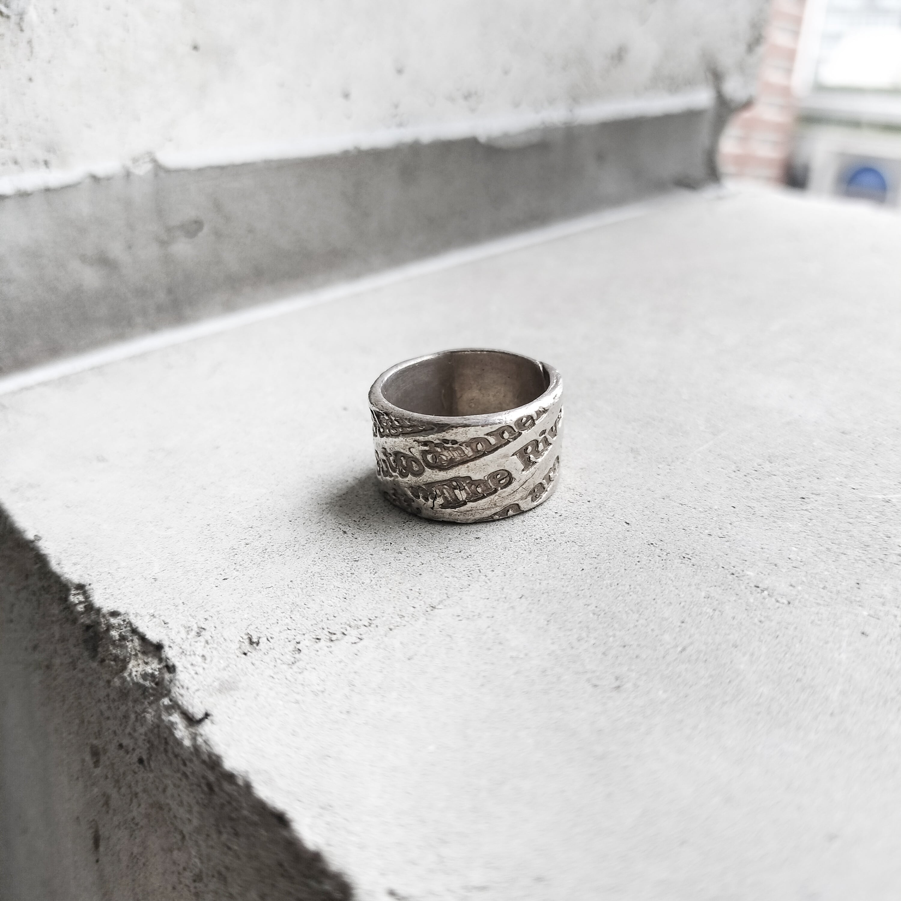 ロンドンで出たシルバーリング。全体にレタードされたデザイン。乱雑な感じの彫刻が雰囲気あります。適度な太さで手元に丁度良い存在感。メンズの薬指ほどのサイズです。