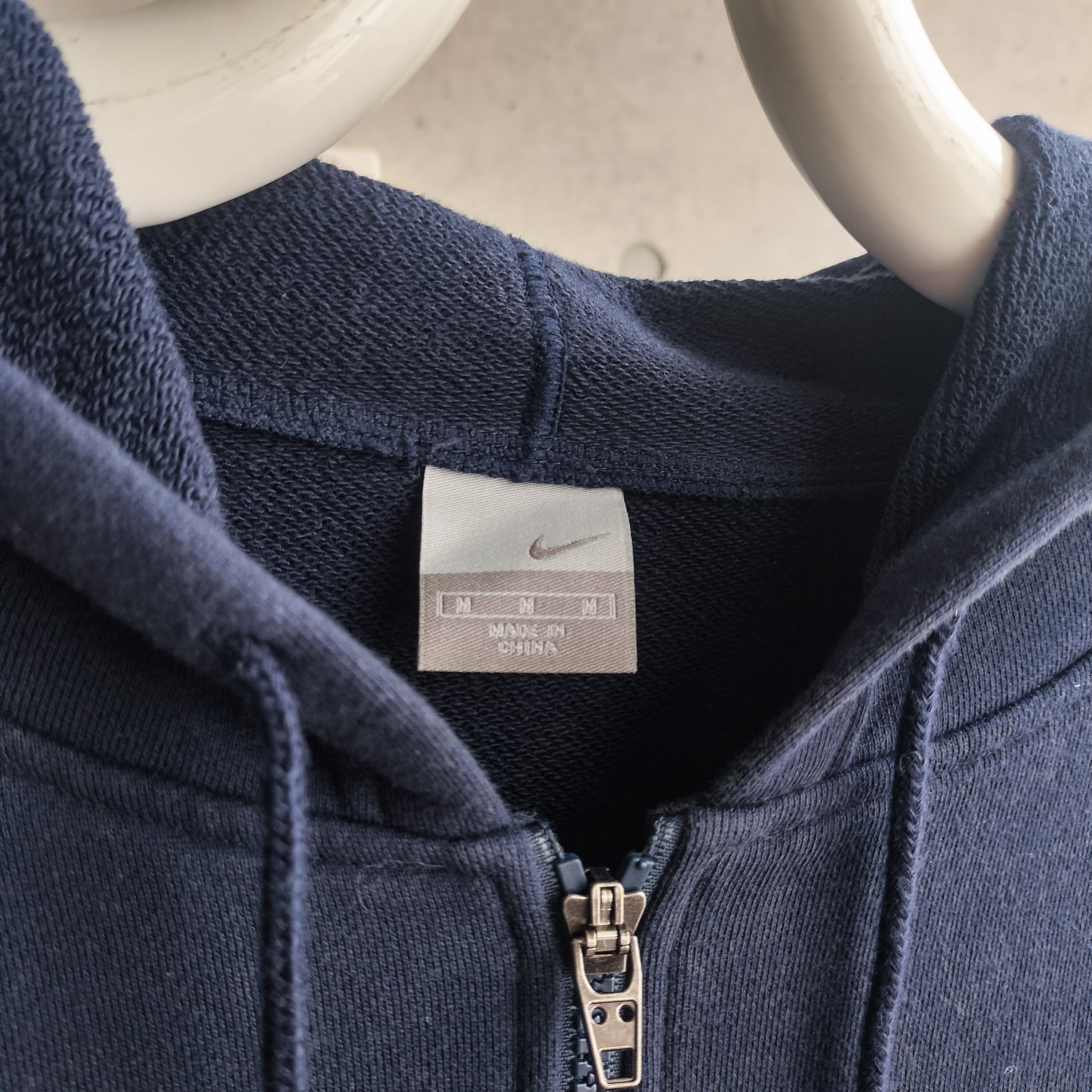 NIKEのいなたいフーディー。古いナイキでシンプルなスウェットフーディーが全く見つからないです。フェードしたネイビーカラー。アームも太くて短丈なシルエット。