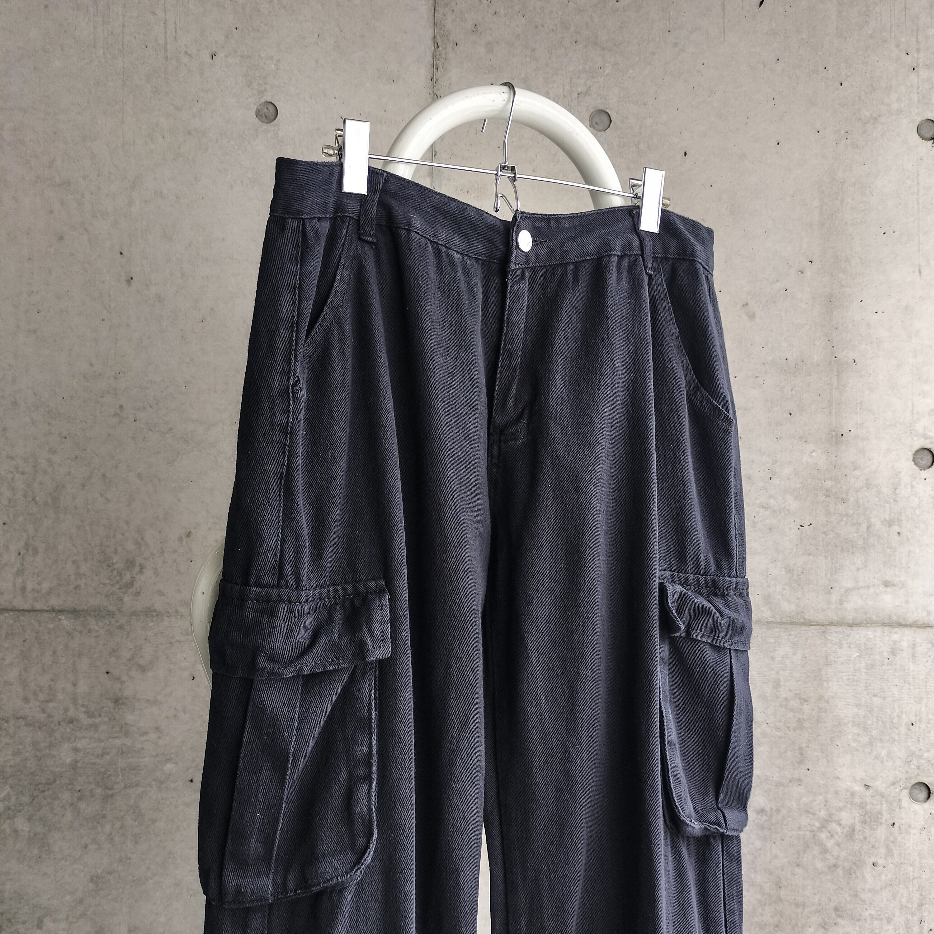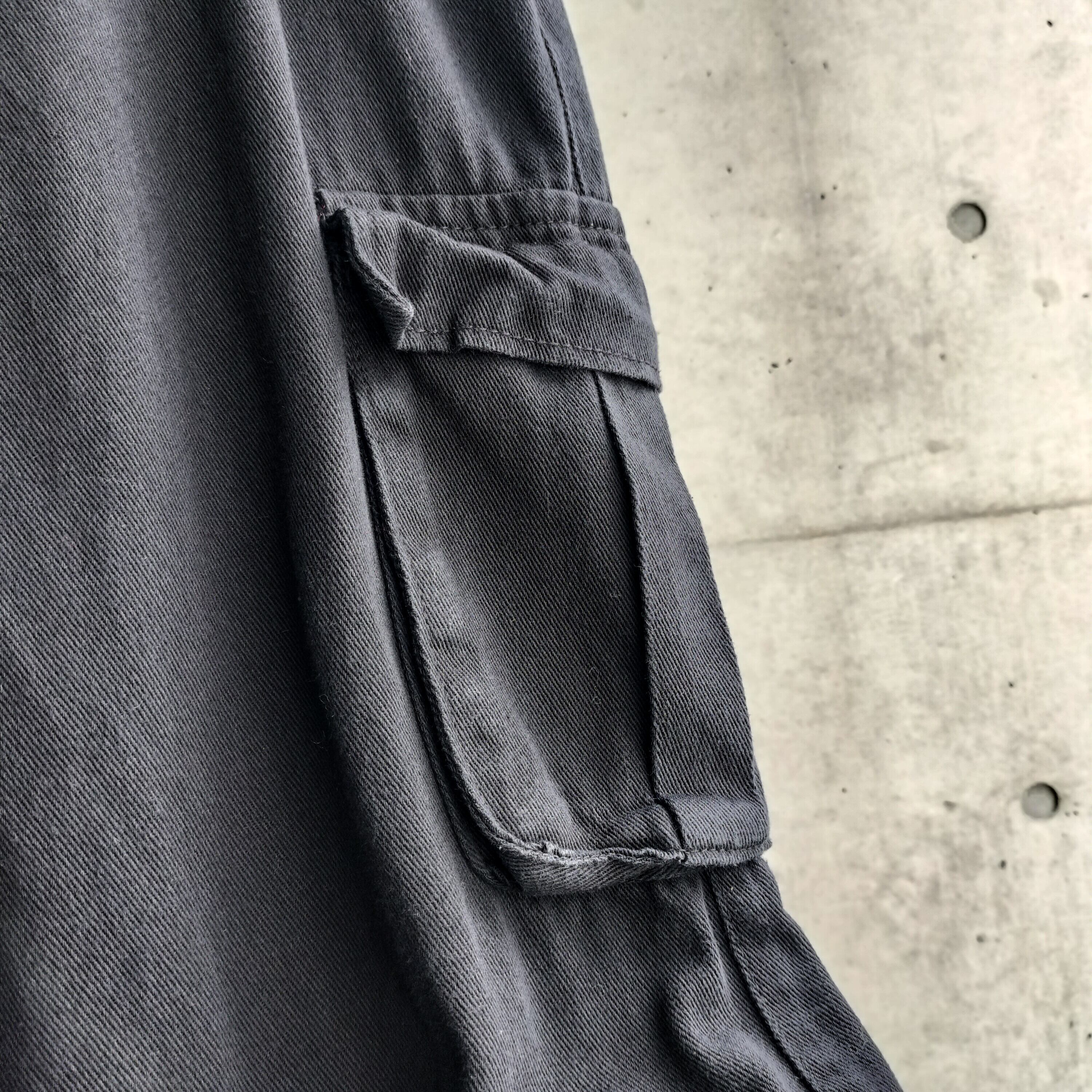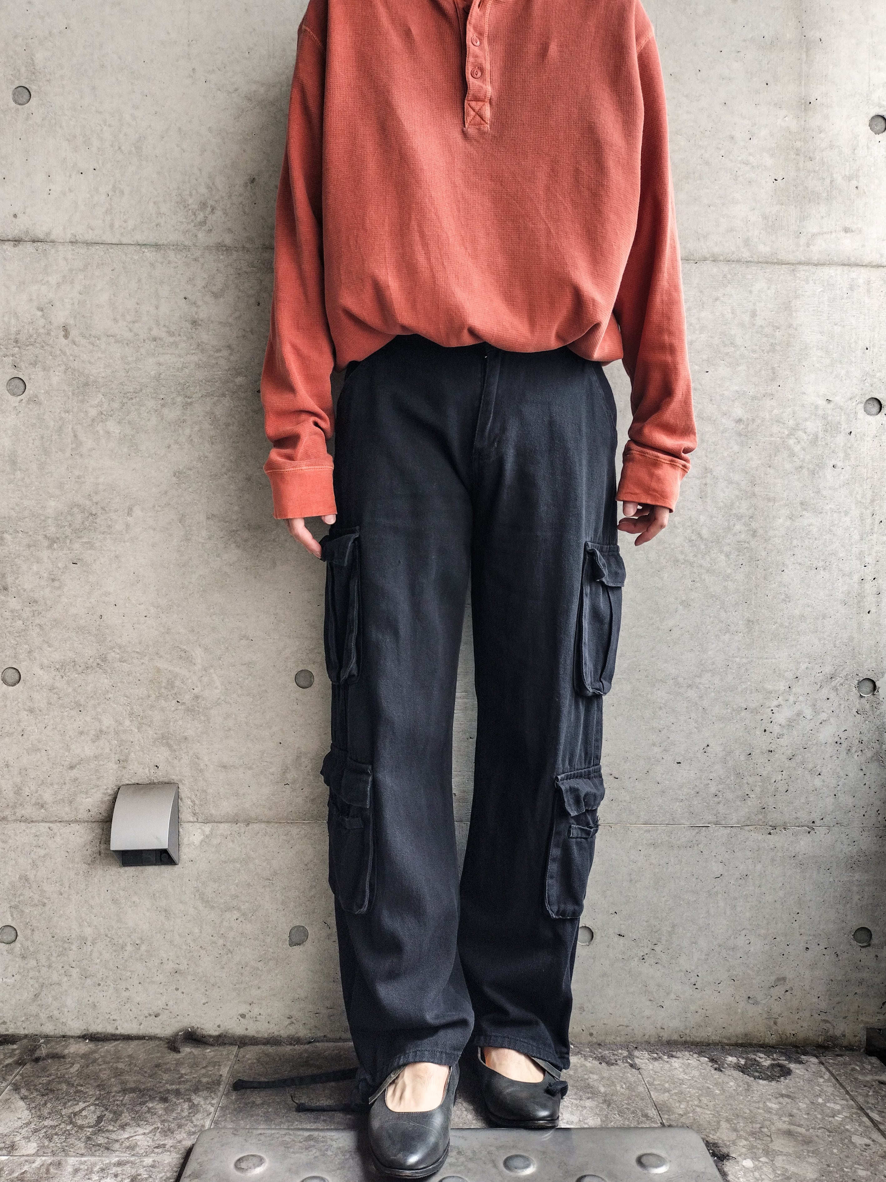 ブラックのコットンカーゴ。ツイル生地で落ち感のある生地です。ポケットが2段付いたダブルカーゴ。裾はドローコード付きで絞ることも可能でシルエットを楽しめます。適度な太さで綺麗目なカーゴパンツです。