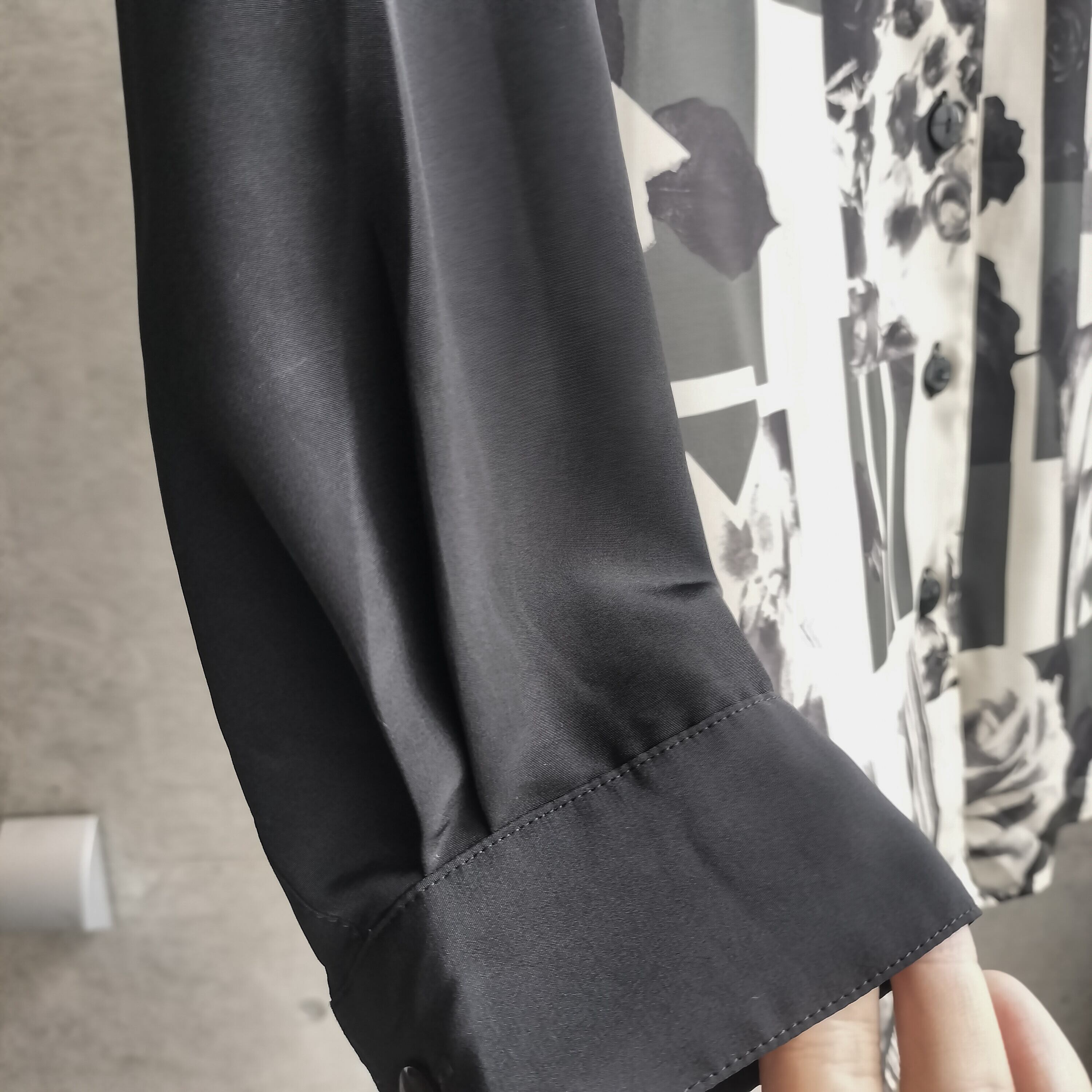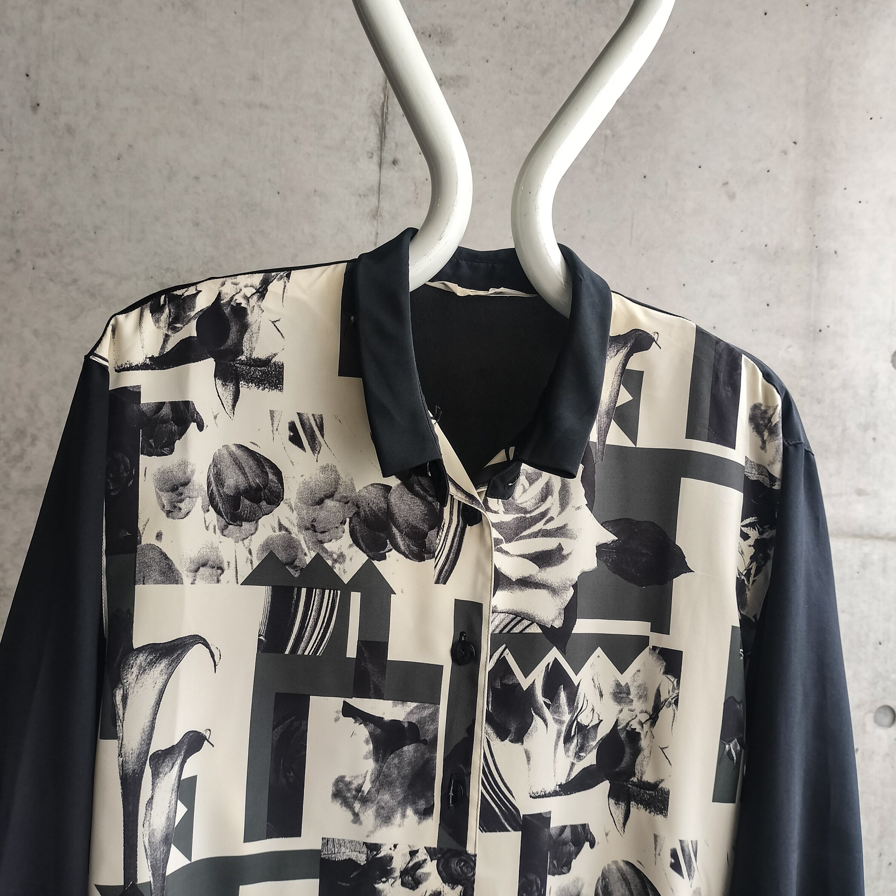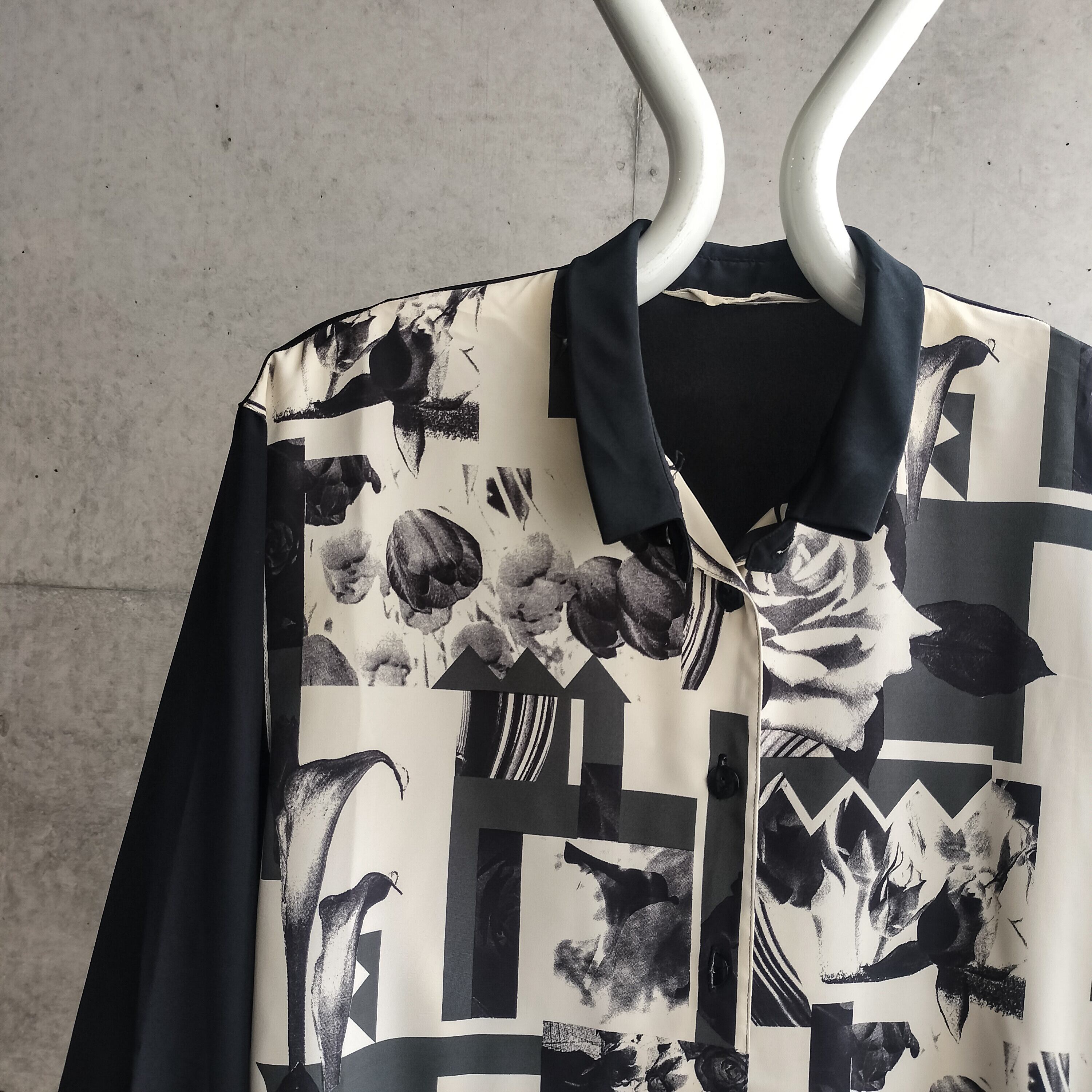 ブラックのデザインシャツ。襟元がボタンで変形仕様になったデザイン。モノトーンなデザインでドレープ生地です。