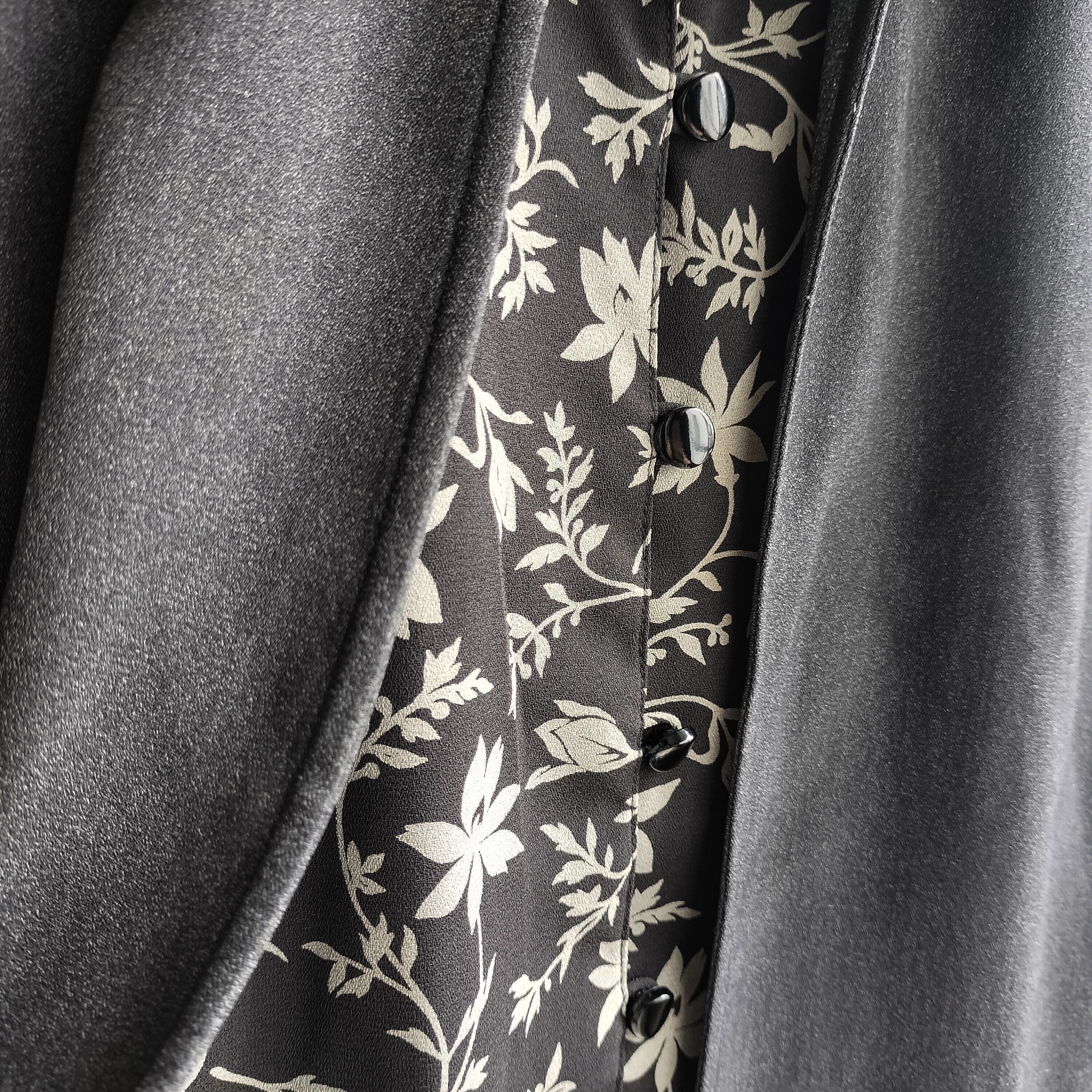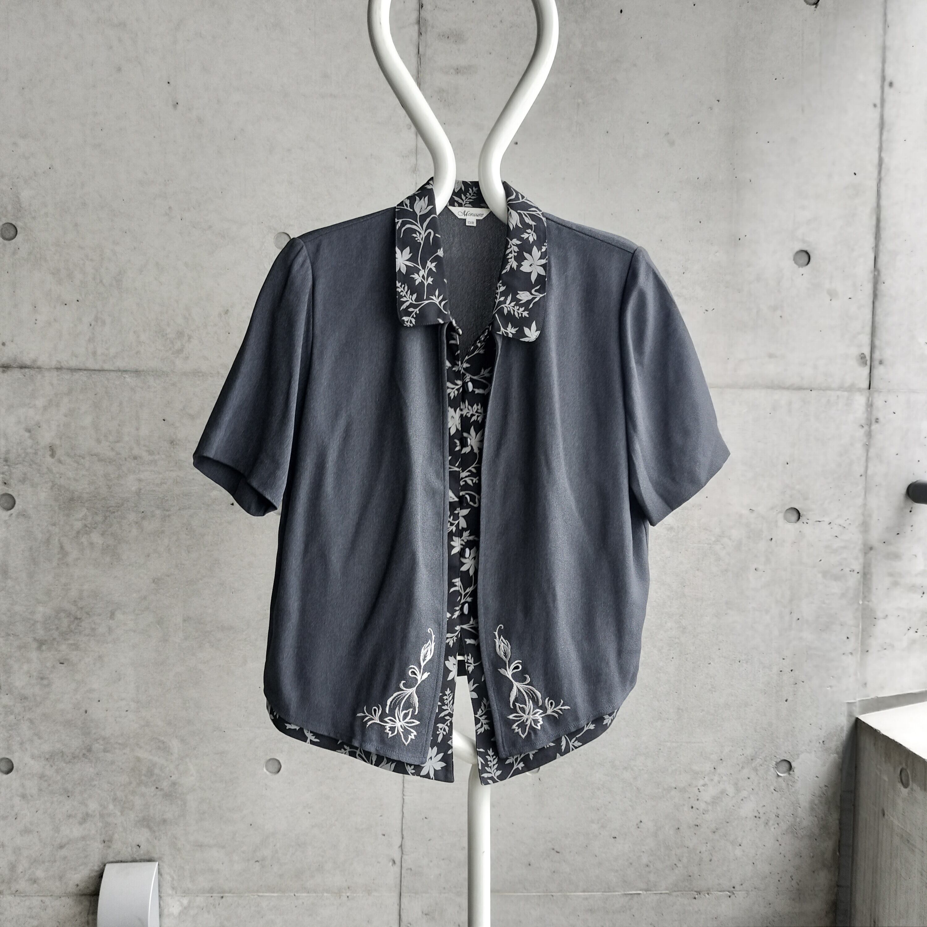 ブラックのレイヤードシャツ。前身頃が花柄のレイヤードになった仕様。裾には刺繍入り。シンプルにデザインが秀逸なシャツです。小柄なメンズ、レディース向けサイズです。