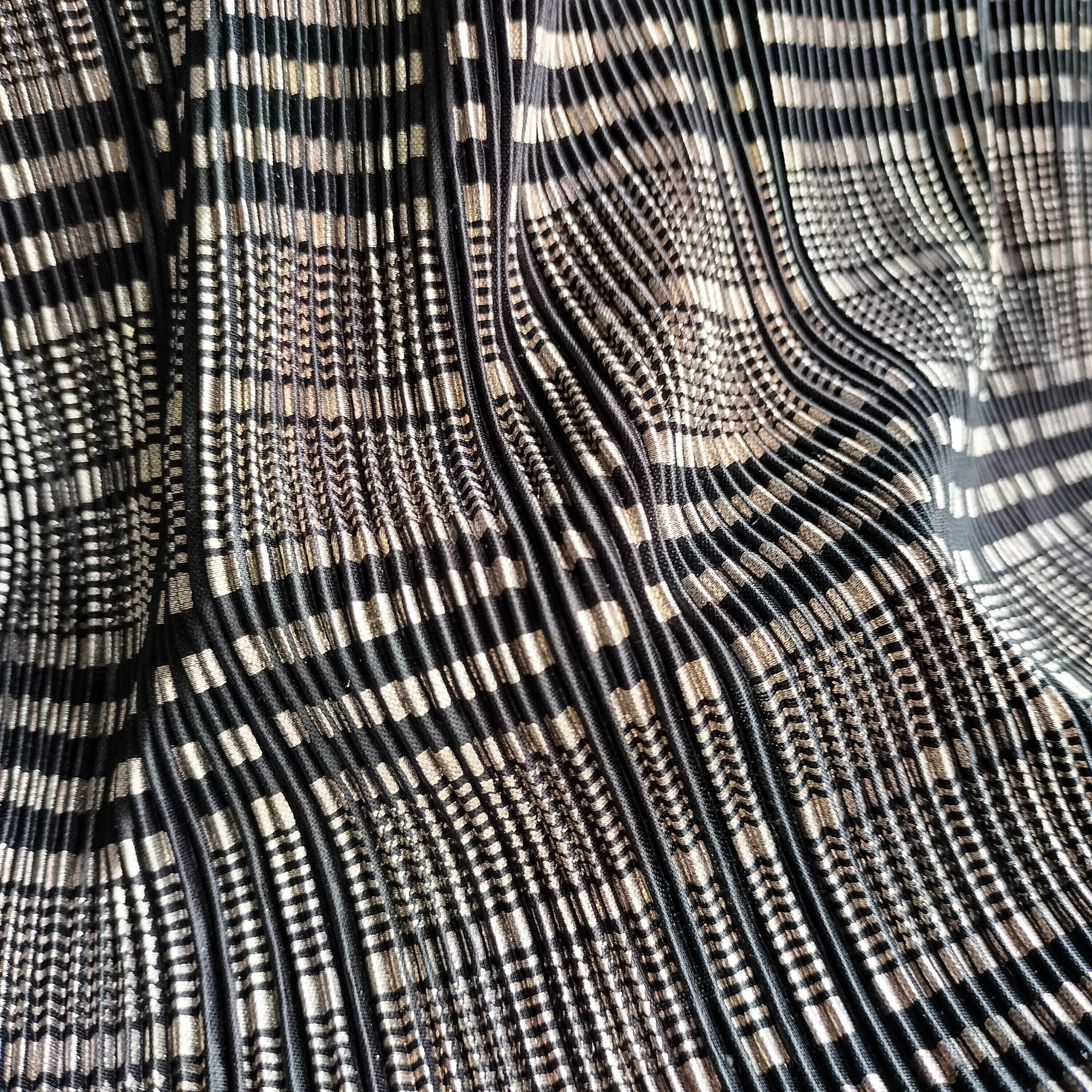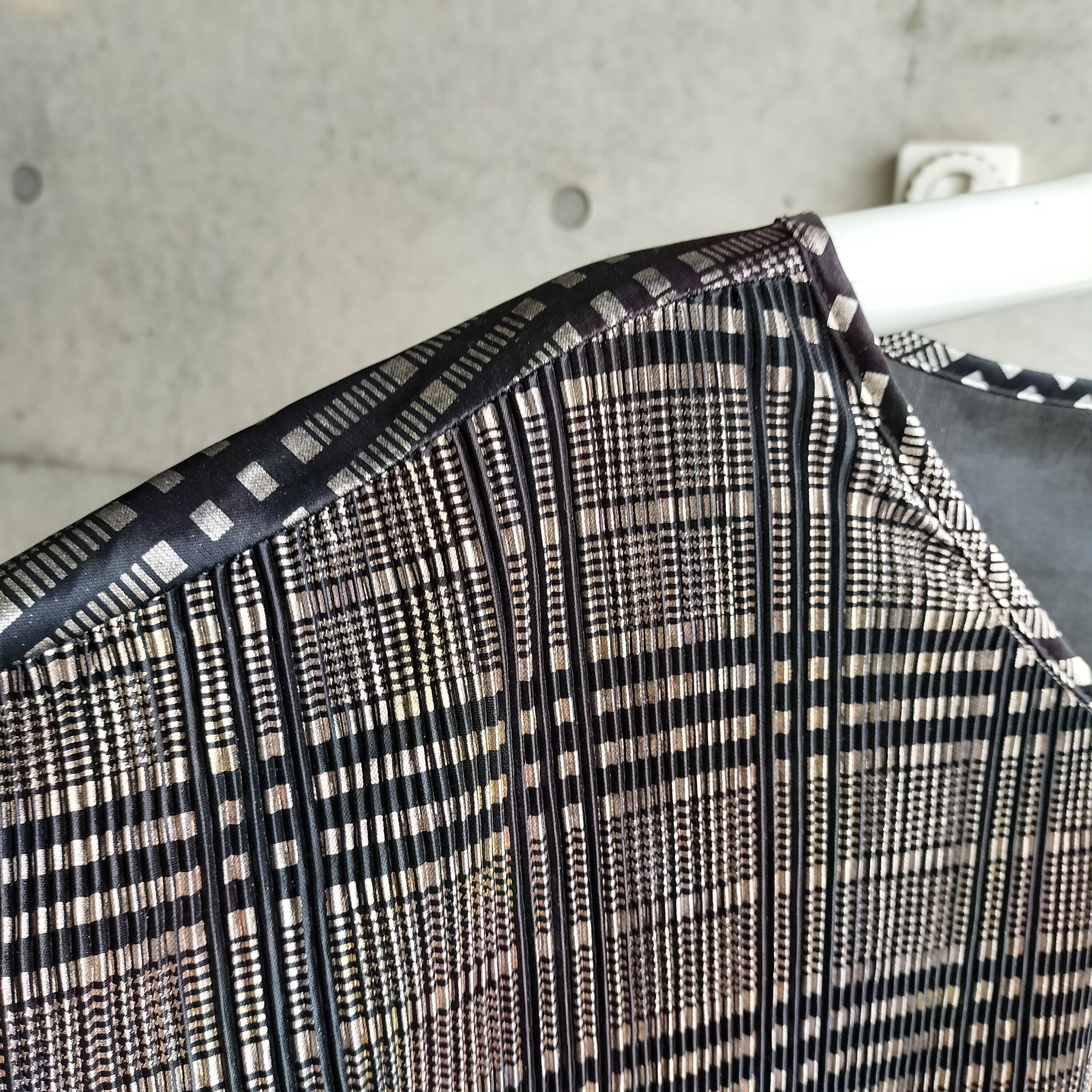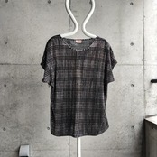 USA製のTee。希少なプリーツ生地でTee。前身頃のみプリーツで後身頃は普通の生地です。ブラックとゴールドのチェックパターン。涼しい生地で真夏の重ね着でも快適です。