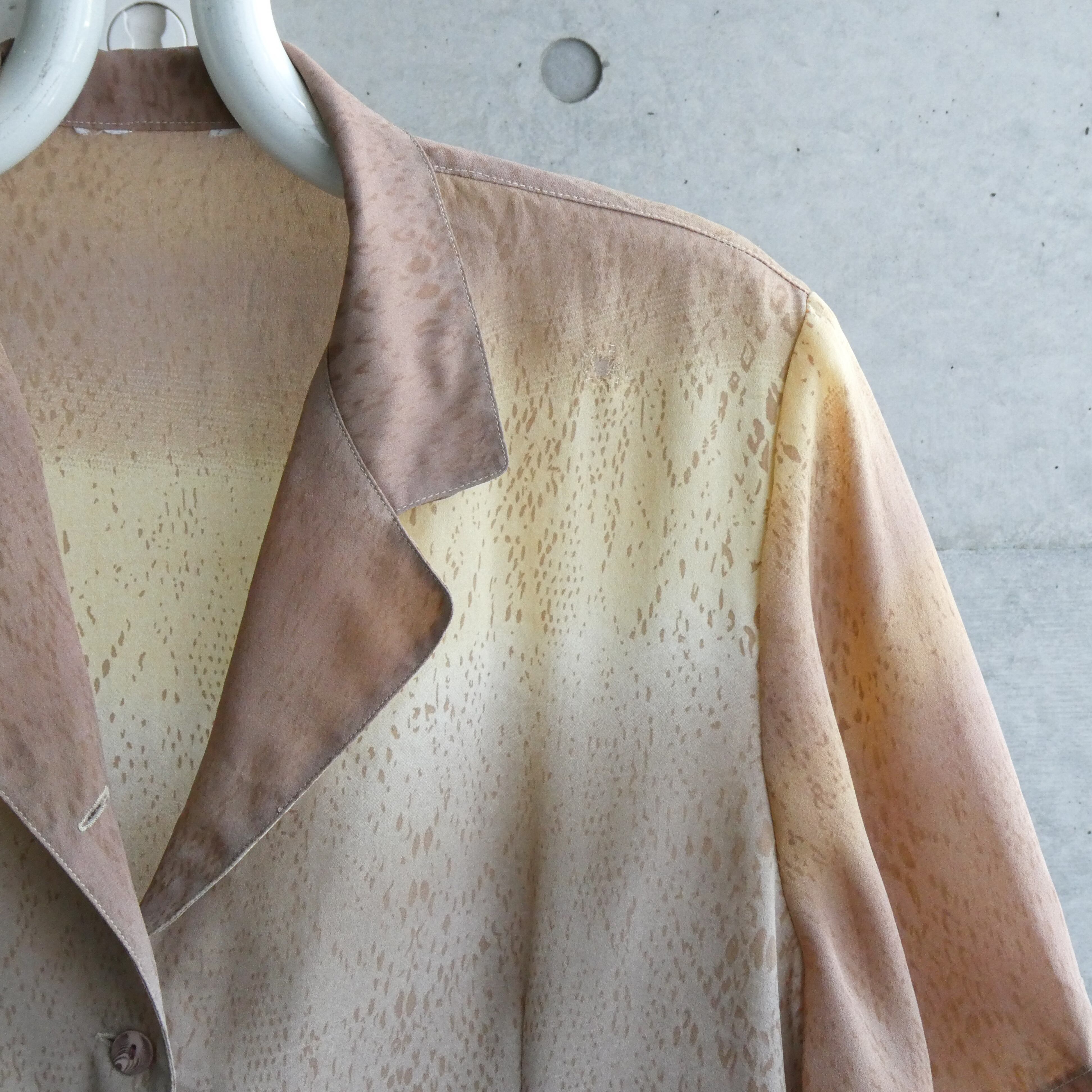 ベージュカラーのグラデーションシャツ。開襟のオープンカラー。襟にデザインとしてボタンホールあるのもいいです。サイドスリット入り。シルエットも綺麗です。