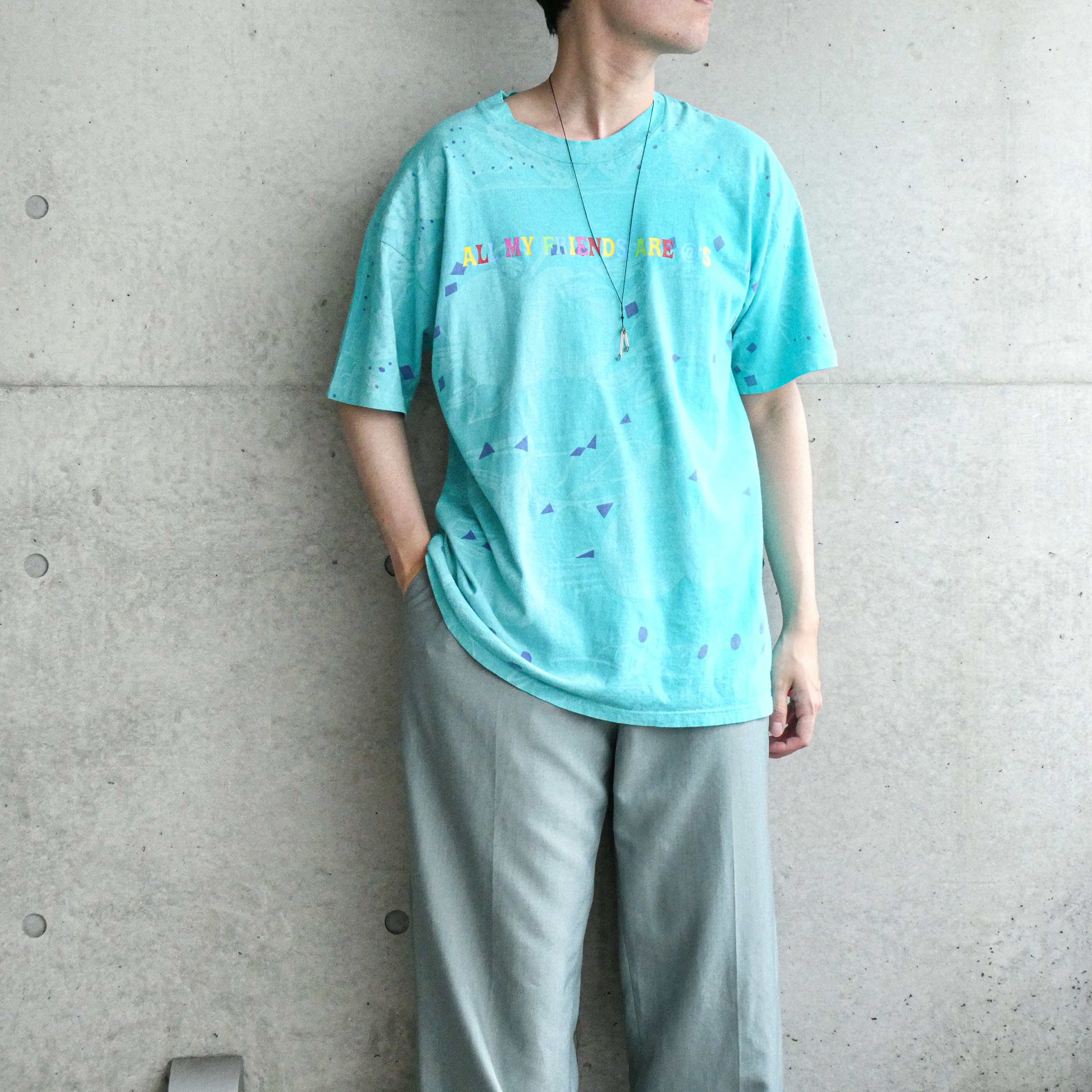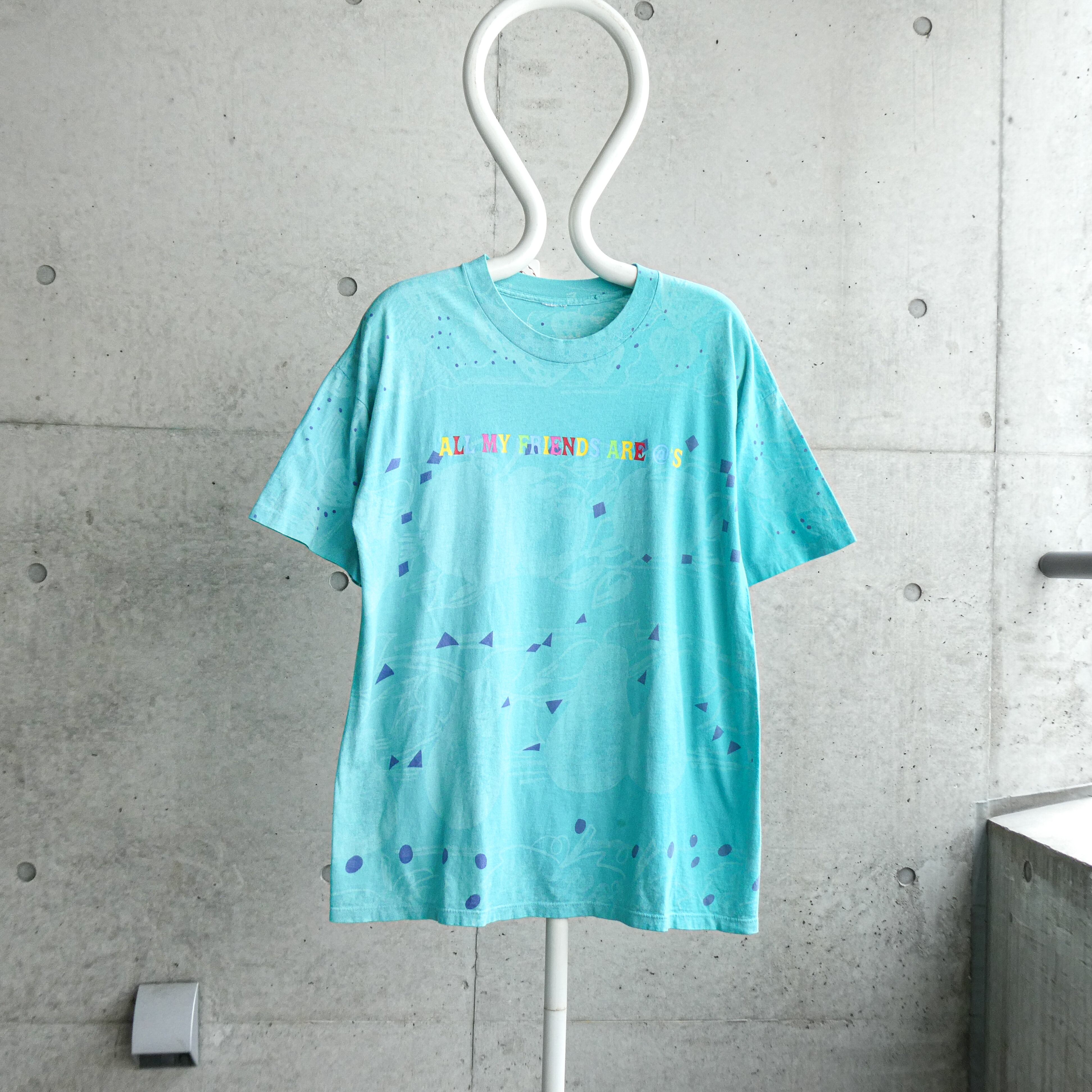 発色の綺麗なブルーカラーのTee。全面にプリントされた贅沢仕様です。うっすらイチゴやリンゴ、梨のグラフィックプリント。袖もシングルステッチです。