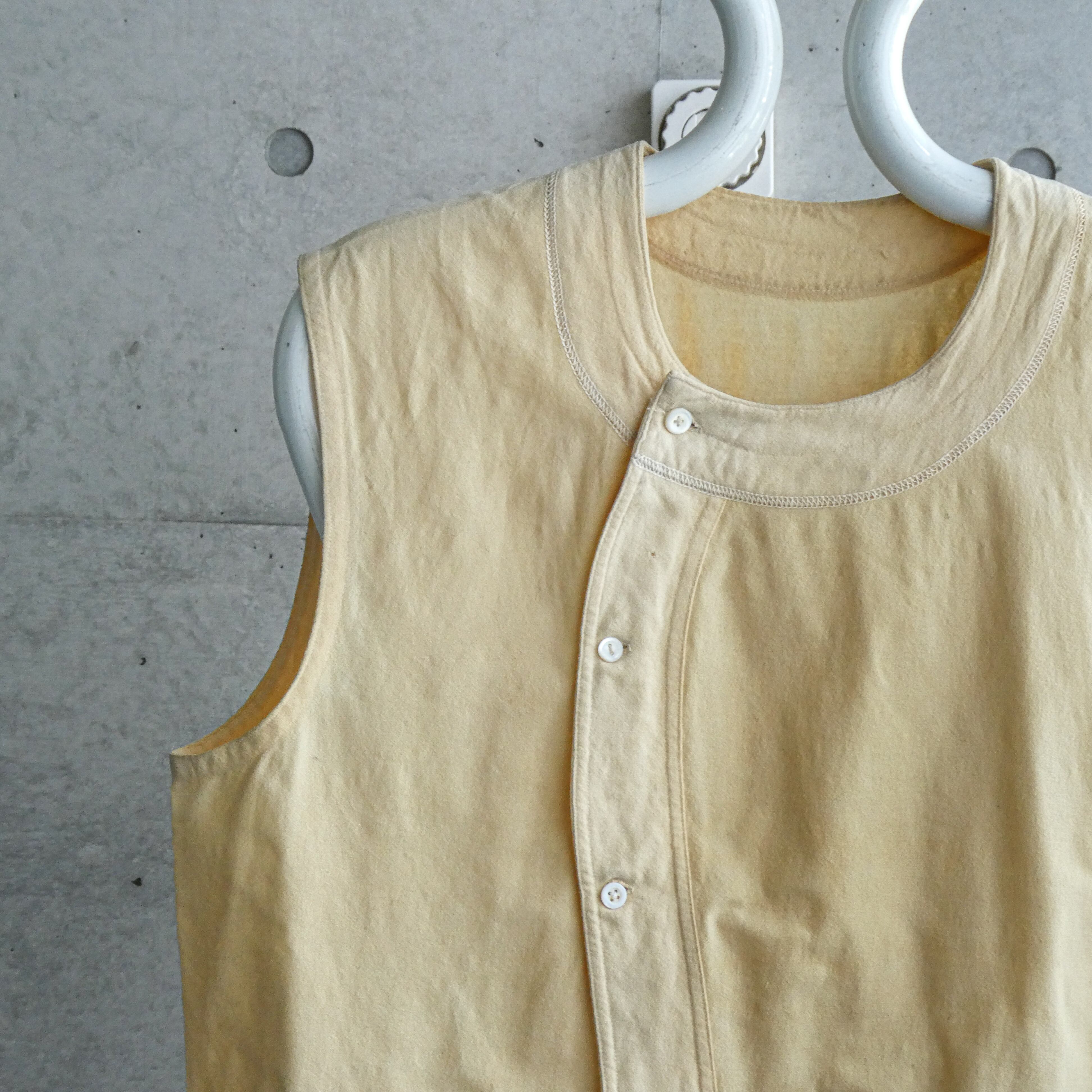 40s頃のフランスのファーマーズベスト。バター色でカーブを描いたフロントが特徴です。一見デザイナーズのようなカーブデザイン。インナーでもアクセント出せる一着です。