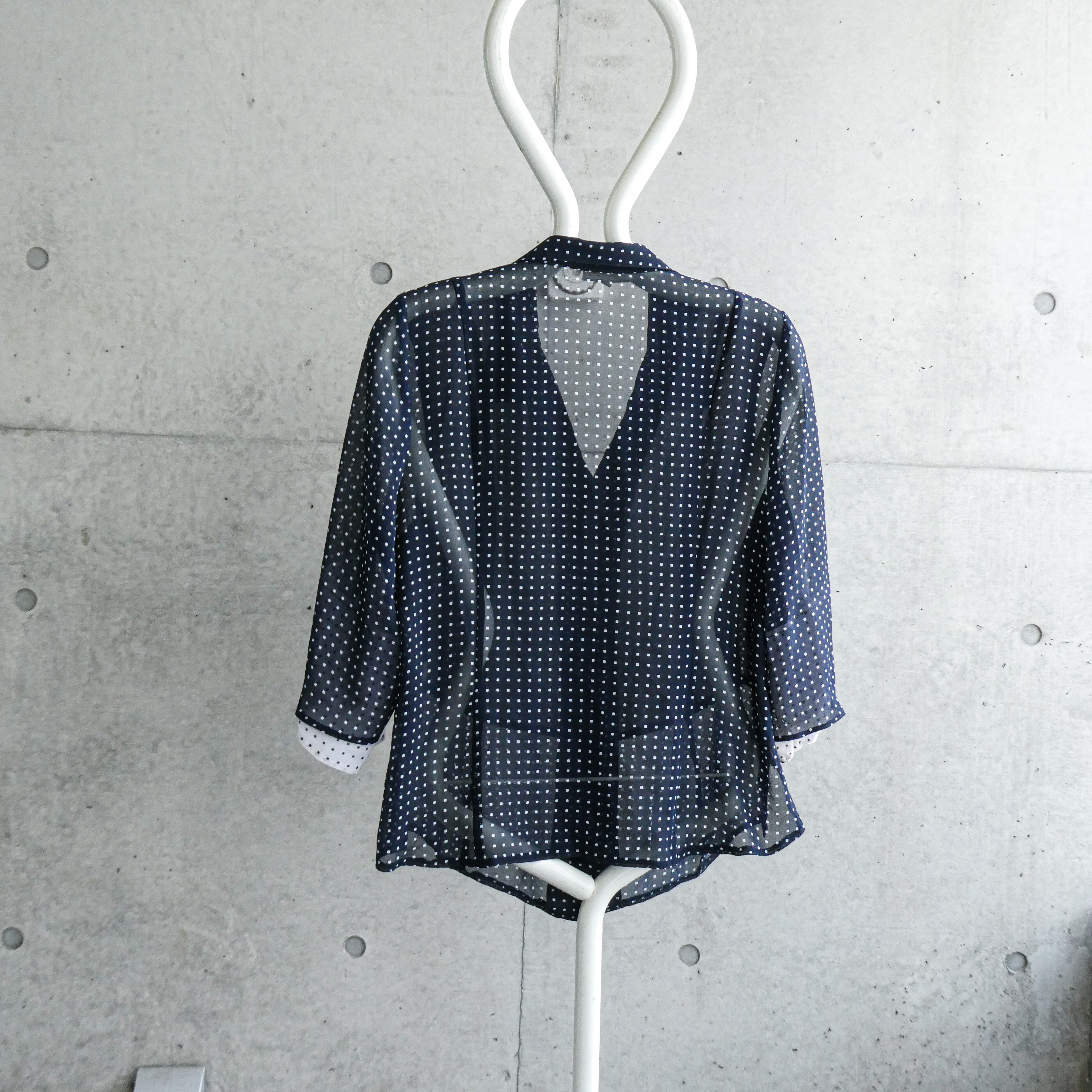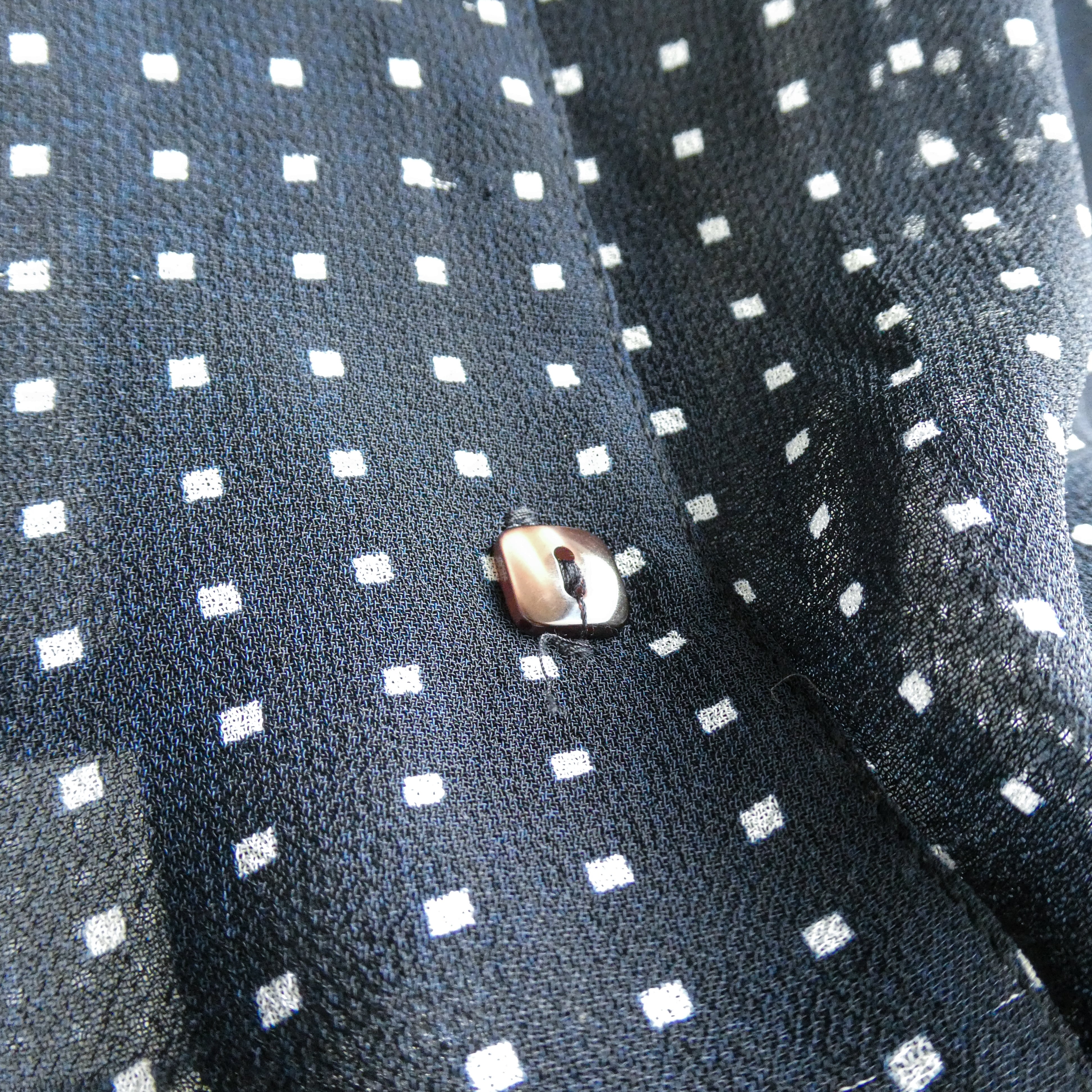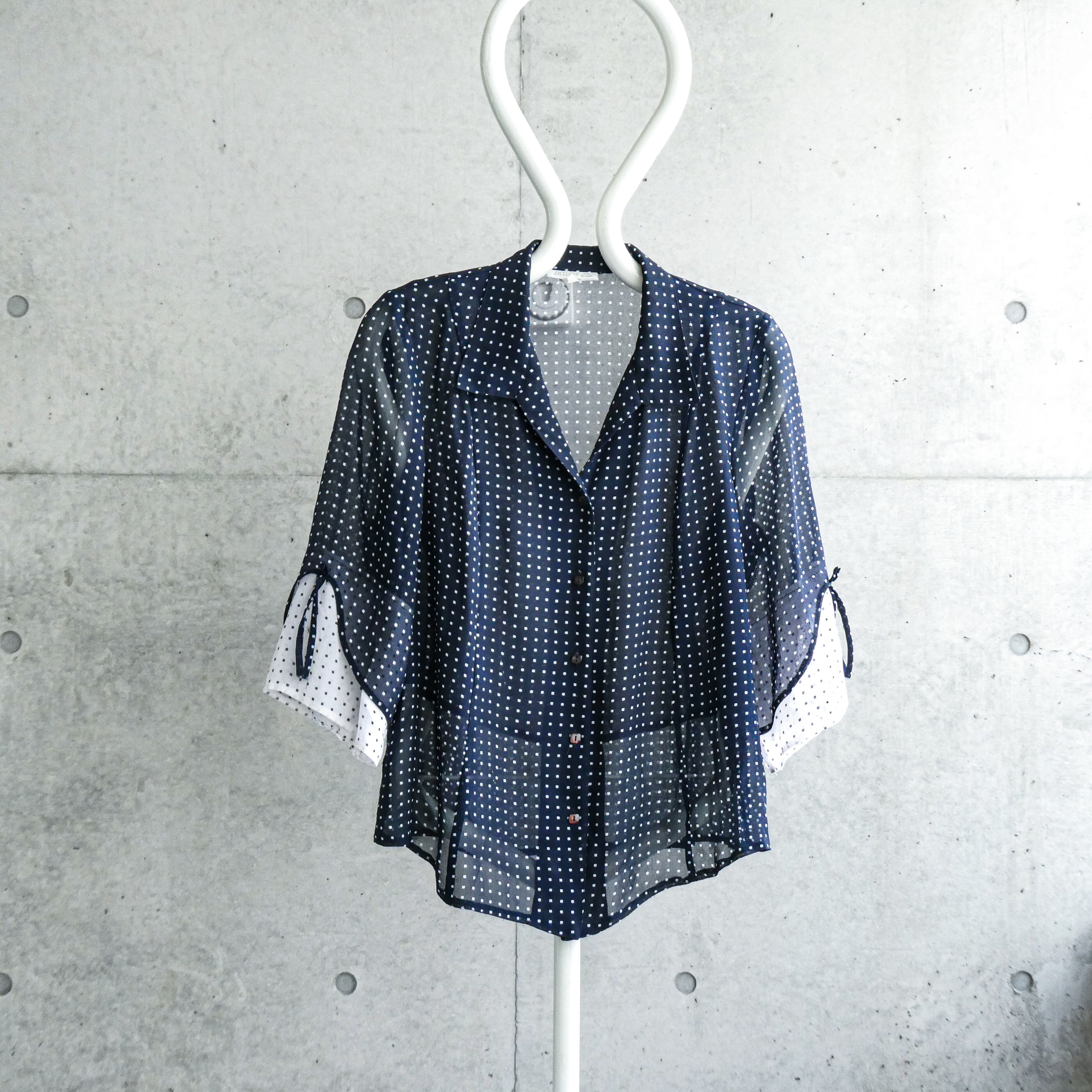 ネイビーカラーの開襟シャツ。袖がレイヤードになった珍しいデザイン。袖に紐が付いてるのもgoodディテール。古着らしい開襟シャツです。