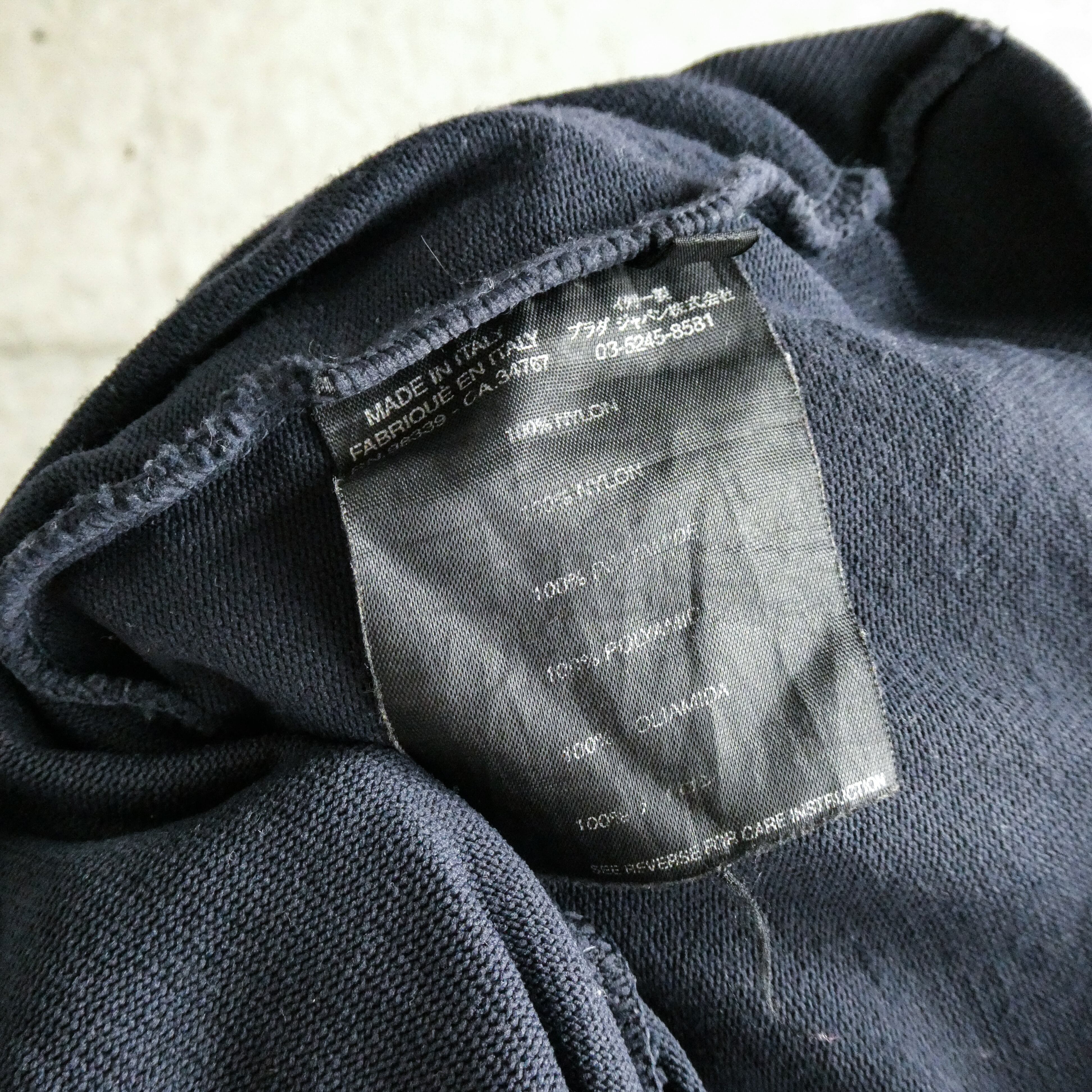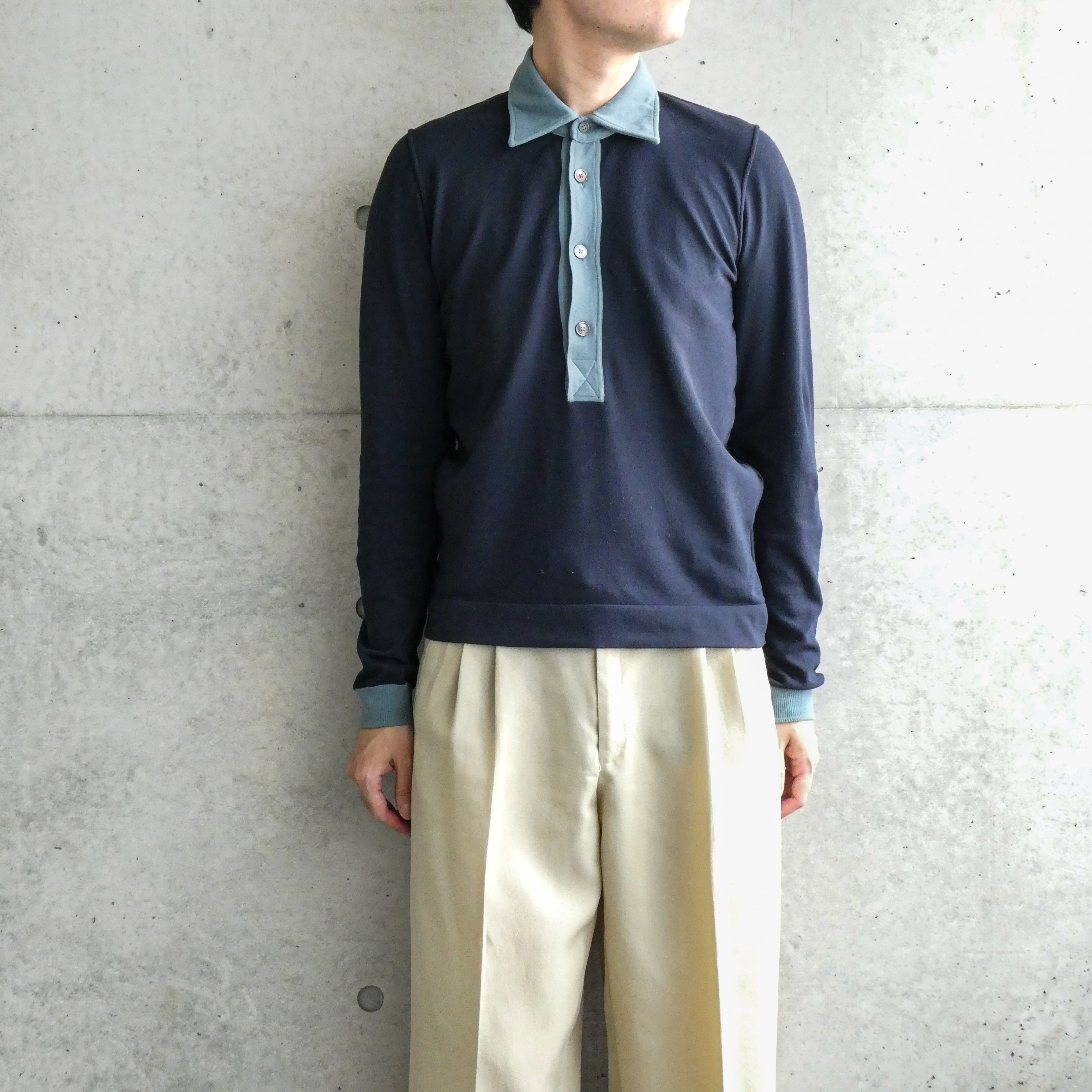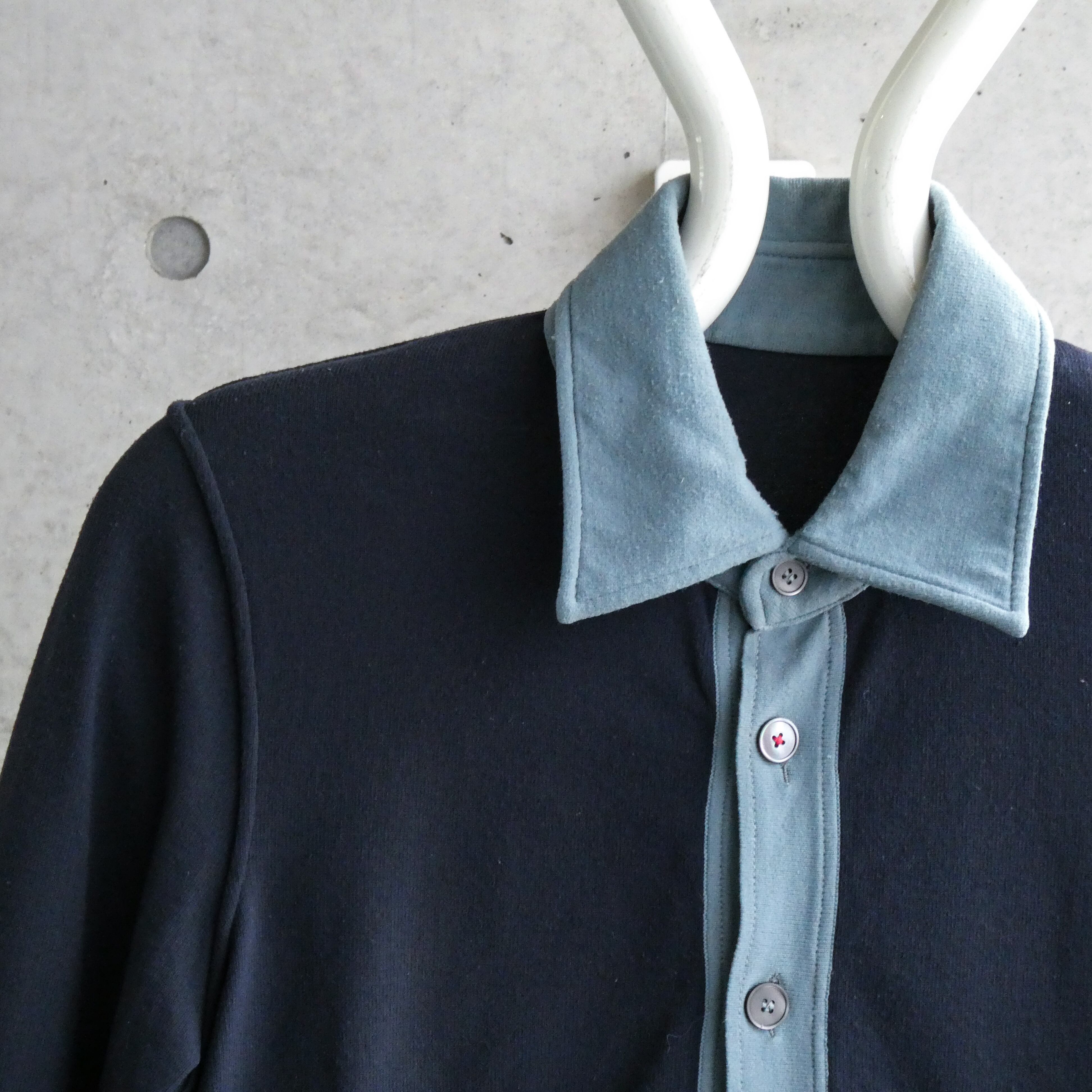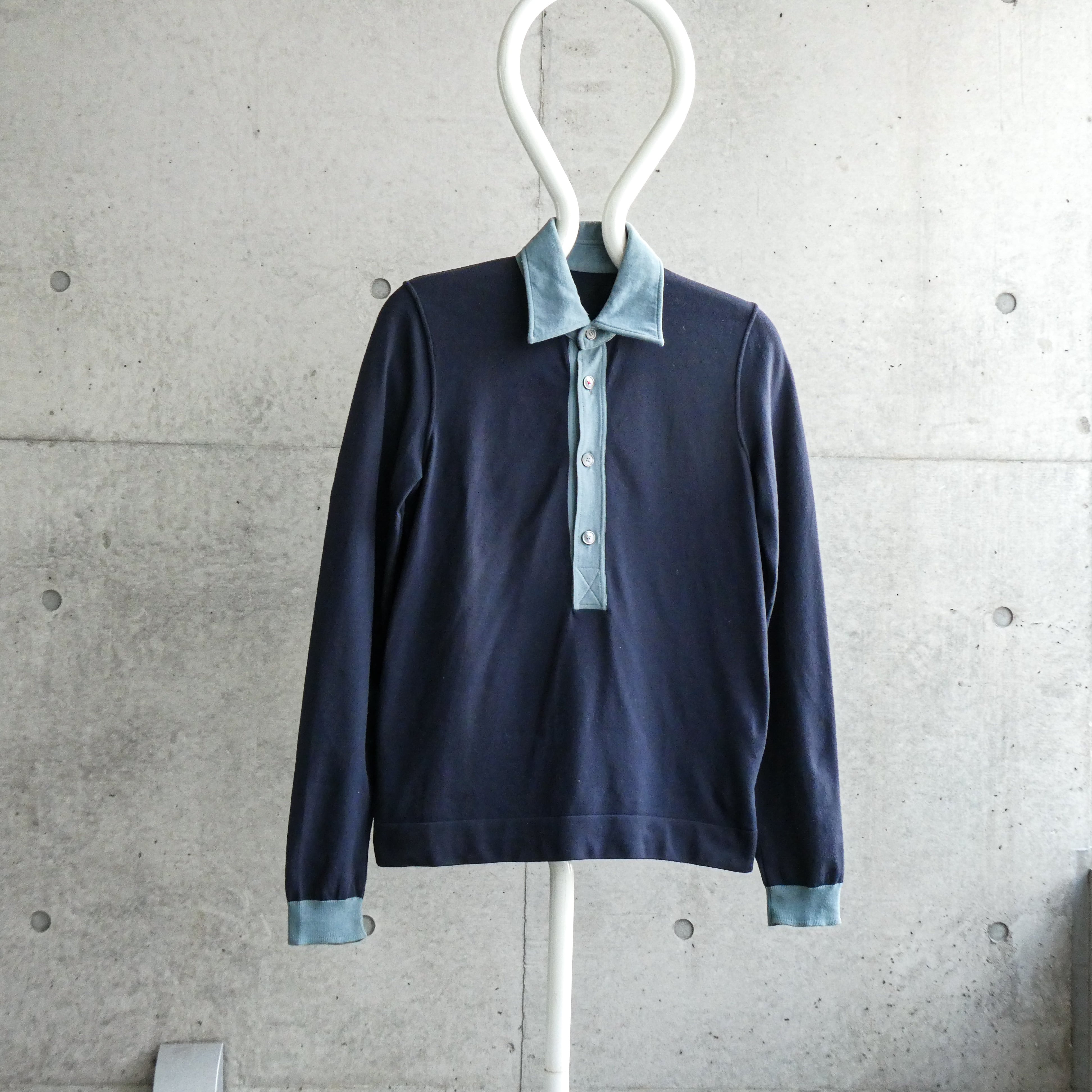 PRADAの2トーンポロ。ネイビーと水色の2トーン。第2ボタンの糸が赤なのも可愛くてアクセントになるディテールです。細身の黒パンツと合わせてもカッコイイと思います。