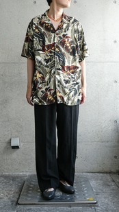 珍しいブラウンとブラックカラーのアロハシャツ。レーヨン100のトロトロ生地です。とにかく柄と配色がカッコイイです。所々黄色が混ざっているのが◎。シルエットも完璧です。
