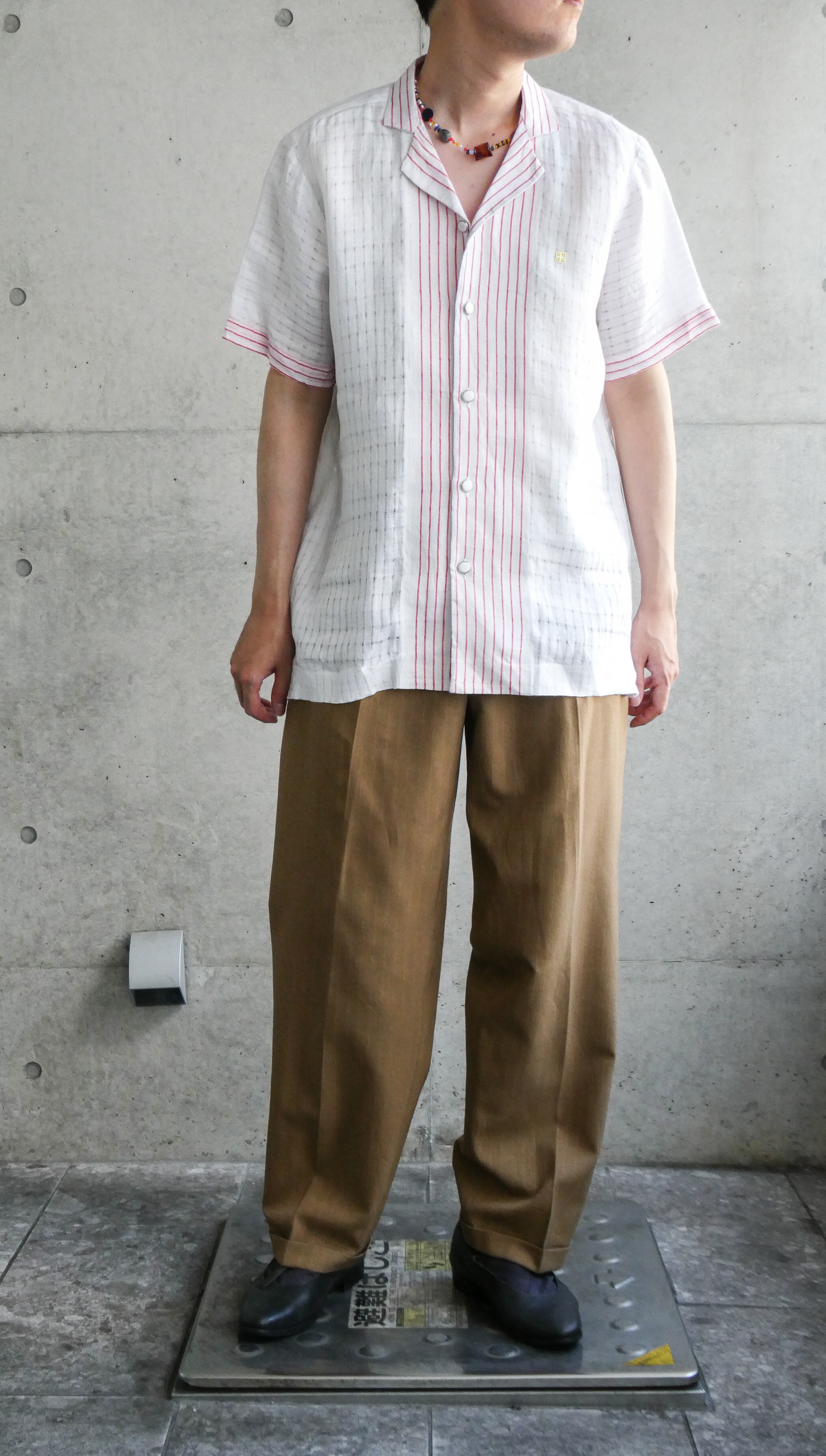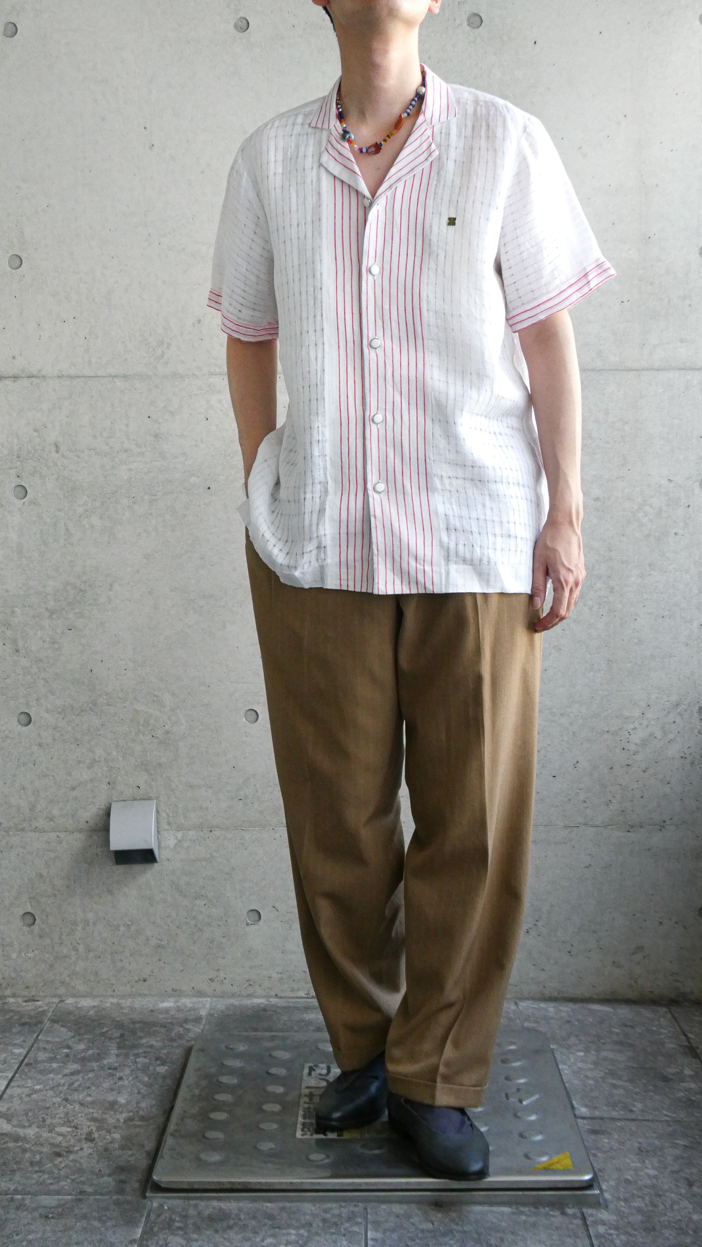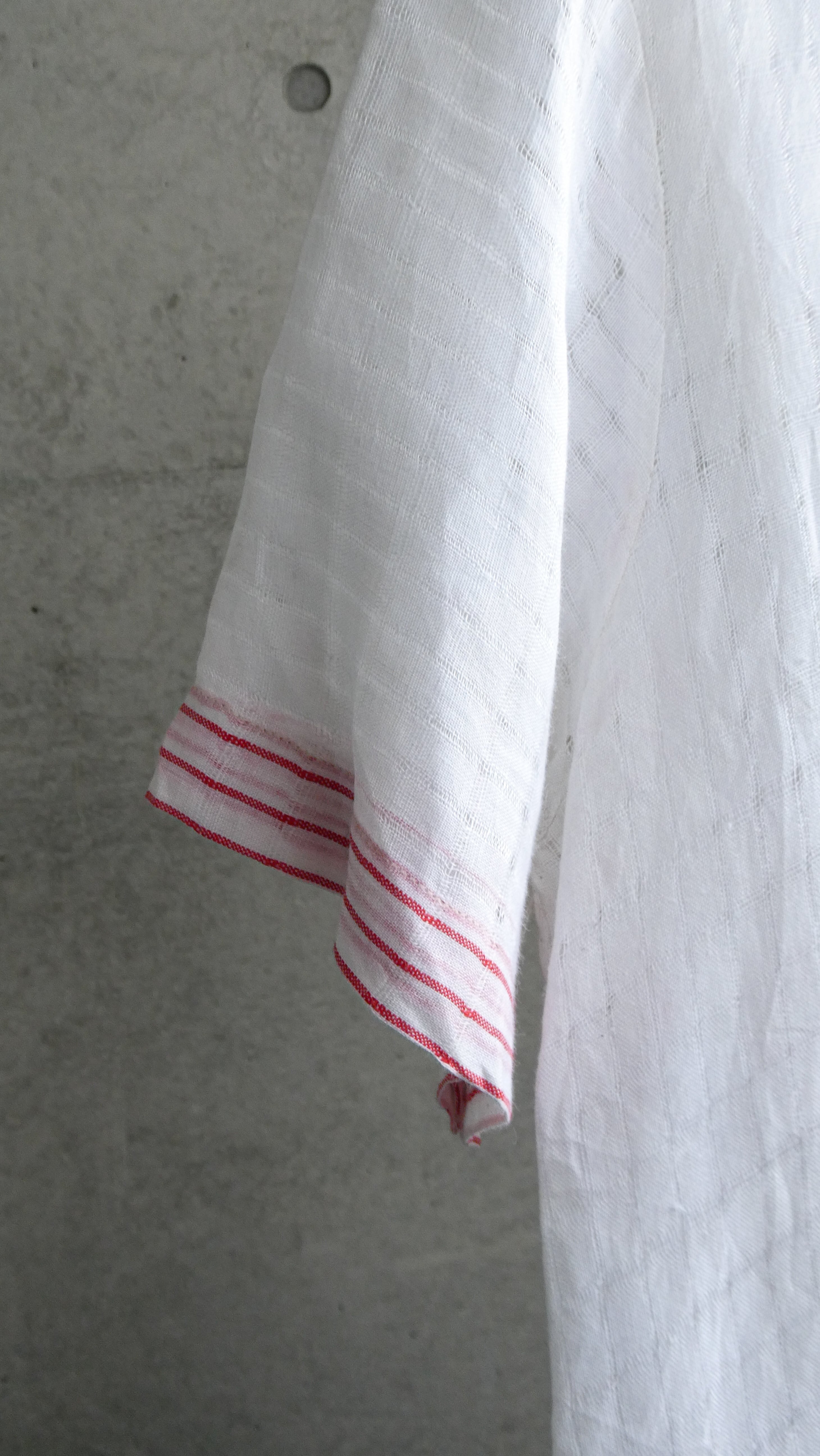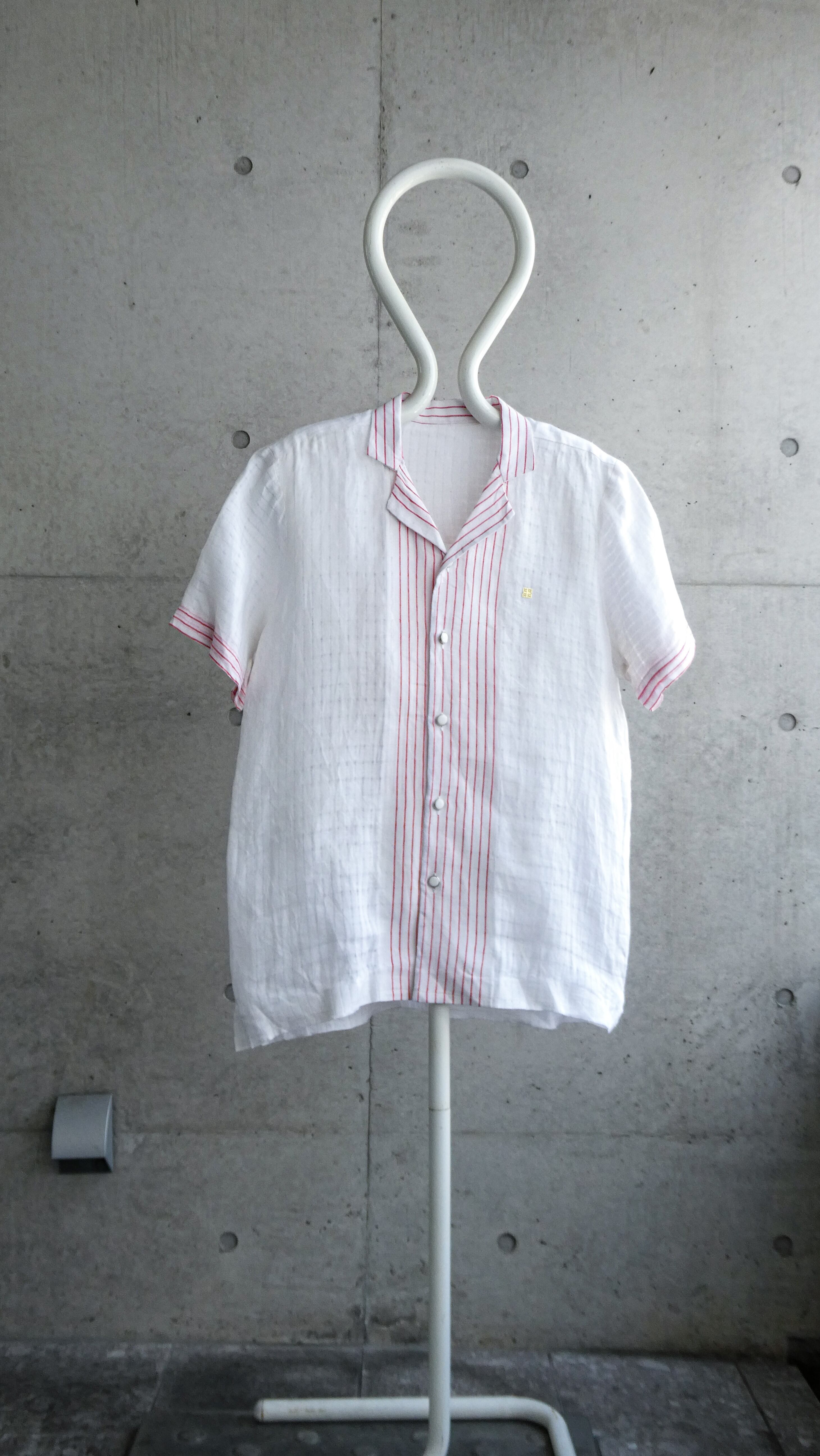 白ベースに赤のストライプパターンのリネンシャツ。白無地部分も格子状に生地の濃淡がある変わった生地です。ボタンも最高。めちゃくちゃ洒落たリネンシャツです。