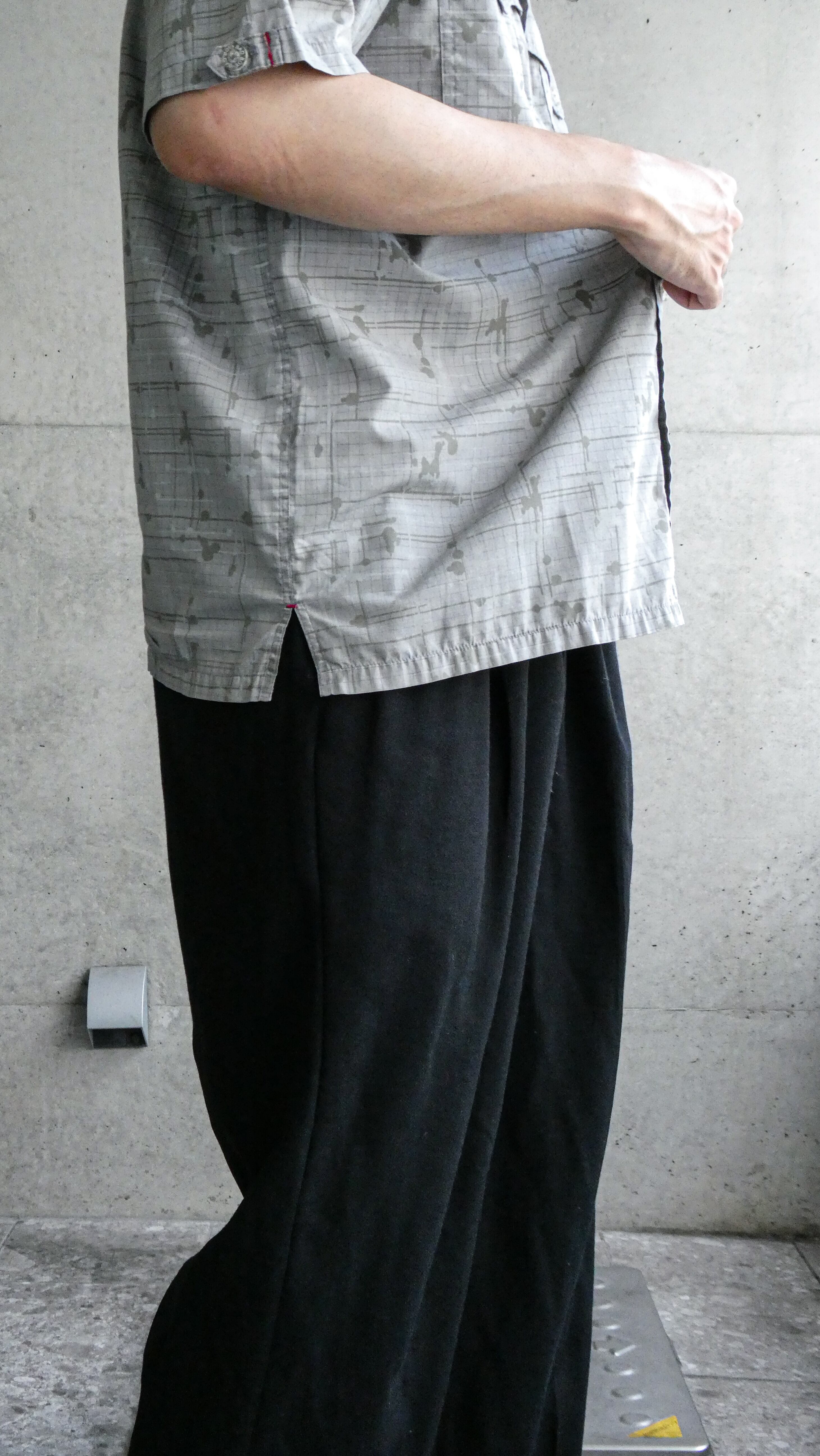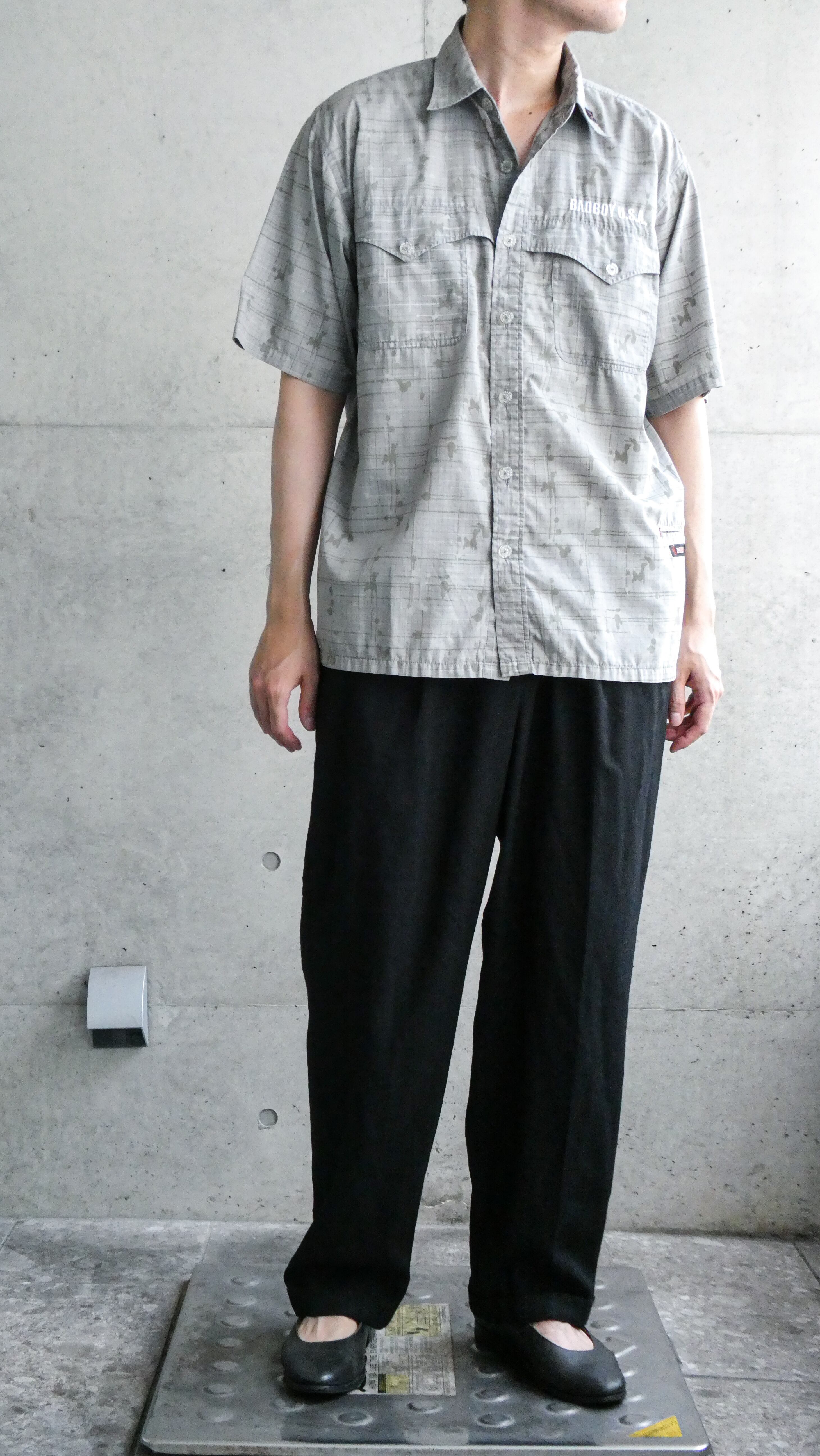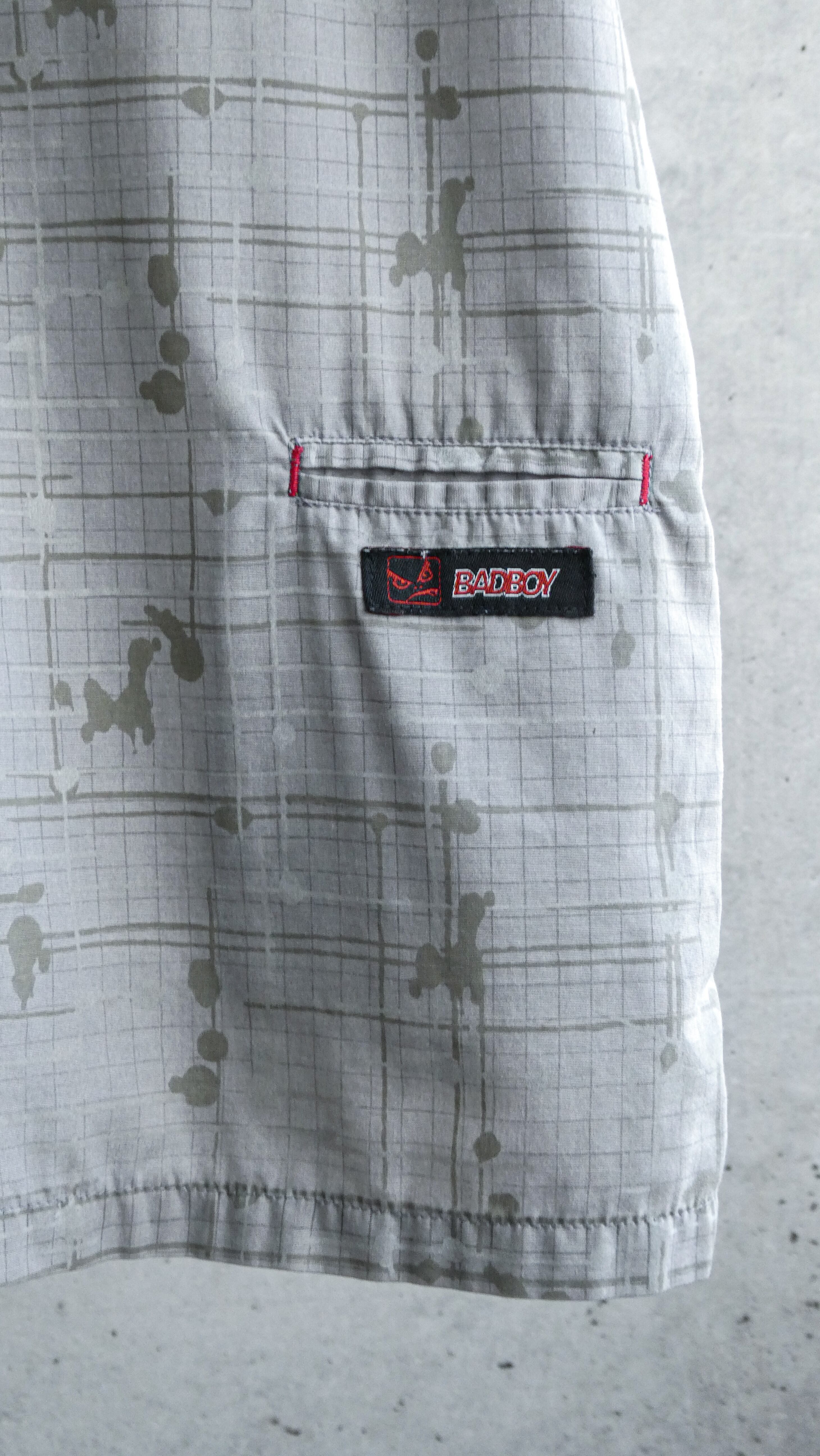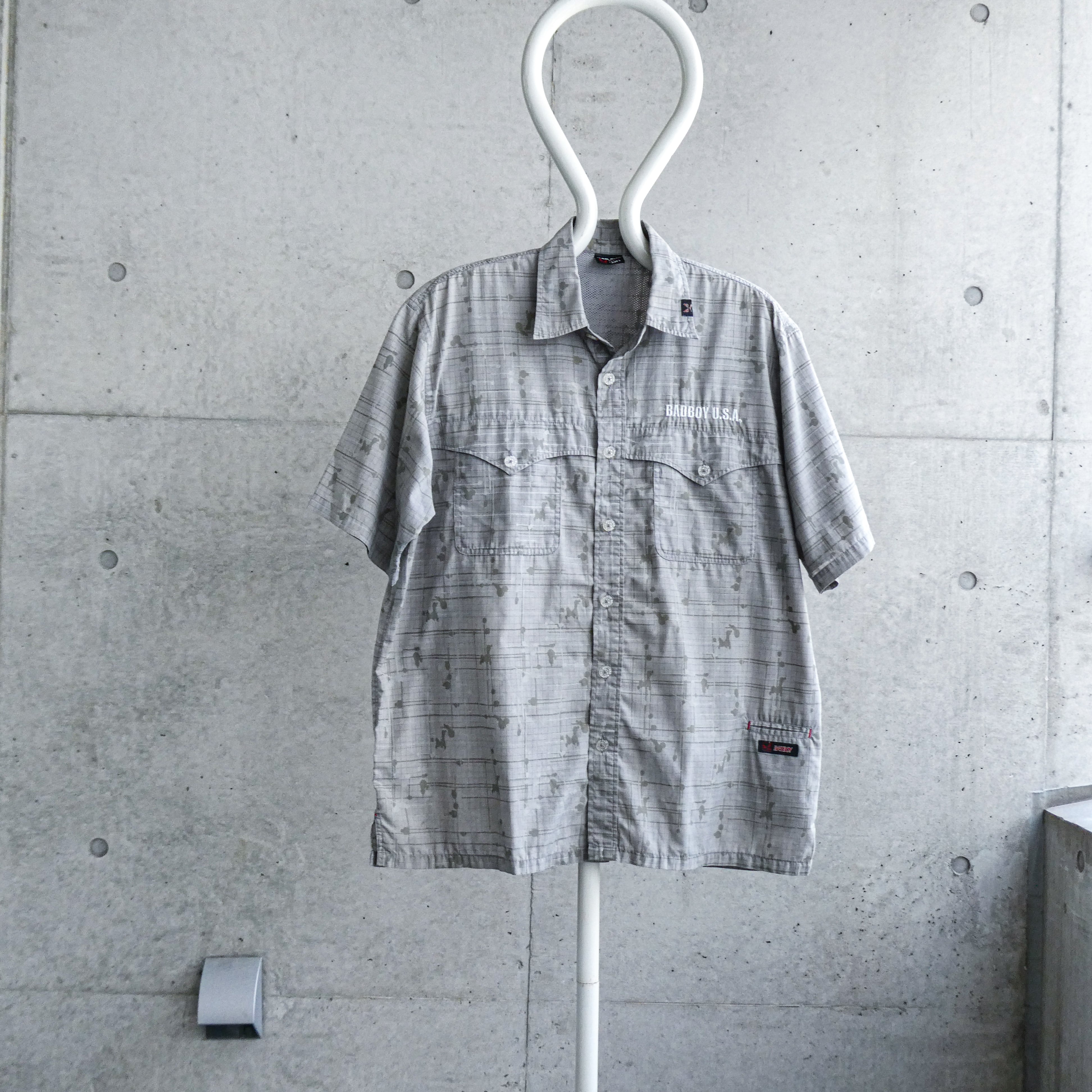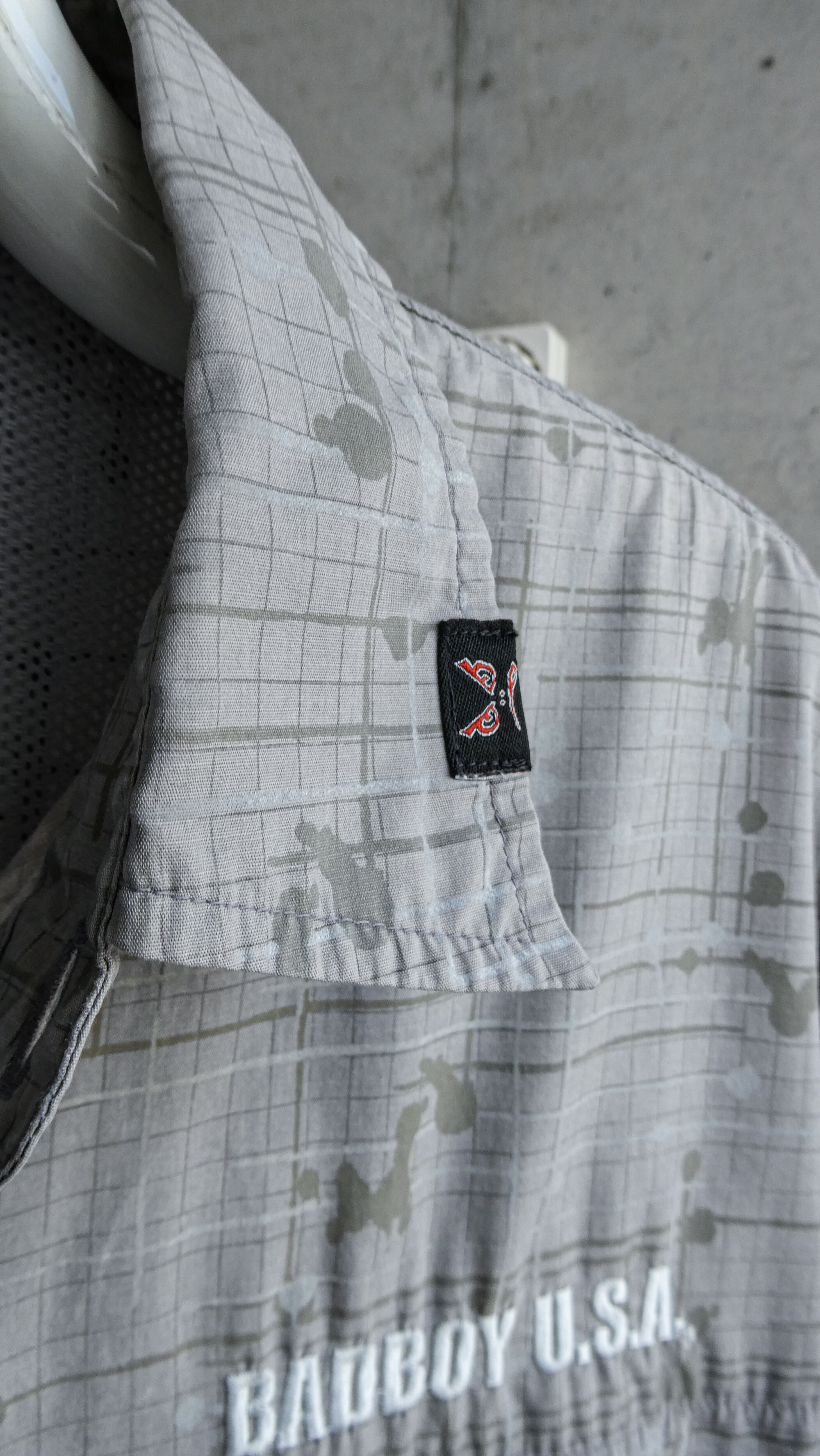 アメリカ物のBAD BOYSのシャツ。元々はカリフォルニア発祥のストリートブランド。現代的なグレーのカモフラ。斬新な襟に顔タグ。裾に小さなポケットなど面白いディテールです。綺麗なボックスシルエット。
