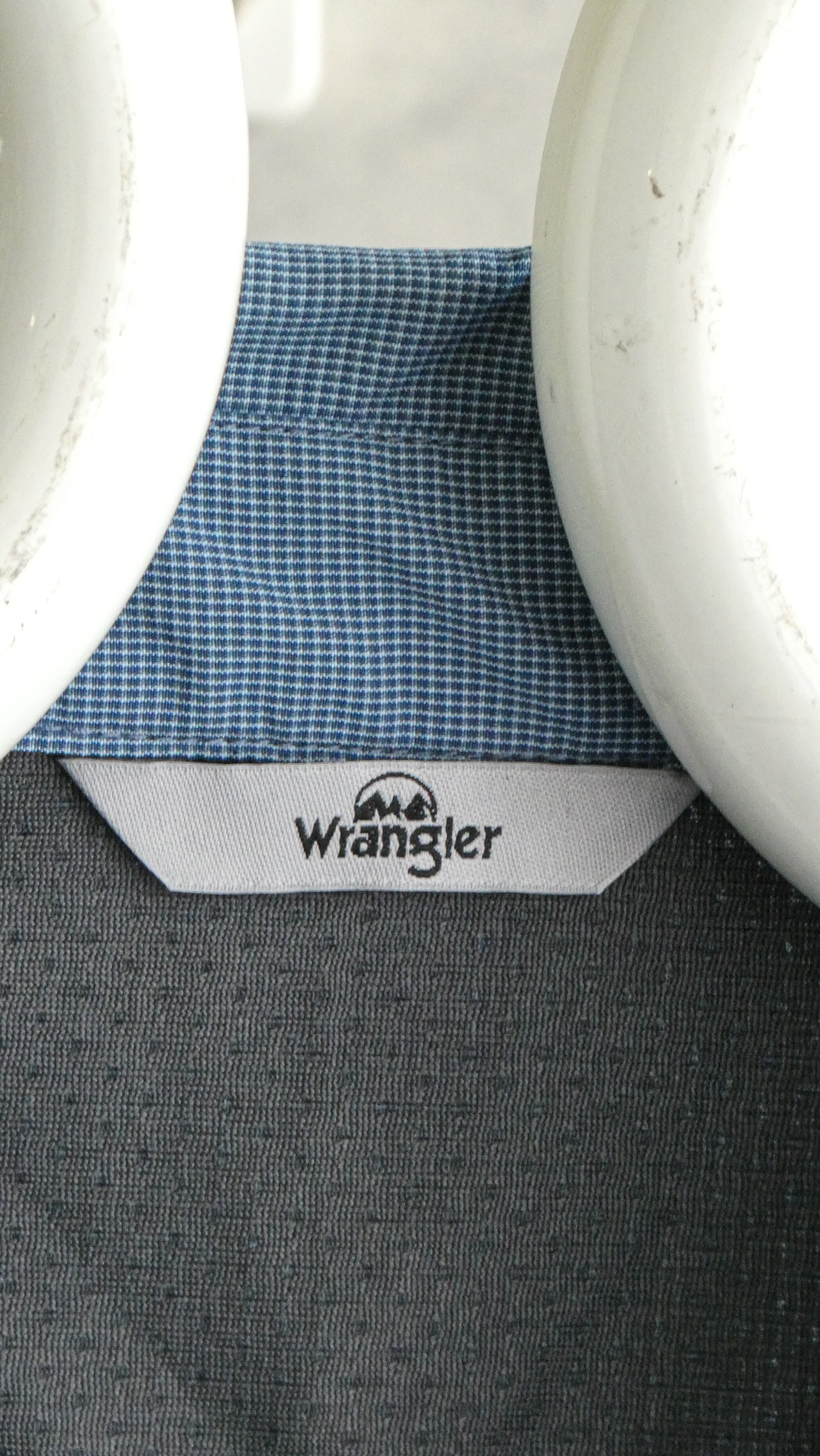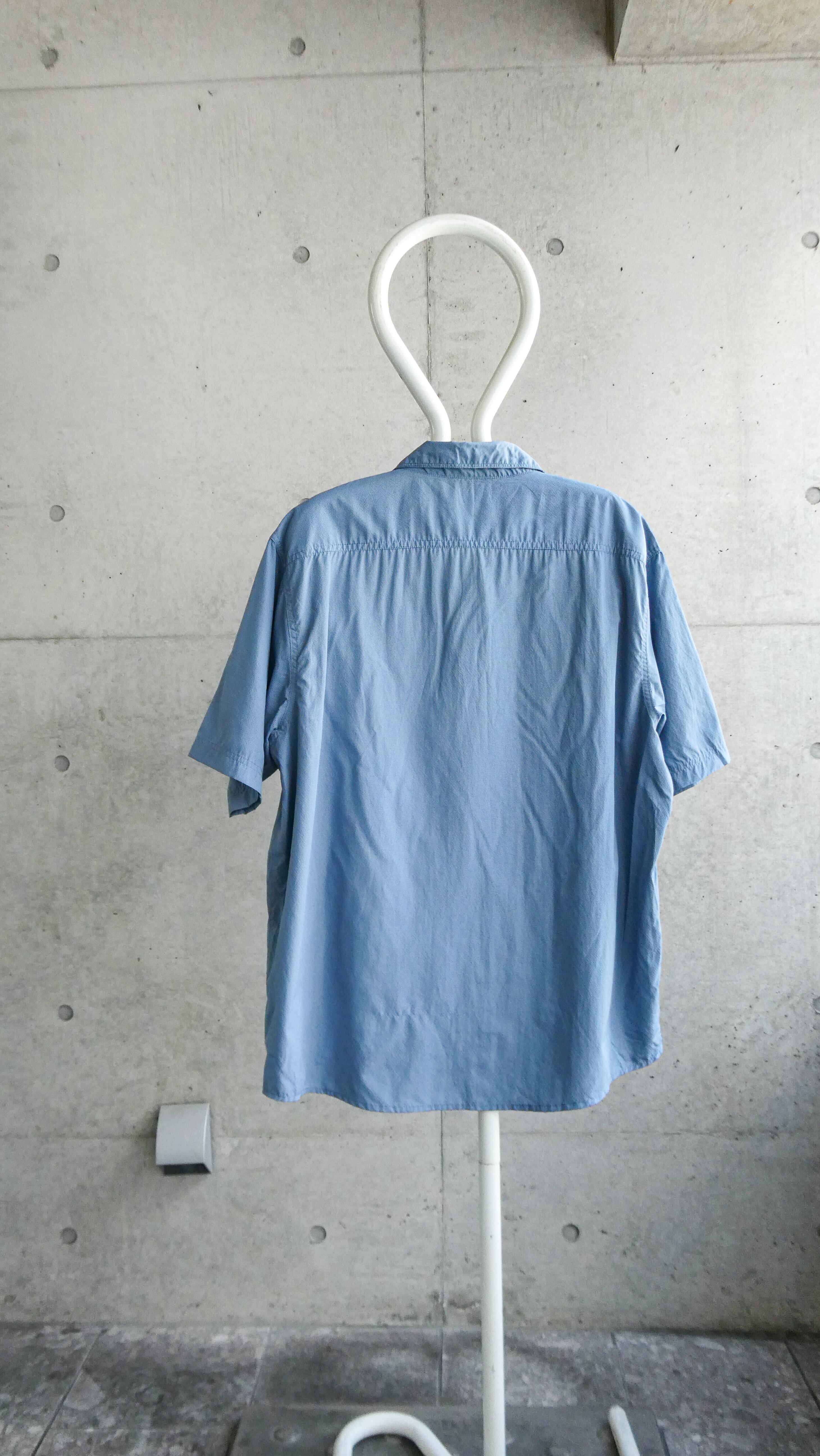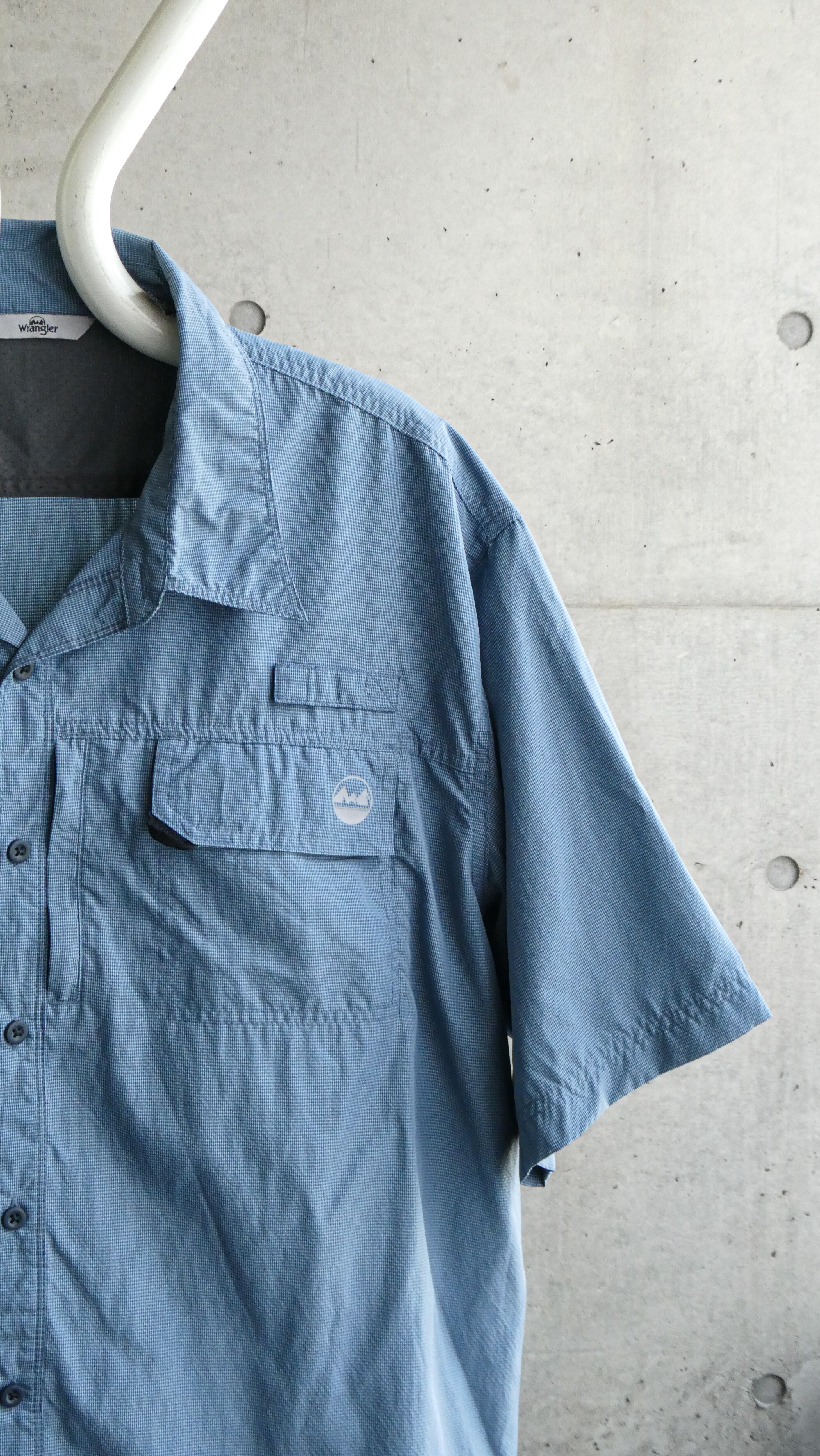Wranglerのレジャーシャツ。ブルーのマイクロチェック。ほぼ無地のノリで着れるほどの細かいチェックパターン。とろみのある生地です。
