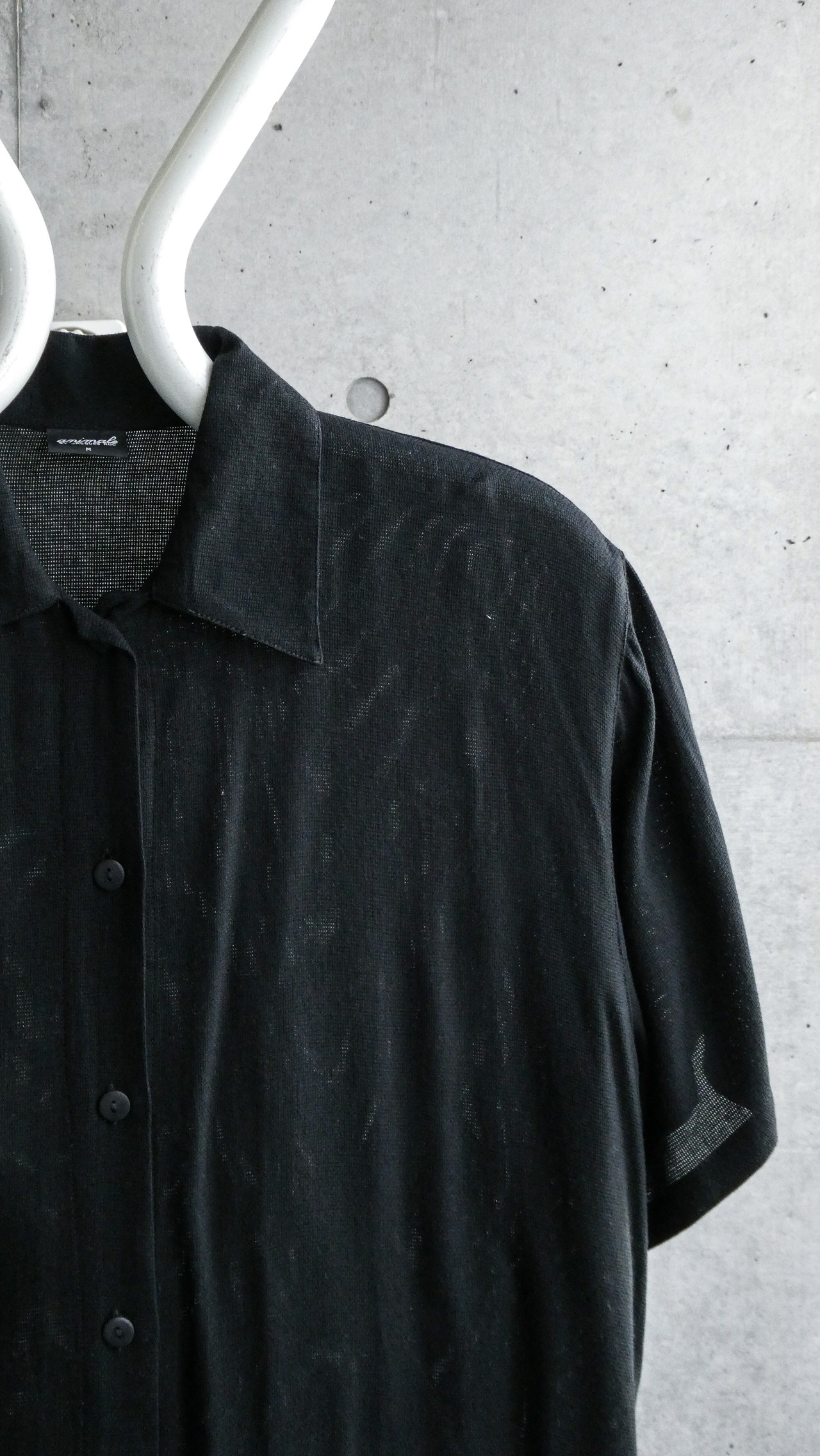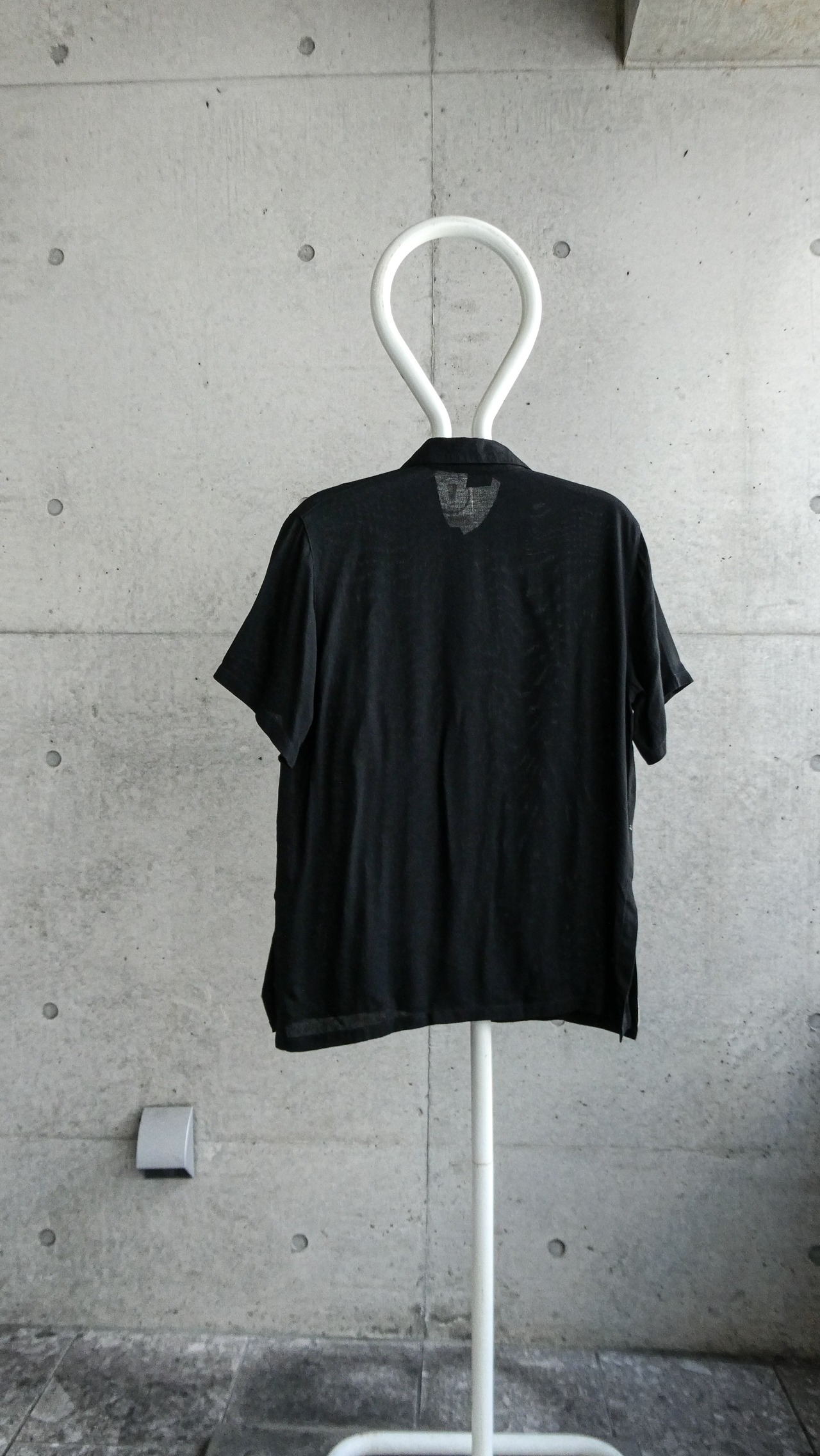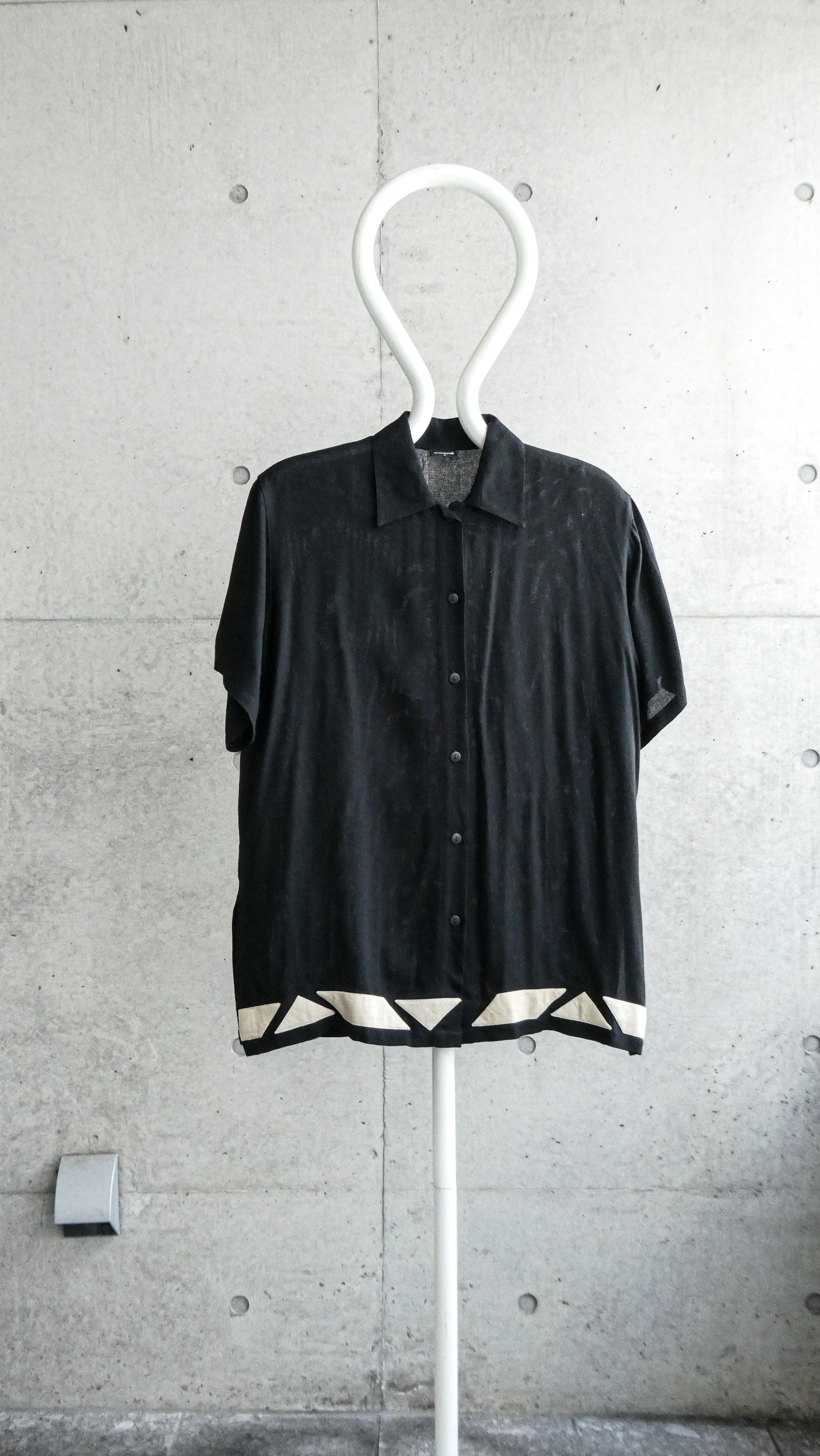 ブラックのレーヨン100シャツ。珍しいメッシュのような生地でレーヨン100です。裾にベージュの切り絵のような切替パターン。ボックスシルエットで着やすいです。