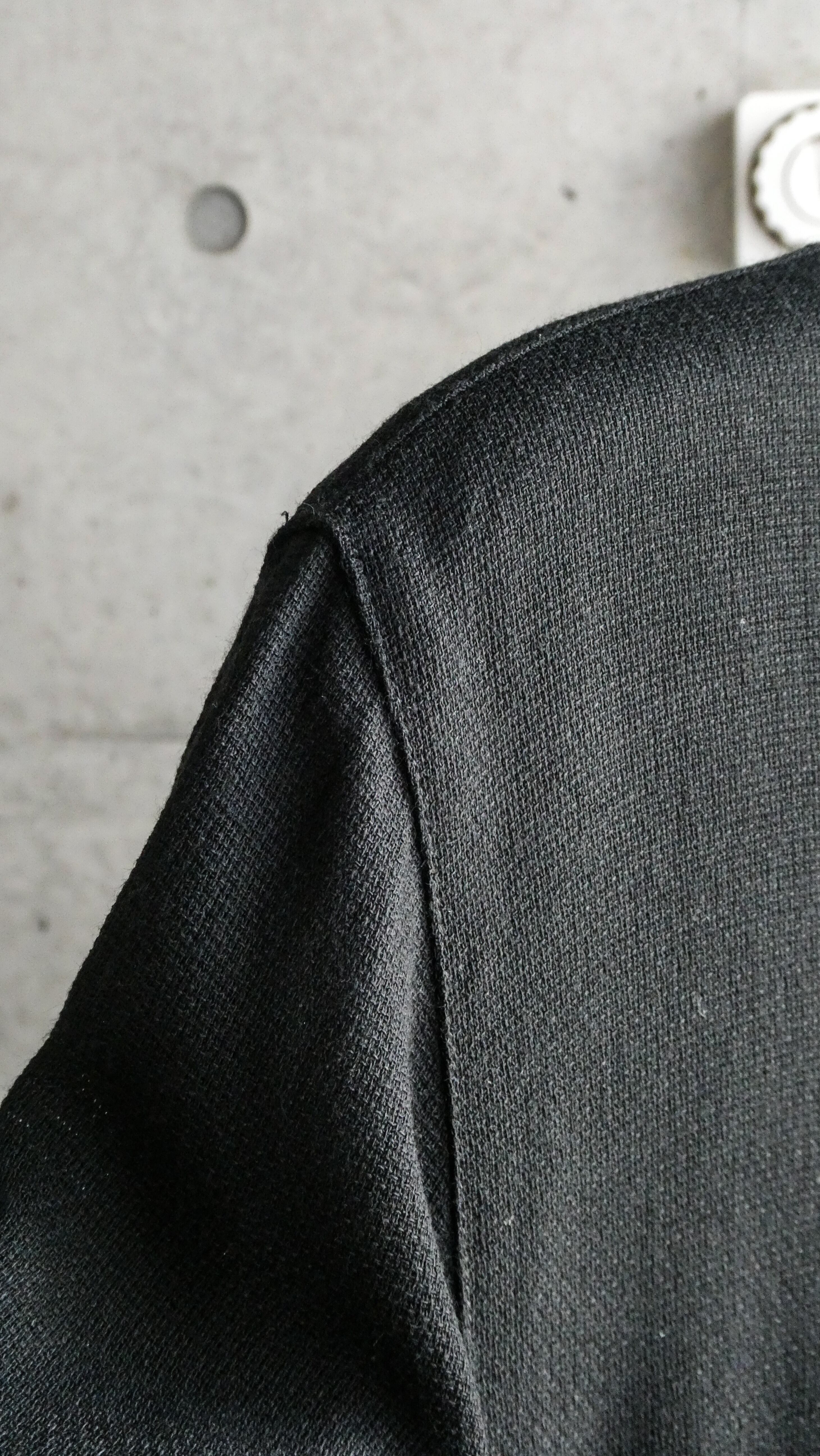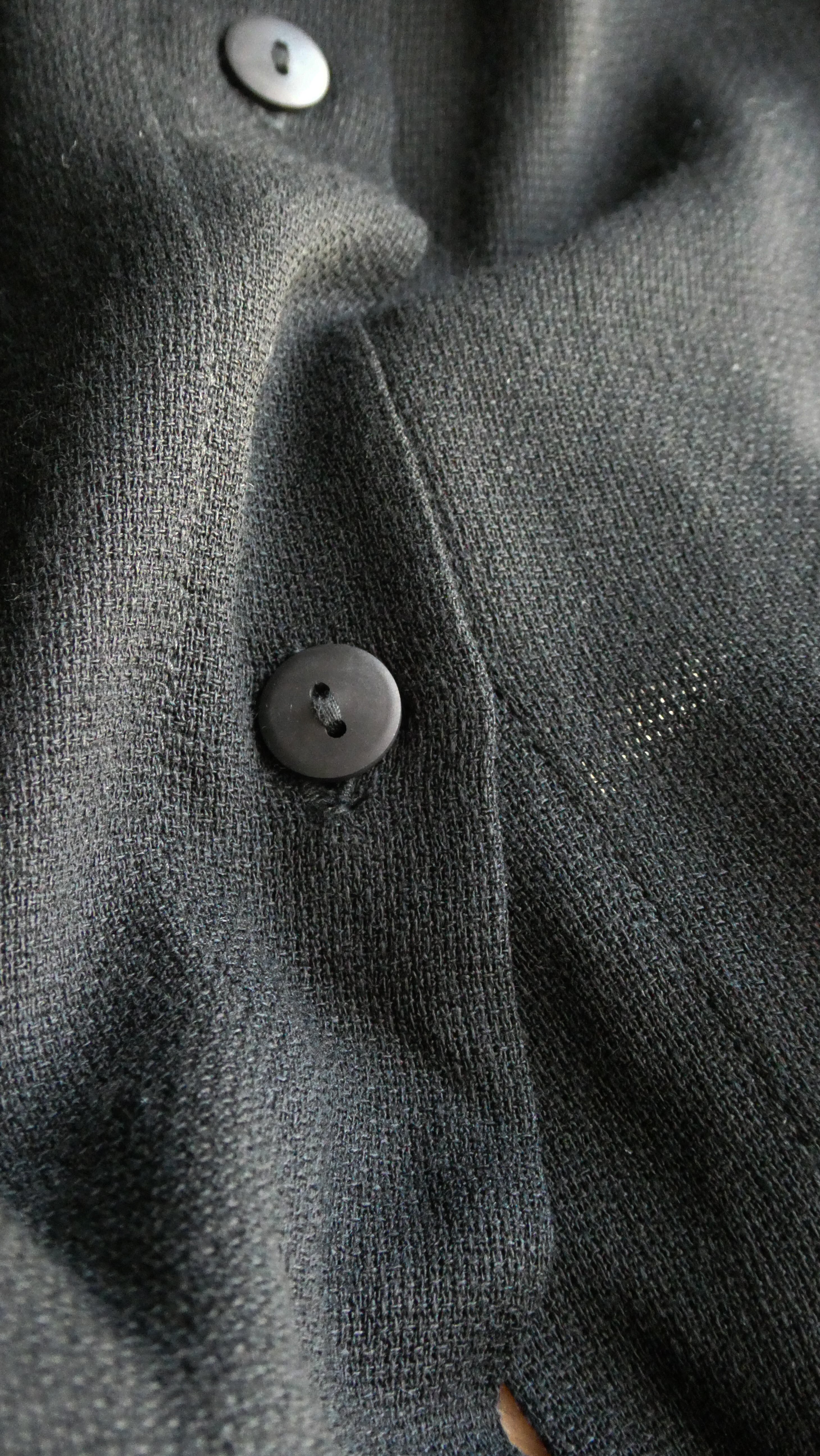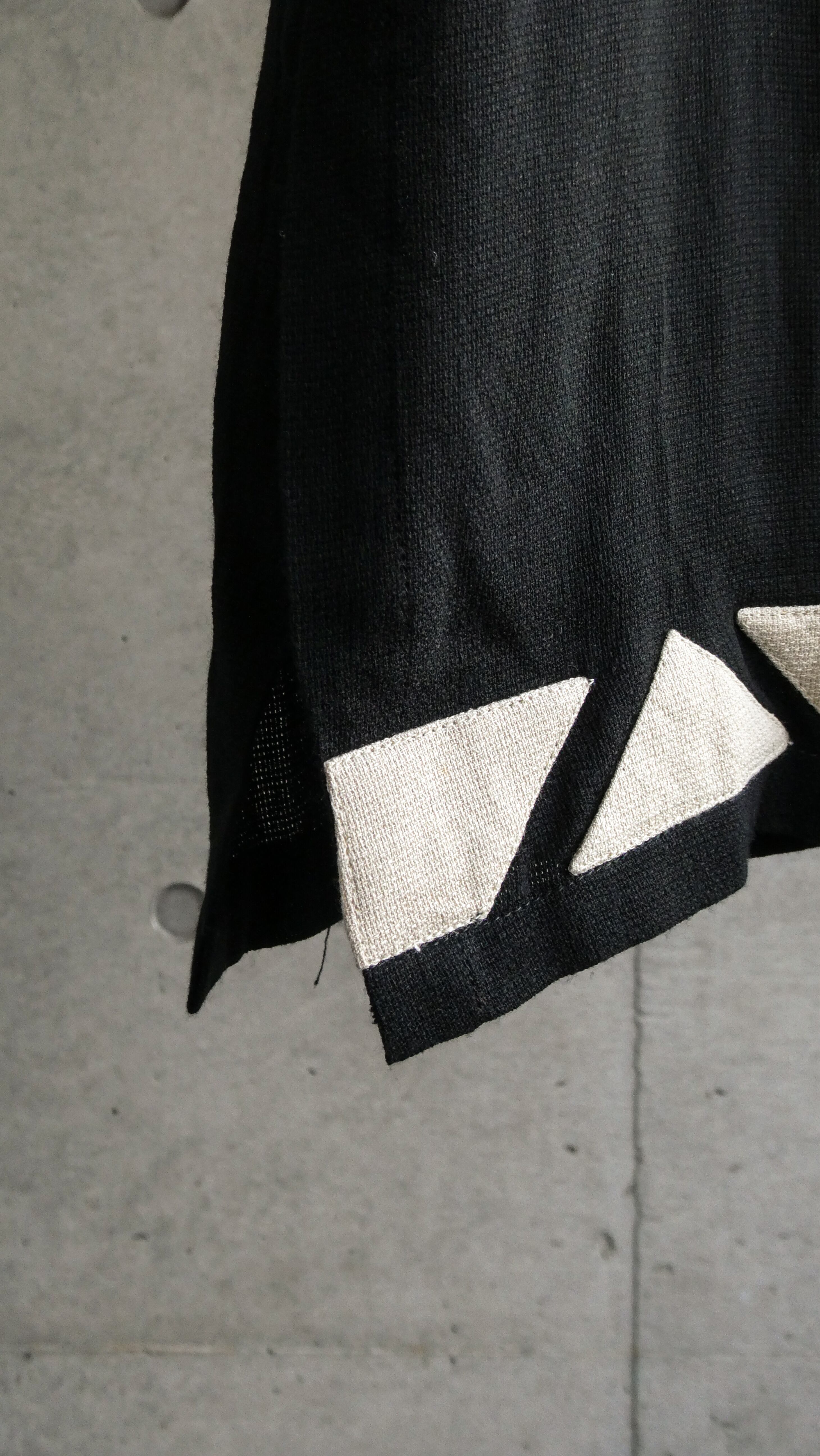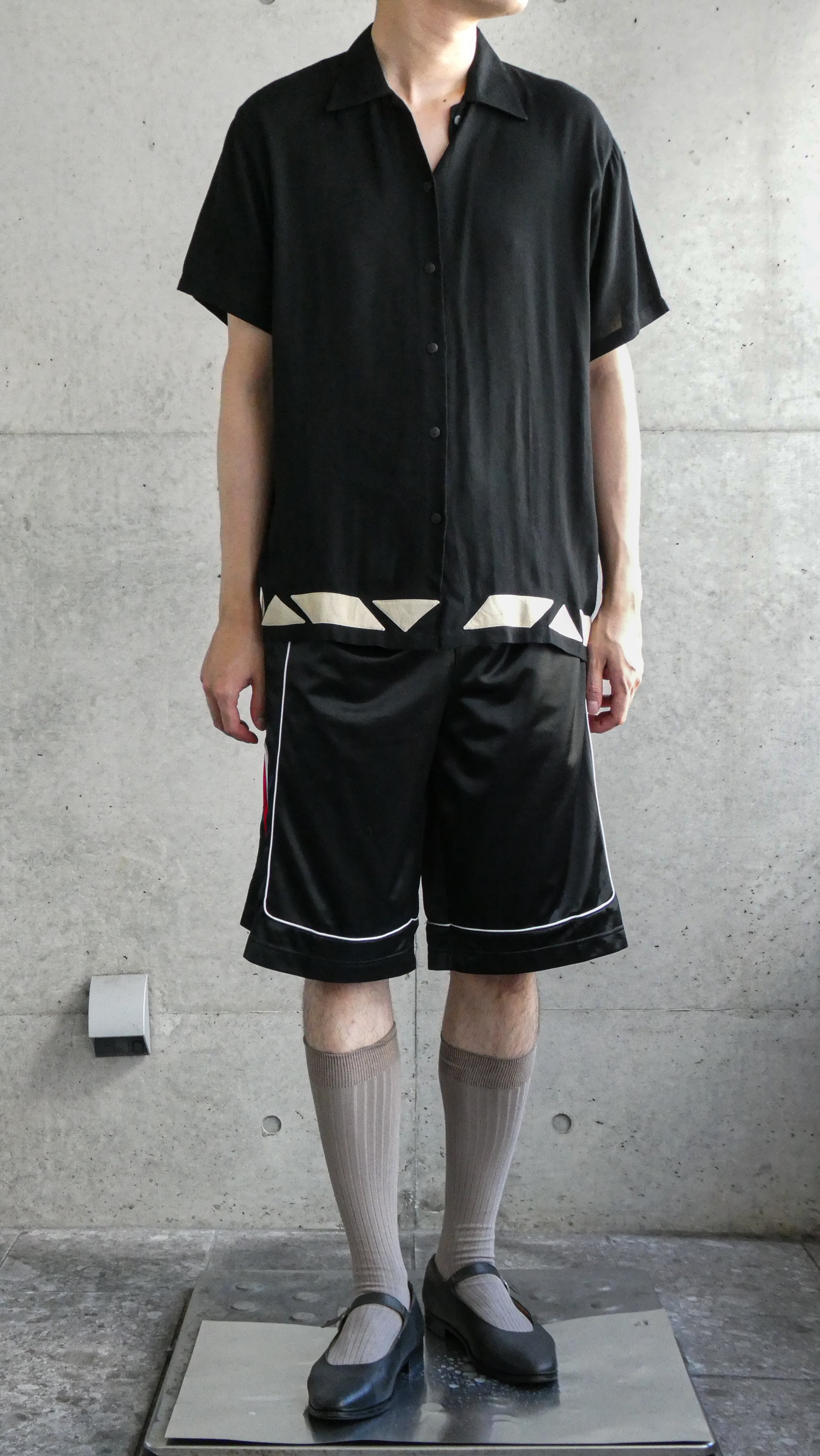 ブラックのレーヨン100シャツ。珍しいメッシュのような生地でレーヨン100です。裾にベージュの切り絵のような切替パターン。ボックスシルエットで着やすいです。