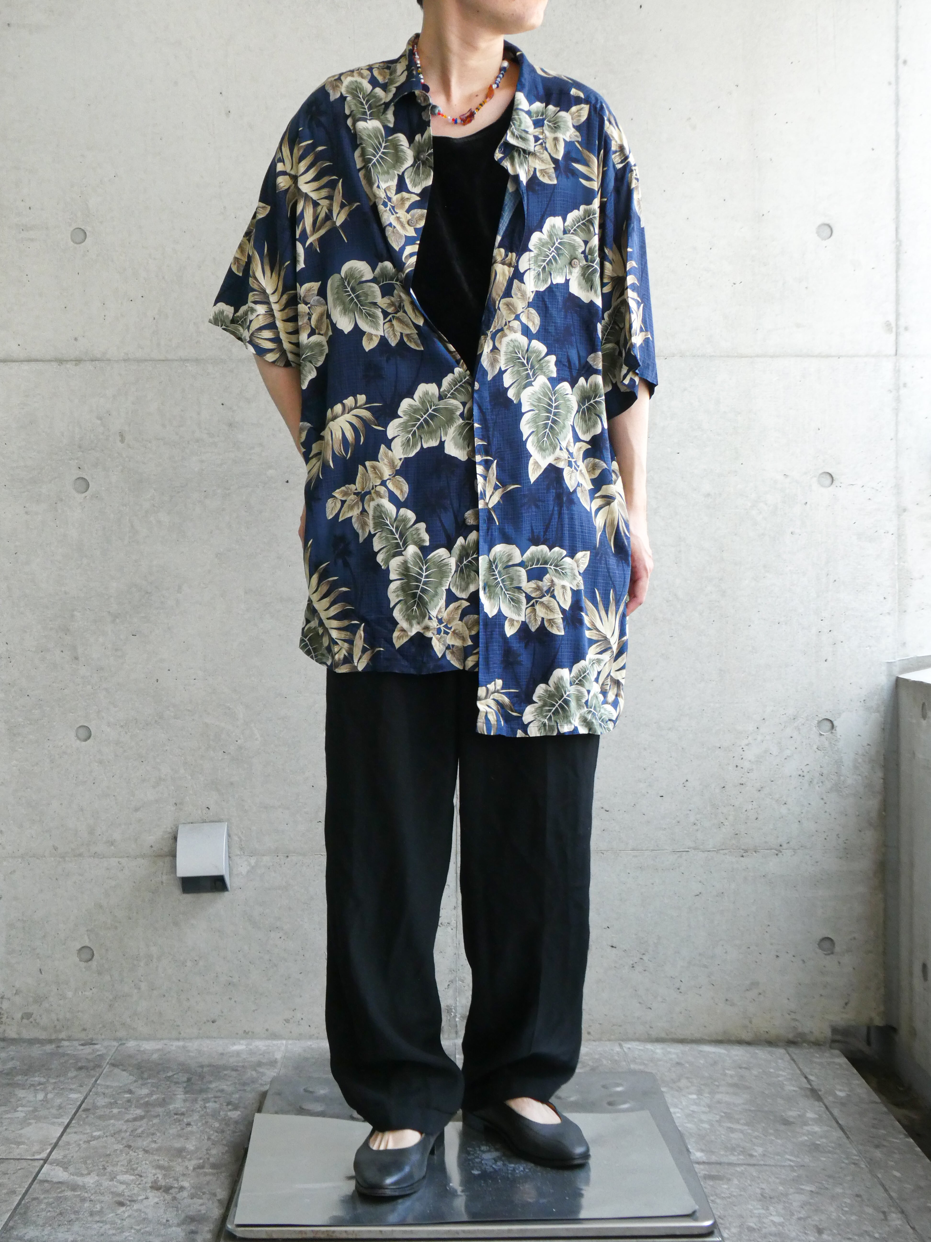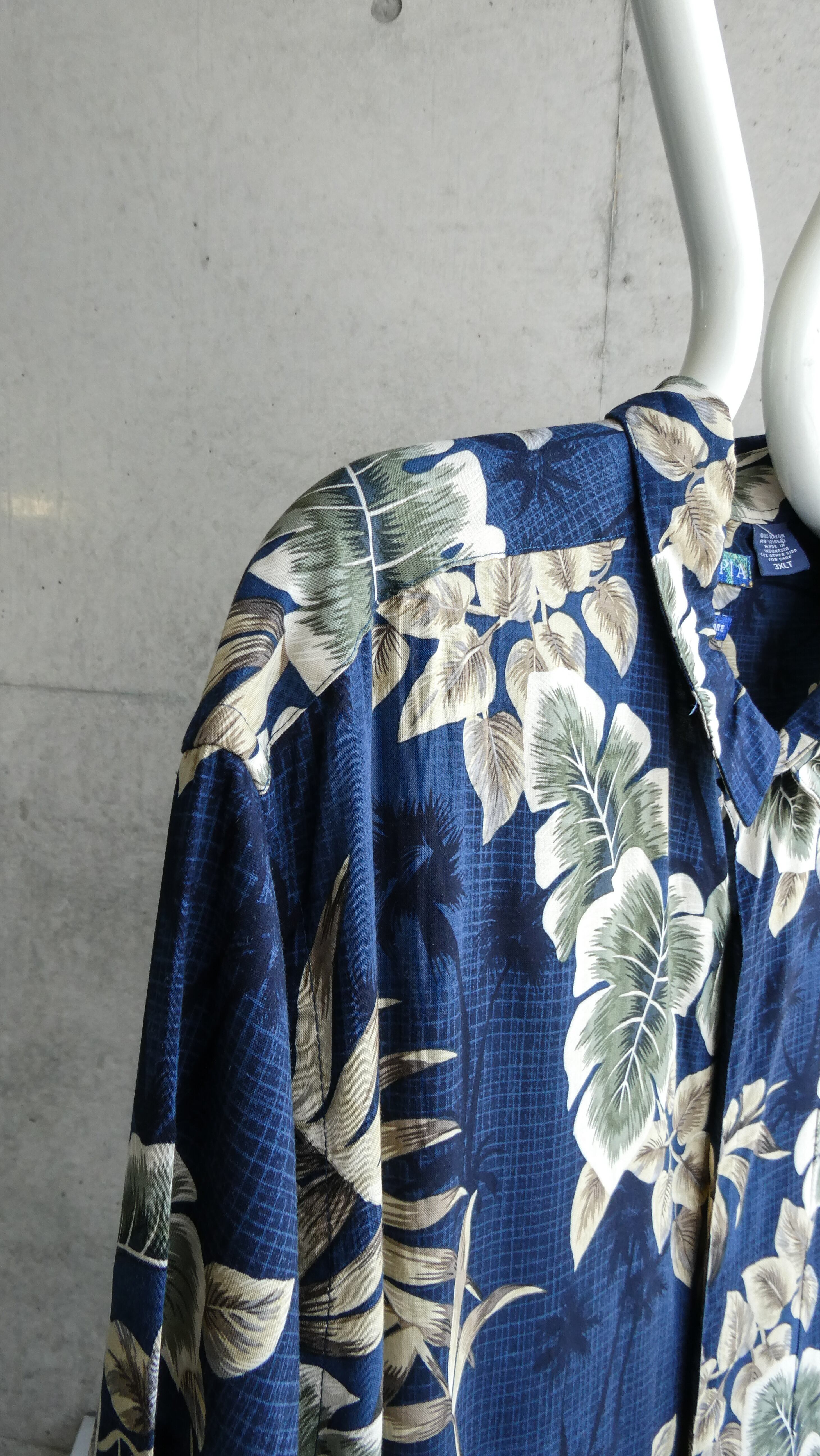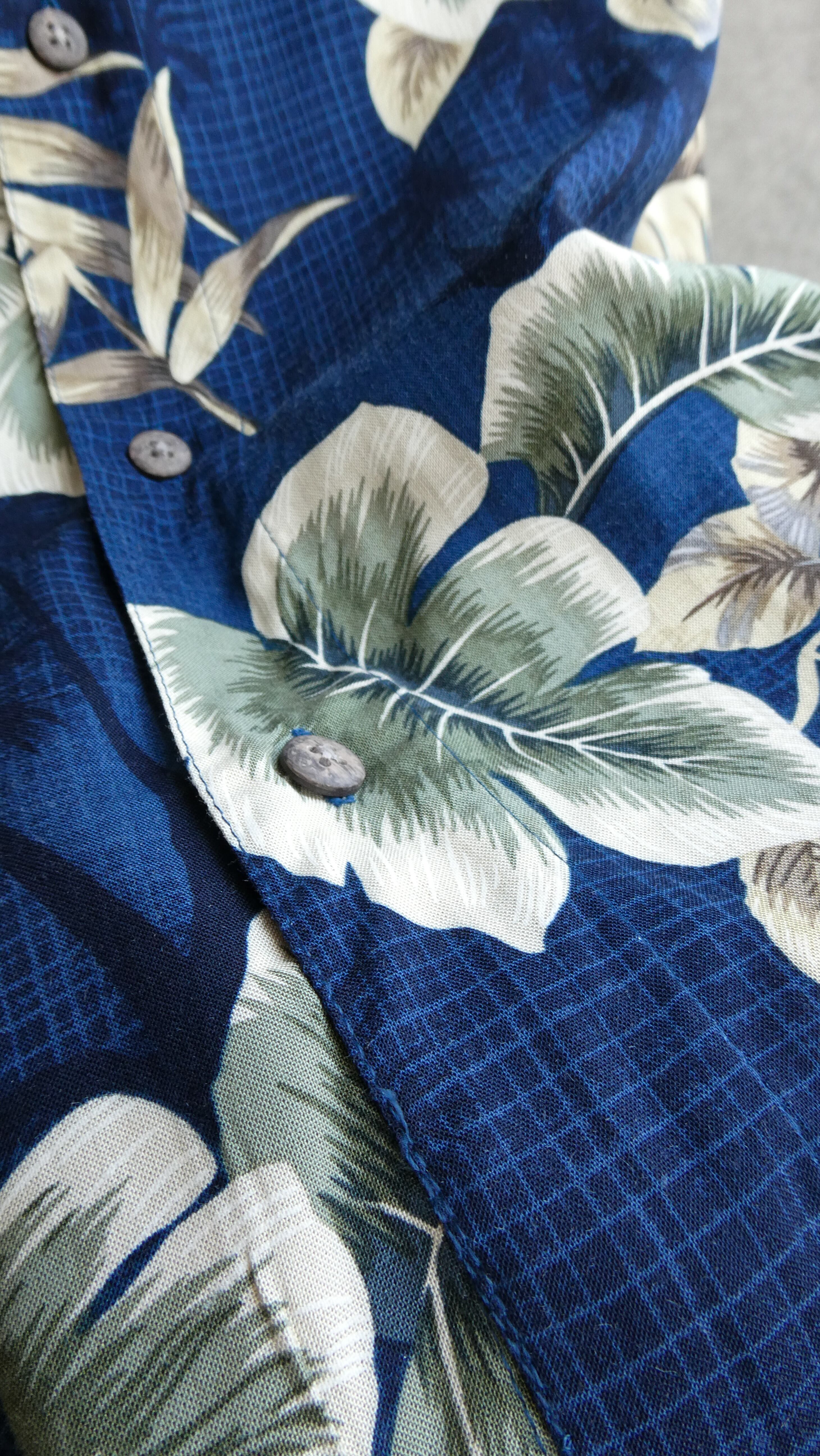 ネイビーのレーヨンアロハ。ガウンのような雰囲気で羽織れるロング丈。逆にここまでロングなのが良くてピックしました。レディースがシャツワンピ的なノリで着るのも可愛いです。ボタンの留め方で色んな着方できます。