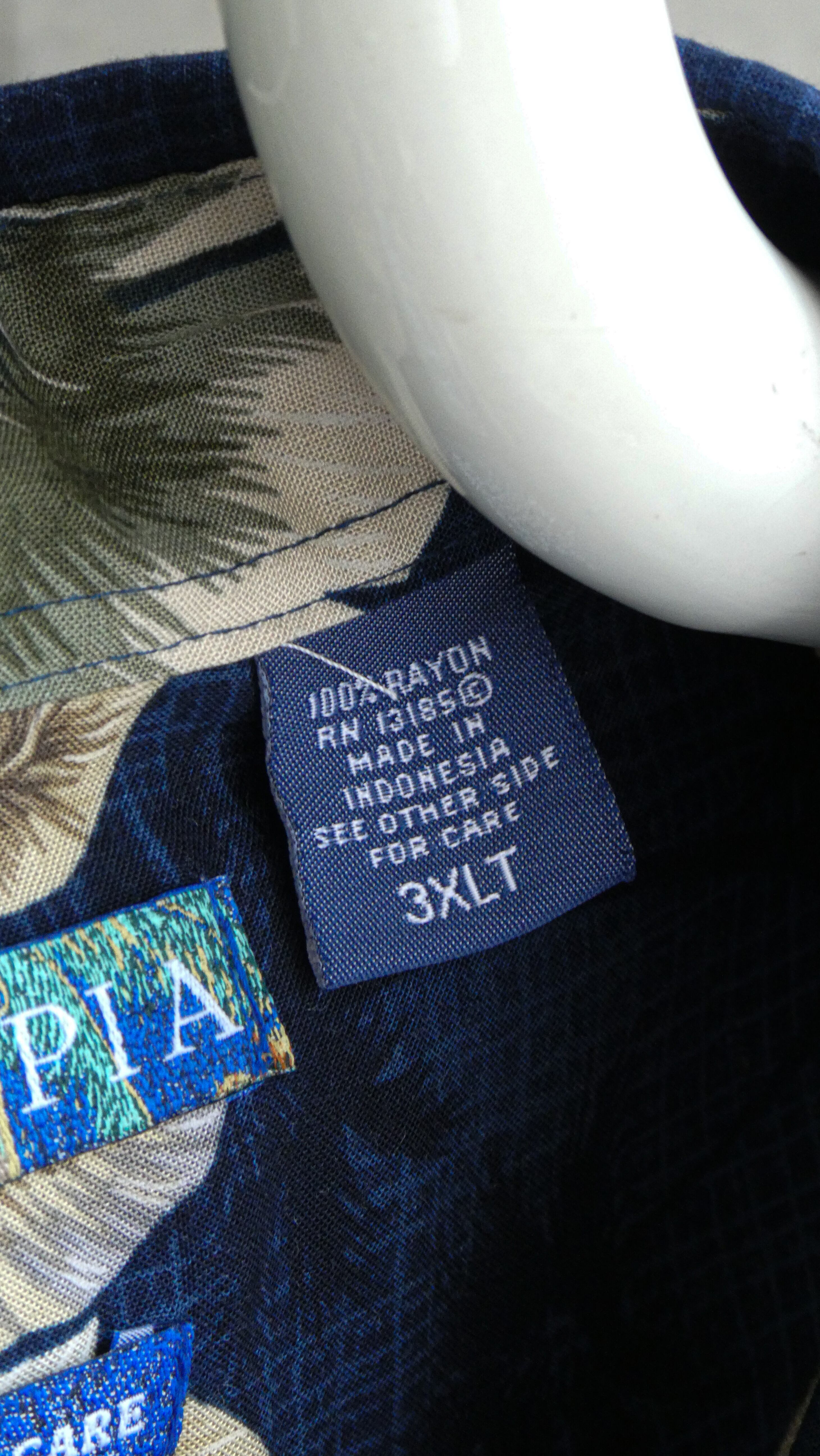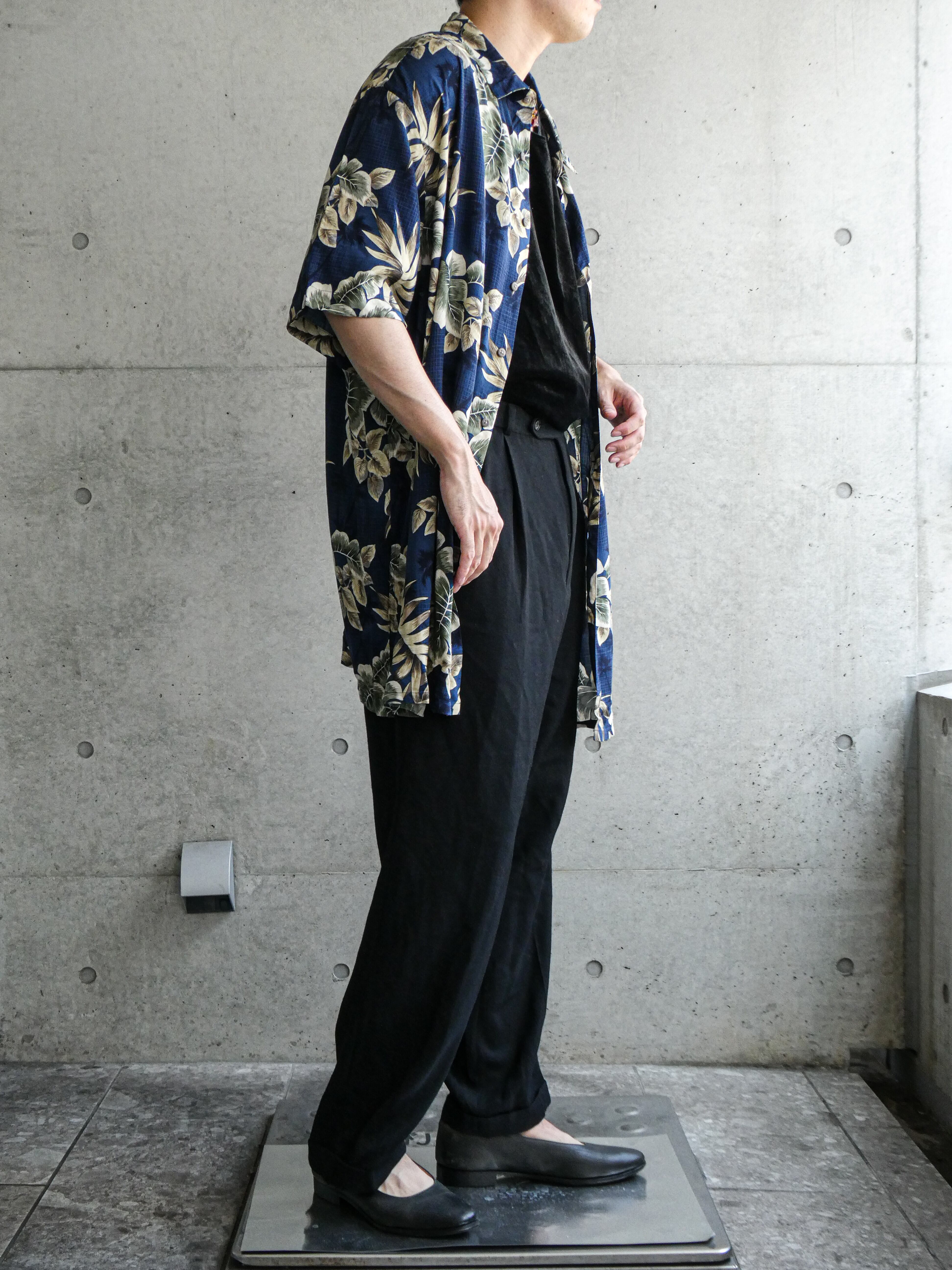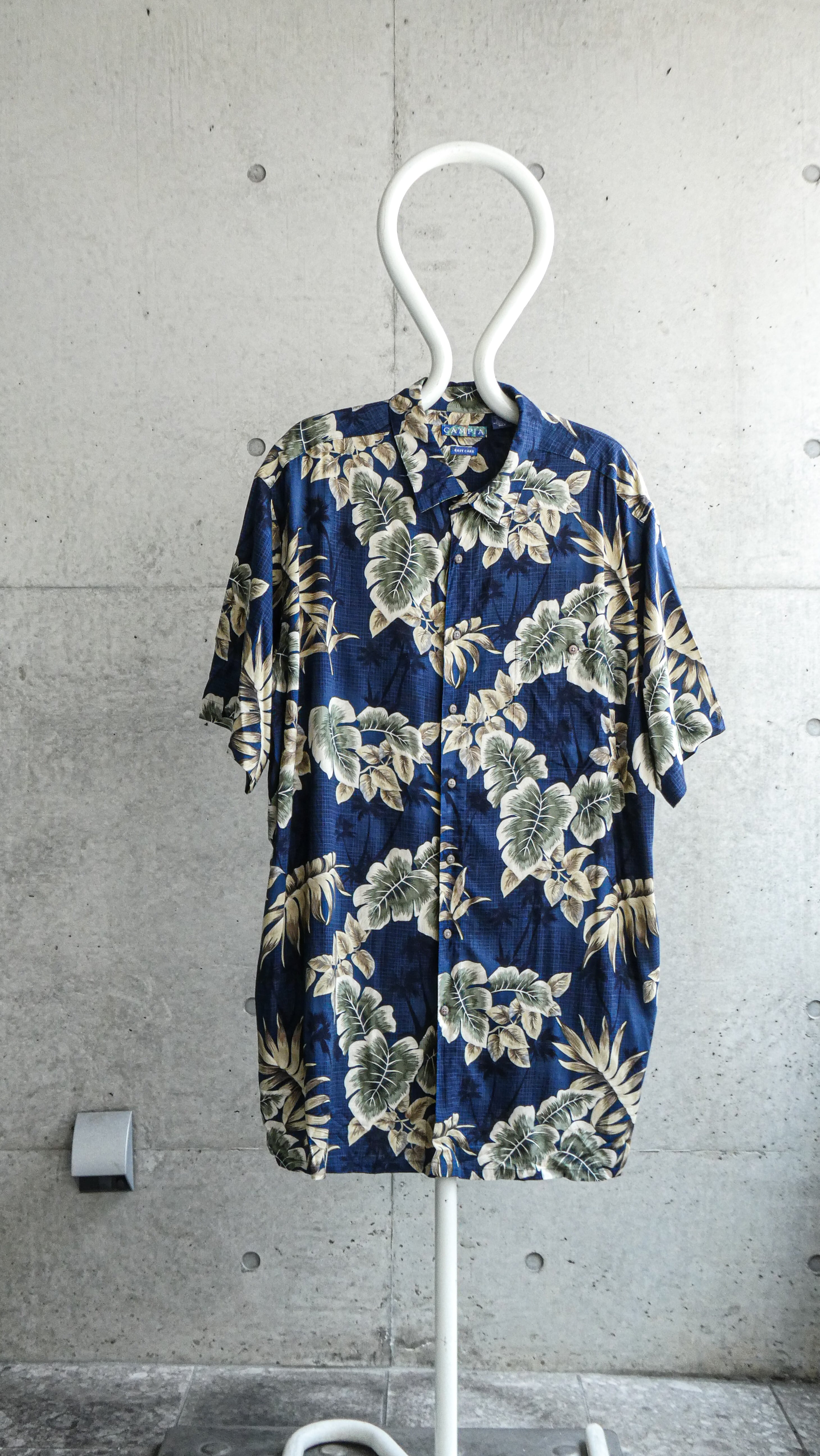 ネイビーのレーヨンアロハ。ガウンのような雰囲気で羽織れるロング丈。逆にここまでロングなのが良くてピックしました。レディースがシャツワンピ的なノリで着るのも可愛いです。ボタンの留め方で色んな着方できます。