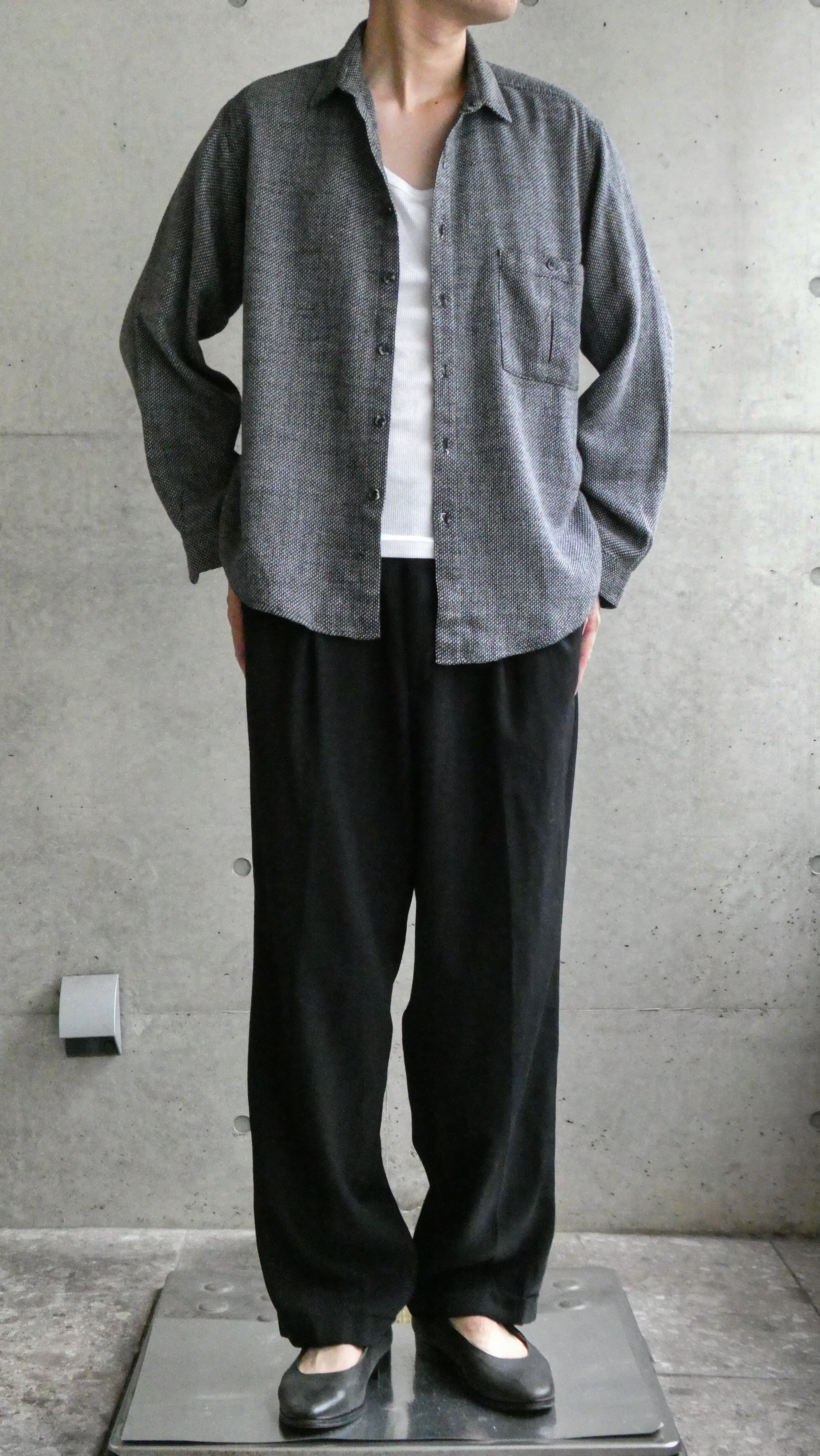 USA製。ブラックの刺し子に似たような変わったスペシャルファブリック生地。少し起毛感のある秋冬の生地。袖にしっかりタック入り。黒系でこういう変わった生地のシャツは希少です。