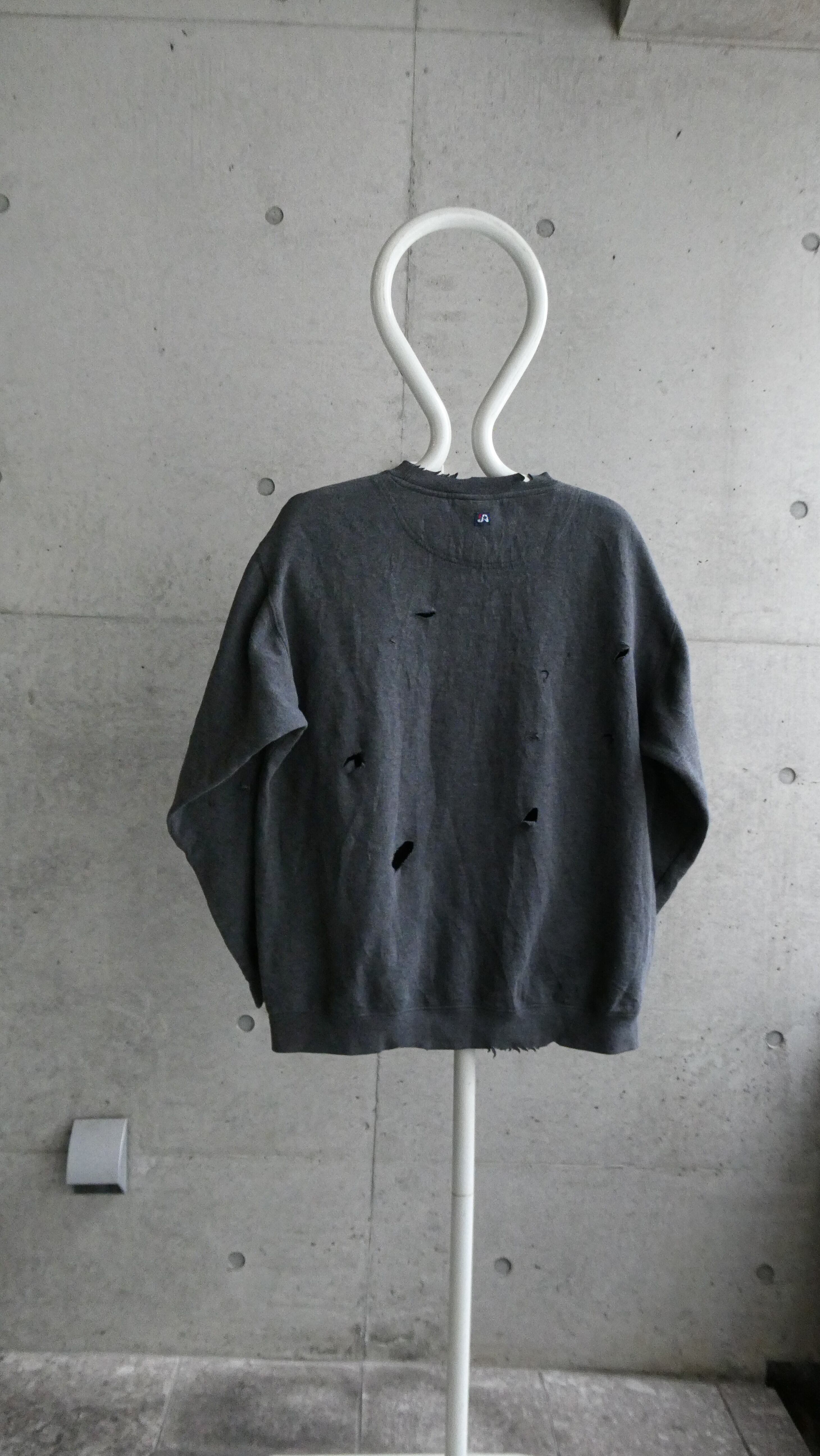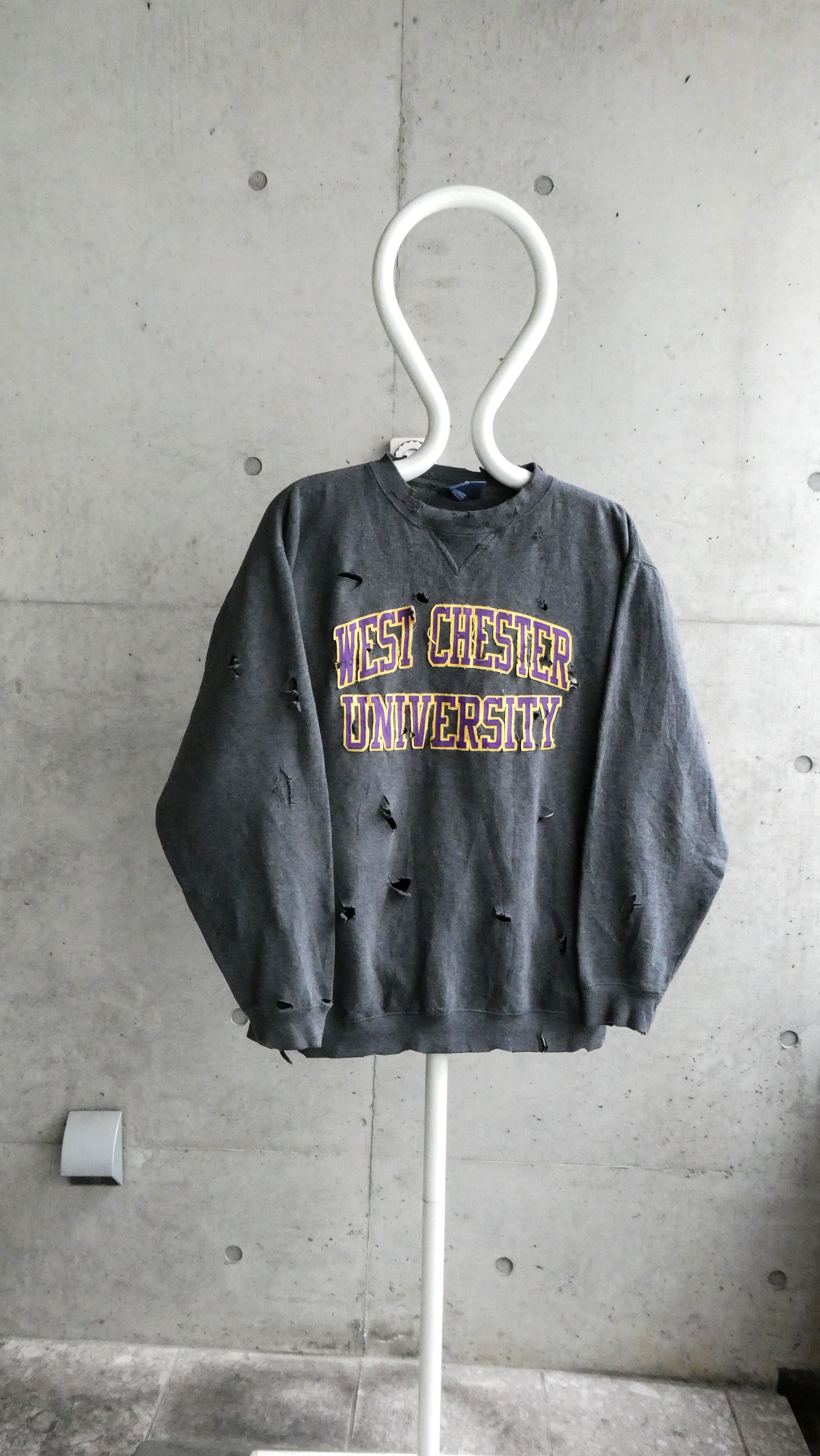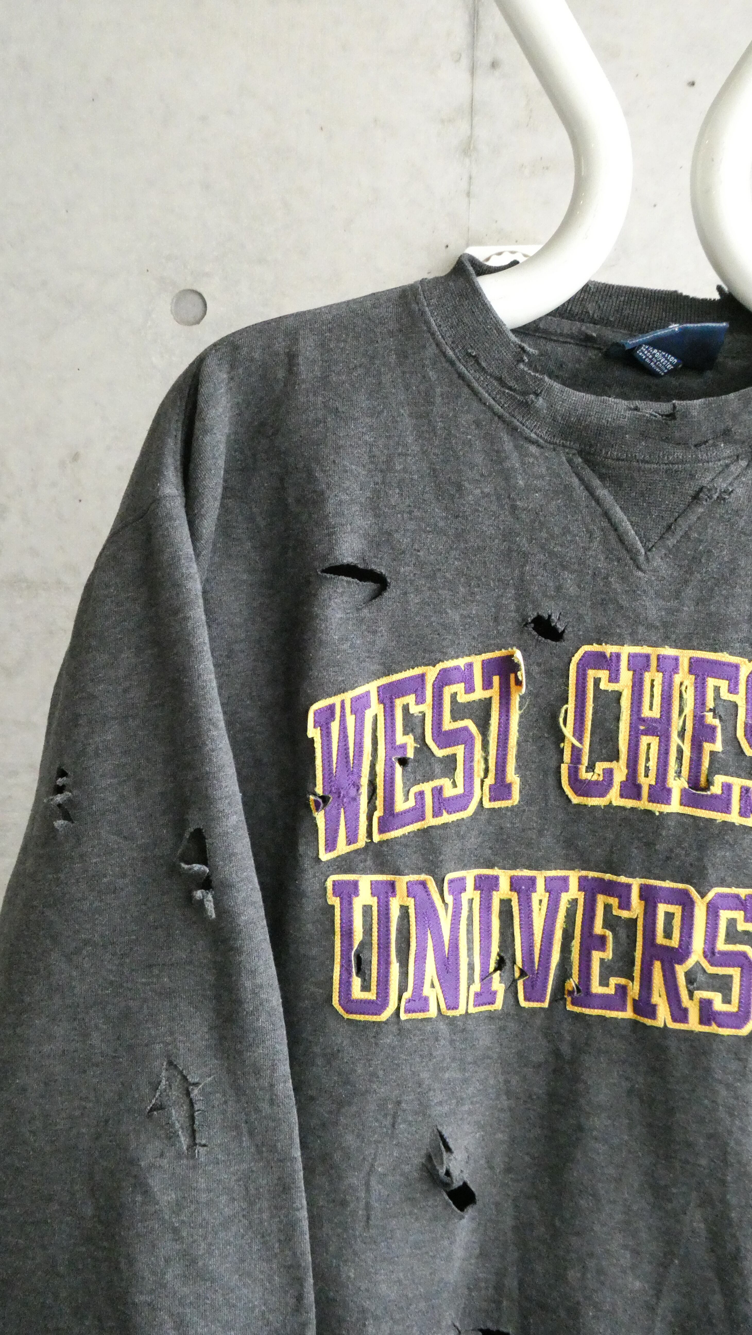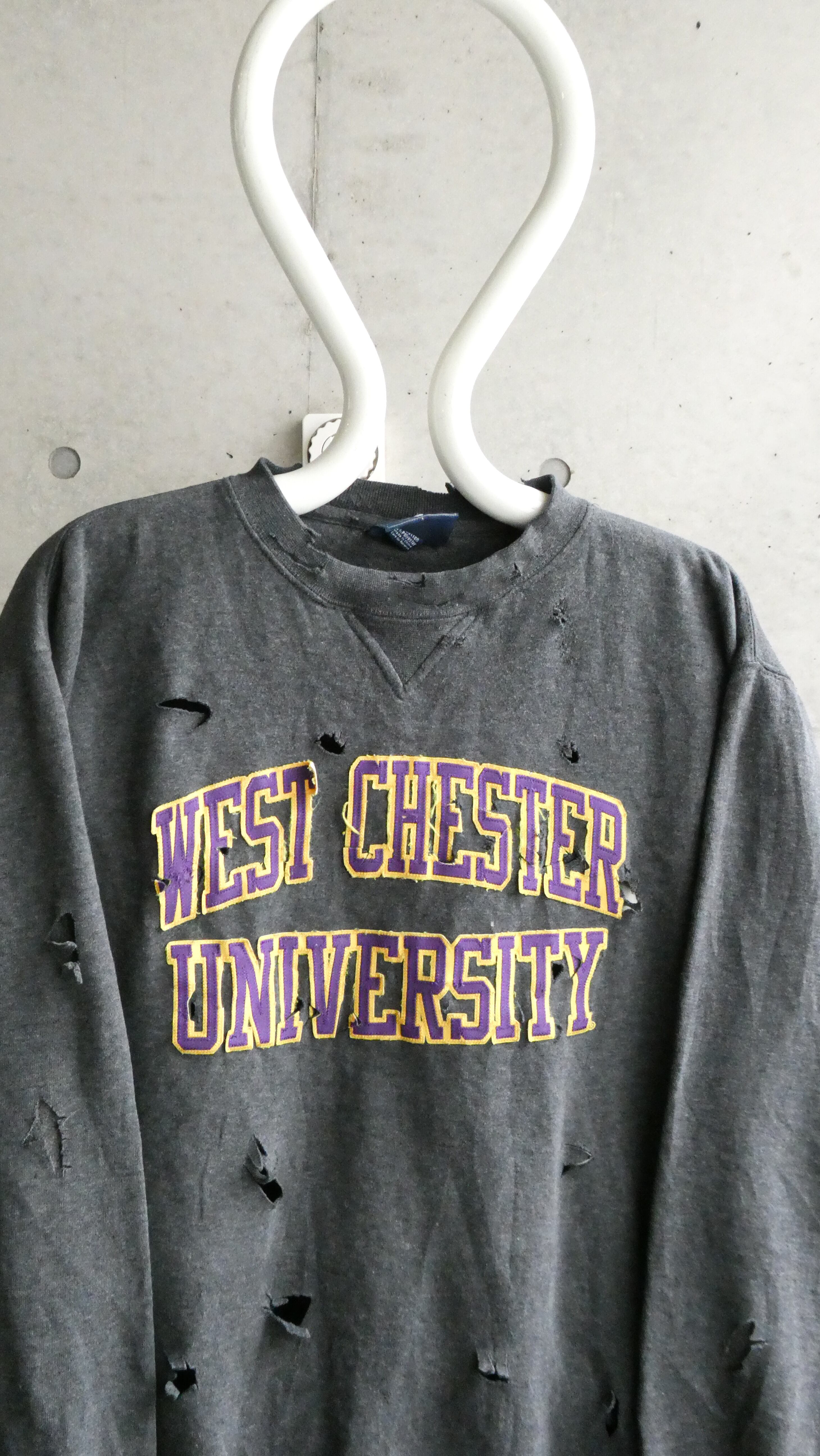WEST CHESTER UNIVERSITYのボロスウェット。グレーボディーに黄、パープルのカラーワッペン。ワッペンにもダメージと剥がれがあるのがイケてます。白のタンクトップとかレイヤードして色味チラ見せするのもオススメです。