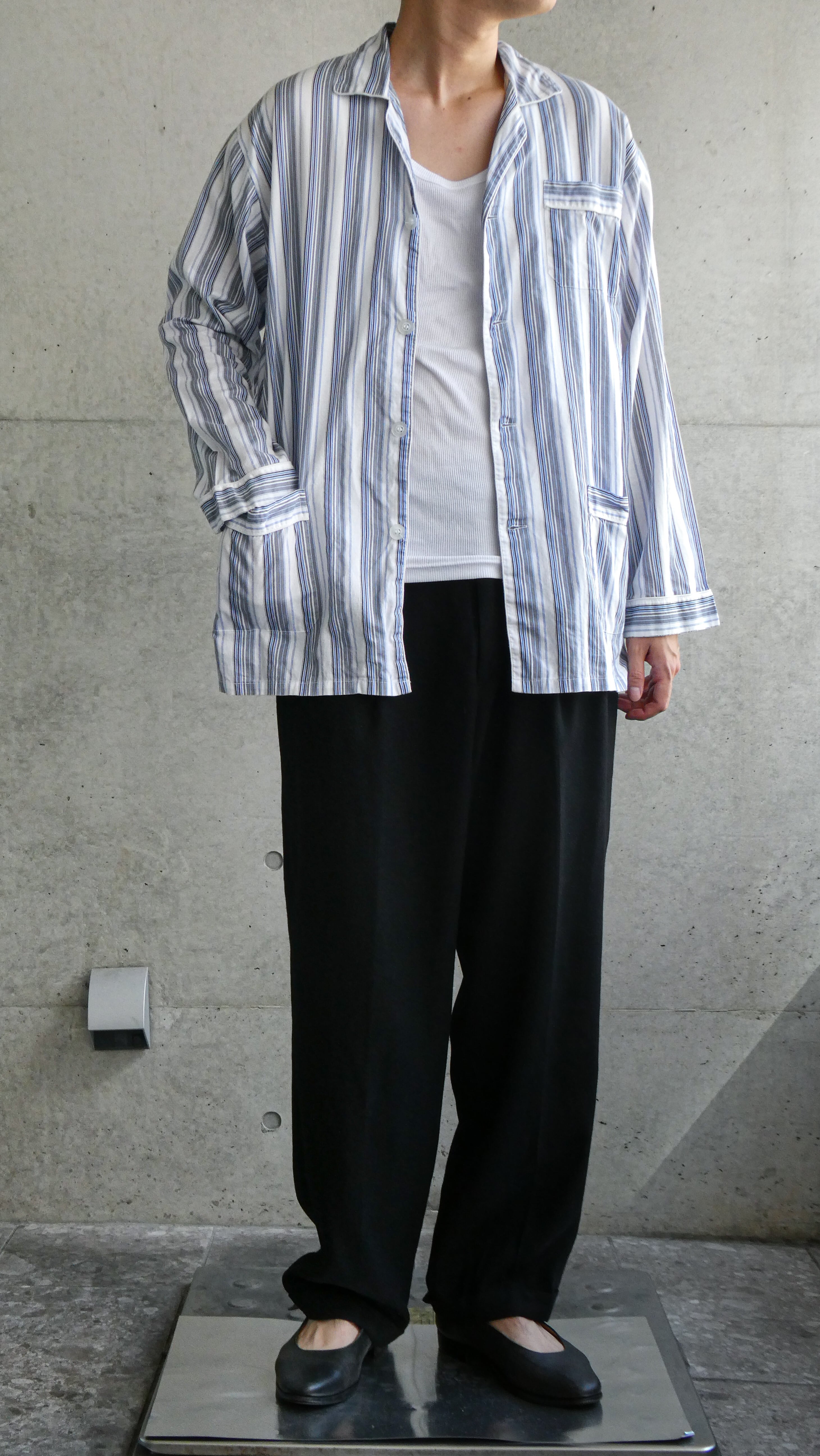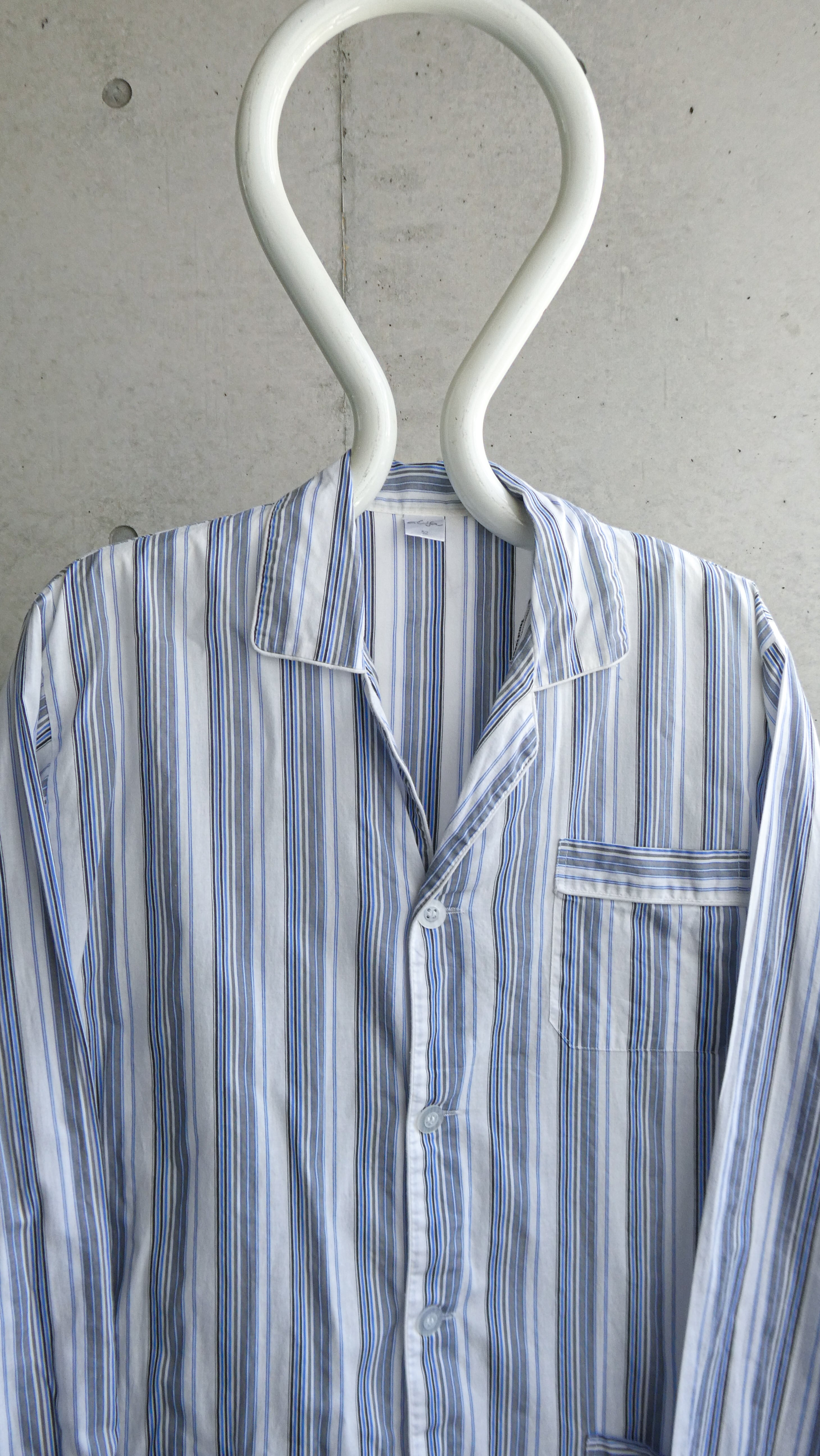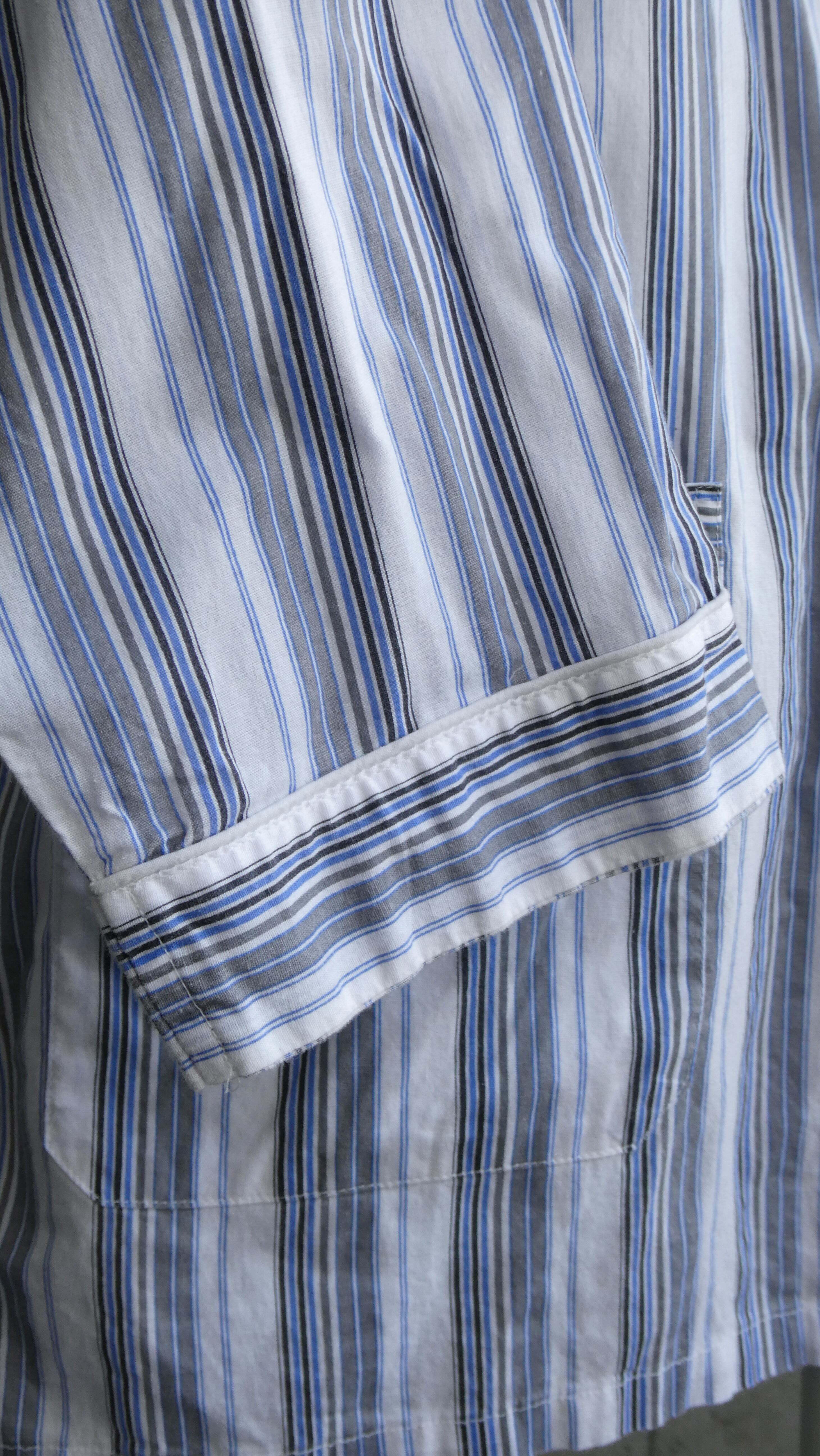 ブルーのマルチストライプのパジャマシャツの入荷です。一見パジャマに見えないパジャマシャツを厳選してピックしてます。袖先は横ボーダー。3つポケットが付くのもパジャマシャツ特有のディテールです。