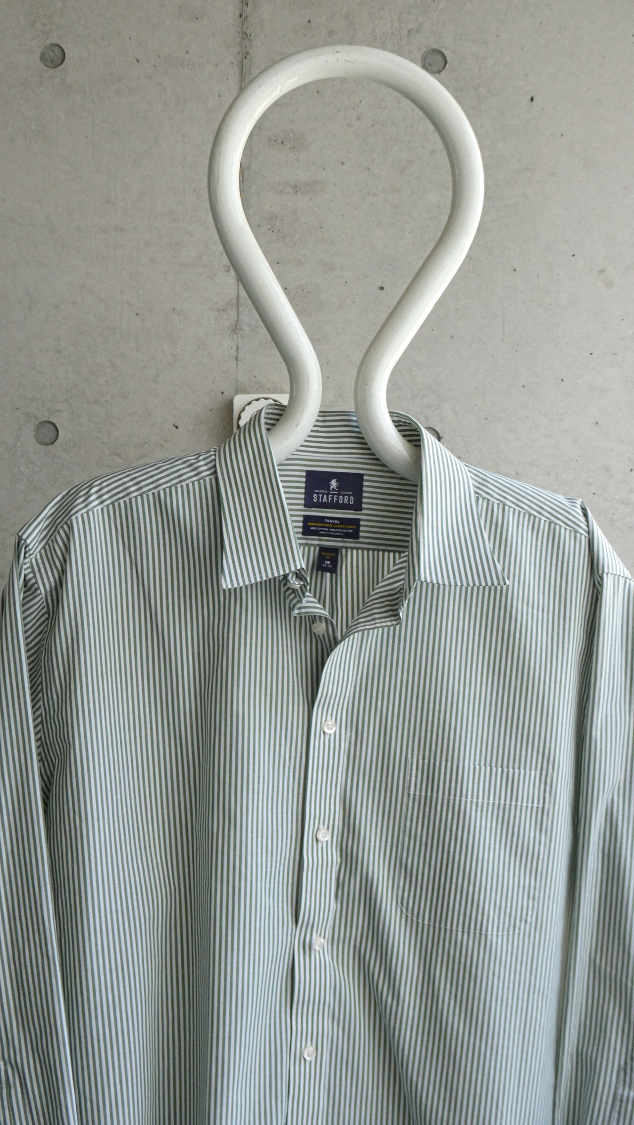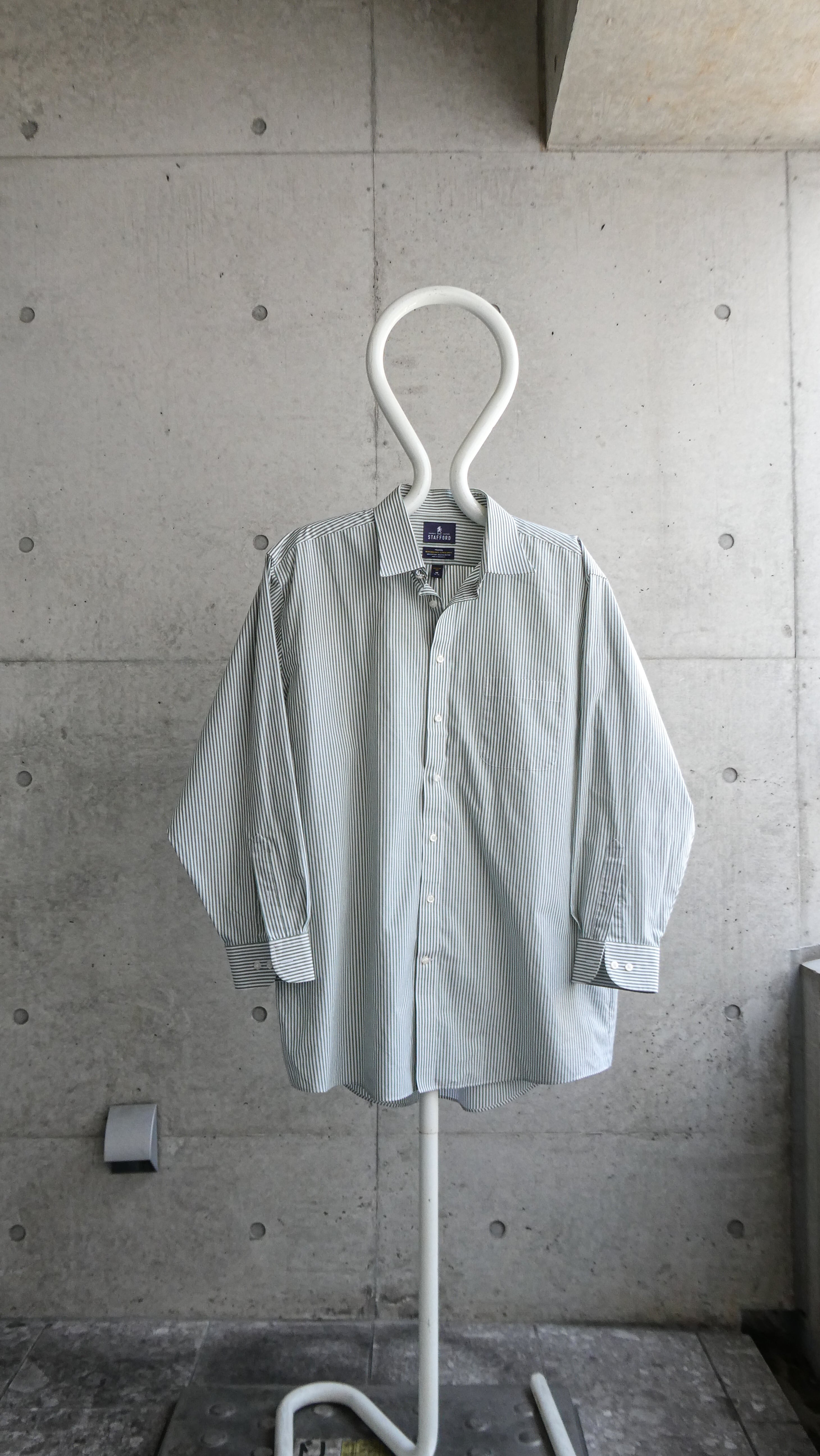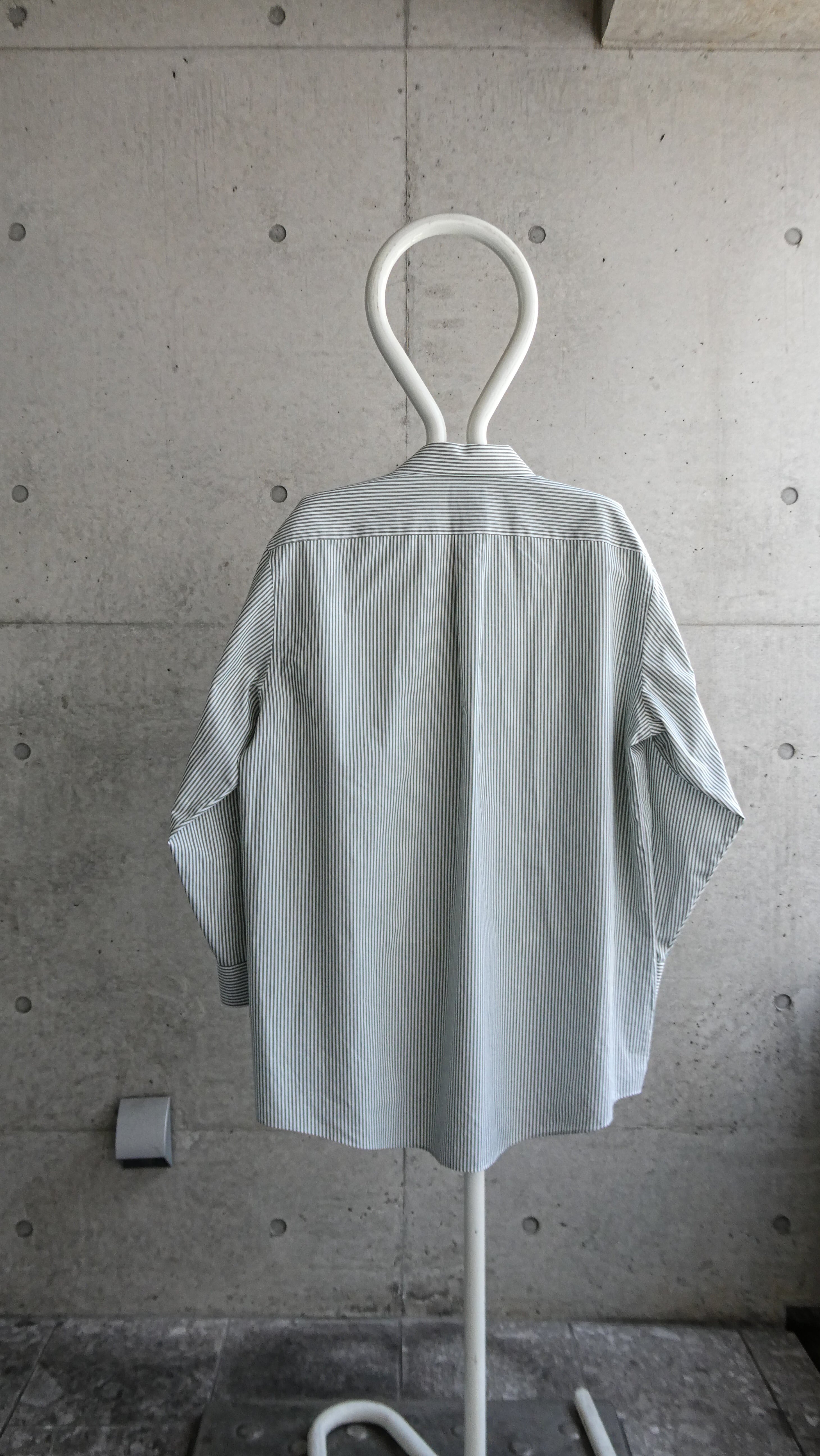 秋冬新入荷。抹茶色のストライプシャツ。適度にハリがあって、シワが殆ど付かない生地。凄くふわっとした立体的なシルエットで風を含みます。ボタンもぷっくりした肉厚ボタン。一番下のボタンホールだけ横向きになってる服好きにしかわからないディテール。適度なルーズ感で小慣れたストライプシャツです。