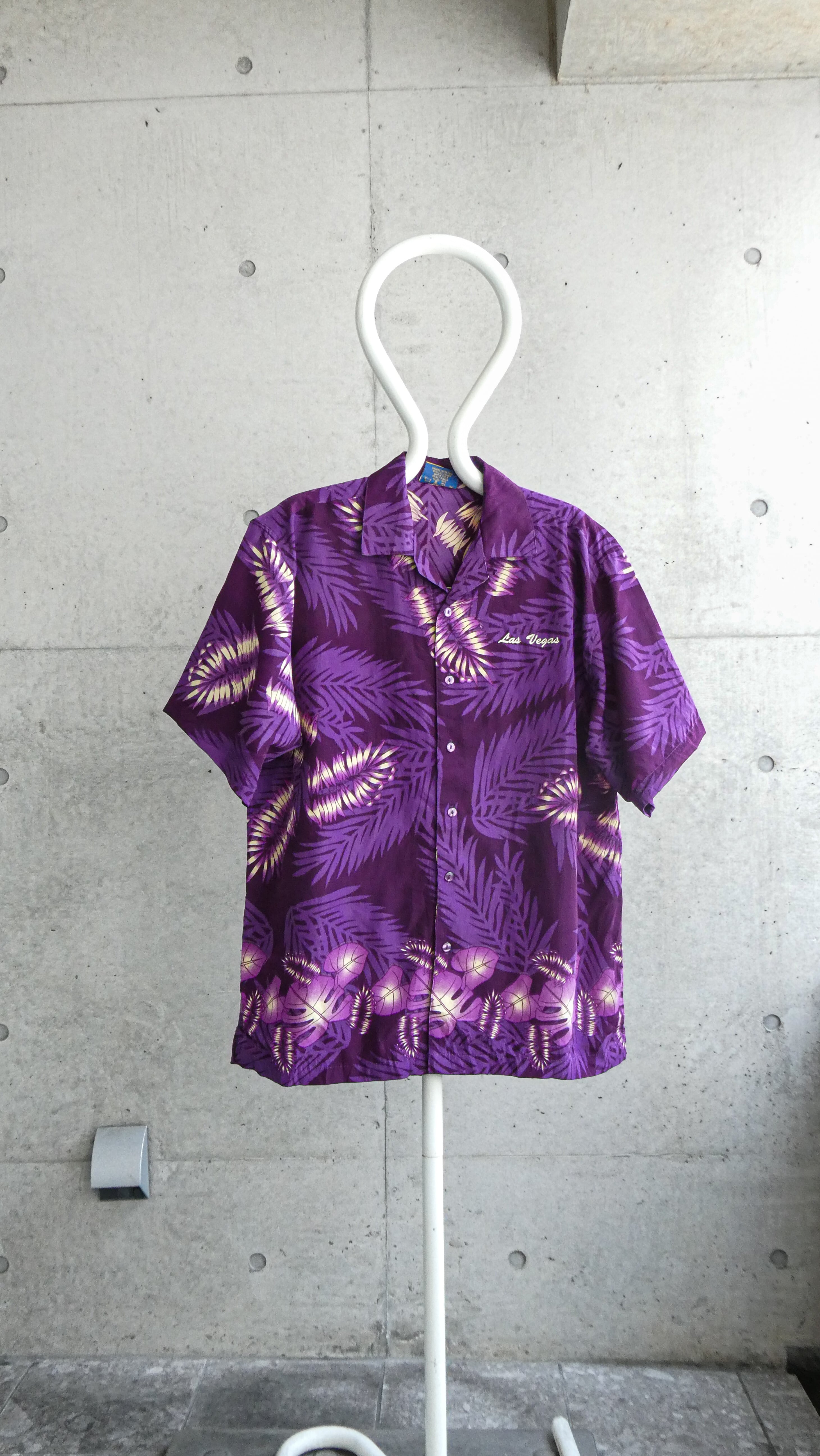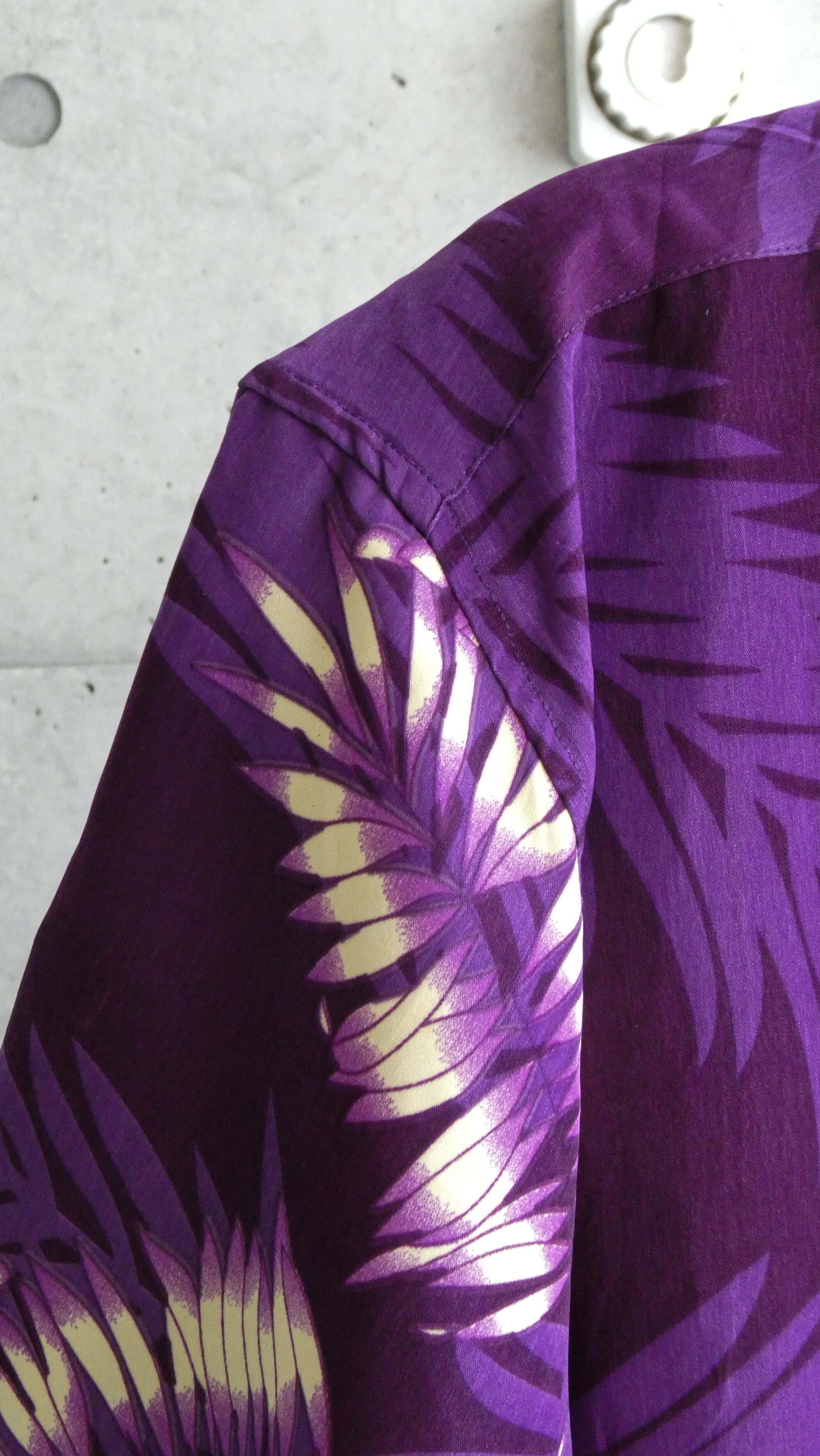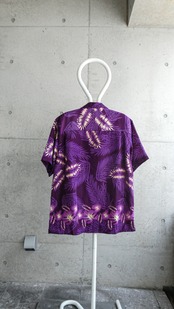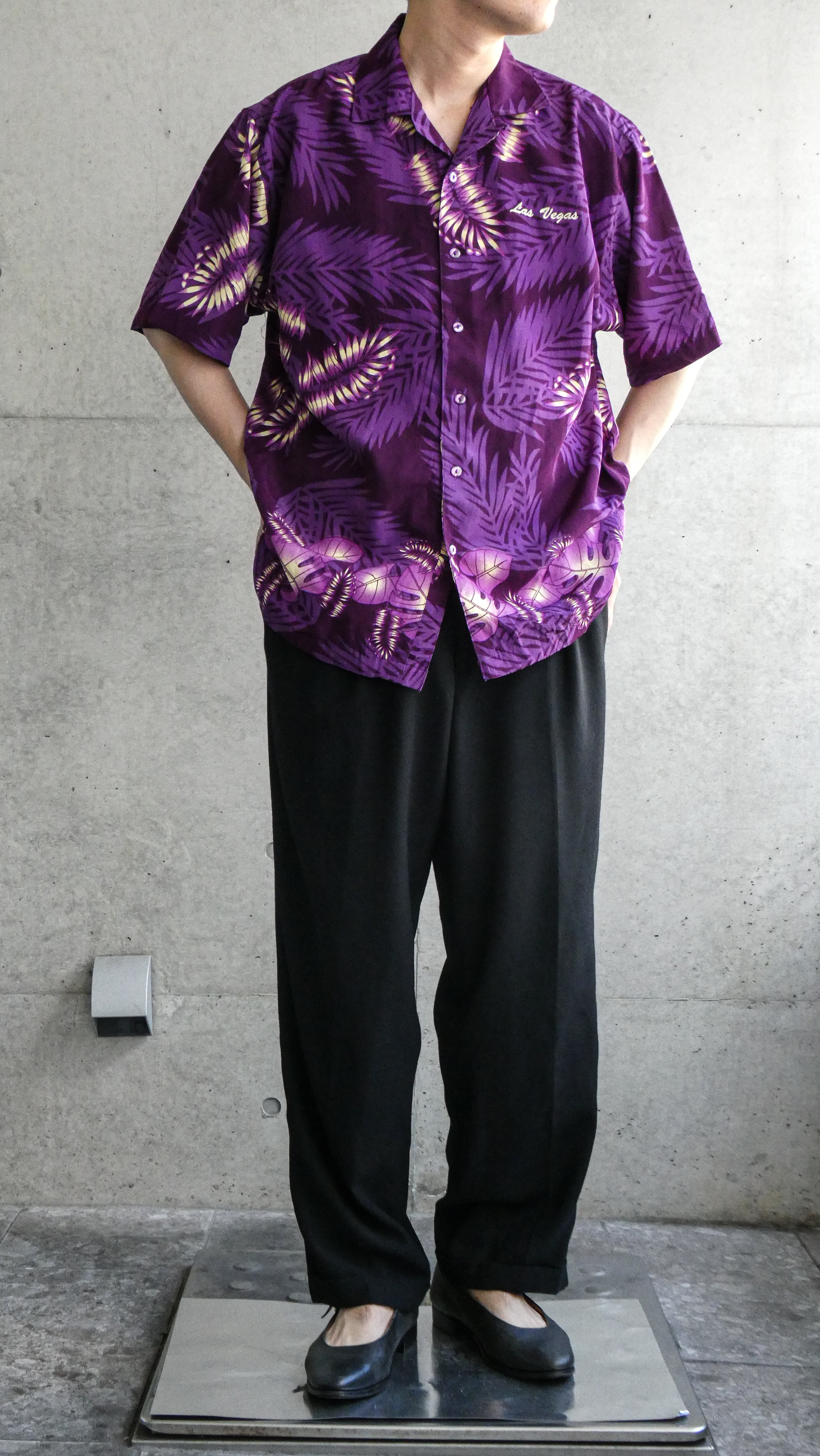 変わり種アロハ。草木柄がタイダイに色抜けされたようなデザイン。ベースがパープルなのもイケてます。黒系とのスラックスと相性抜群です。