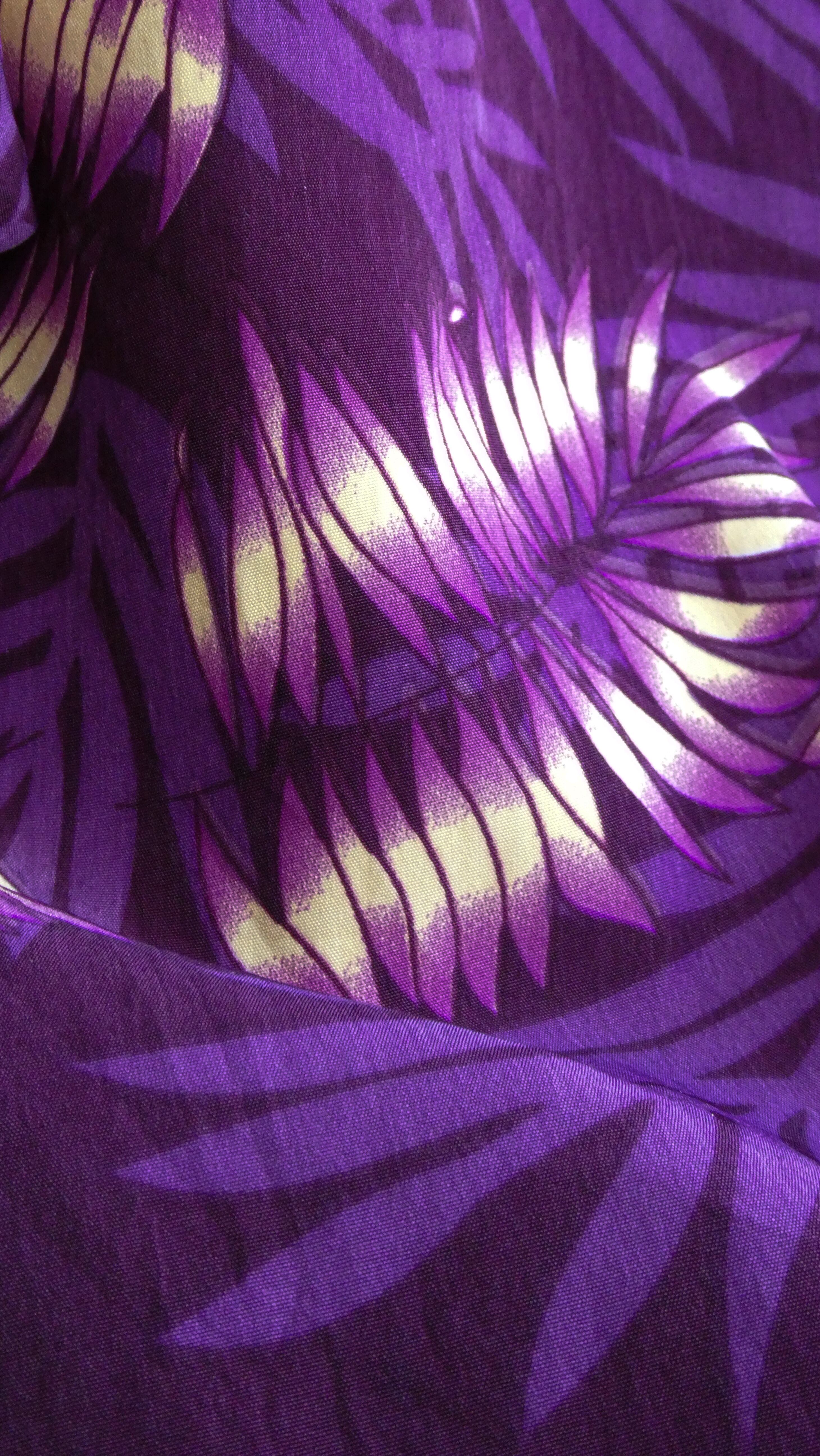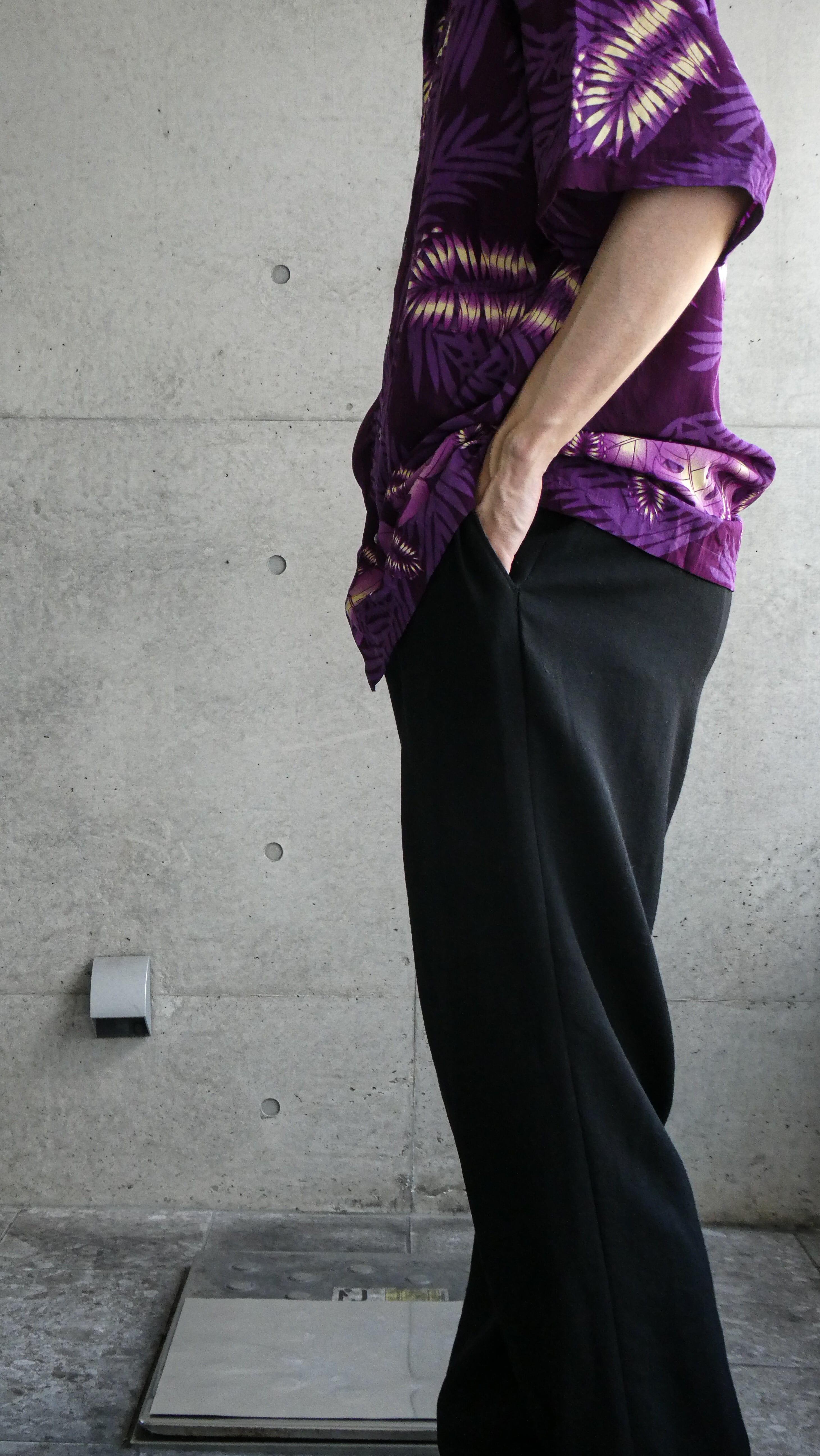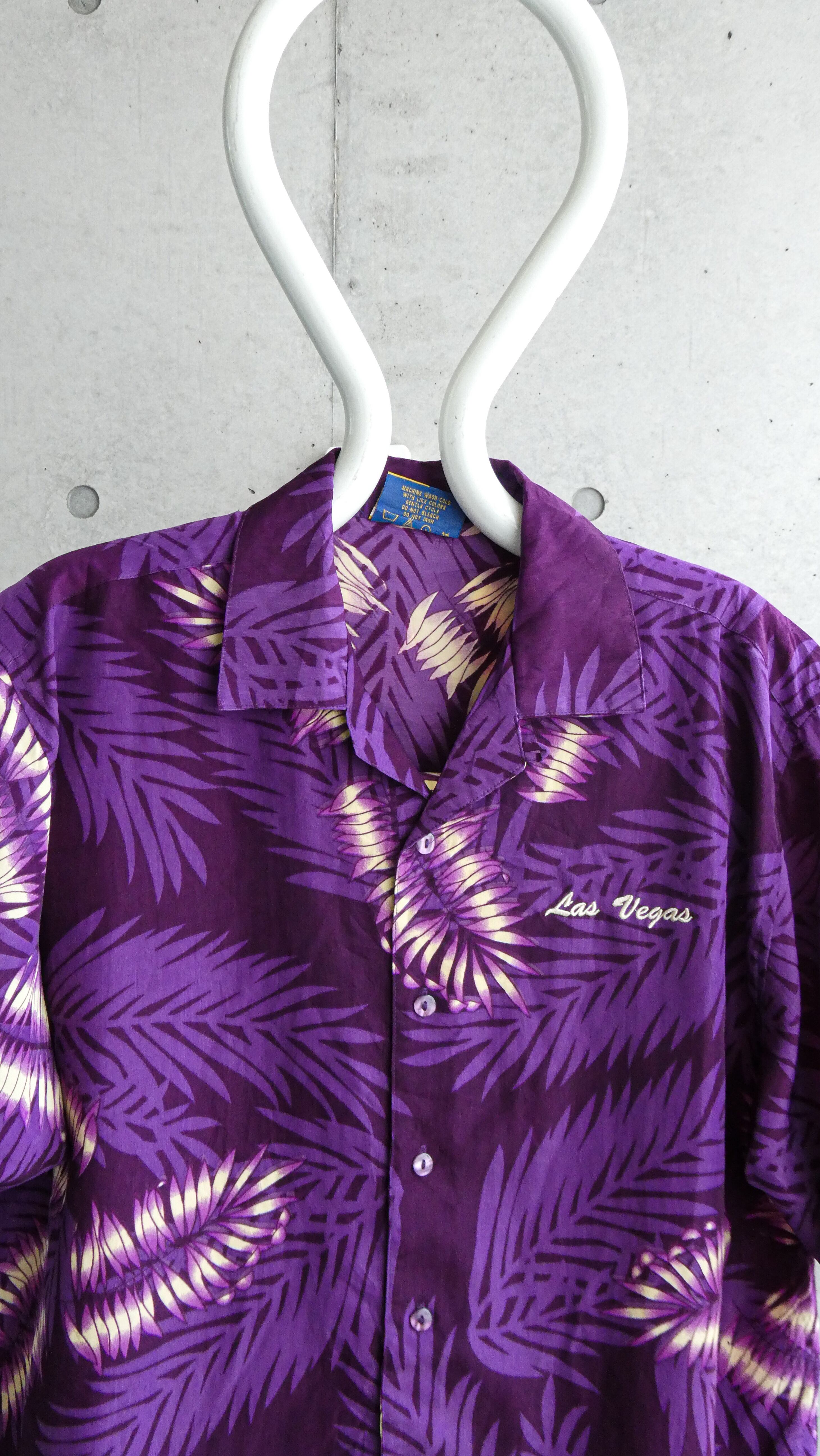 変わり種アロハ。草木柄がタイダイに色抜けされたようなデザイン。ベースがパープルなのもイケてます。黒系とのスラックスと相性抜群です。