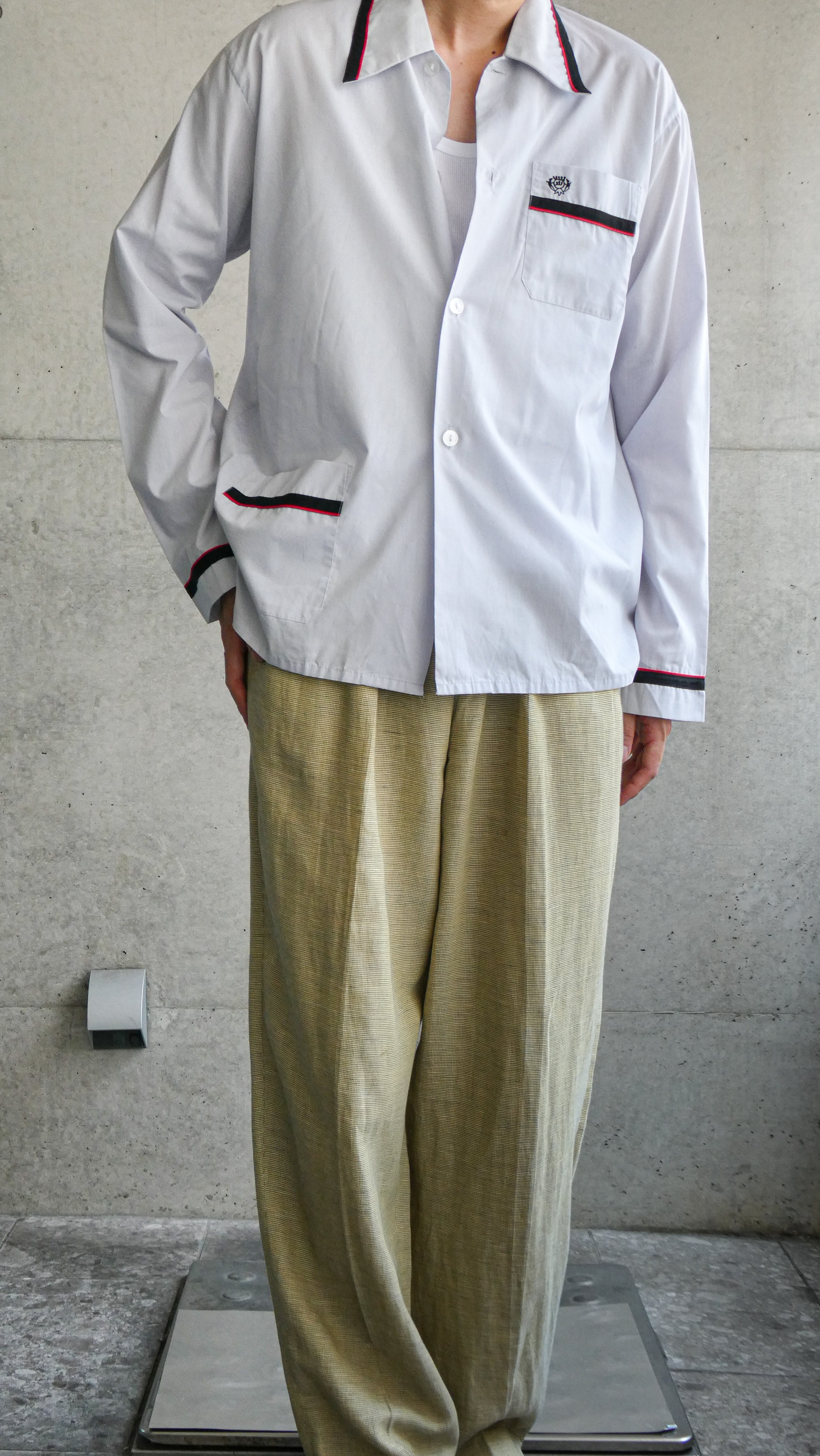 イチオシのパジャマシャツ。パジャマっぽくない上に、殆ど見ないカラーパターン。アイスグレーに、黒、赤のライン。配色が凄くいいです。ユーロ物。ボタンもクリアボタンなのが◎。