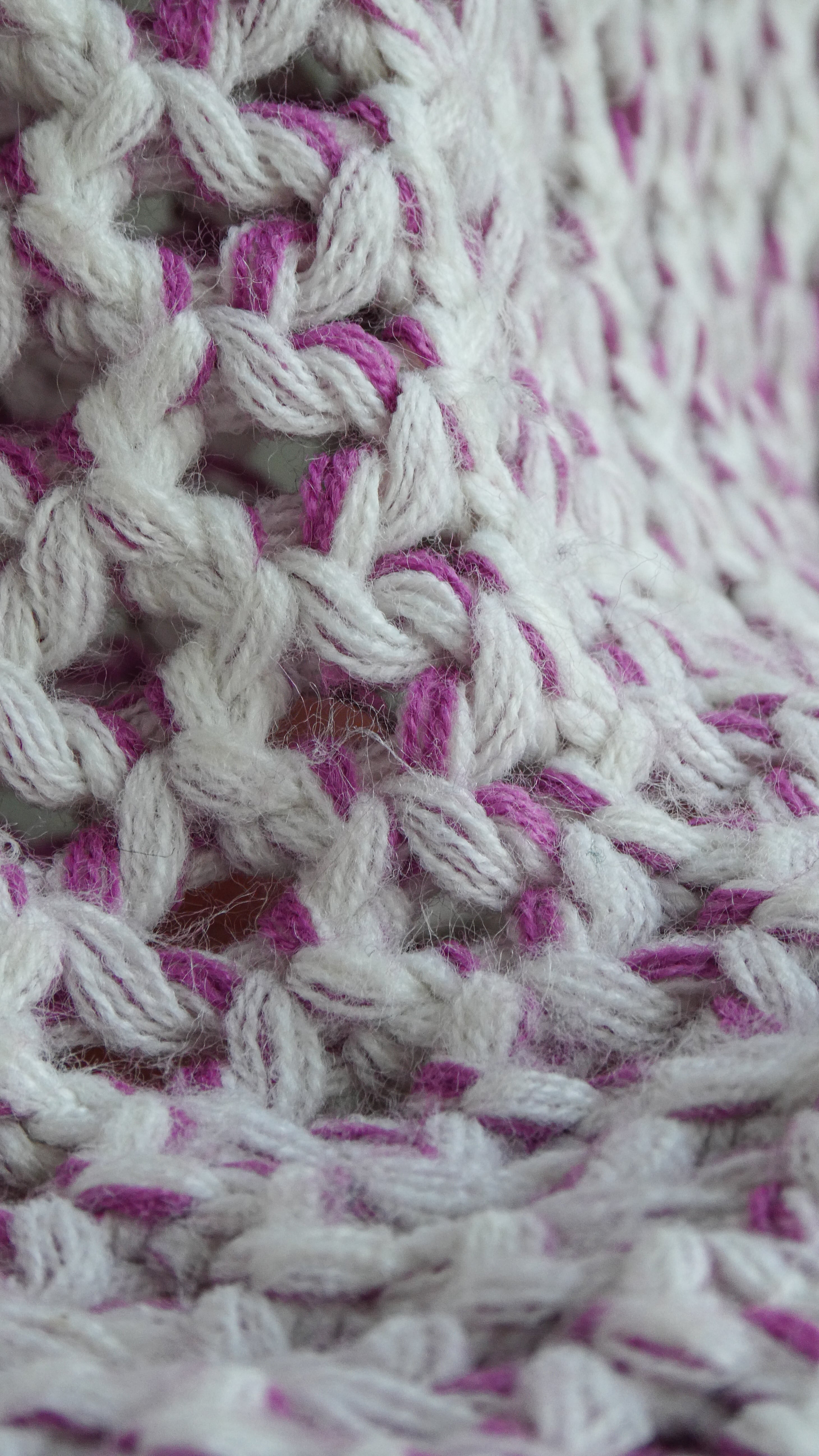 ユーロ物。パープルとホワイトの超ローゲージニット。適度な透け感で使い易いシアー編み。アクリル100%。肌触りはかなりモチモチしていて気持ちいいです。小柄なメンズ、レディース向けサイズです。