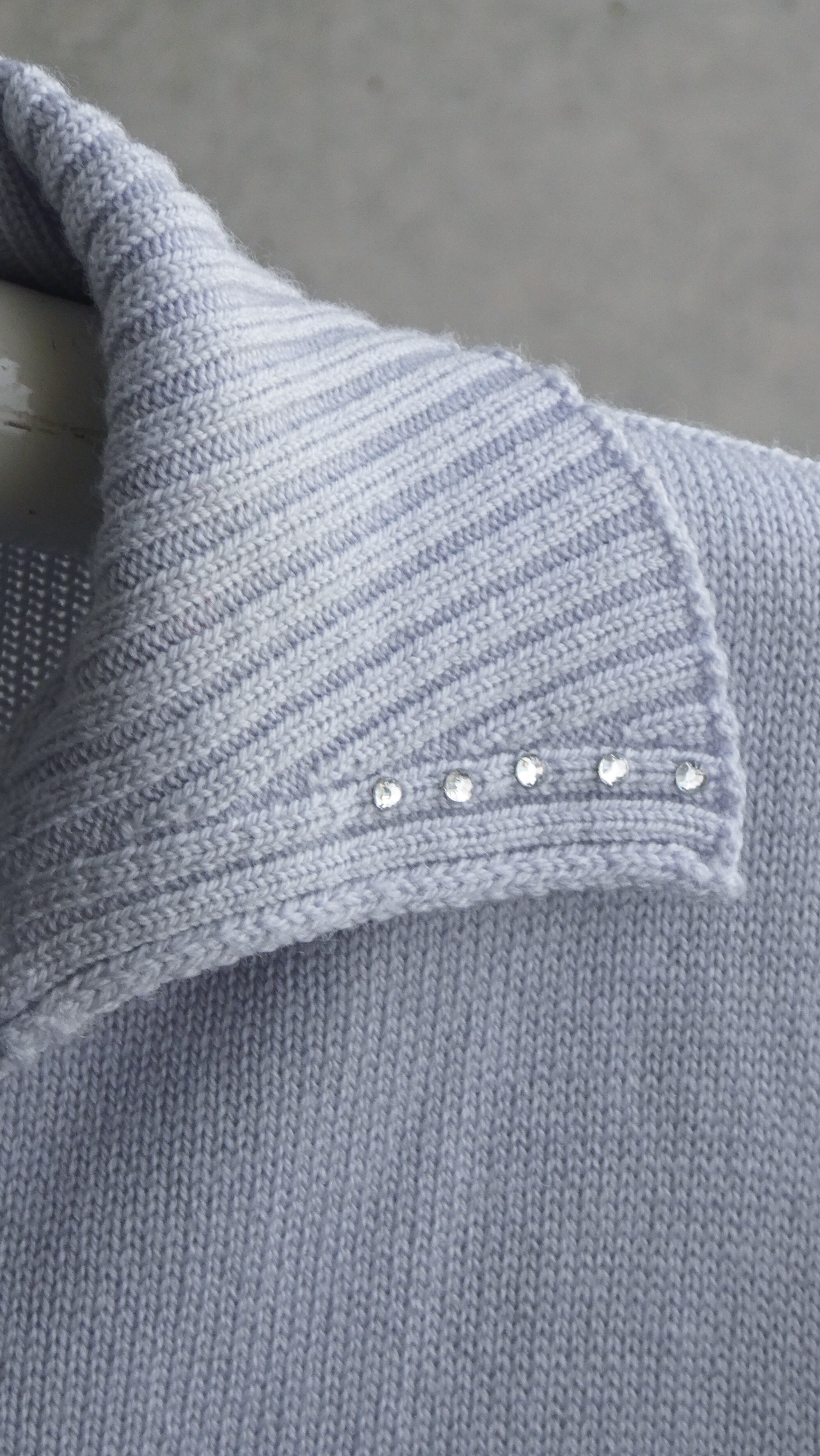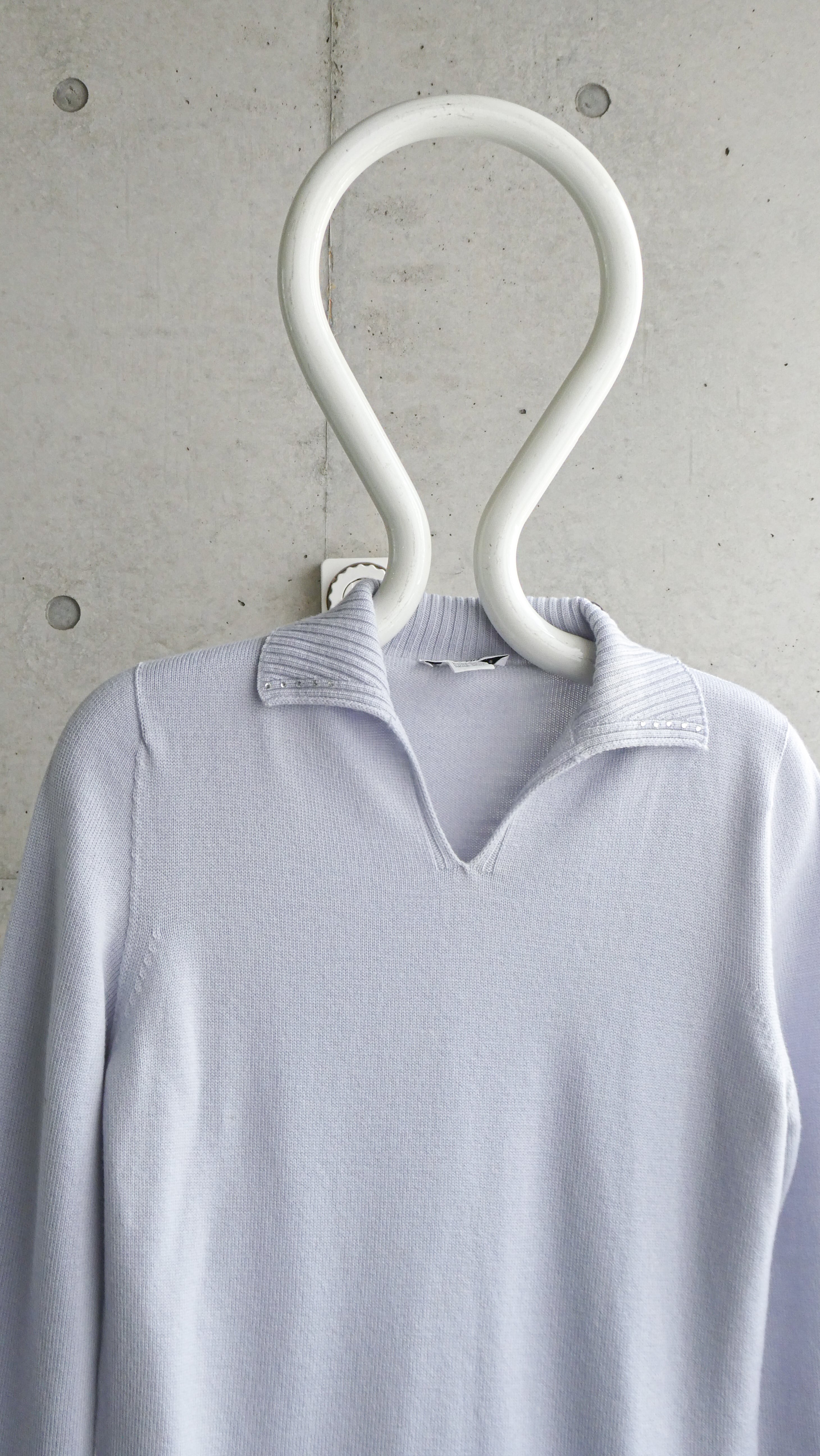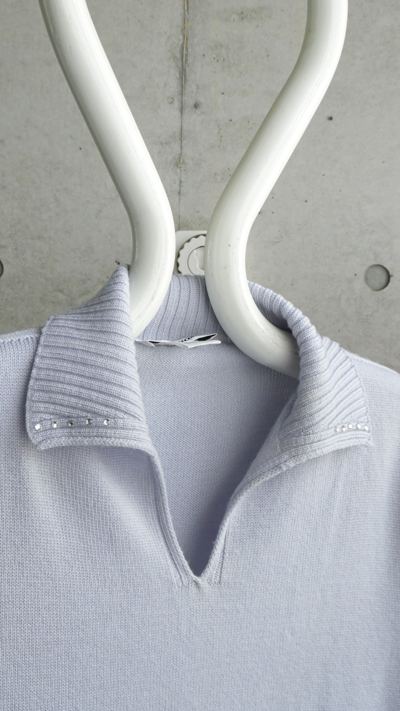 薄紫色のスキッパーニットポロ。希少なスキッパータイプのポロです。襟にジュエルストーン付きのデザイン。こういう気の利いたポロは探しても中々見つからないです。袖のディテールも◎。小柄なメンズ、レディース向けサイズです。