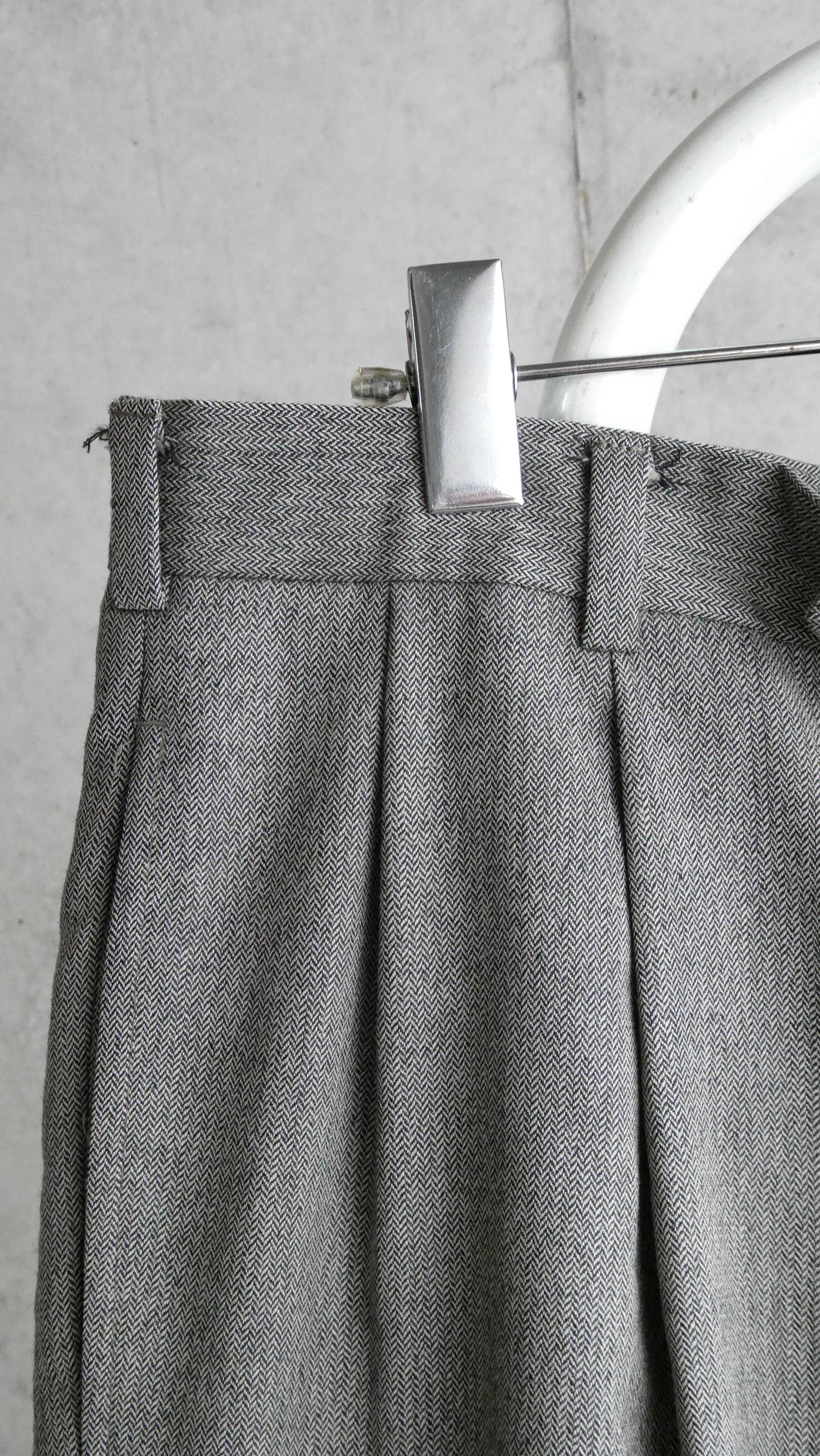 グレーのウールスラックス。ヘリンボーン織りです。2タックでズドンと太いワイドシルエット。カラー物のトップスとも相性良いスラックスです。