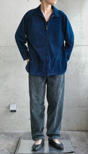 ネイビーのベロアコーデュロイシャツ。珍しいジップアップタイプ。棒ジップなのも凄くいいです。緩く着れるシルエット。秋冬活躍してくれるシャツです。