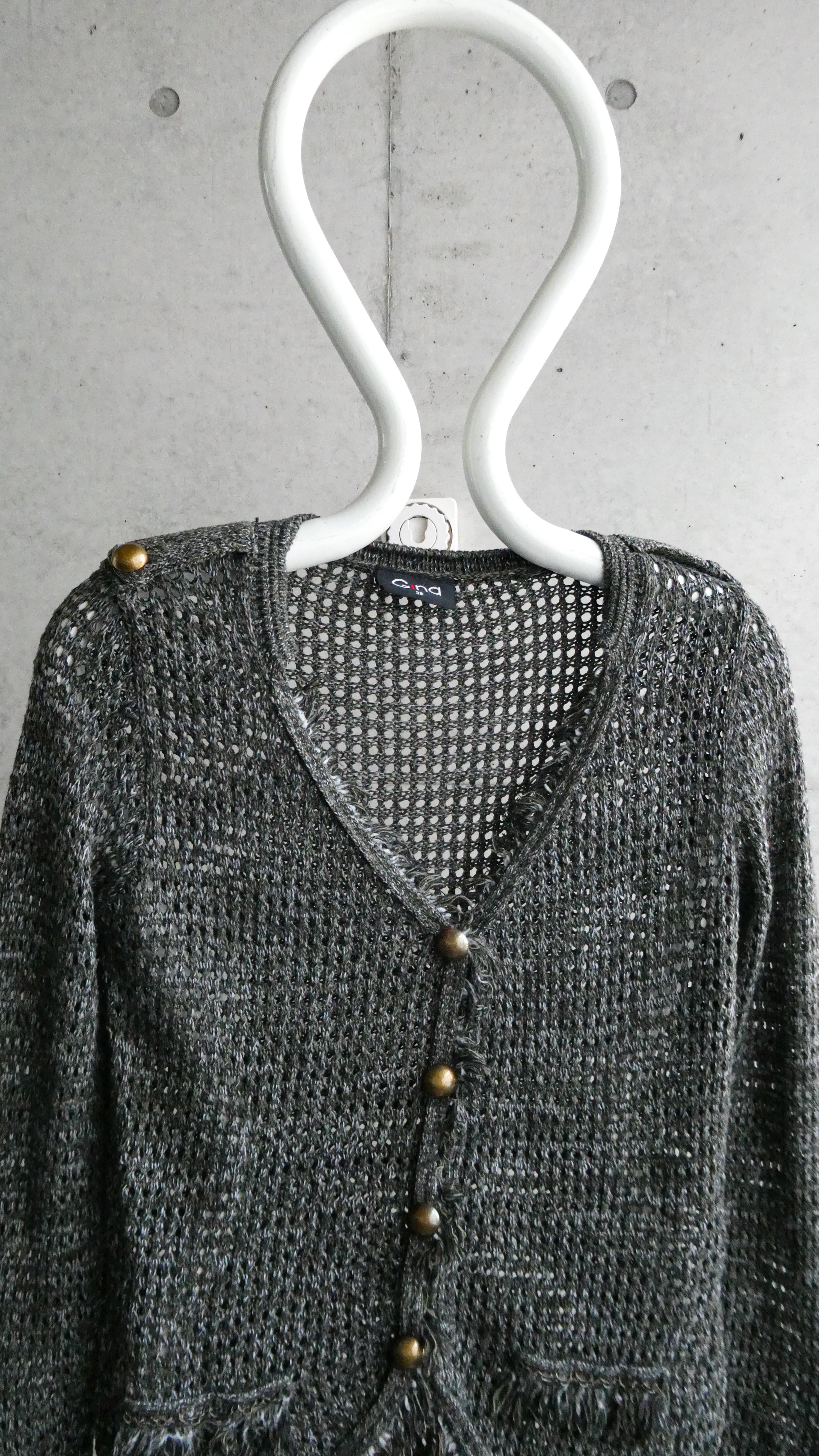 チャコールカラーでフリンジが特徴的なカーディガン。コットン生地。ボタンもゴールドのメタルボタンです。適度なフリンジが凄くアクセントになったカーディガンです。小柄なメンズ、レディース向けサイズです。