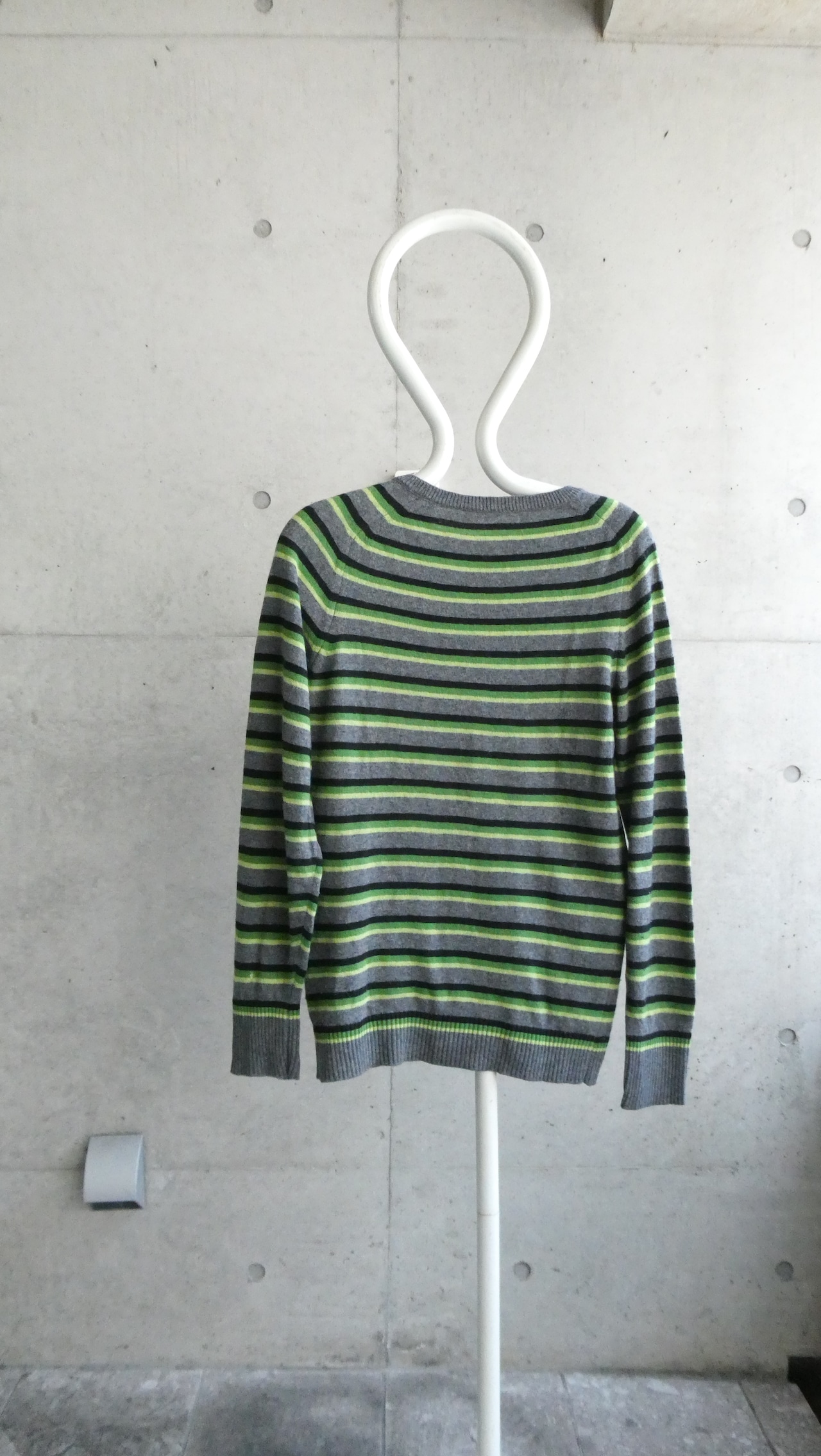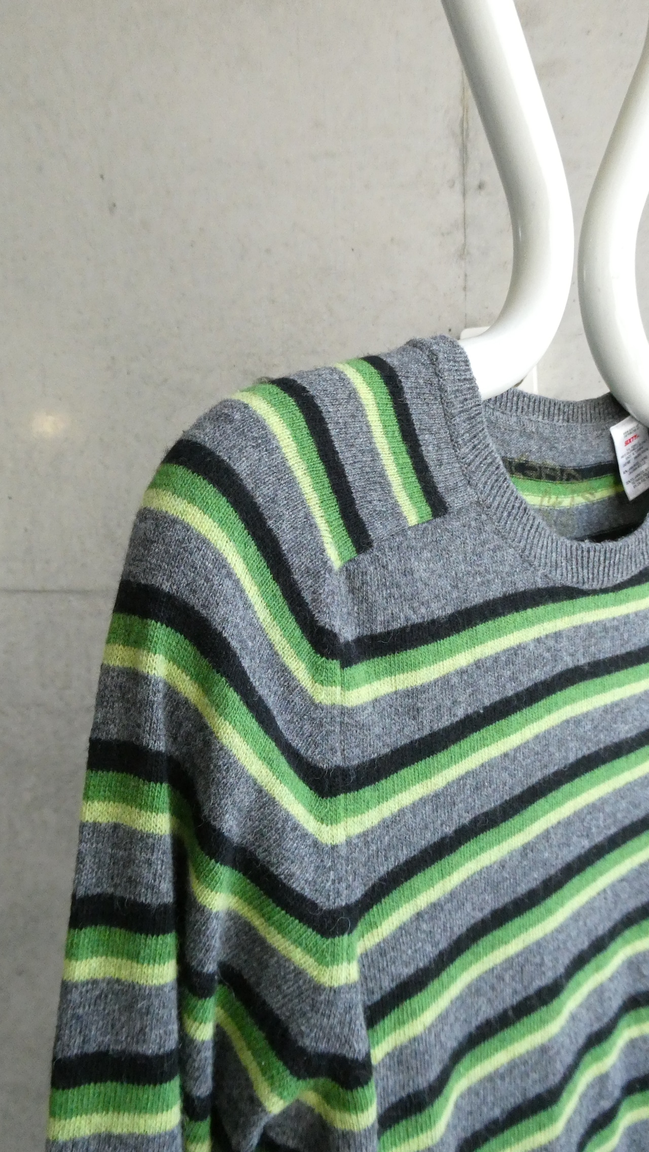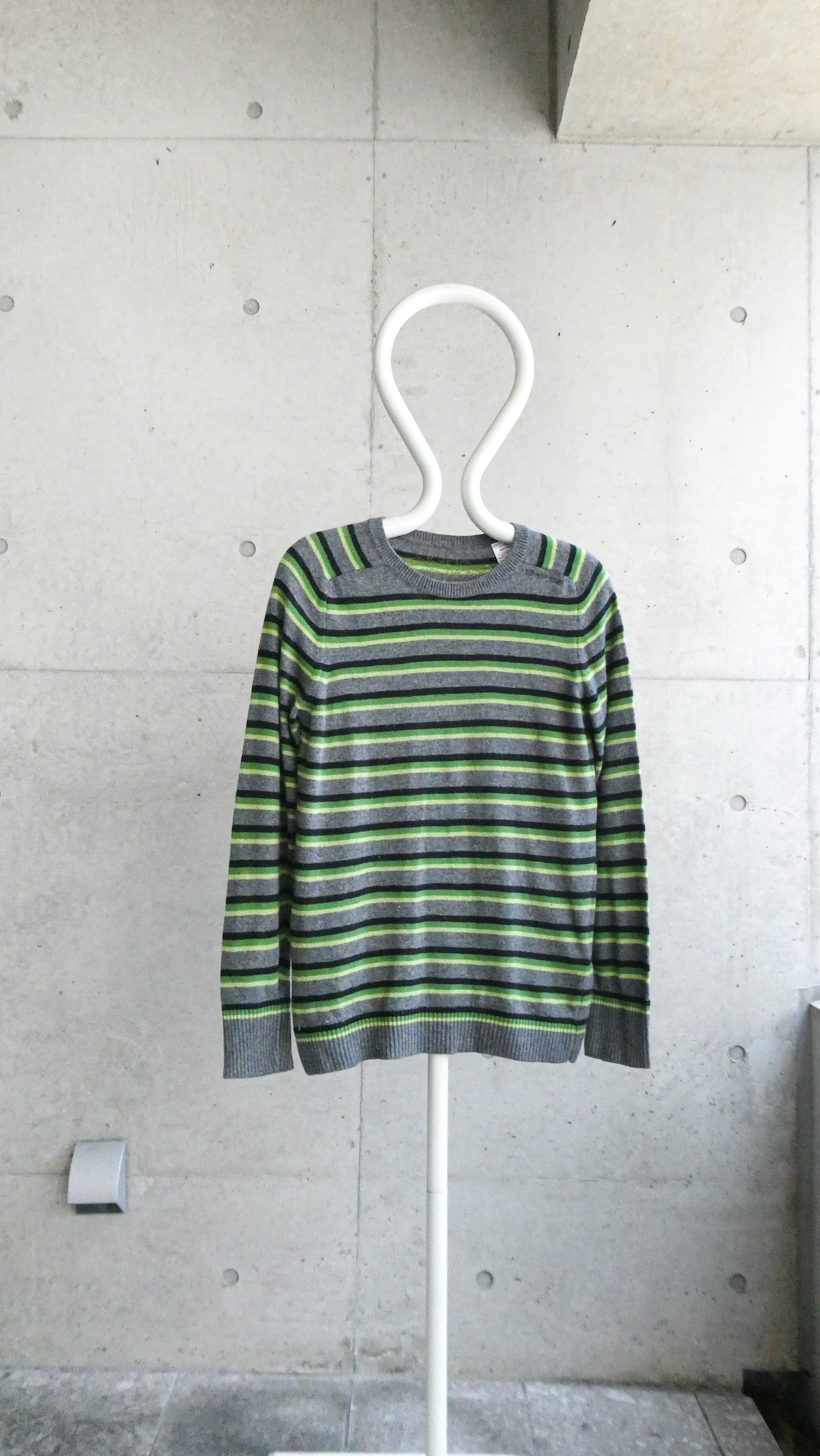 グリーンとグレーのボーダーニット。薄手なニット生地です。袖もラグラン仕様で、しっかり肩も落ちるような形です。小柄なメンズ、レディース向けサイズです。