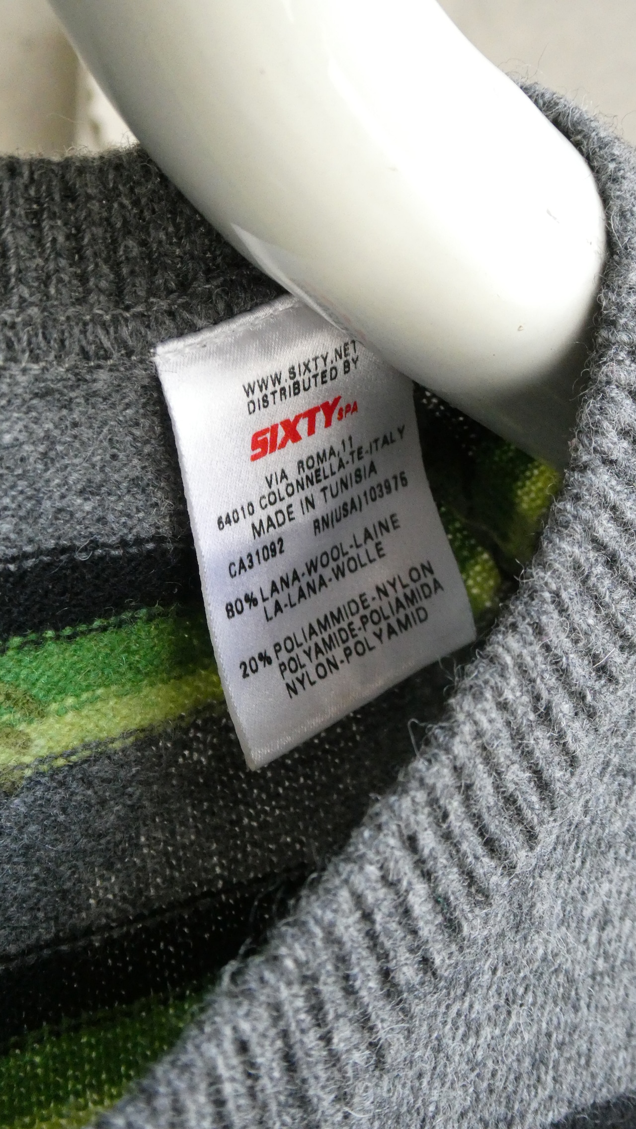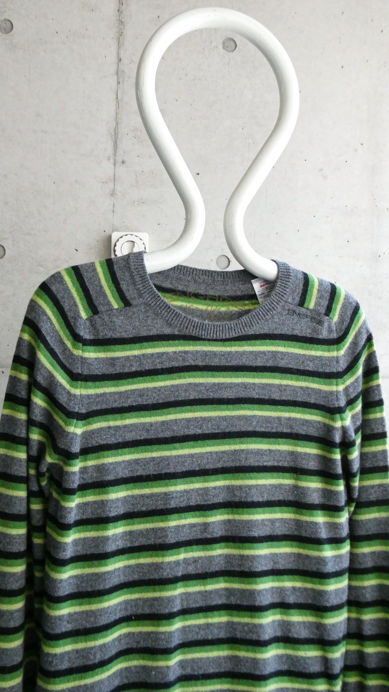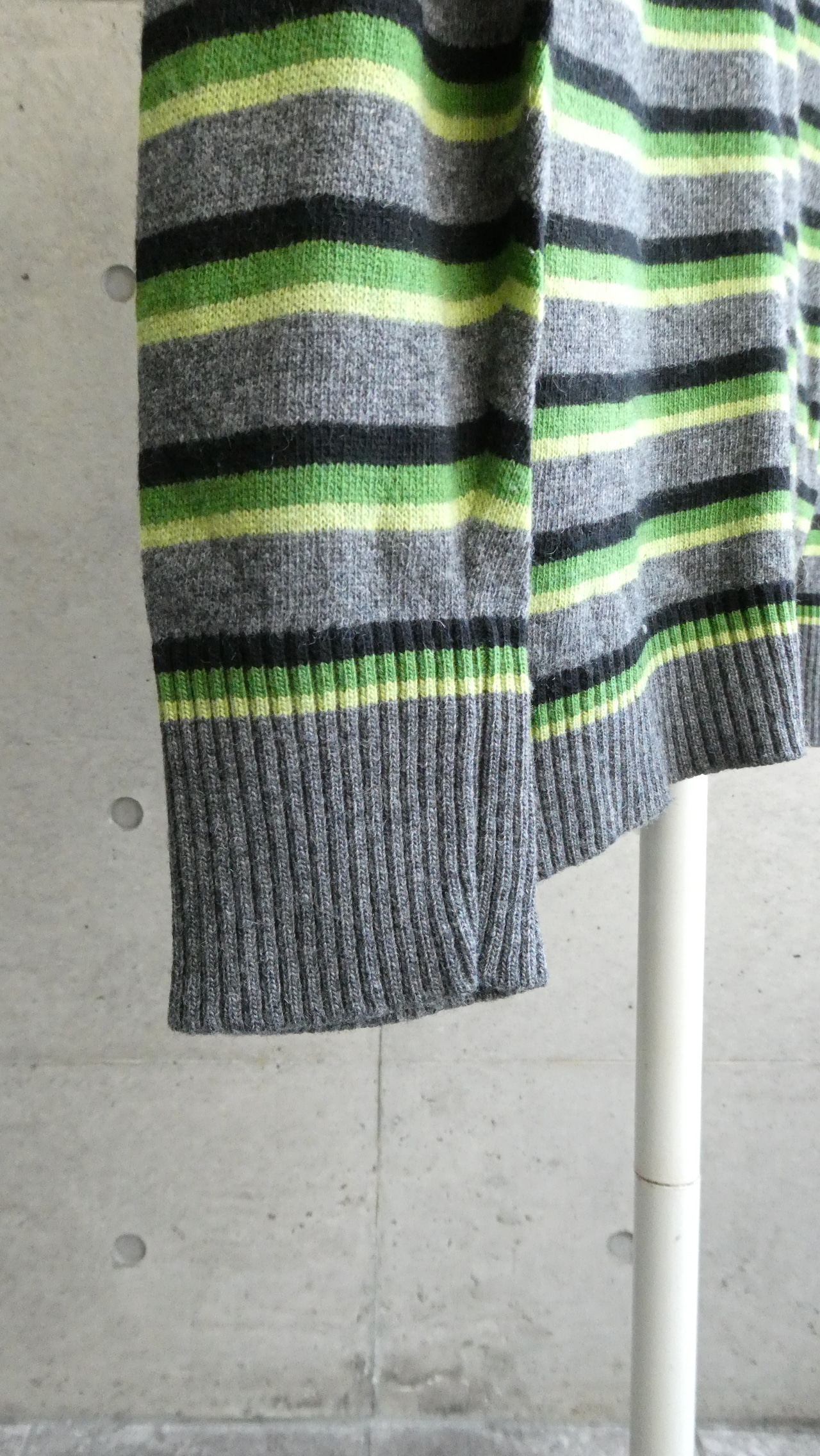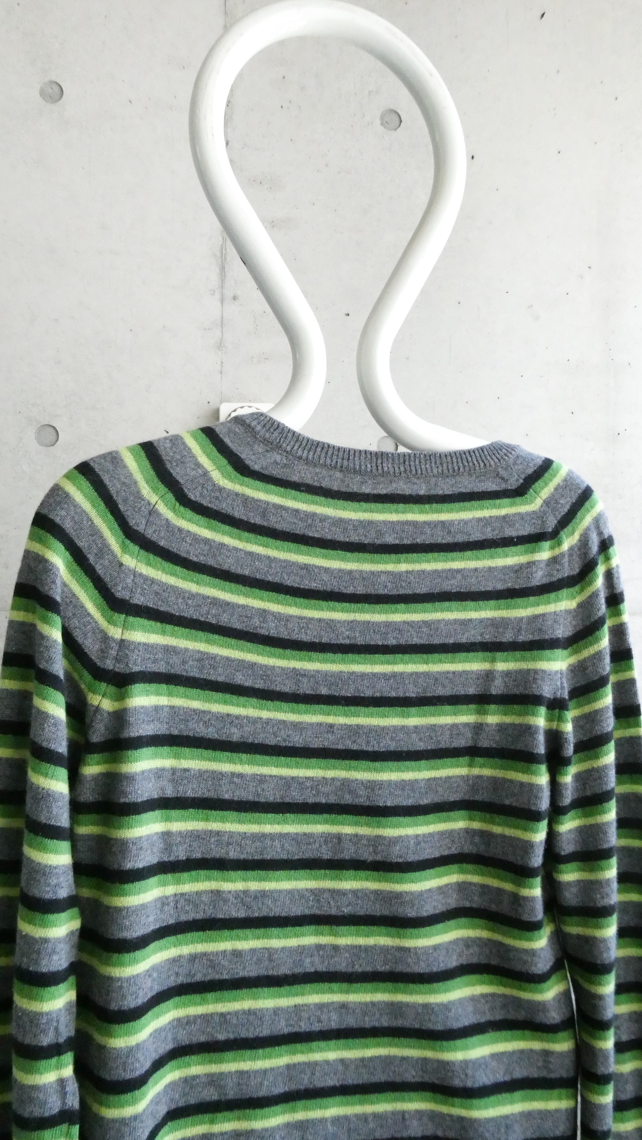 グリーンとグレーのボーダーニット。薄手なニット生地です。袖もラグラン仕様で、しっかり肩も落ちるような形です。小柄なメンズ、レディース向けサイズです。