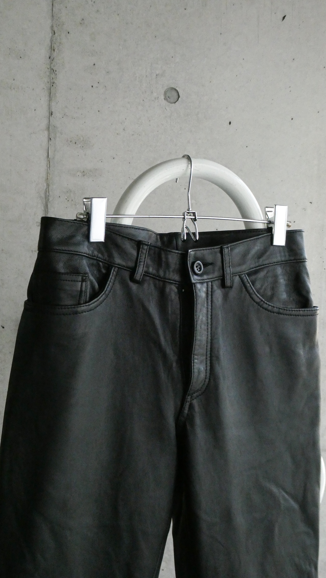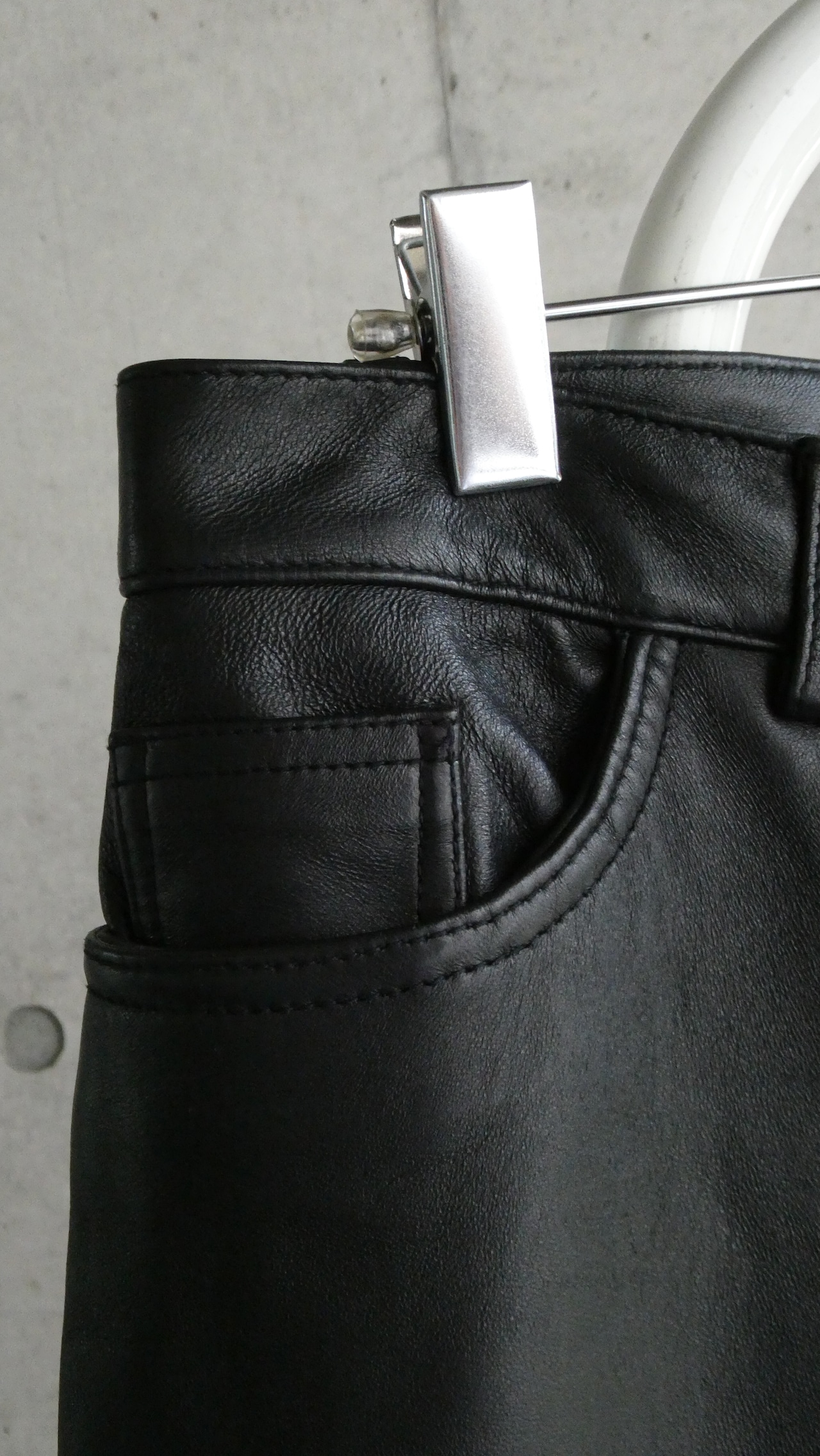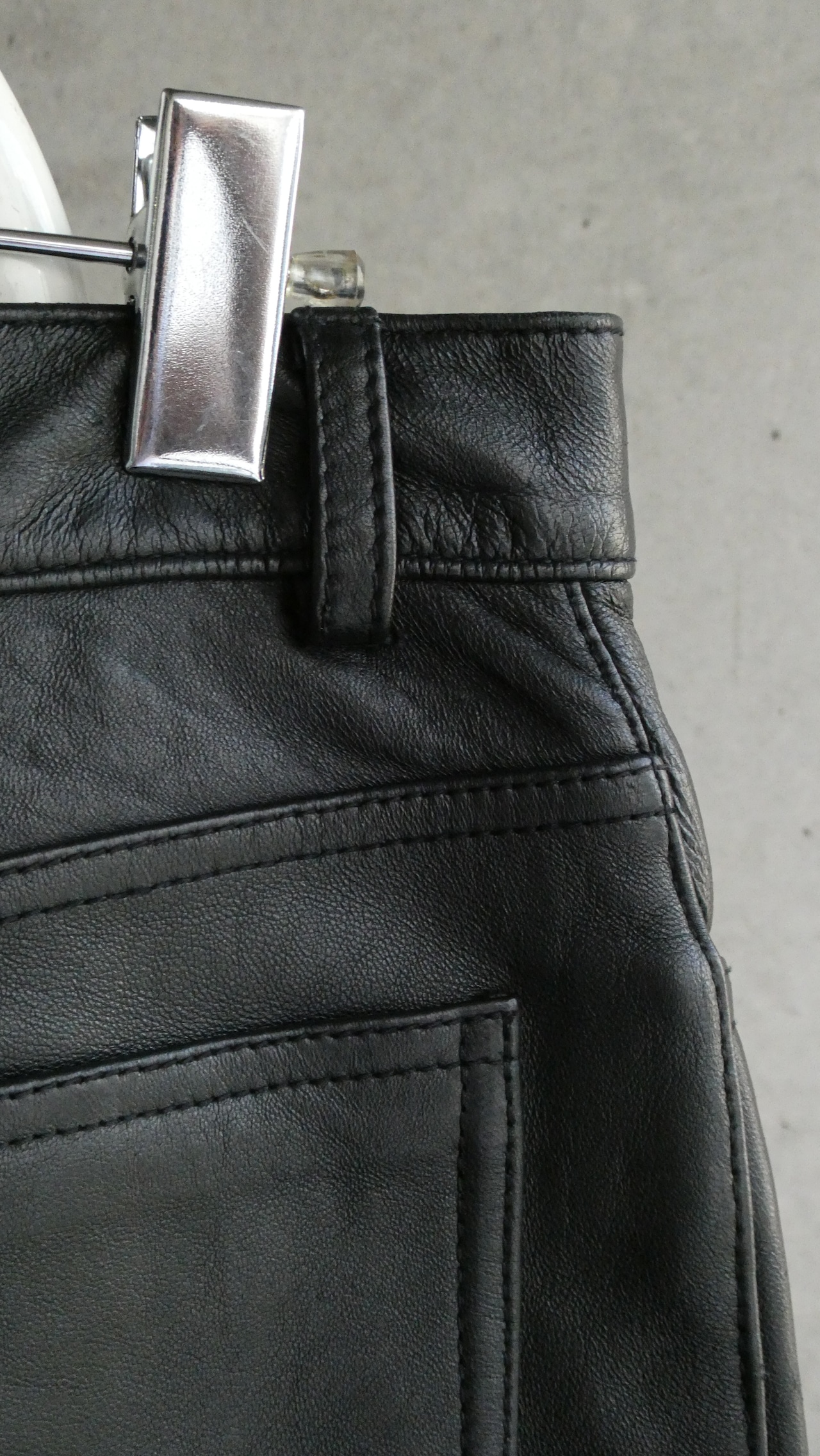 ブラックのレザーパンツ。5ポケットでリーバイス501のような王道なストレートシルエット。革質も良くて、モチモチです。膝に切替パターン。細身のメンズ、レディース向けサイズです。