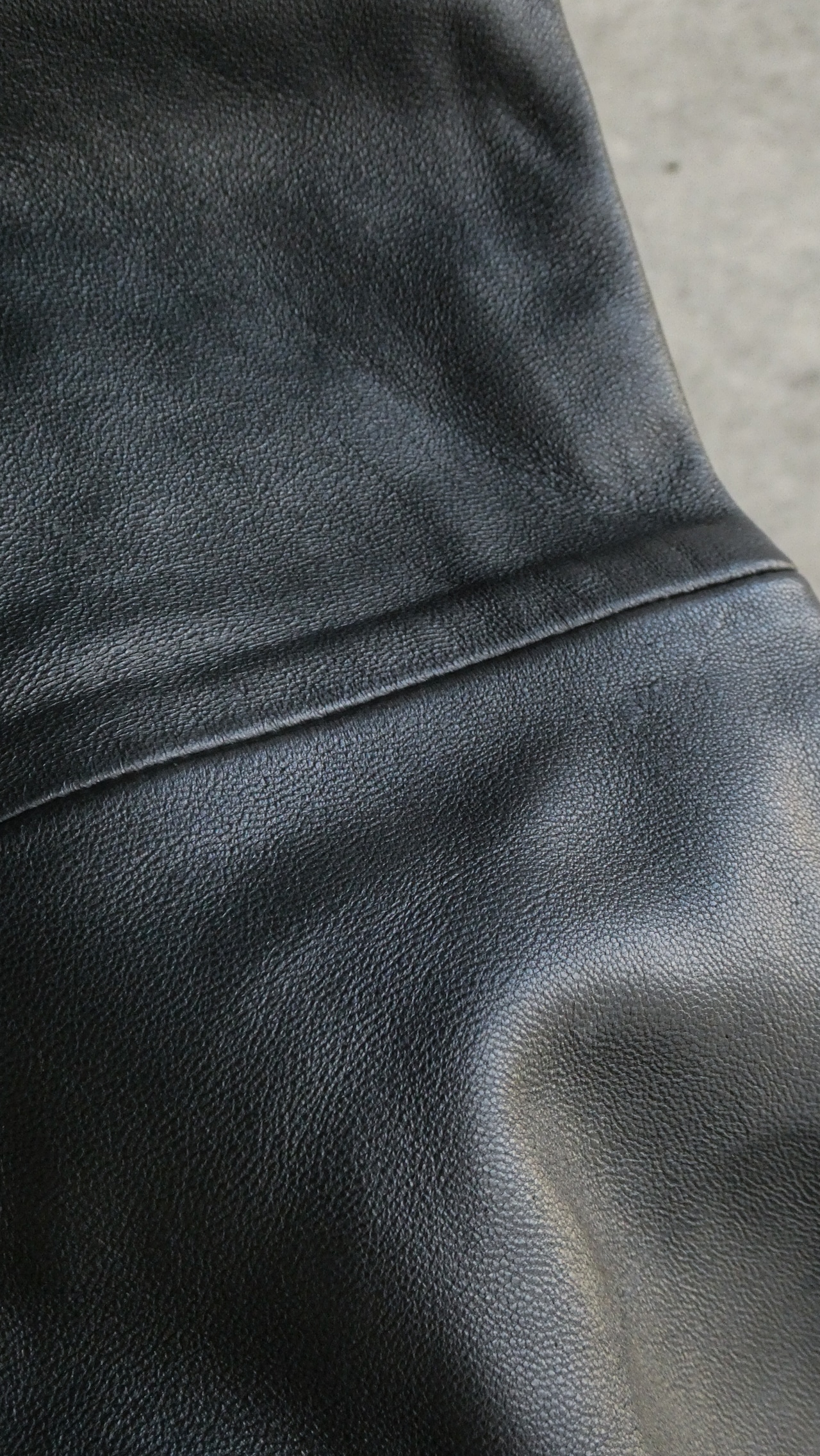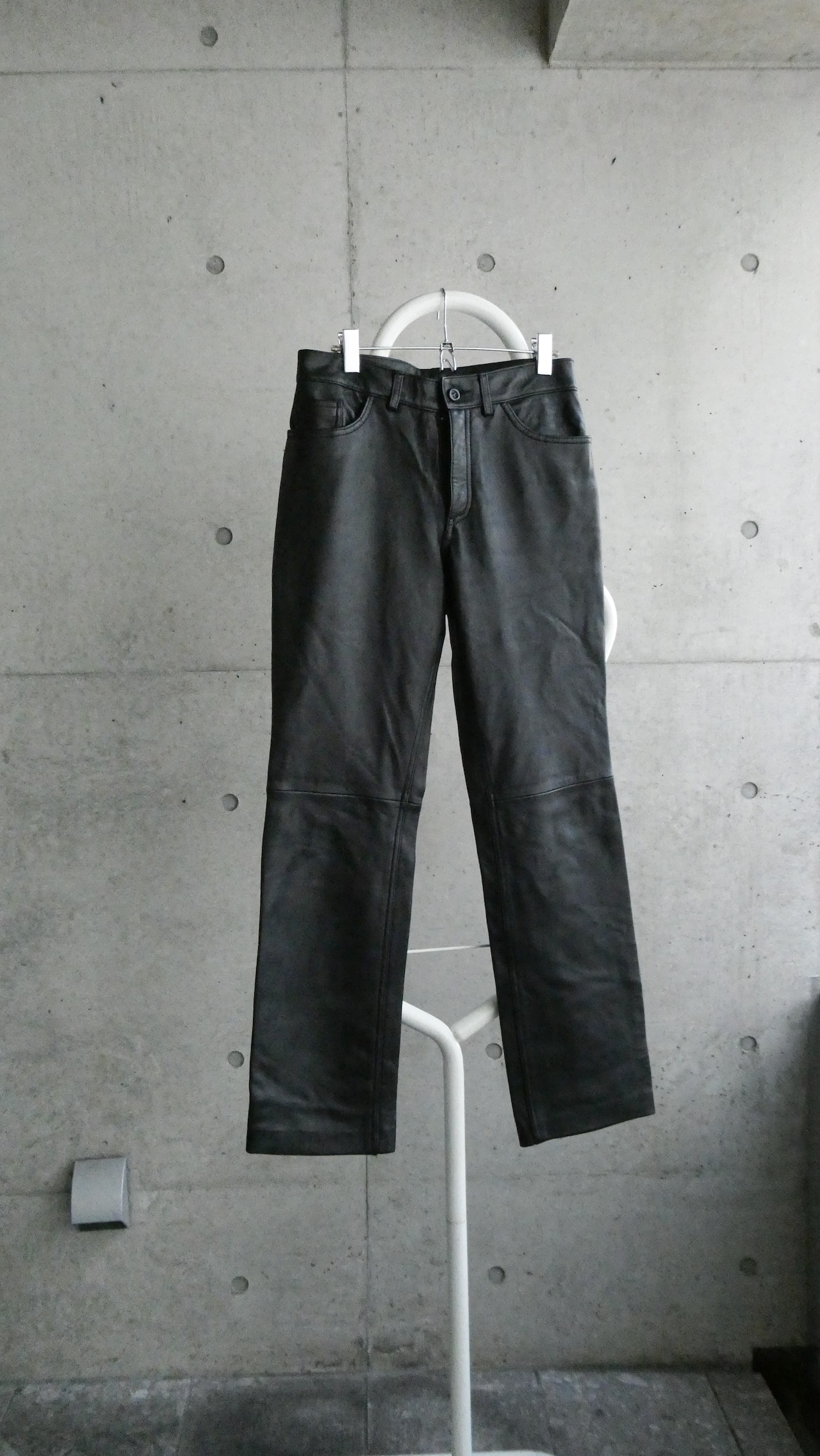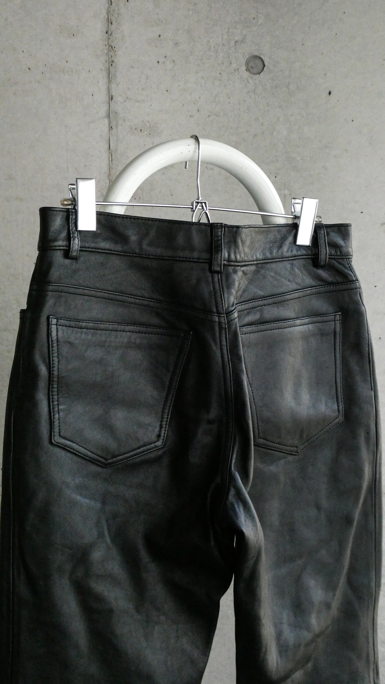 ブラックのレザーパンツ。5ポケットでリーバイス501のような王道なストレートシルエット。革質も良くて、モチモチです。膝に切替パターン。細身のメンズ、レディース向けサイズです。