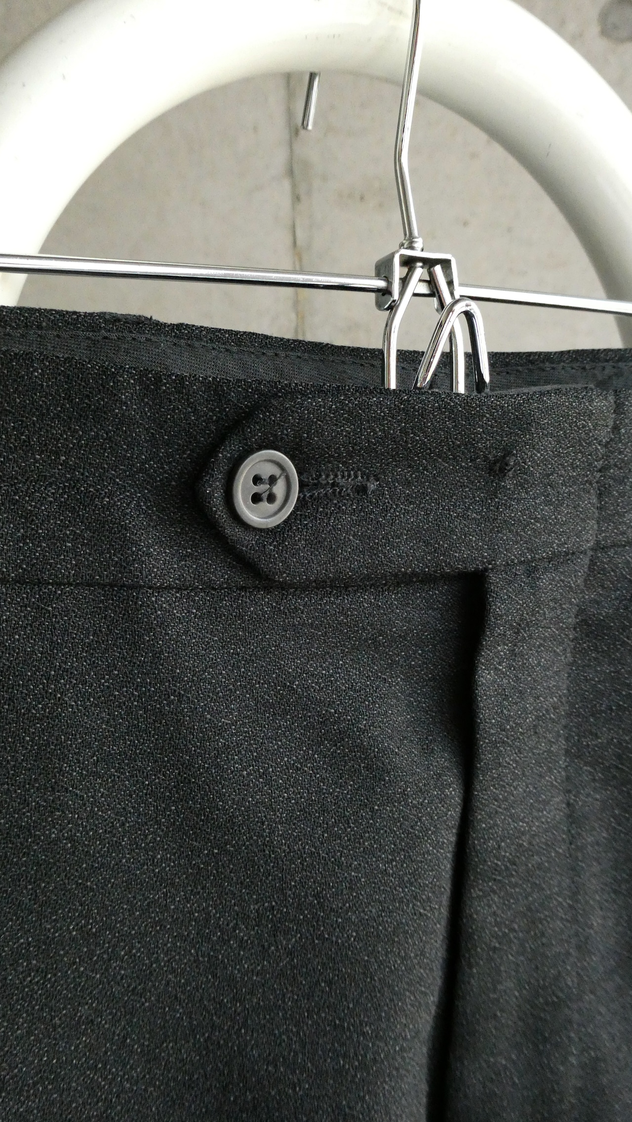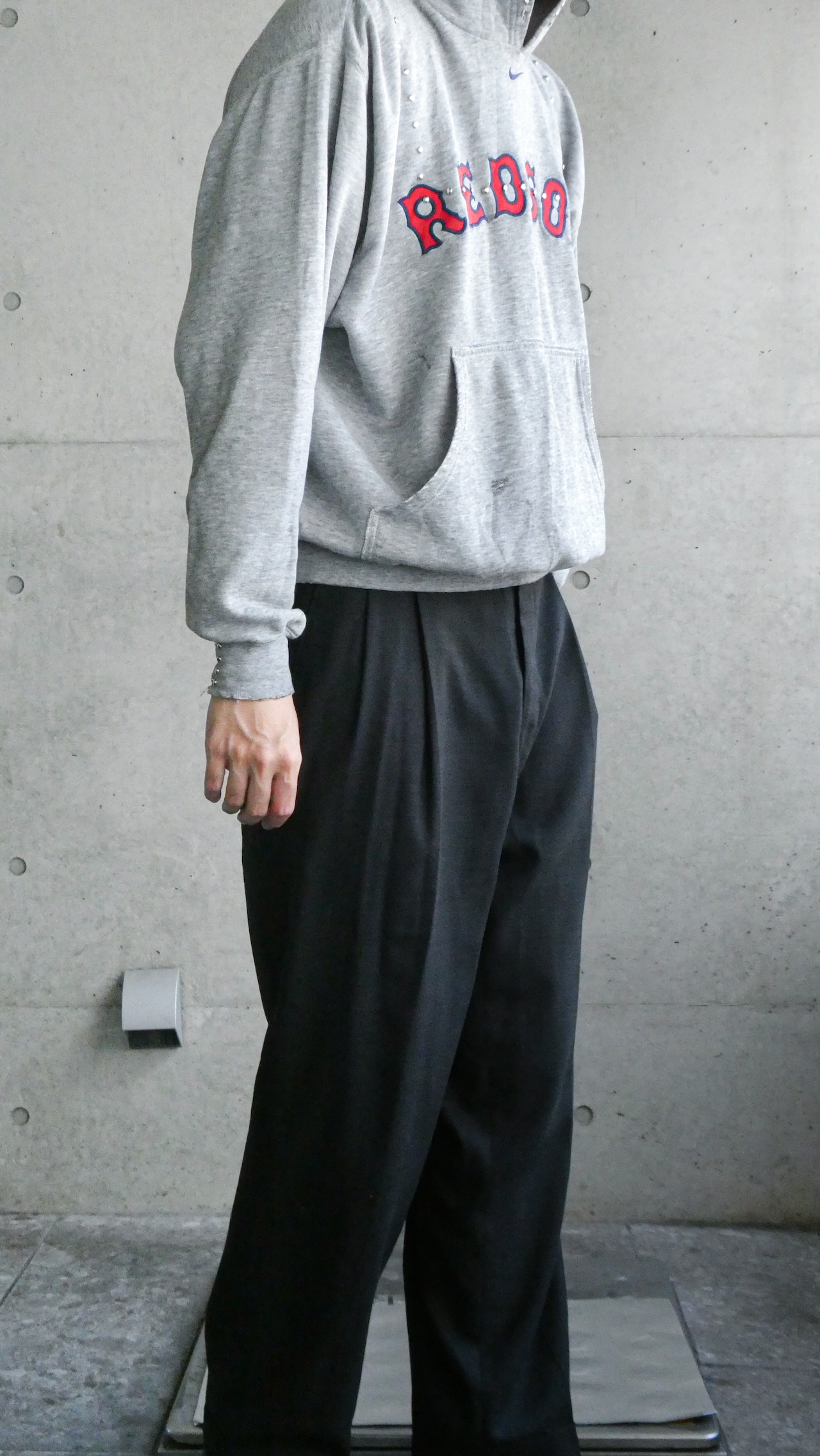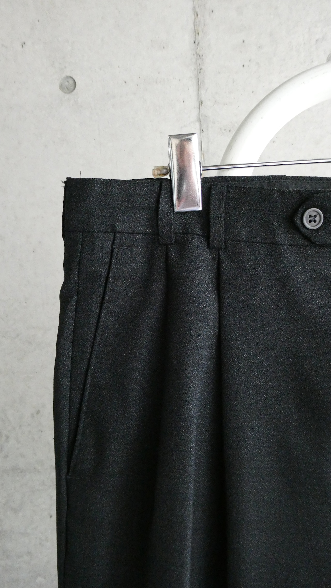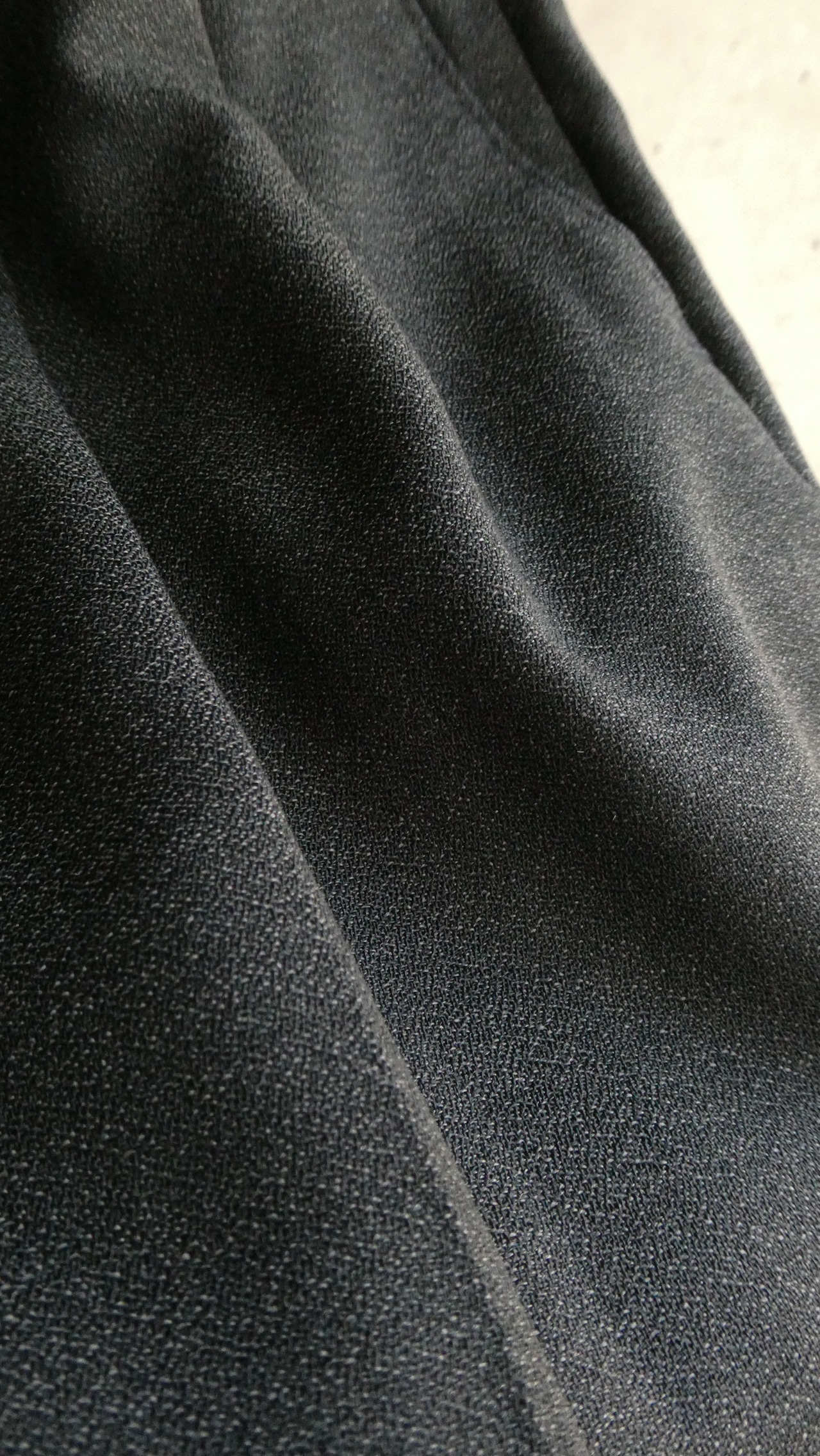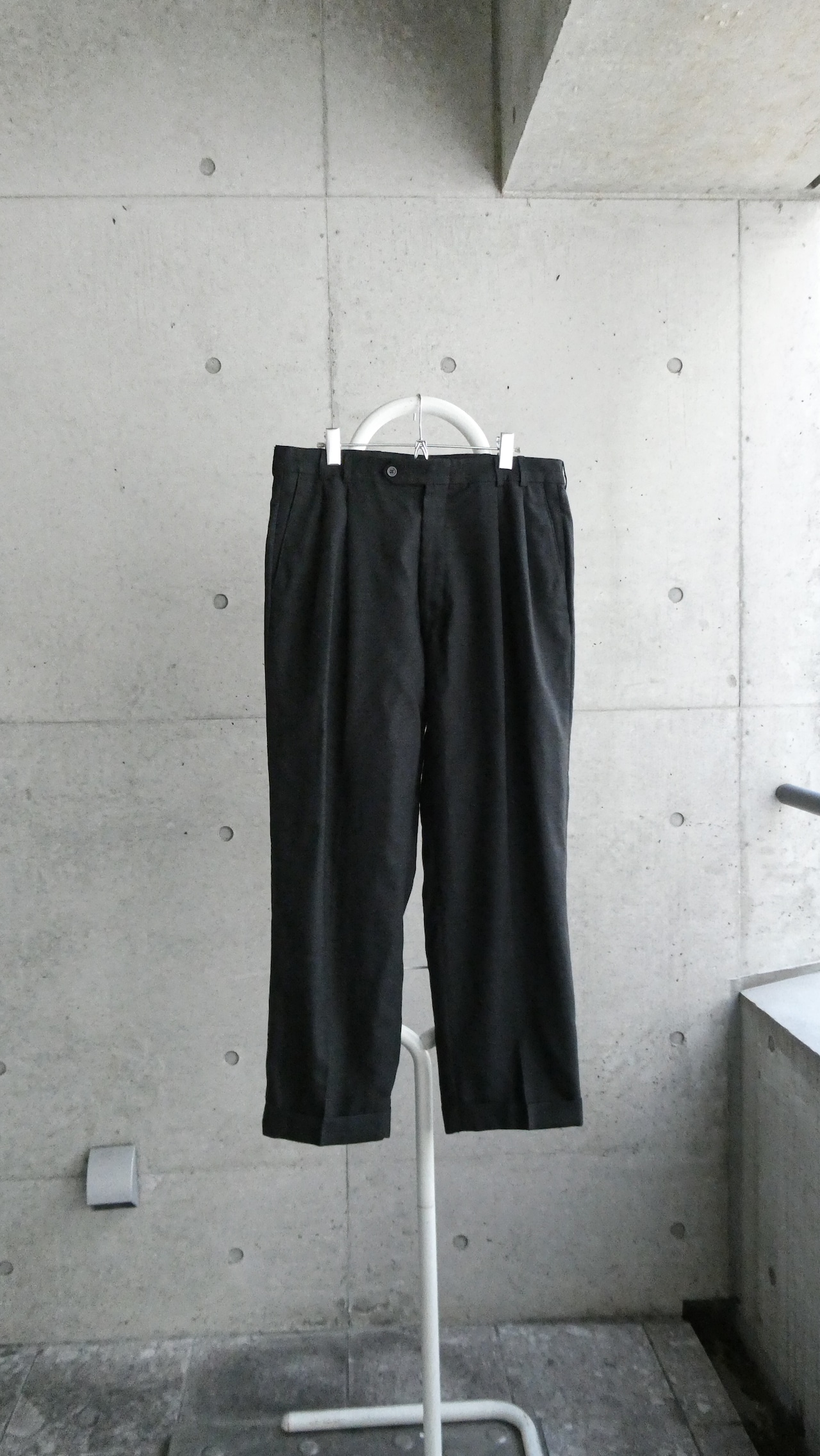 チャコールカラーのスラックス。ザラッとした荒い質感で少し白も混じったようなグレーカラー。2タック入り。太すぎず、細すぎない絶妙なシルエットです。