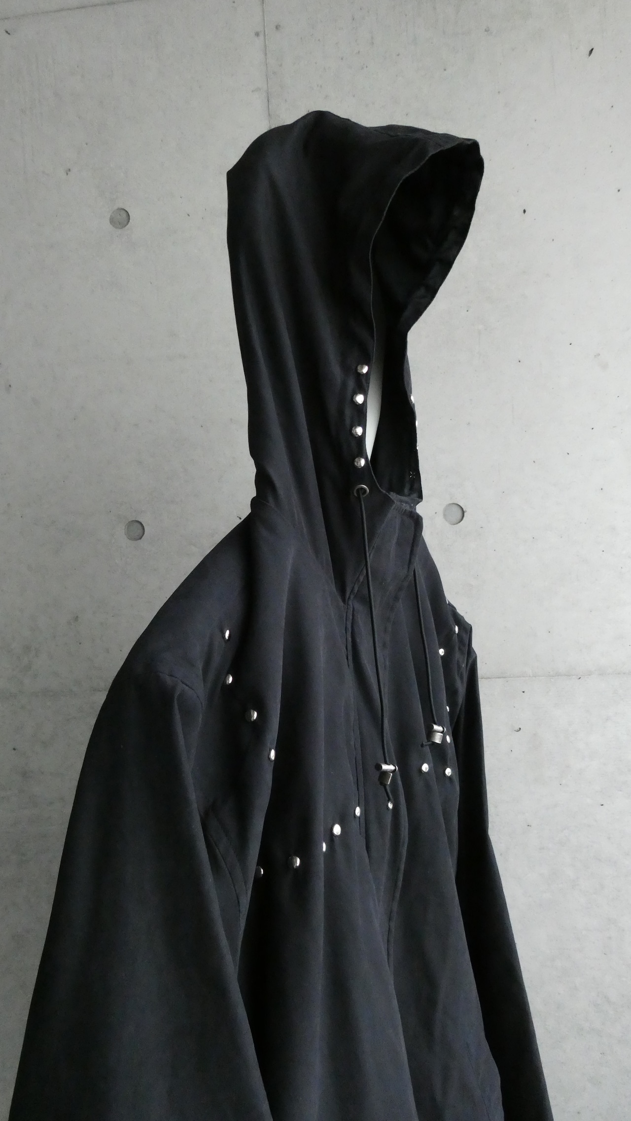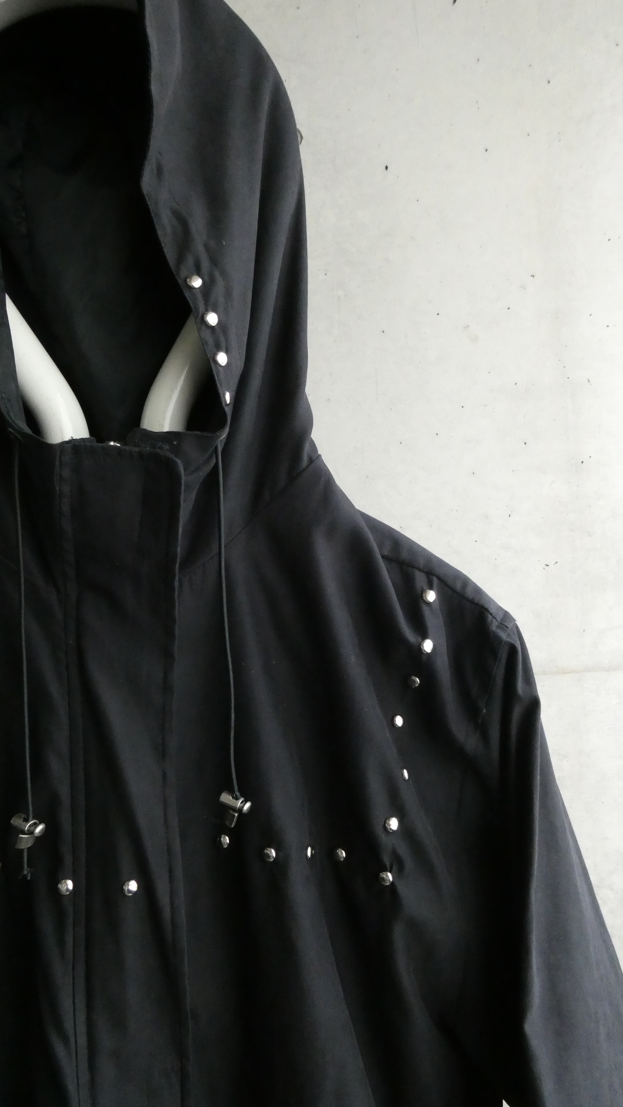 ブラックのスタッズカスタムブルゾン。普通の黒無地ブルゾンなのにラグジュアリーさがあります。フード縁にもチラッとさり気ないスタッズ。ドローコードの金具も凄く高級感あります。