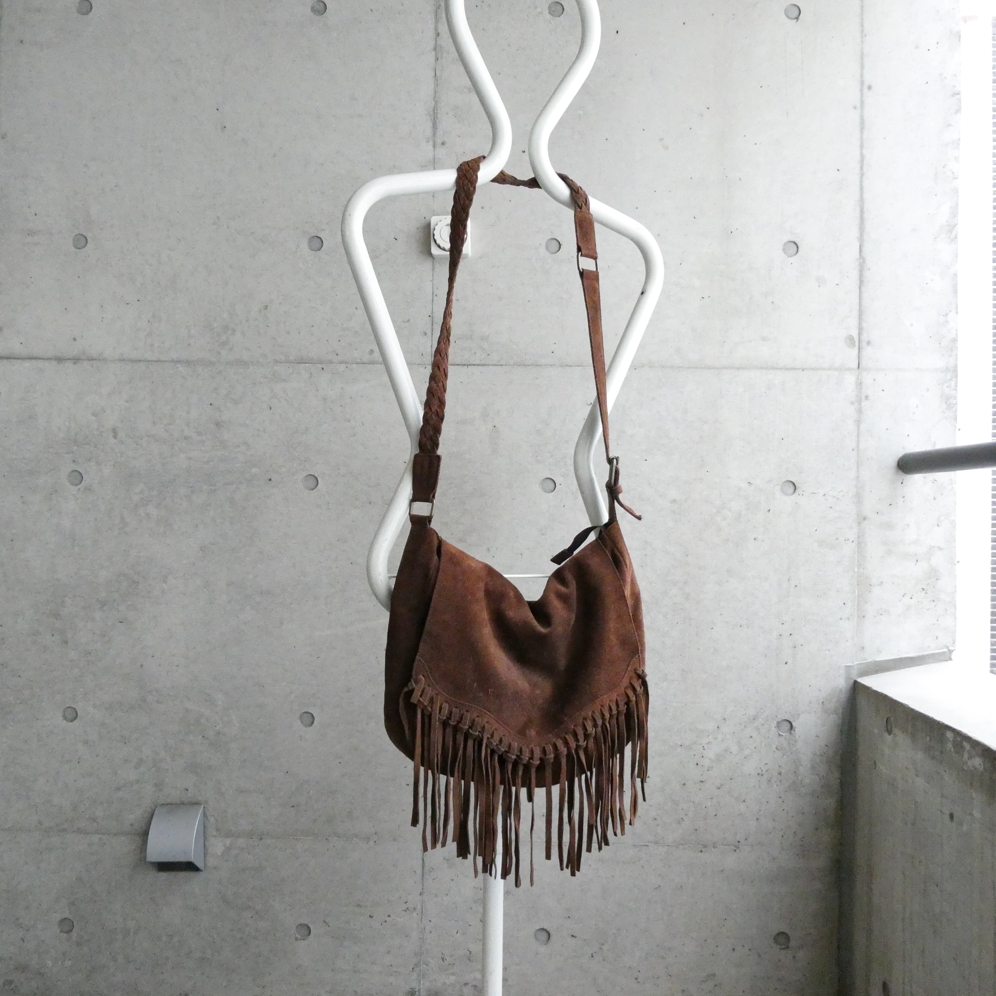 ブラウンのスウェードレザーのフリンジショルダー。革質も柔らかくて、上質なスウェード。フラップタイプで、大きさも一番使い易いです。背負うだけでスタイリングに雰囲気出るアイテム。