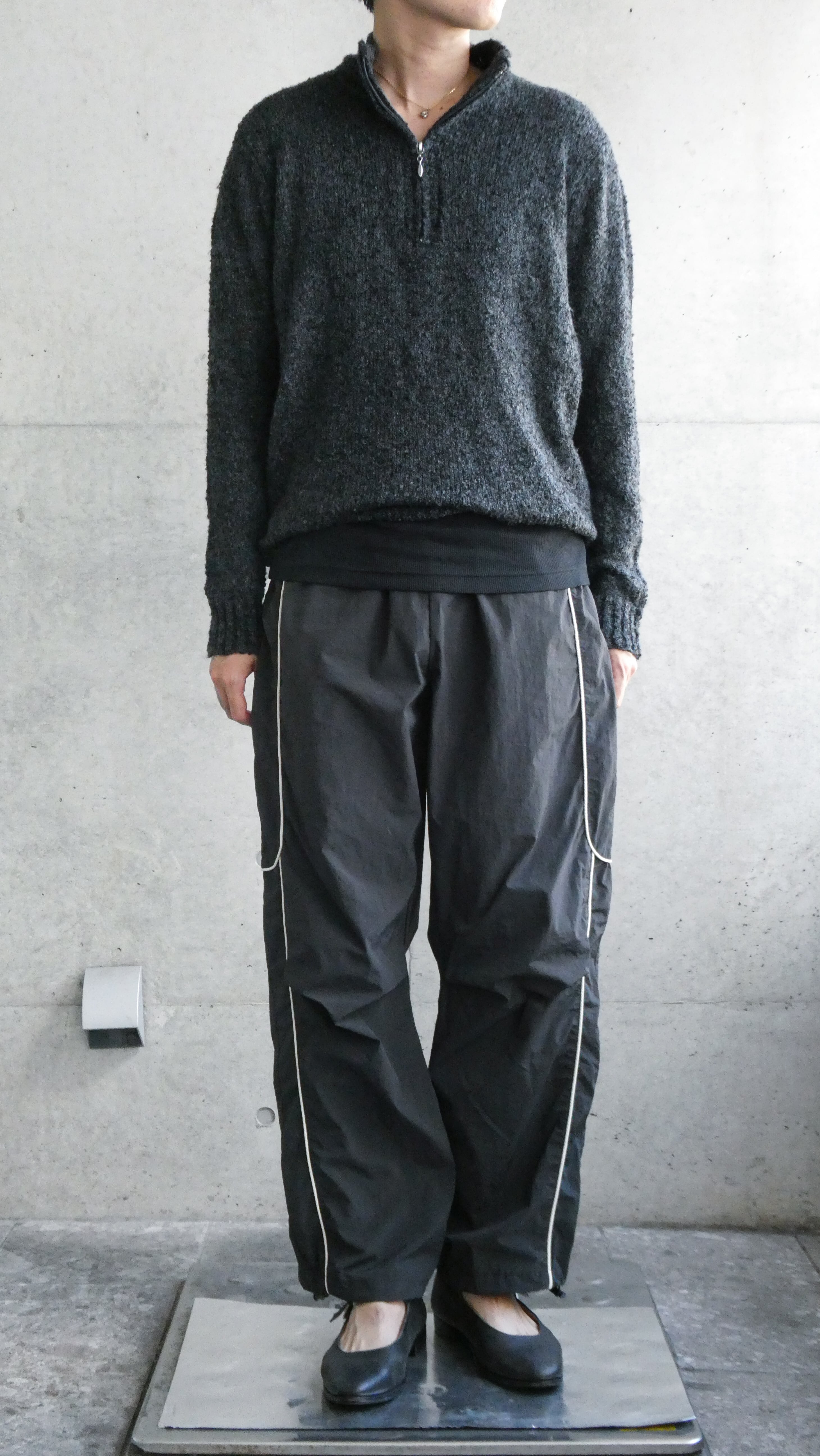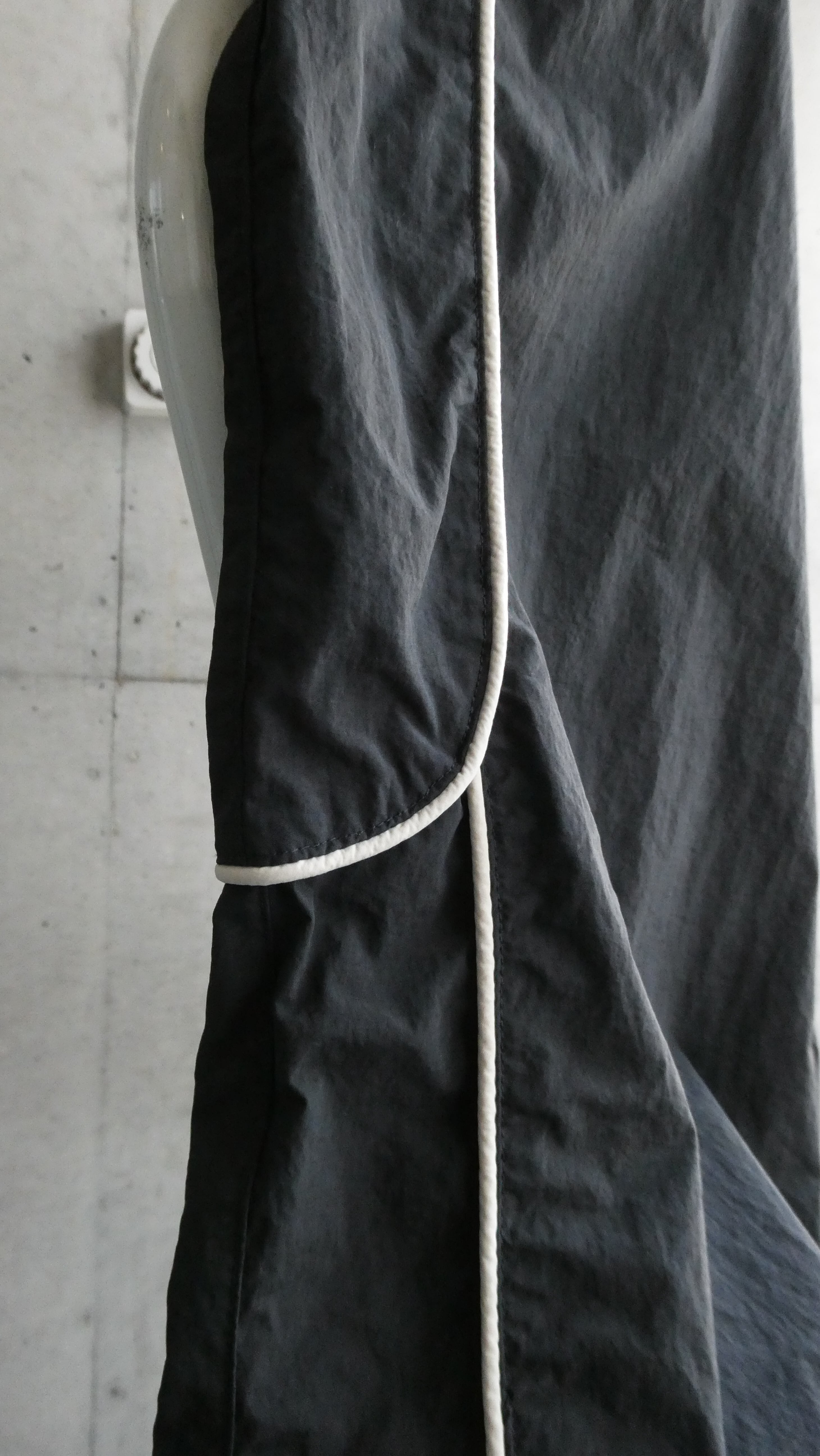 ブラックのサイドパイピング、トラックパンツ。サイドにカーブパターンのパイピングが良くてピックしました。シャリ感のある生地。裾にアクションタック入り。裾もドローコード付きです。