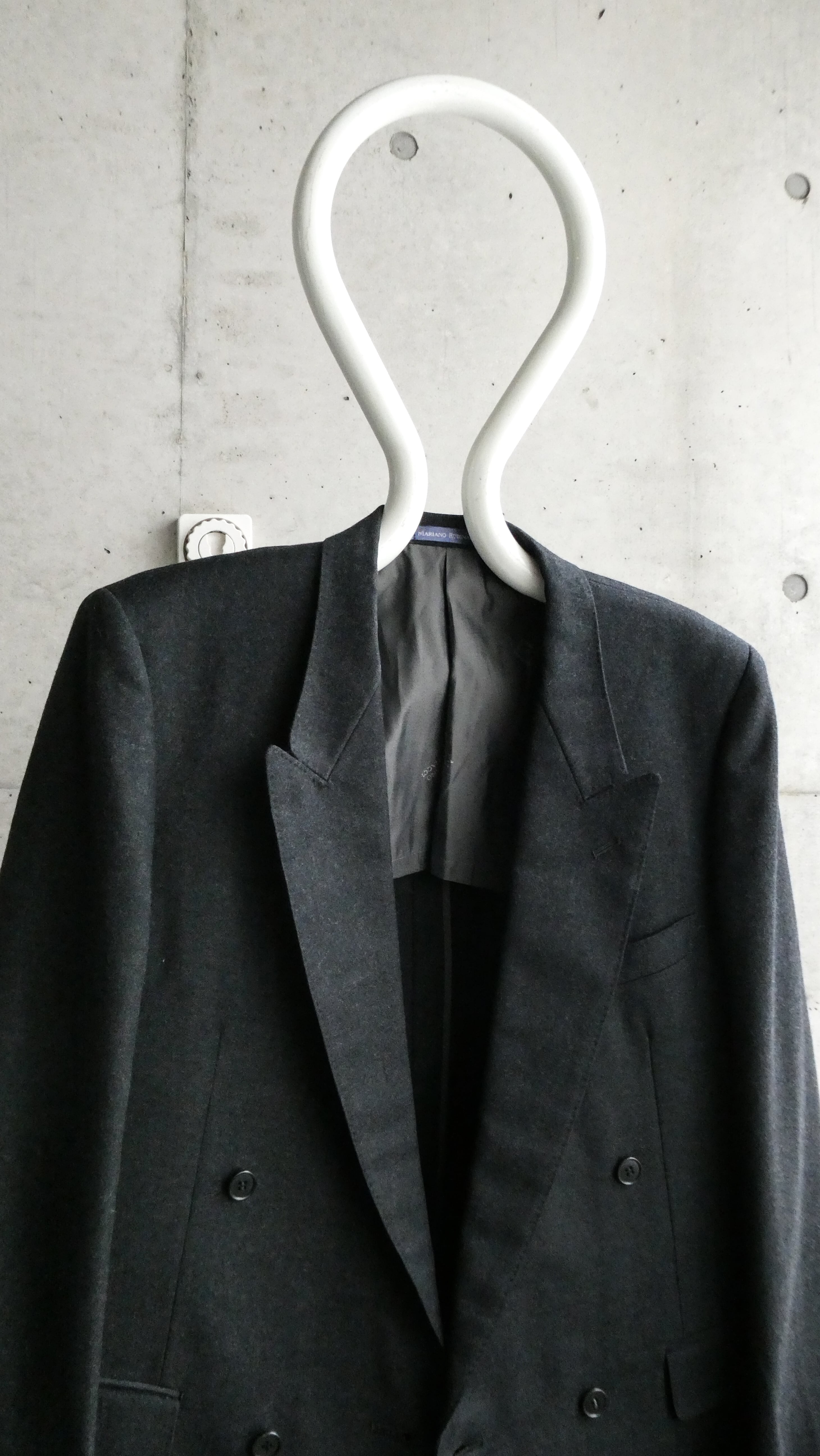 かなり珍しいフランネルウールのセットアップの入荷です。色もチャコールグレー。ダブル仕様です。凄く脚が長くスタイル良く見えるセットアップです。成人式、結婚式などにもオススメ。