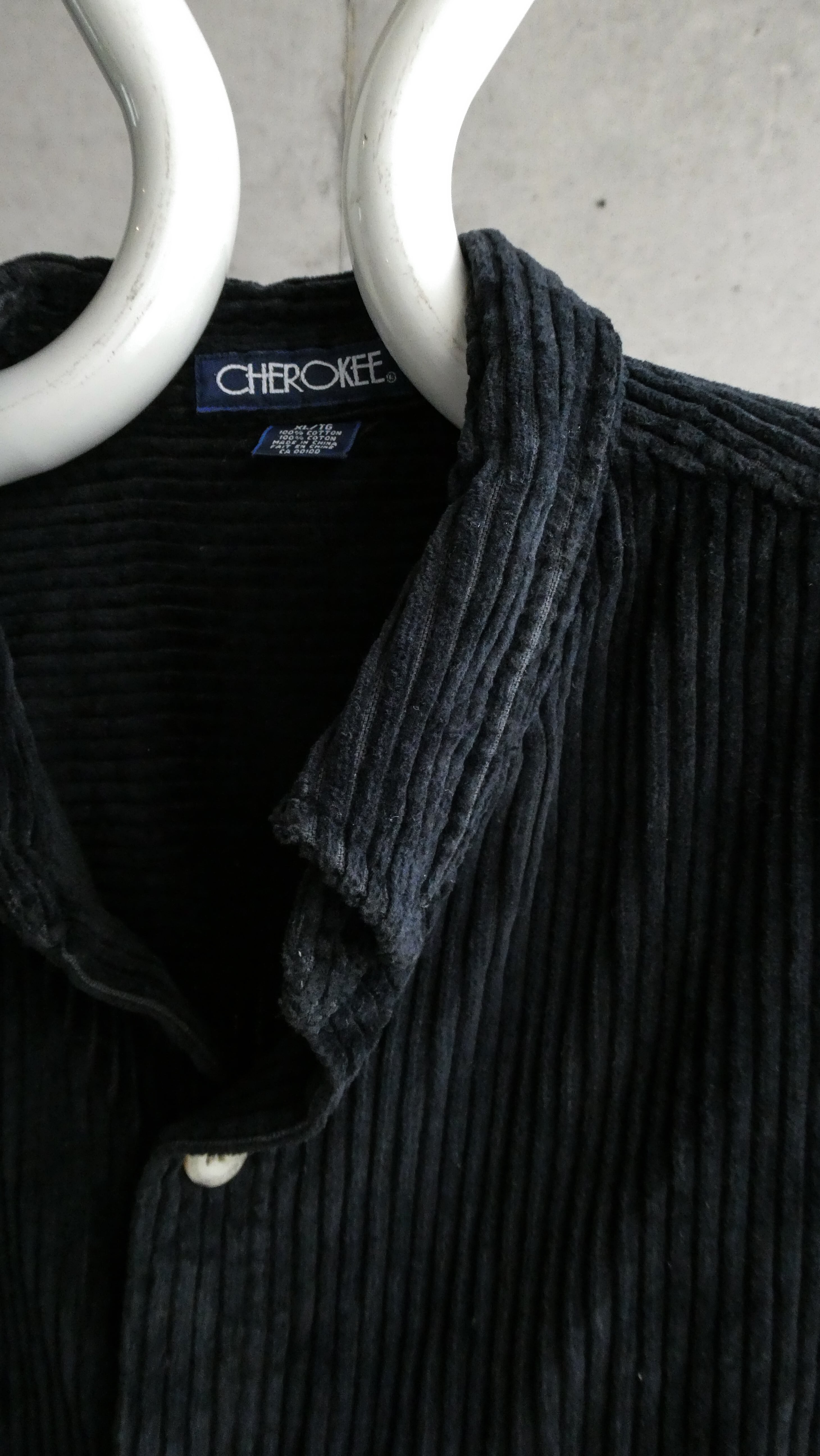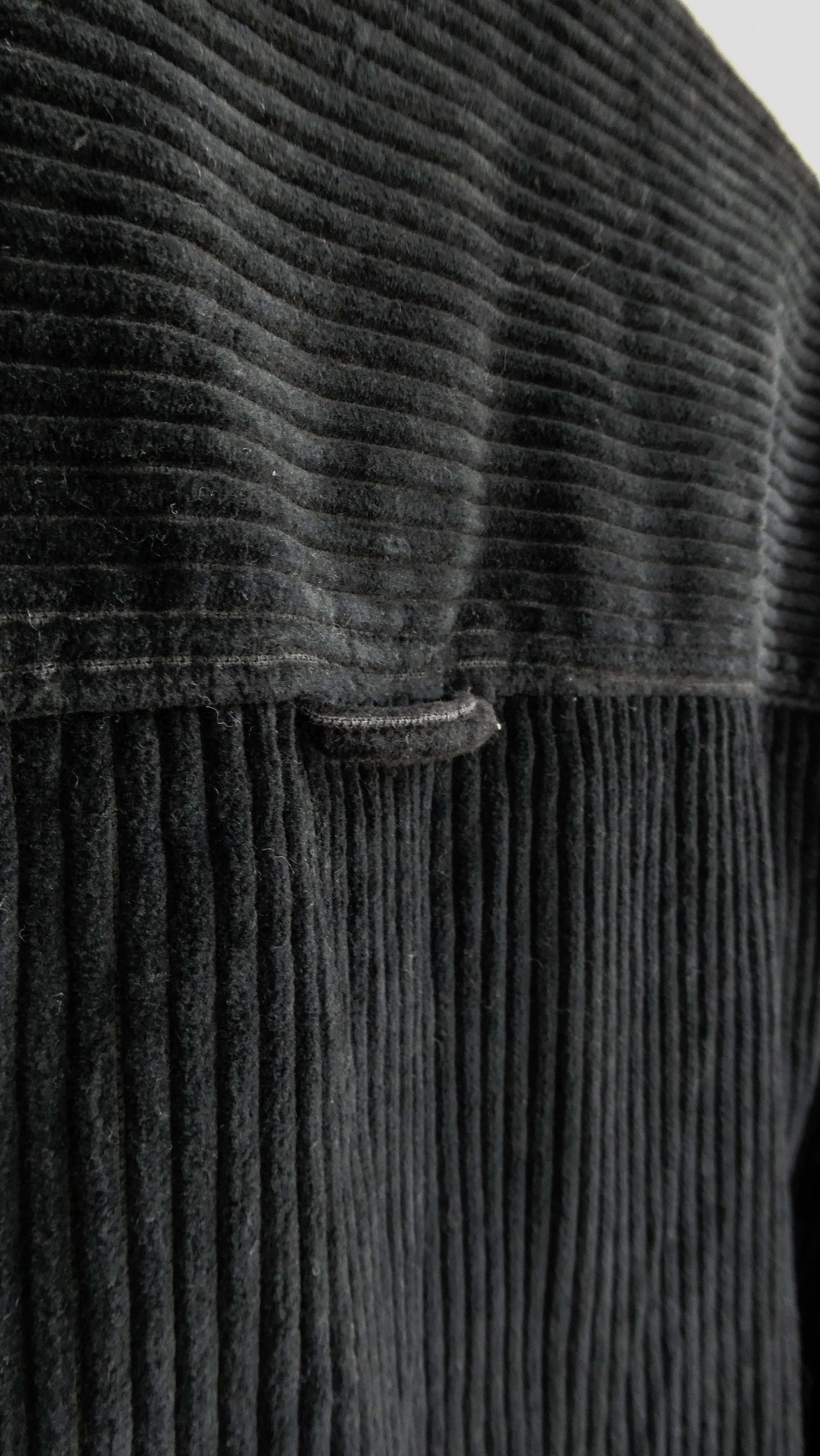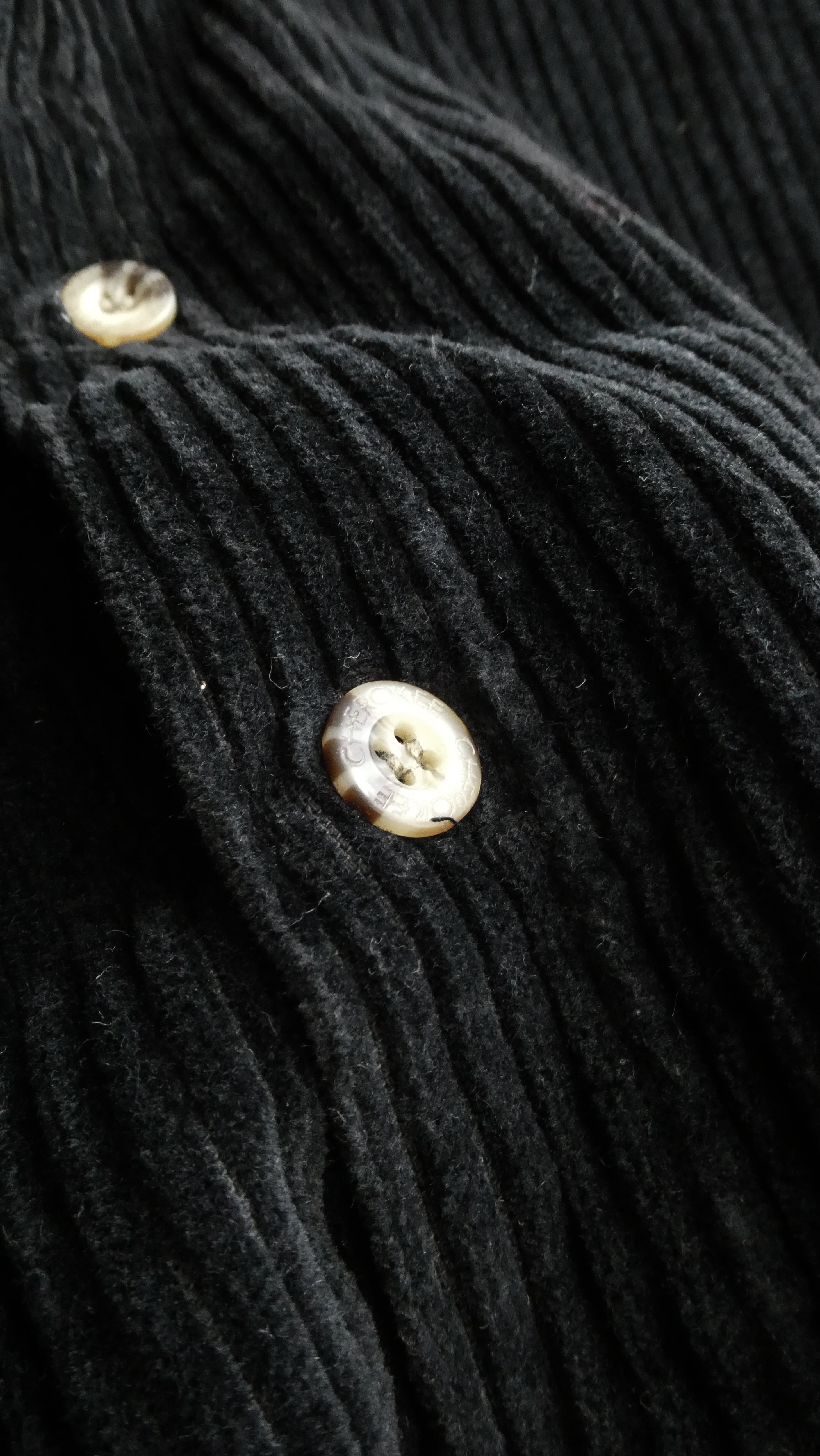 ブラックの超極太畝のコーデュロイシャツの入荷。久しぶりに納得いく黒コーデュロイ見つかりました。非常に肉厚で超極太畝。襟も前所有によって、糸で留めてあってスタンドカラーっぽく着用可能。ハサミで糸切れば、普通の襟シャツとして着用可能なので、敢えてそのままにしております。