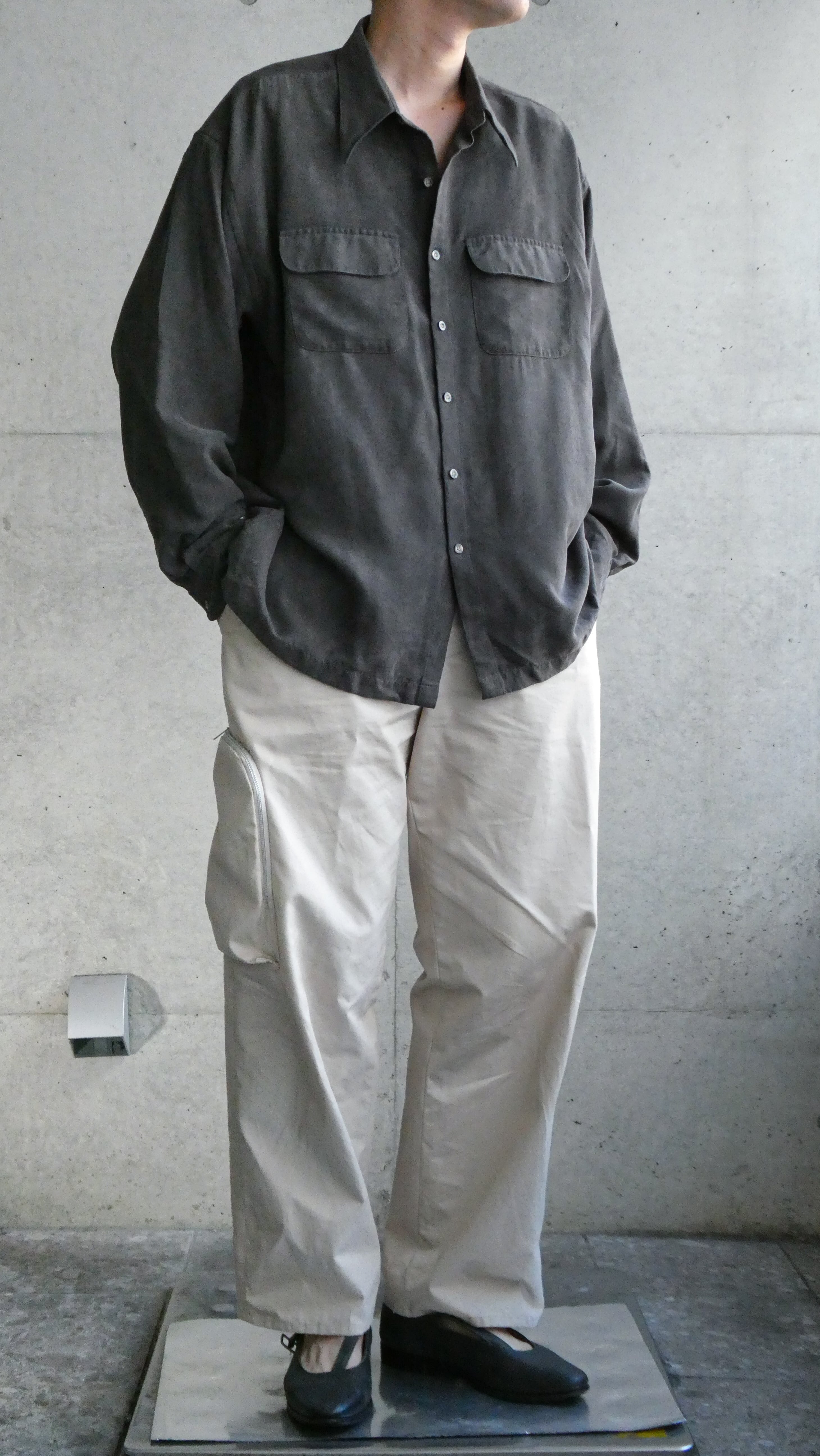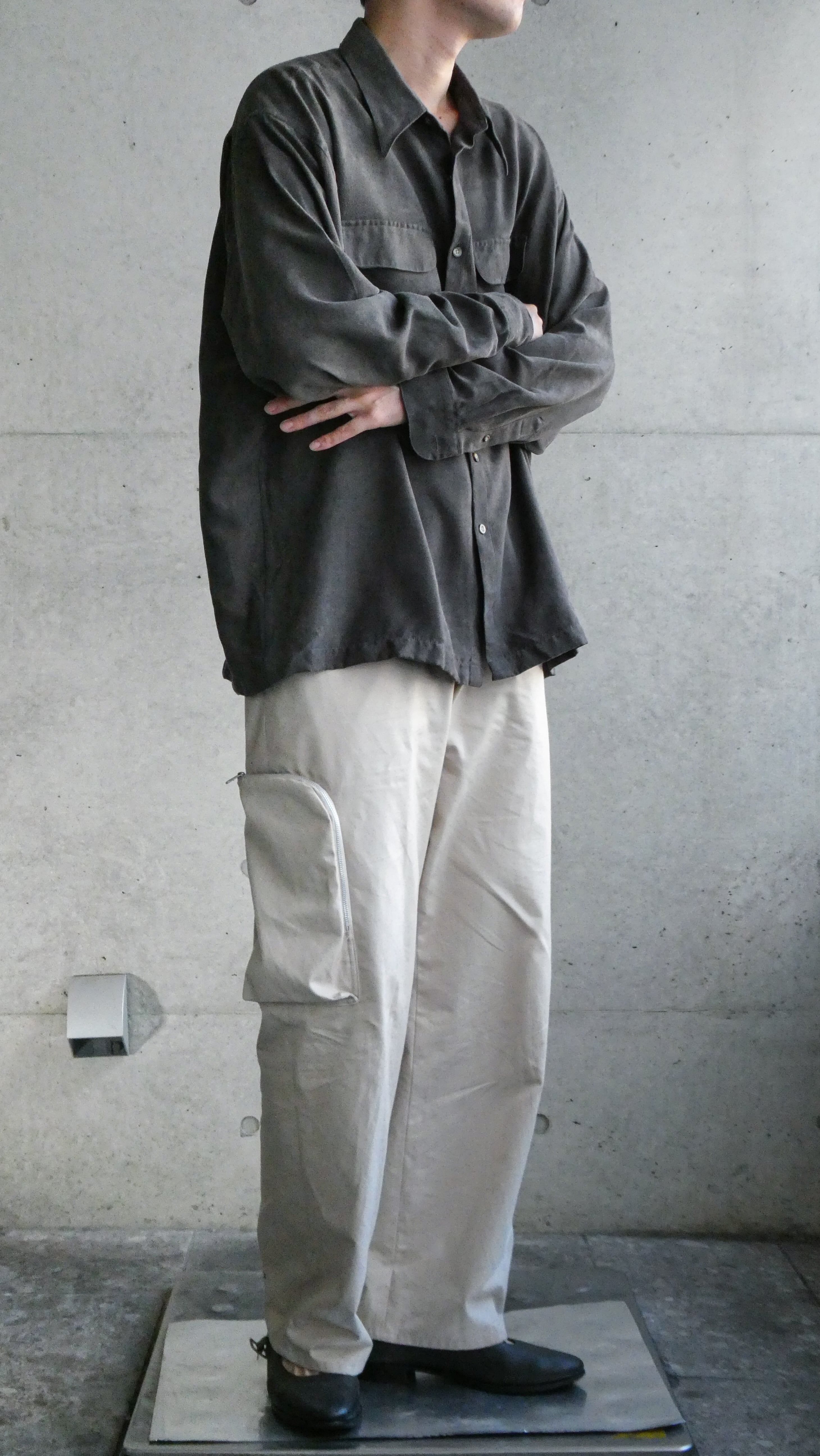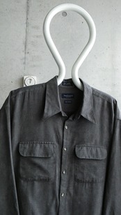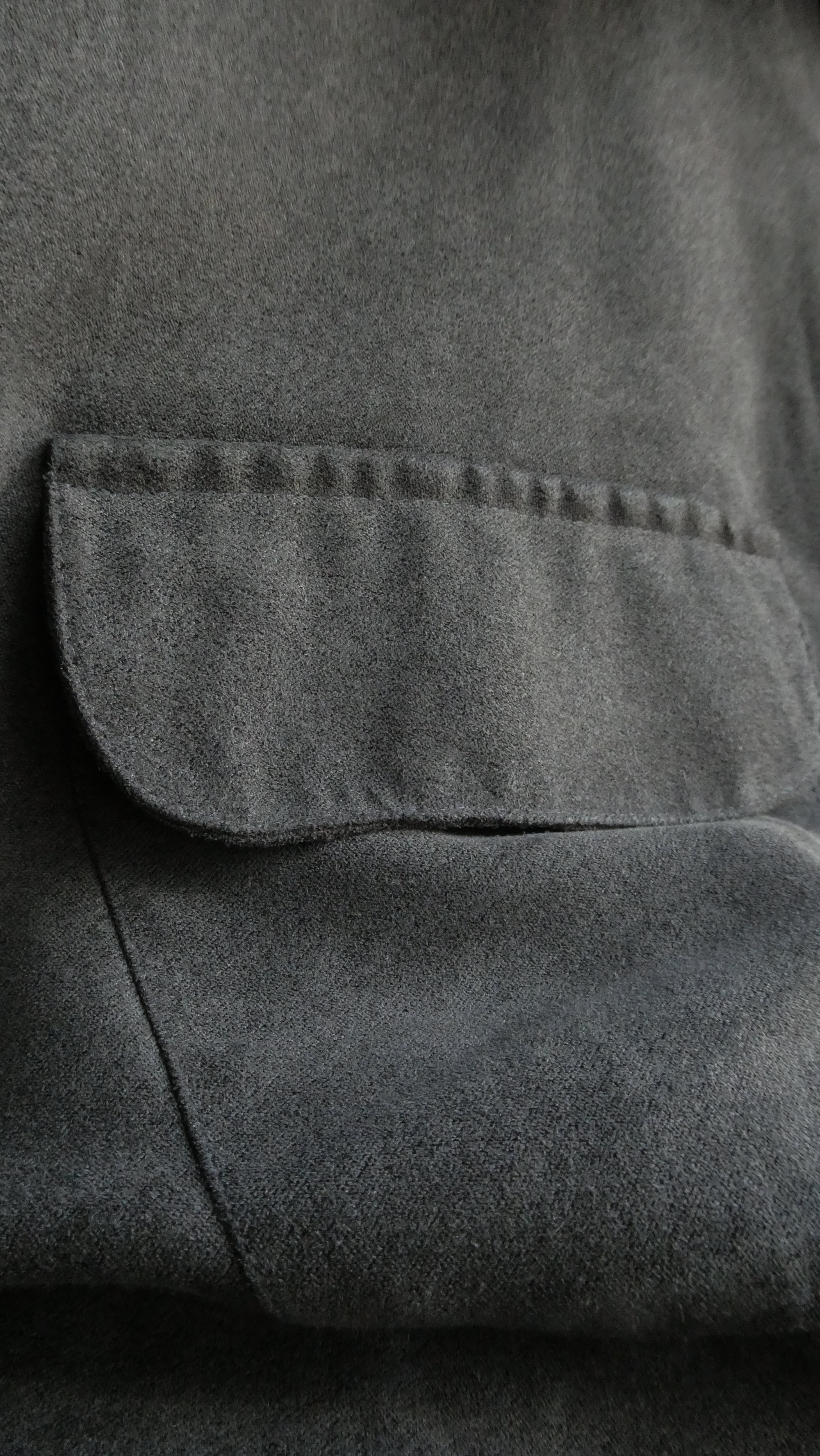 チャコールグレーのマイクロスウェードシャツ。生地表記はソフトスウェードとある通り、凄く肌触りいいです。シワも付きにくく、ラグジュアリーな雰囲気だせるシャツです。両胸フラップポケットなのも◎。フラップ上部のプックリ感もしっかり表現されています。