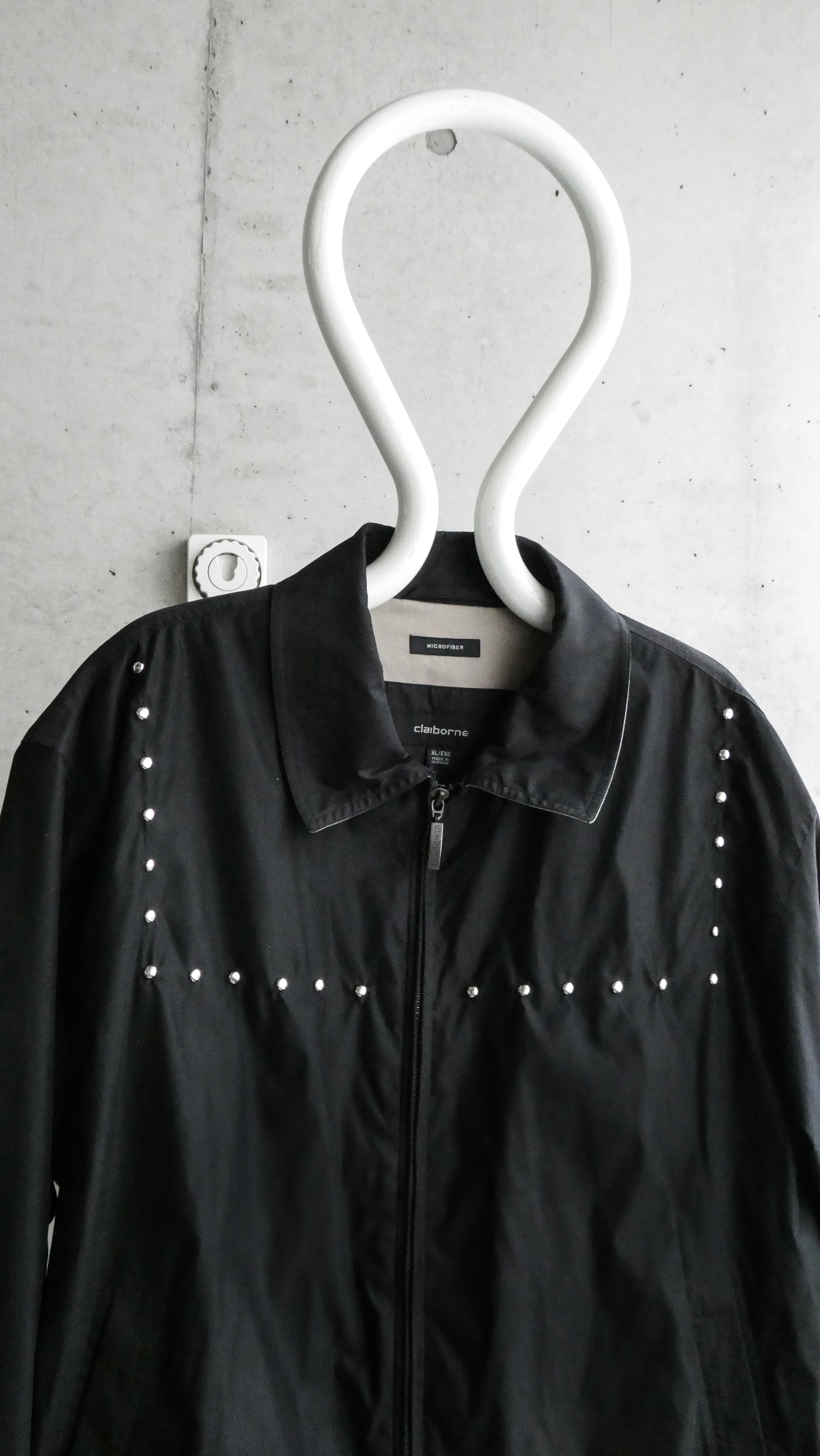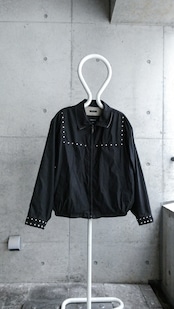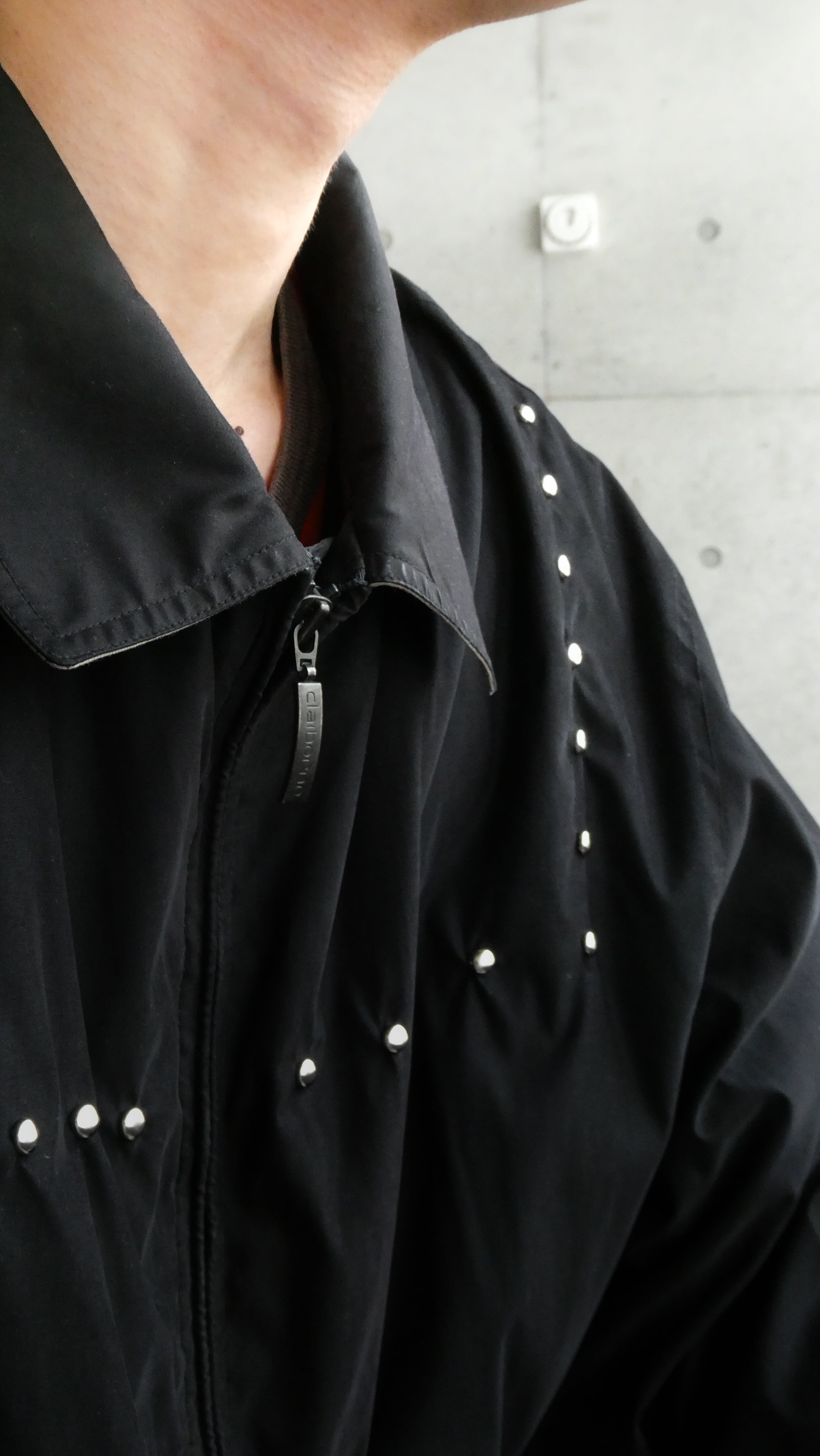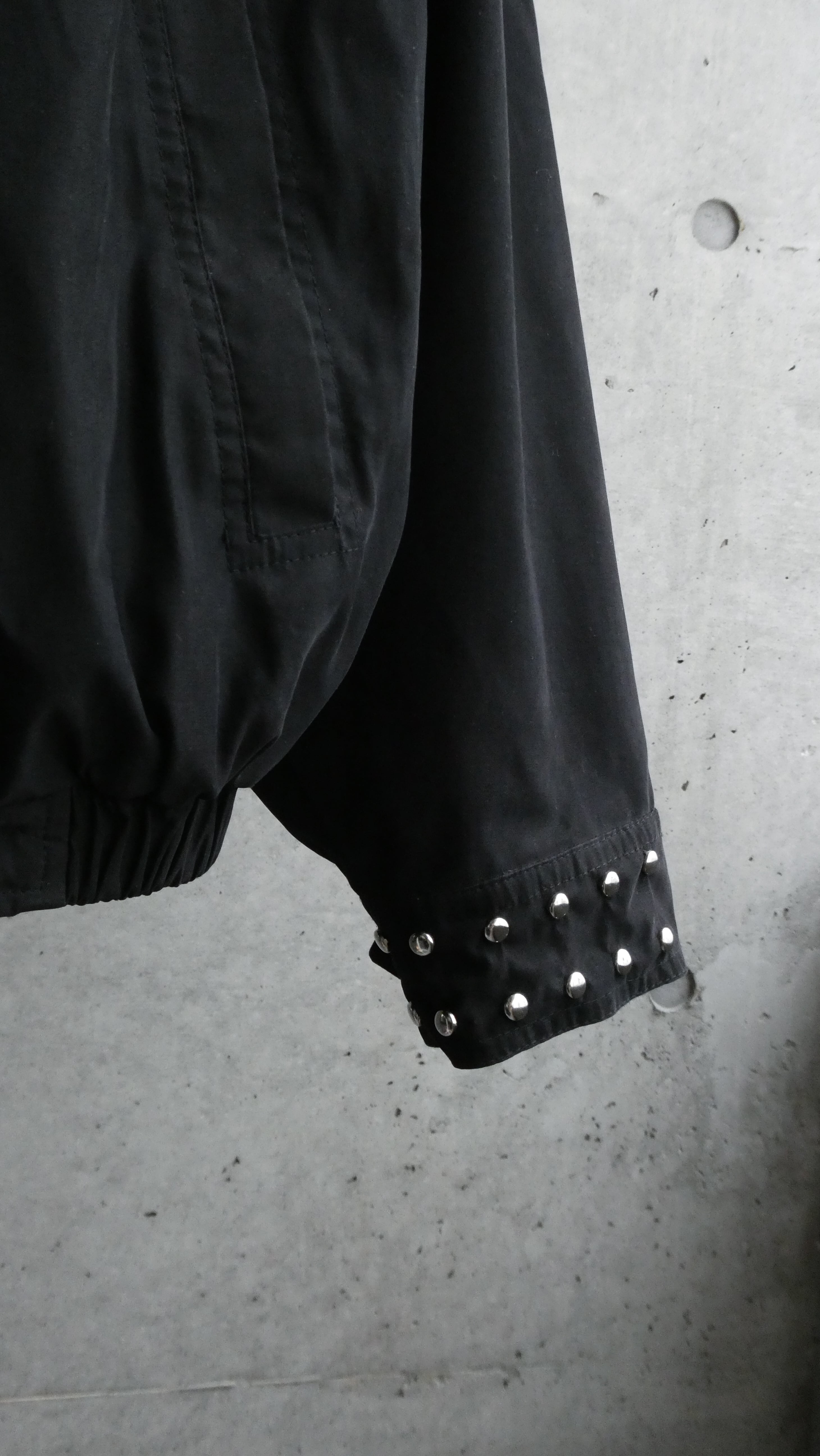 ブラックのピーチスキンのブルゾンにスタッズカスタムが施された一着。凄く高級感のあるピーチスキン。袖にもボックス型のスタッズ。カジュアルとラグジュアリーさのバランス取れたブルゾンです。