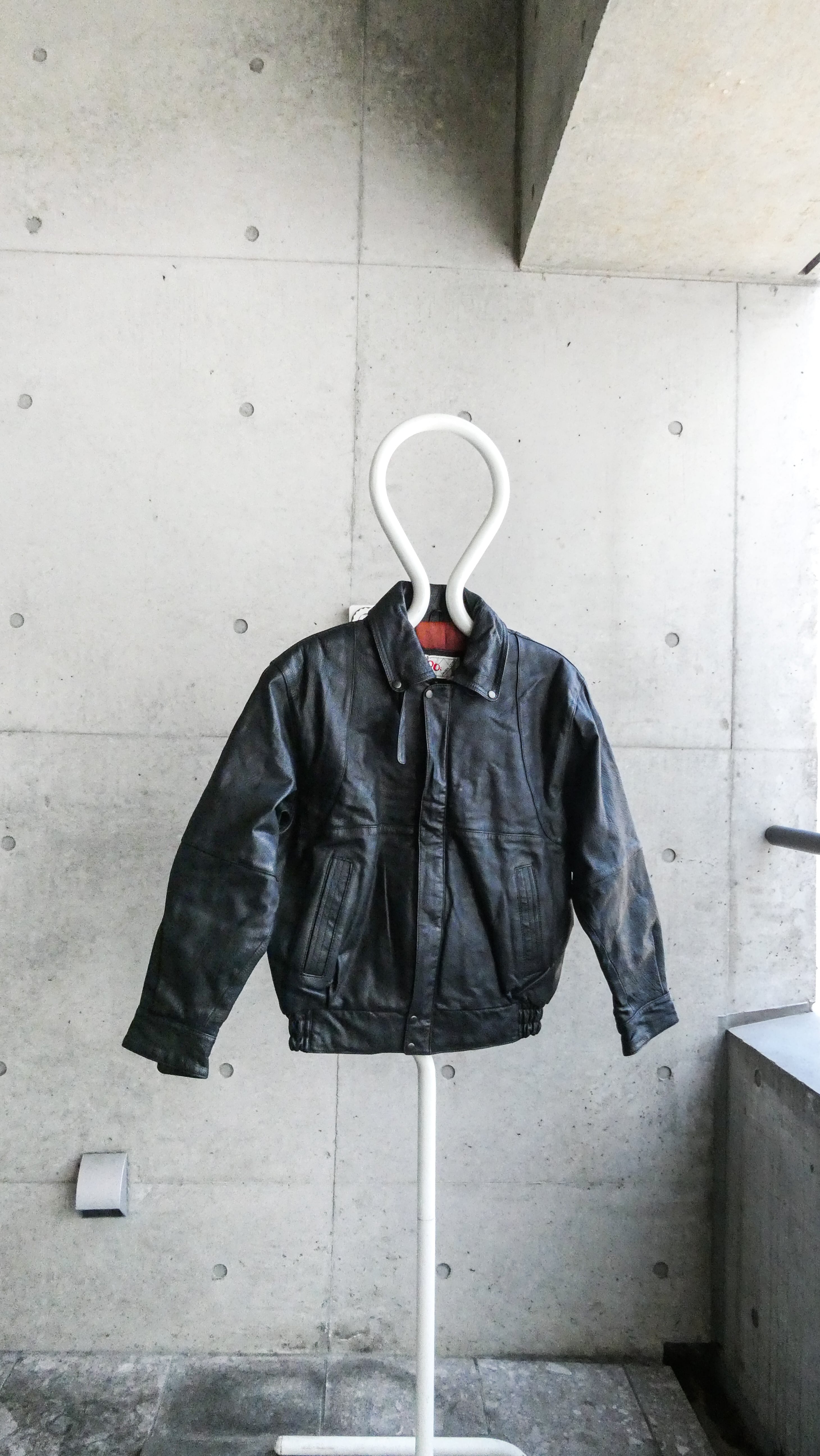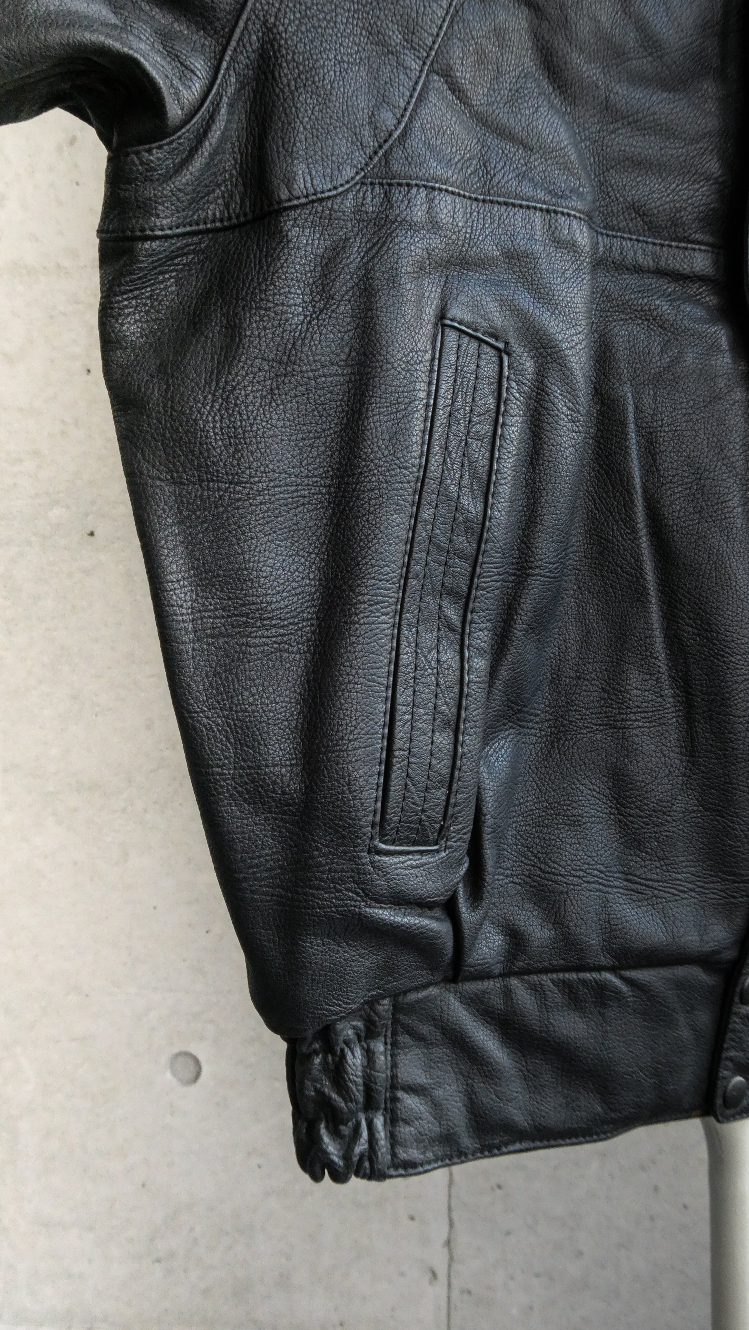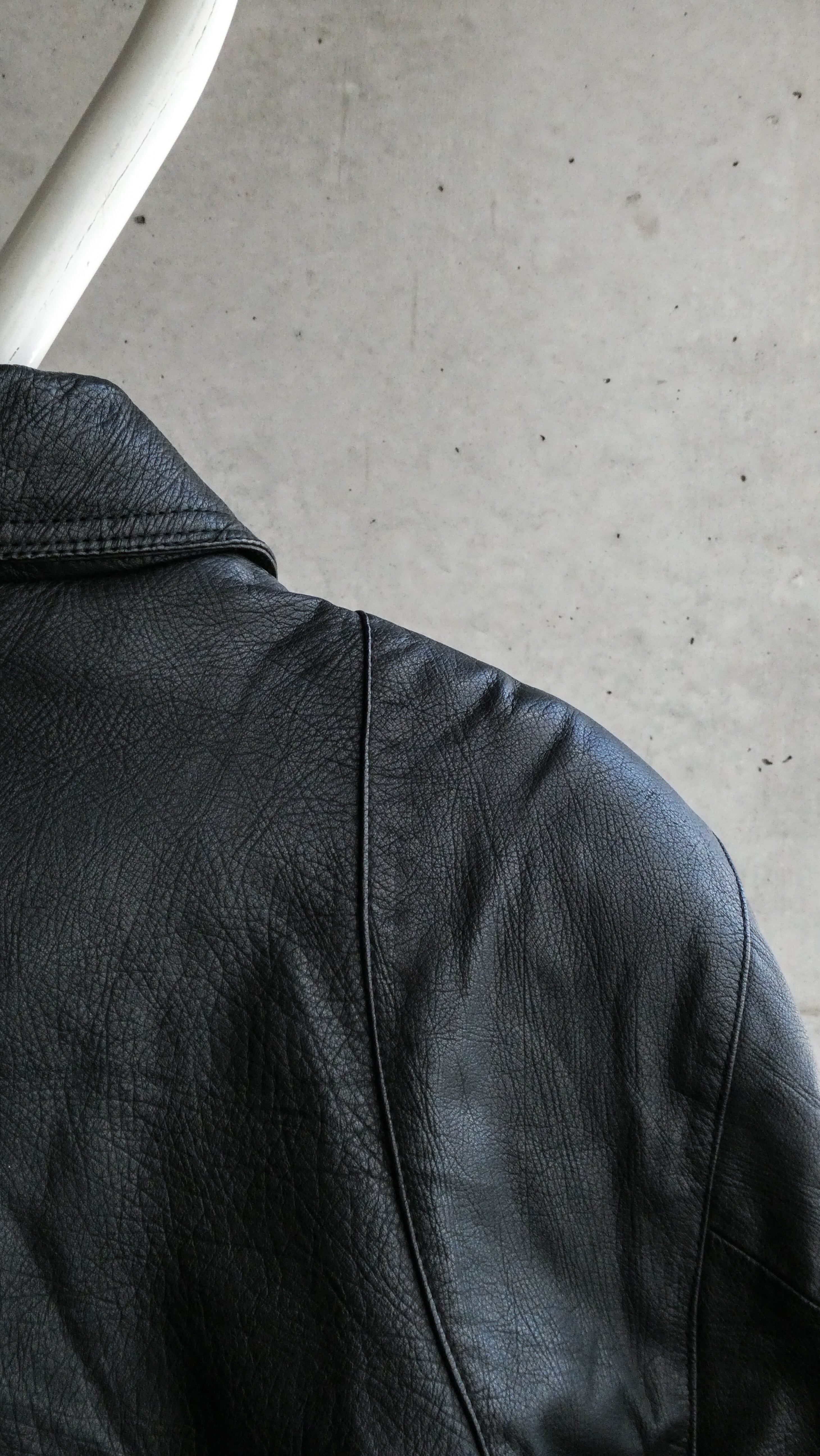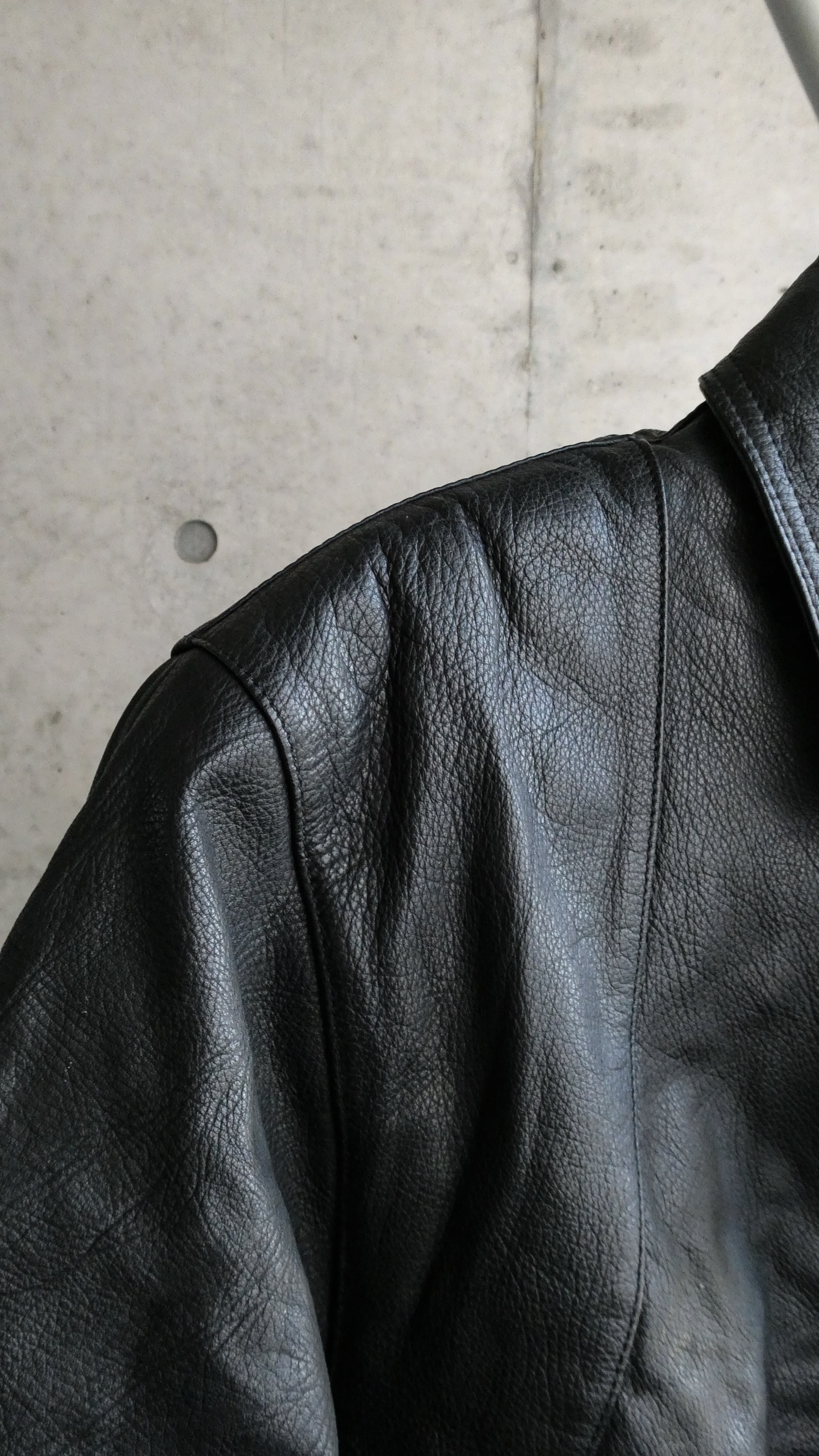 ブラックのレザーブルゾン。凄く上質なシボ革。チンスト付きで他はいたってシンプルなデザイン。小柄なメンズ、レディース向けサイズです。