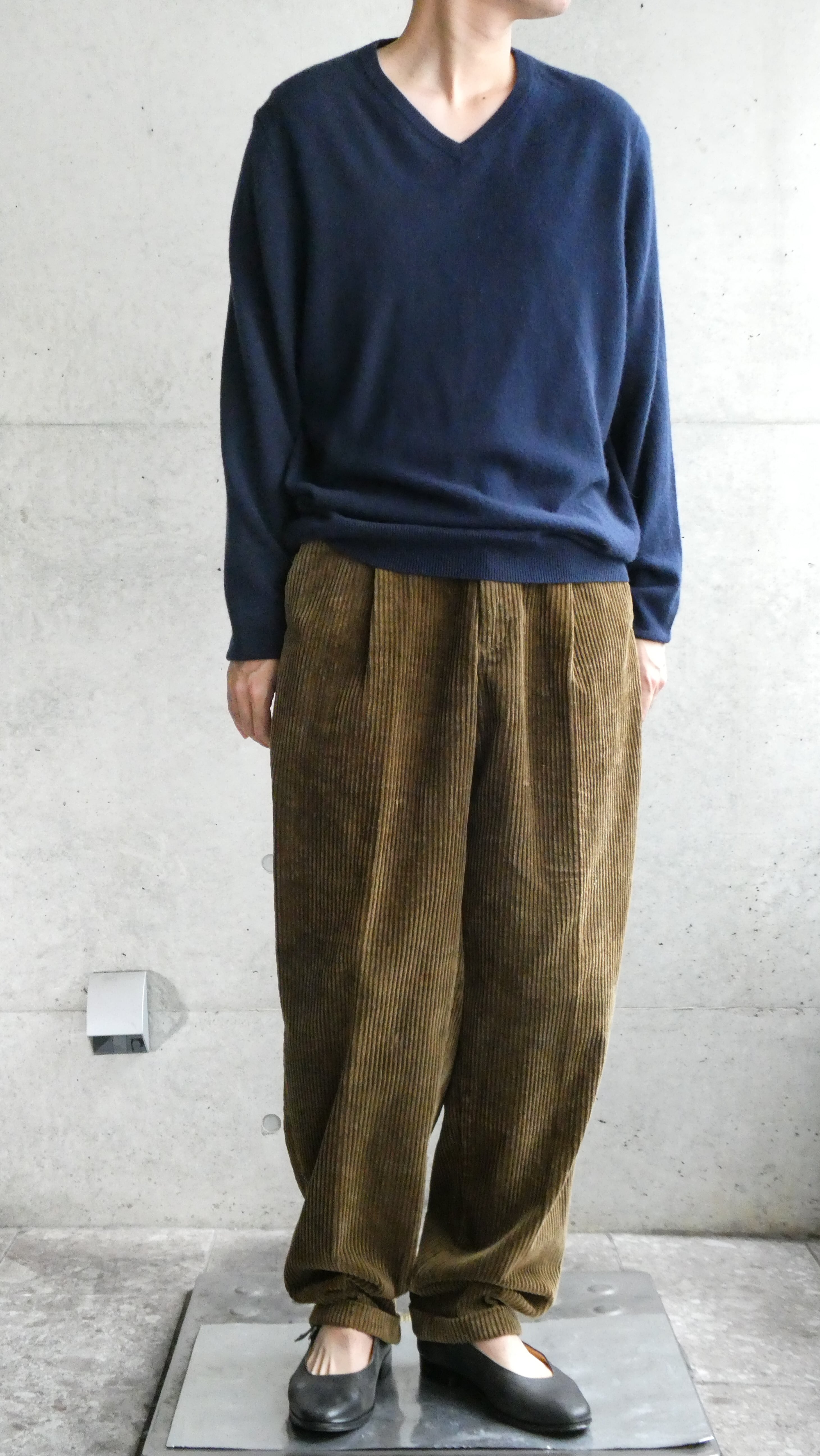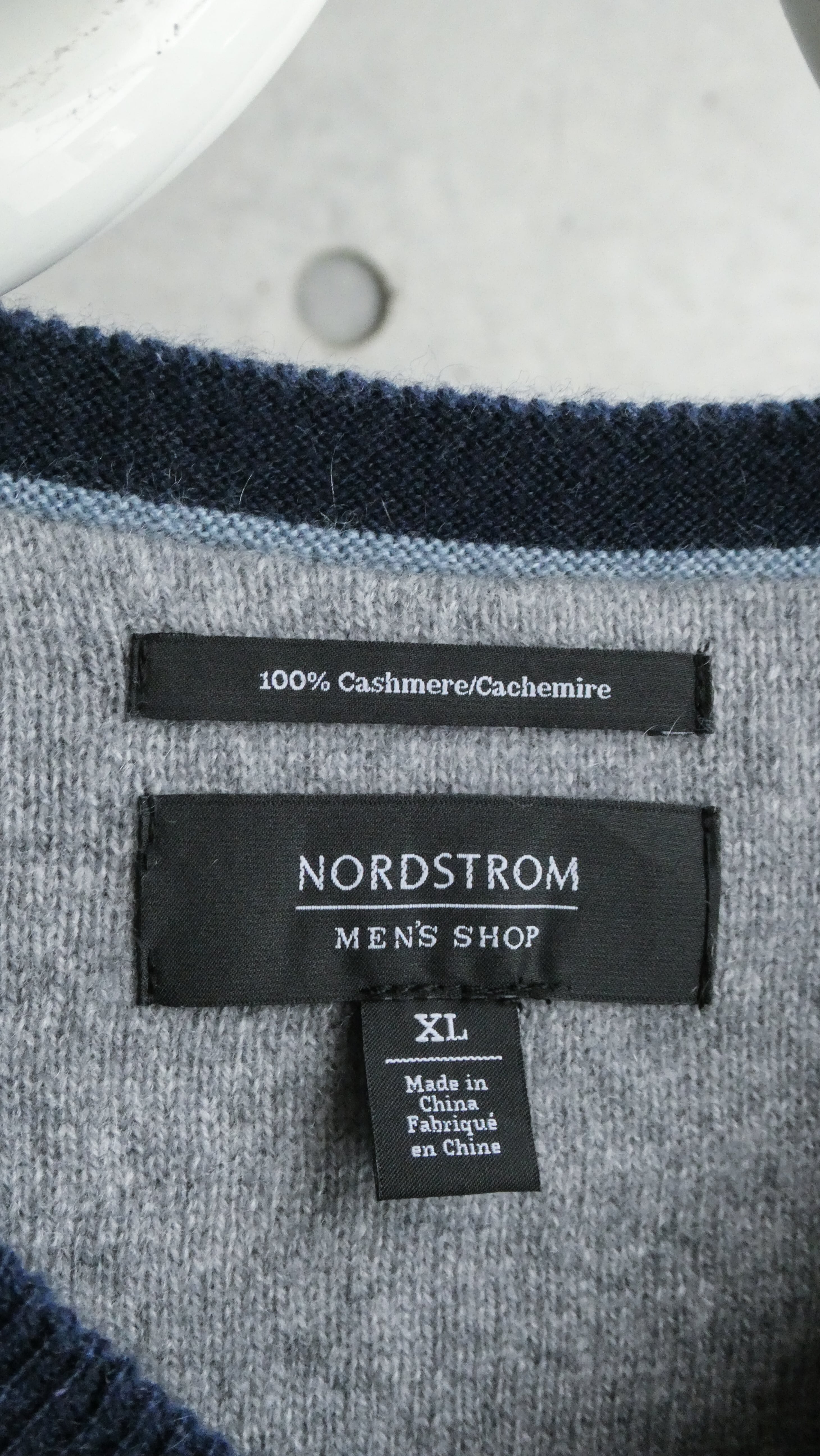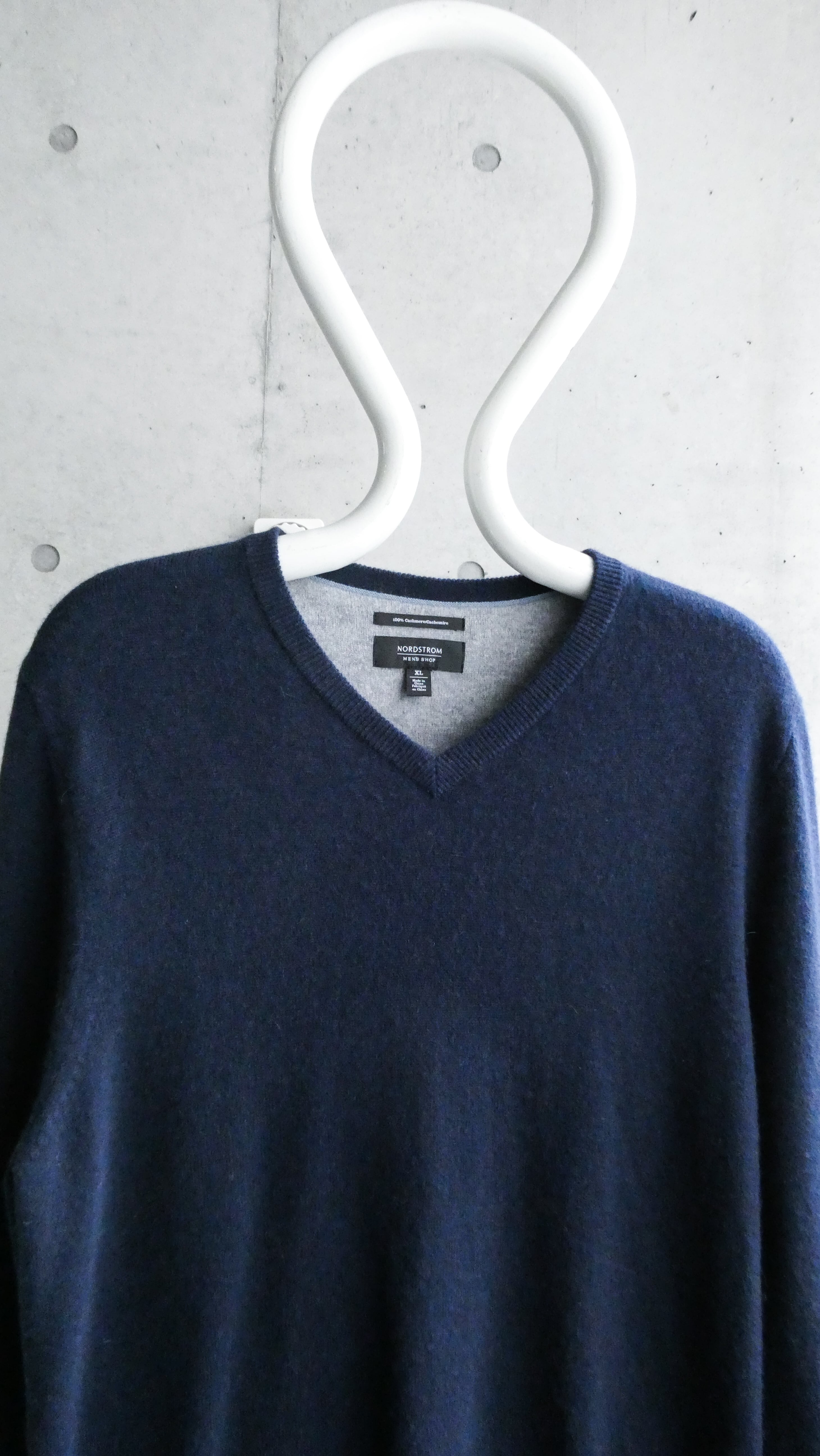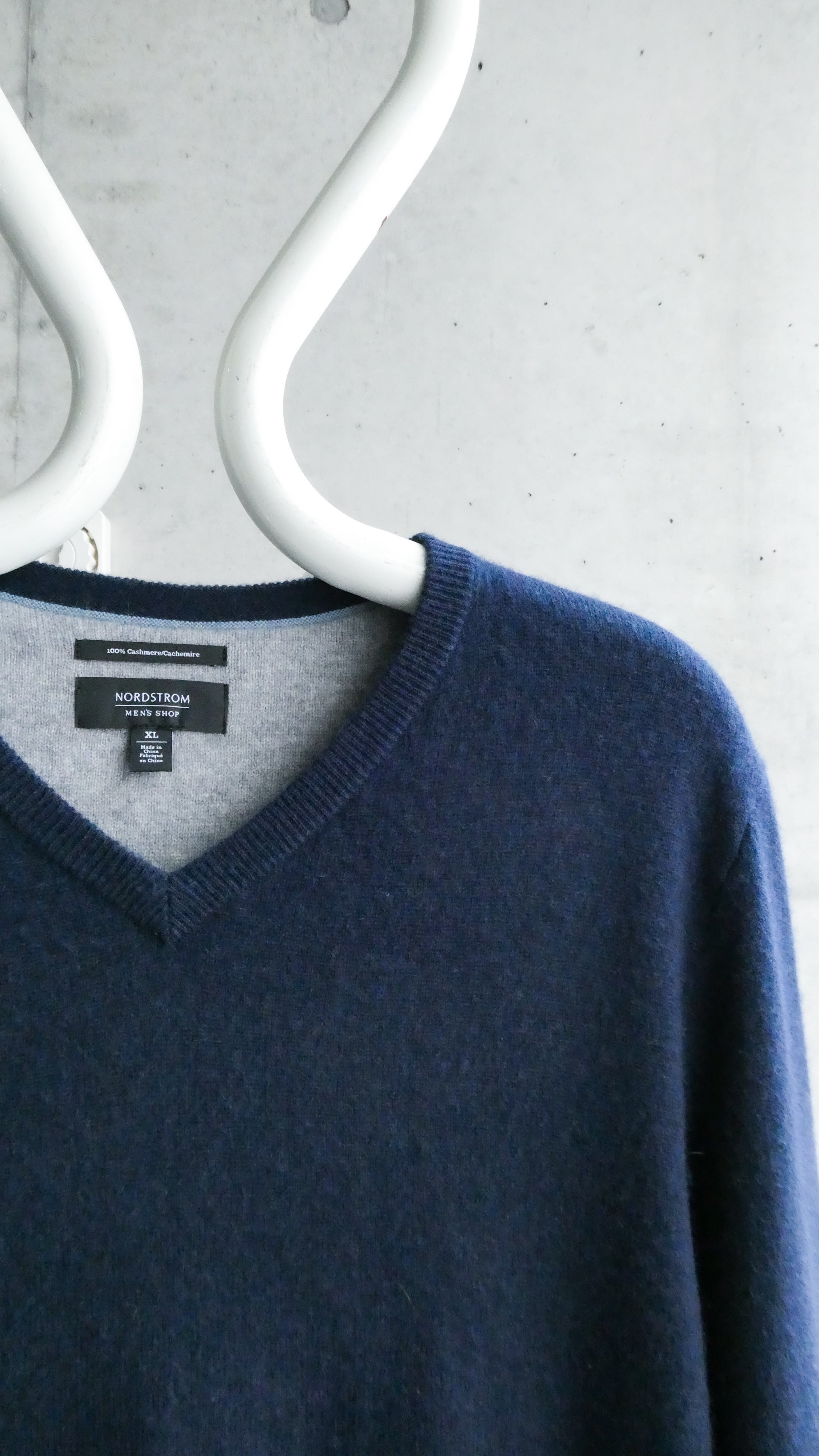 高級老舗百貨店Nordstromのカシミヤ100%のニット。品のあるネイビーでVネック。首が詰まりすぎてないVネックで色気出せるのが良くてピックしました。フワフワで極上のカシミヤ生地です。