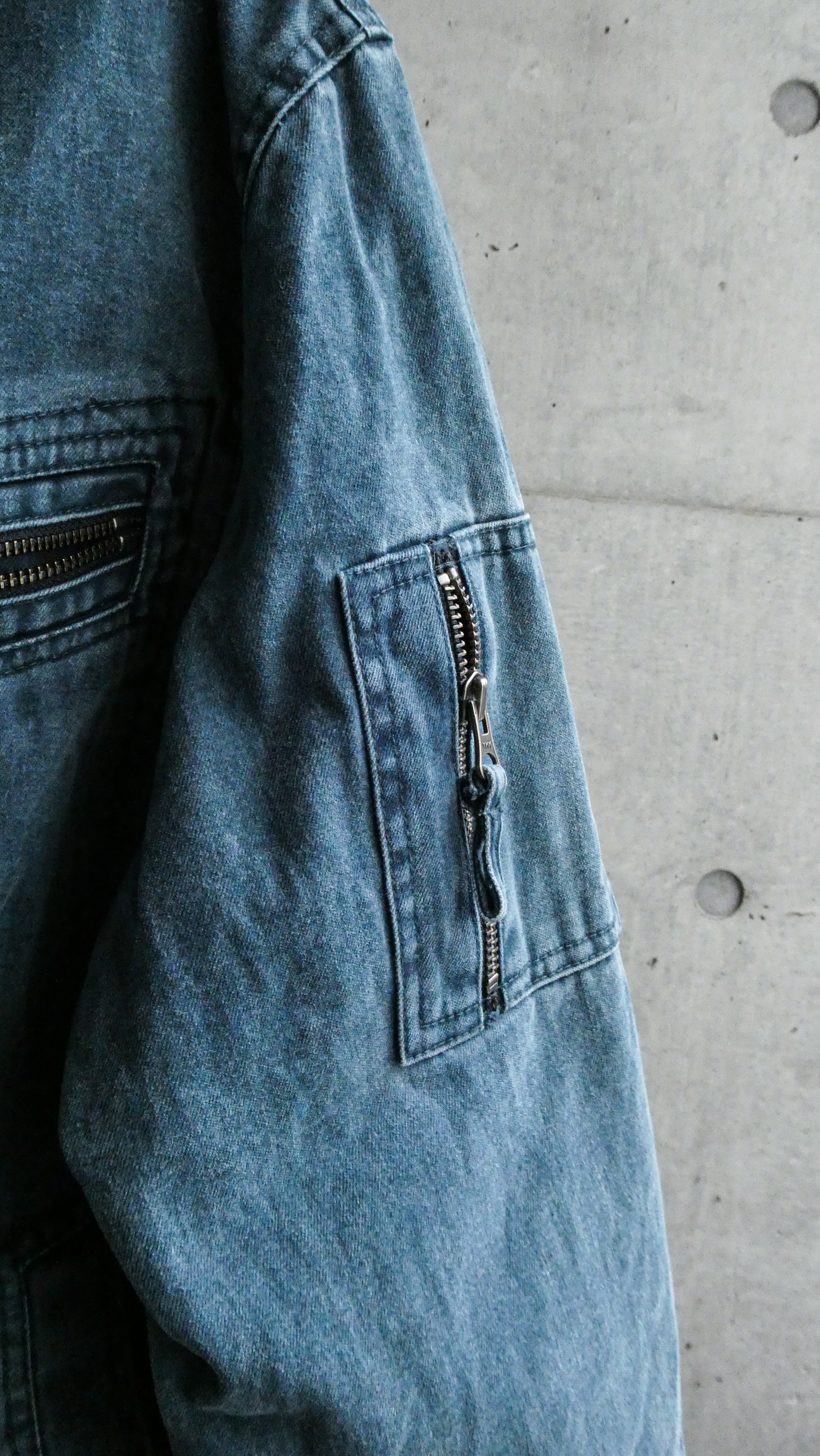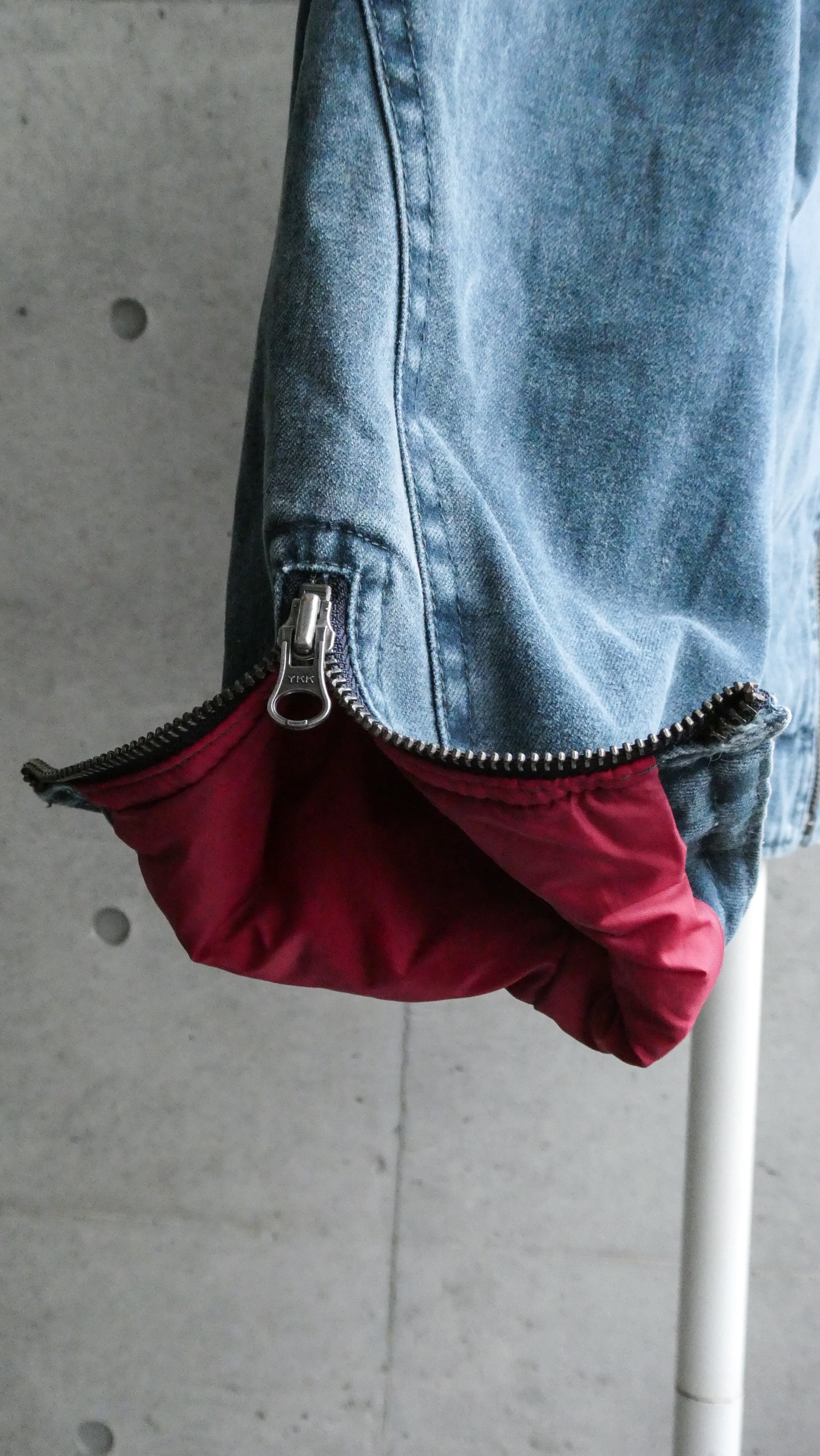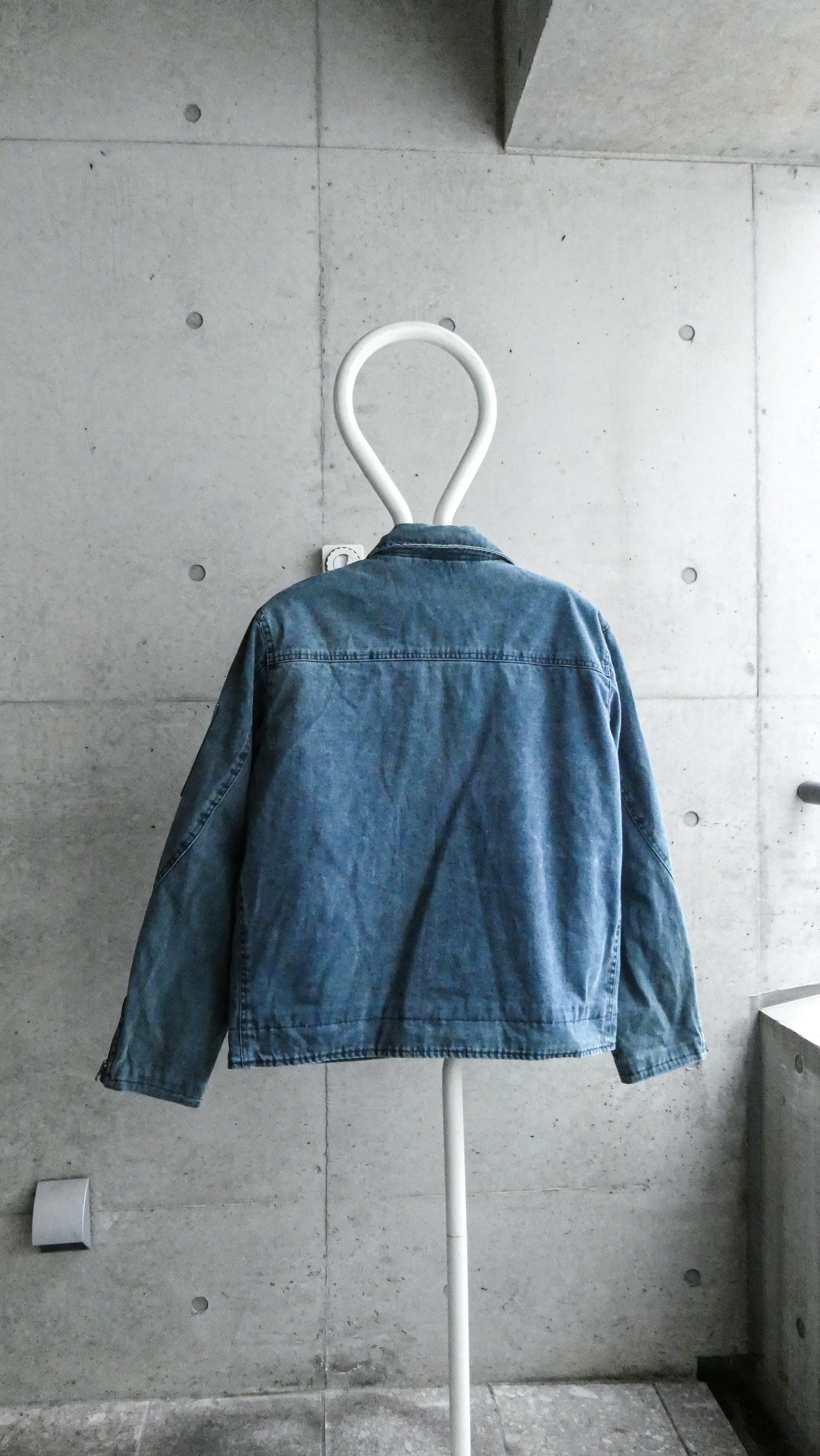 デニムっぽいインディゴブルーに後染めされたブルゾン。袖にポケット、袖先はジップで開閉可能のフライトジャケットのディテールです。短丈、袖長で今季っぽいシルエットです。